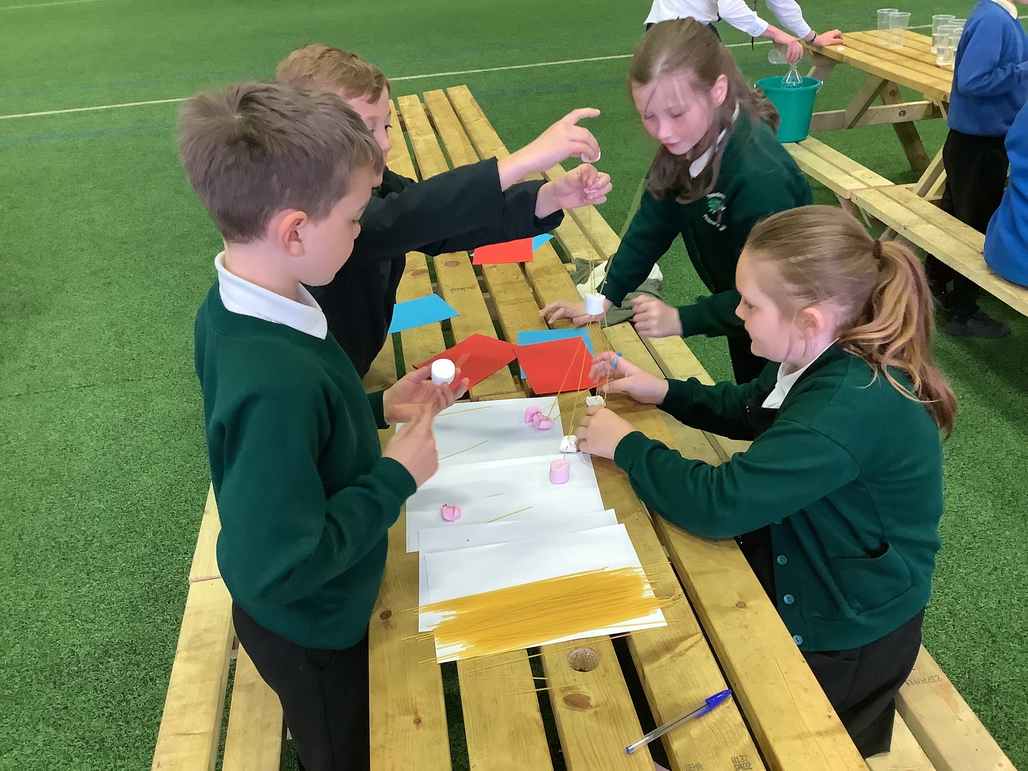 Maths Challenge 1 - Split a 2 litre bottle of water equally into 9 cups, but you could only add water to a cup once and had to have no water left in the bottle by the end. Then they had to become engineers and create the tallest structure possible, but only using dried spaghetti and marshmellows.