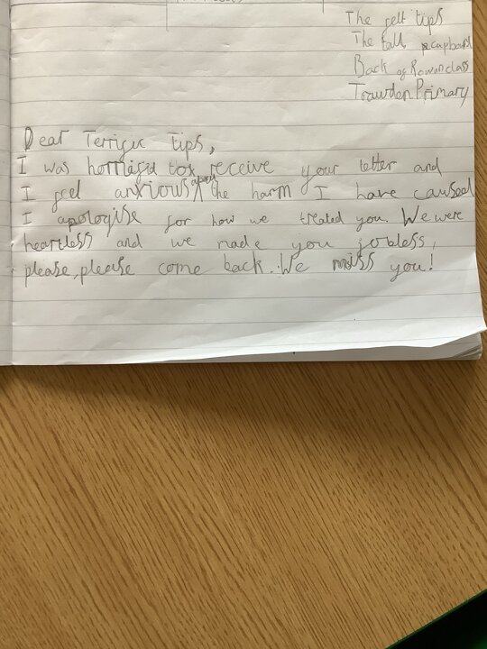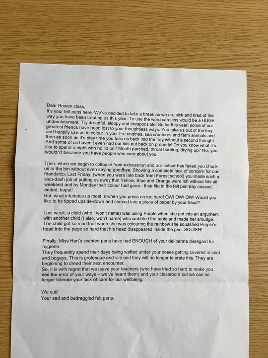 Today Year Two had quite the shock when they realised that their felt pen box was almost empty and in place of the pens was a letter. The letter informed us that the felt tips had left because they'd had enough of being mistreated. According to the letter, the children are constantly leaving the lids off the pens, squashing their heads onto paper and being generally careless. Year 2 felt really upset that they had caused such distress to the felt pens and so they have decided to write a letter to persuade them to come back, here are some of the letters so far...