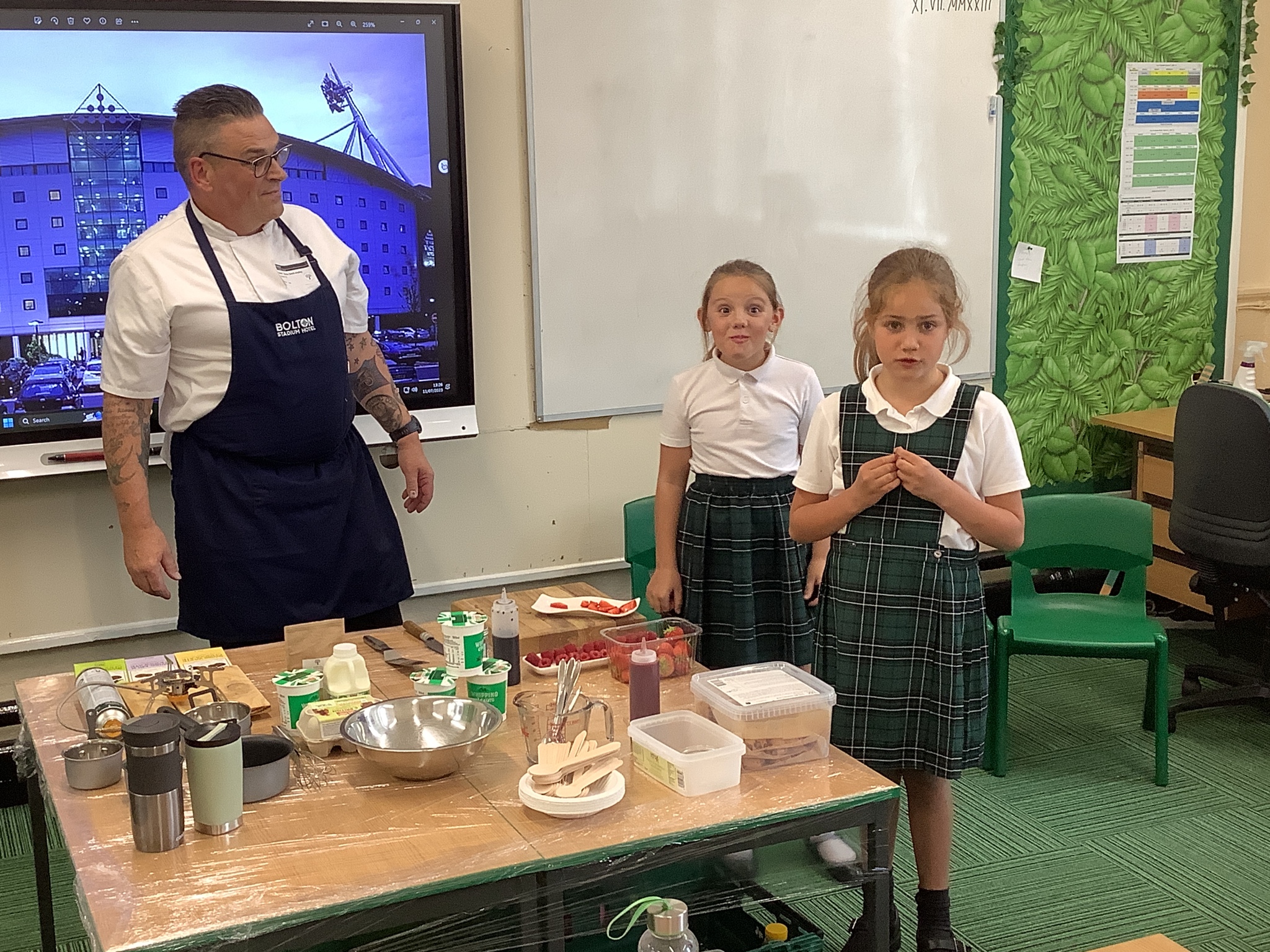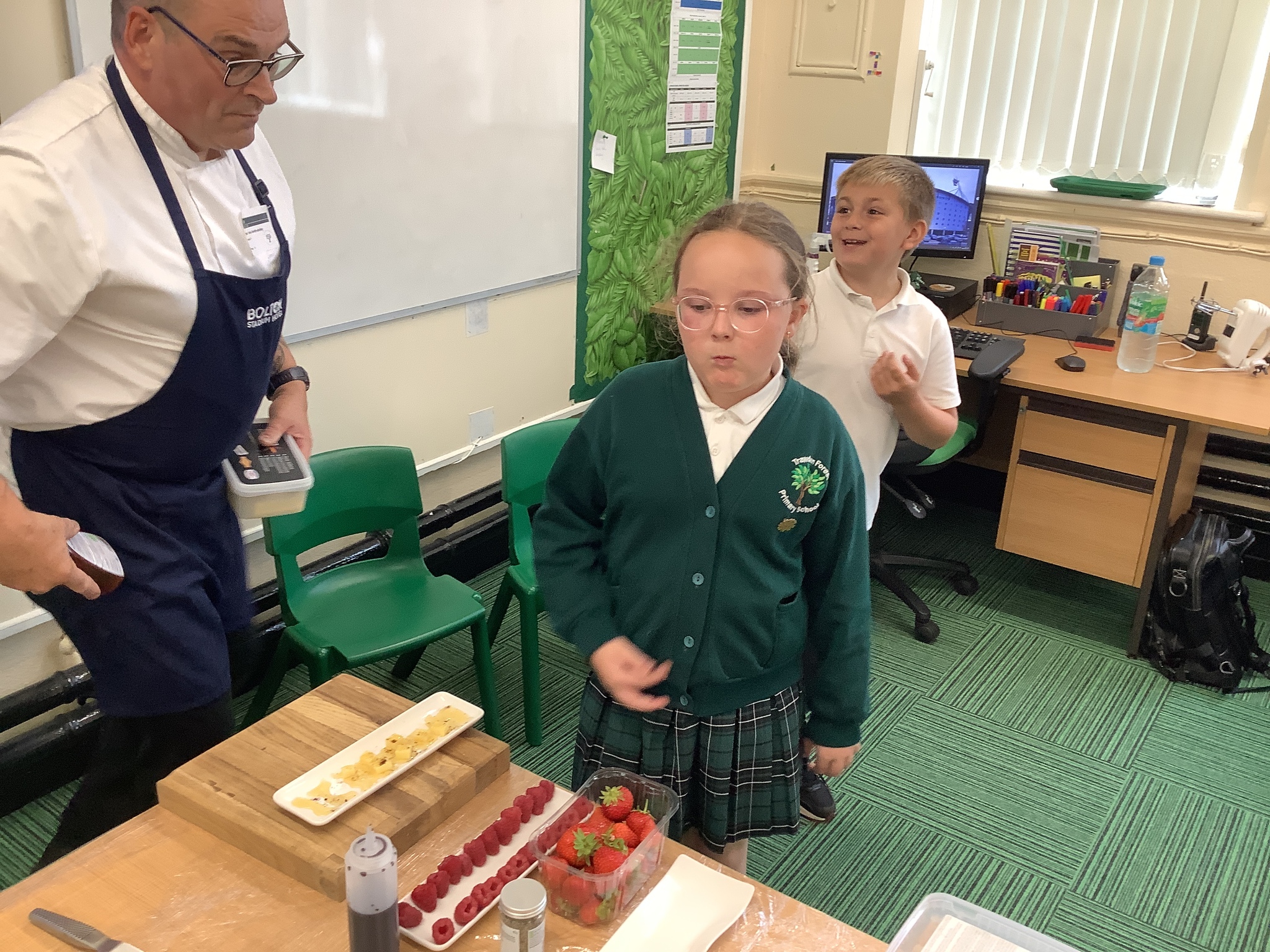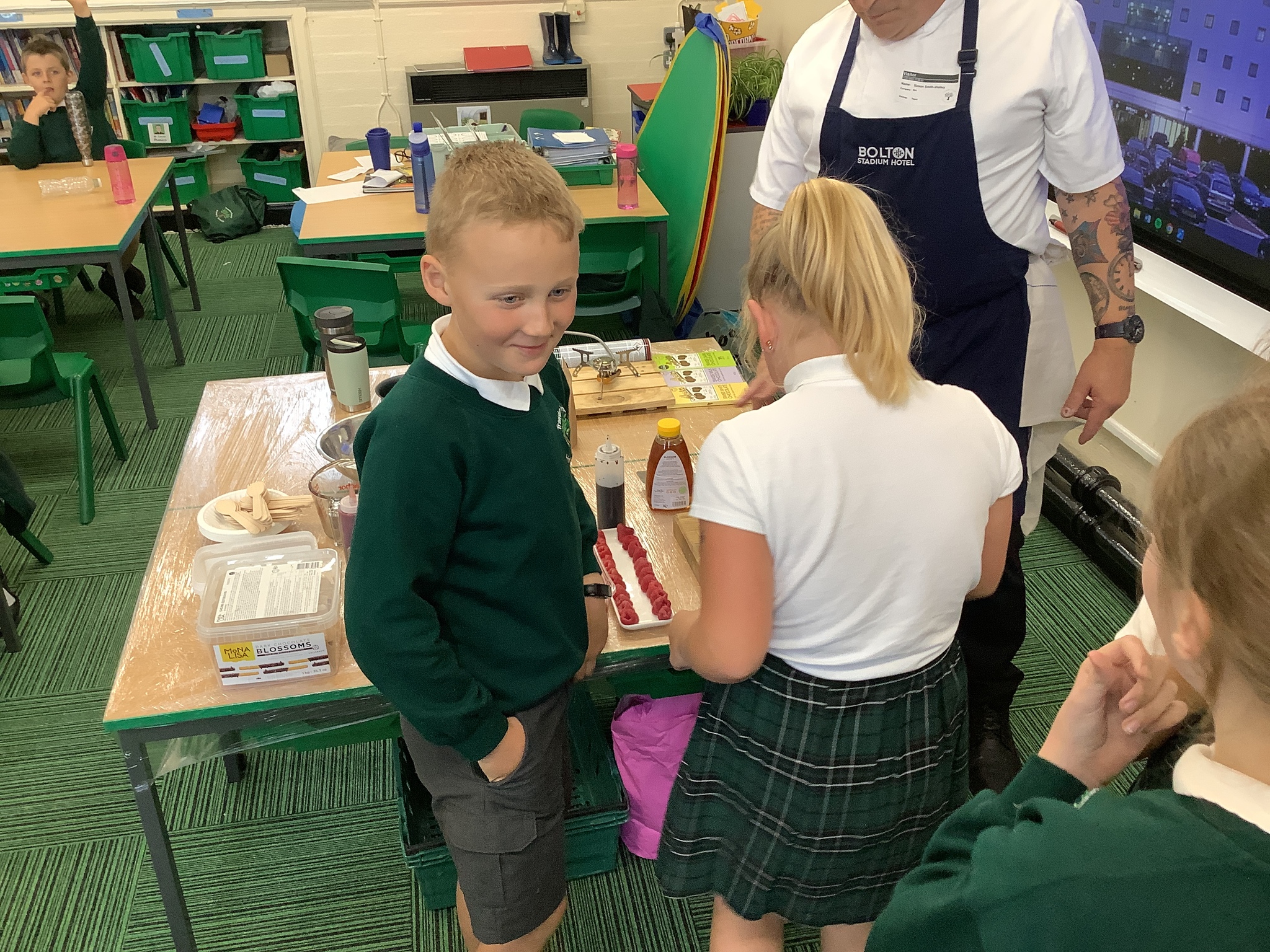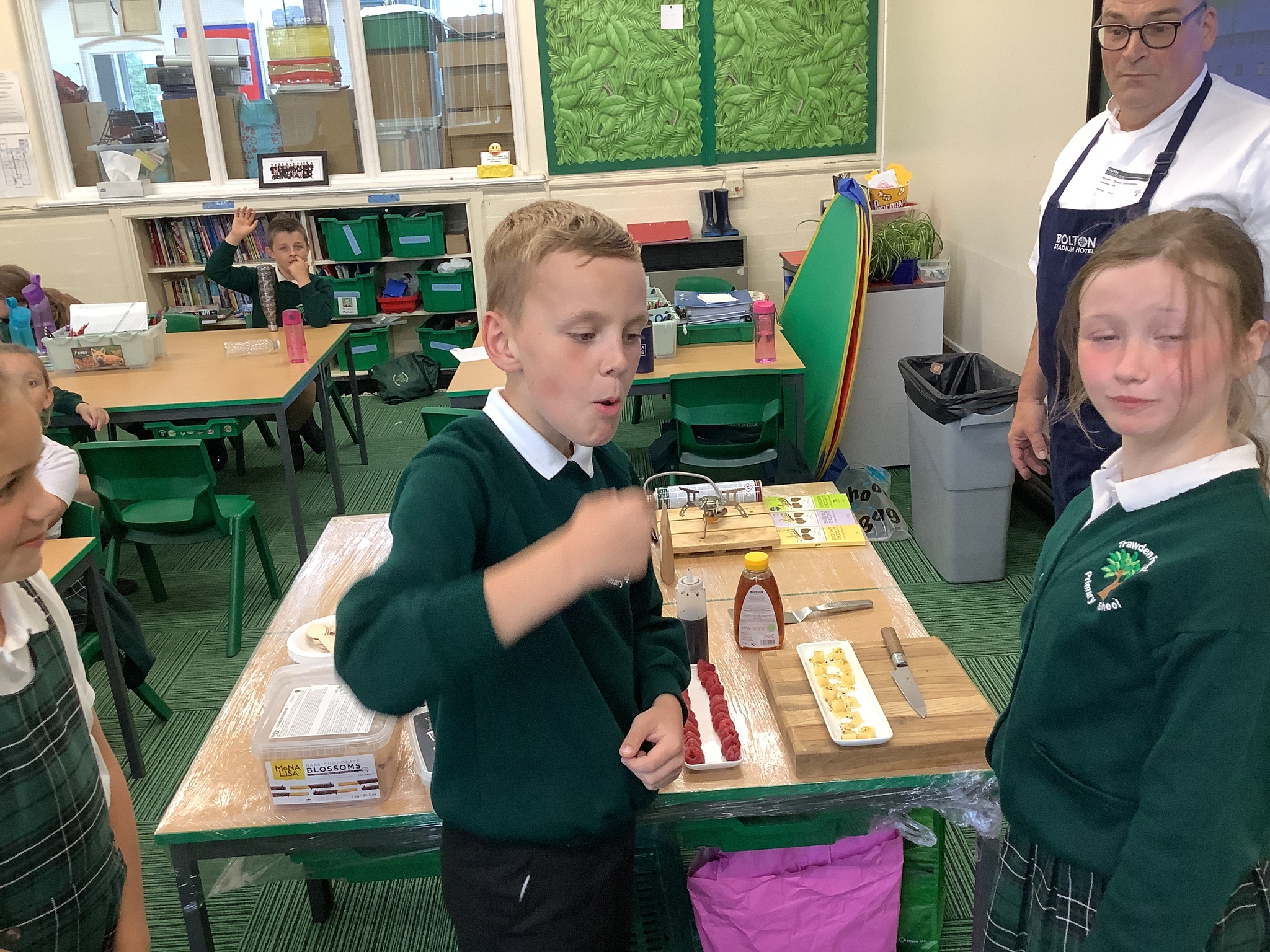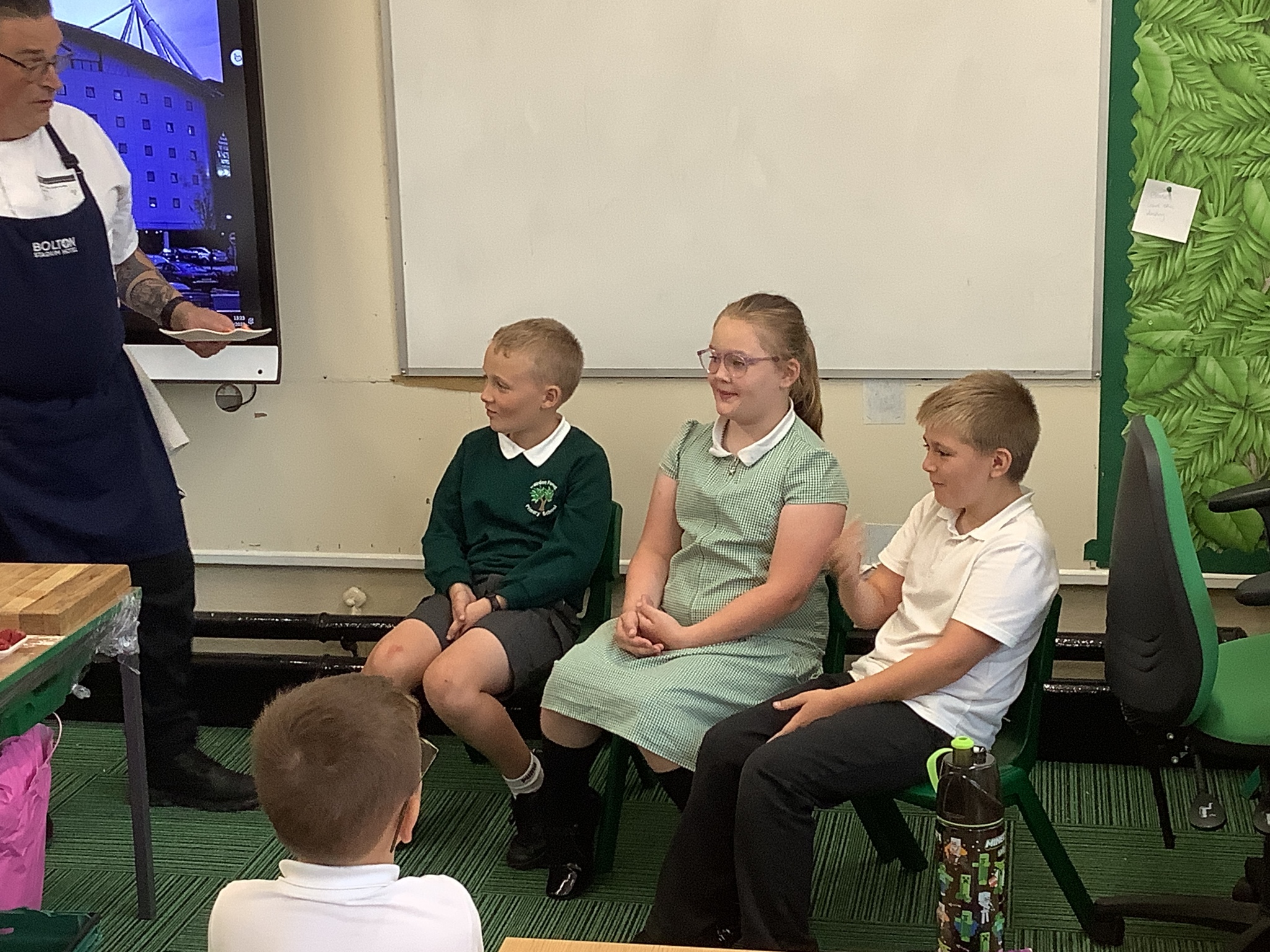 Today, Year 4 had a visit from Chef Simon (Freya's Dad), who is the executive chef at Bolton Stadium Hotel. He started by explaining we first eat with our eyes and then smell before tasting.