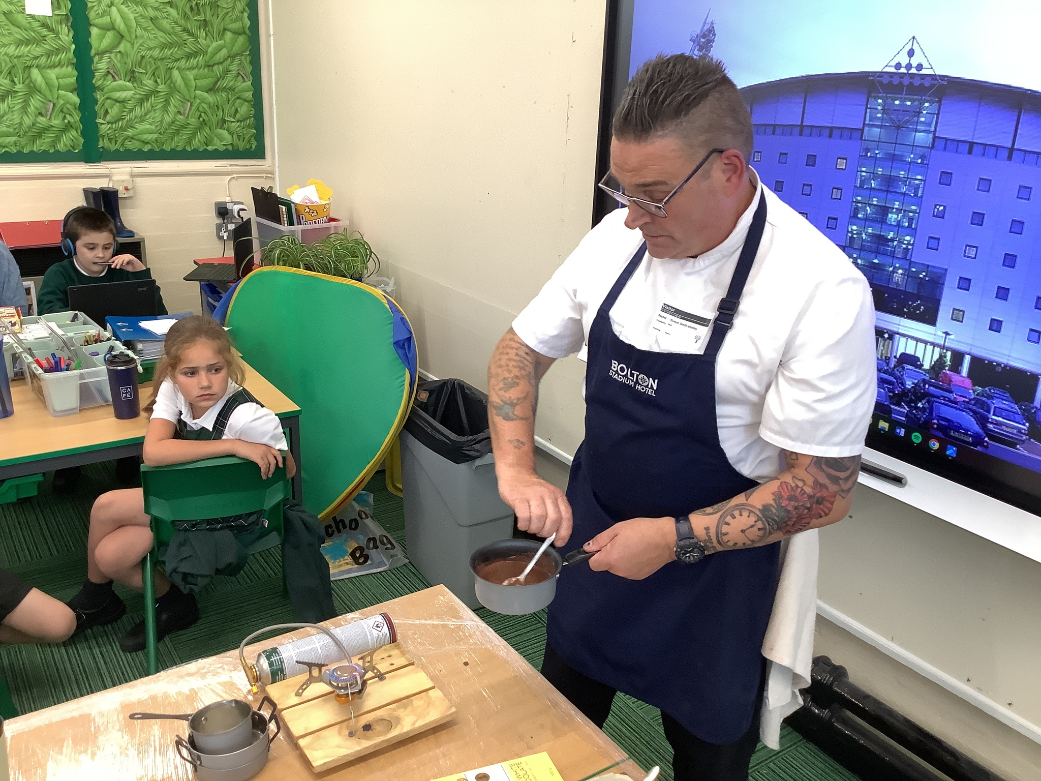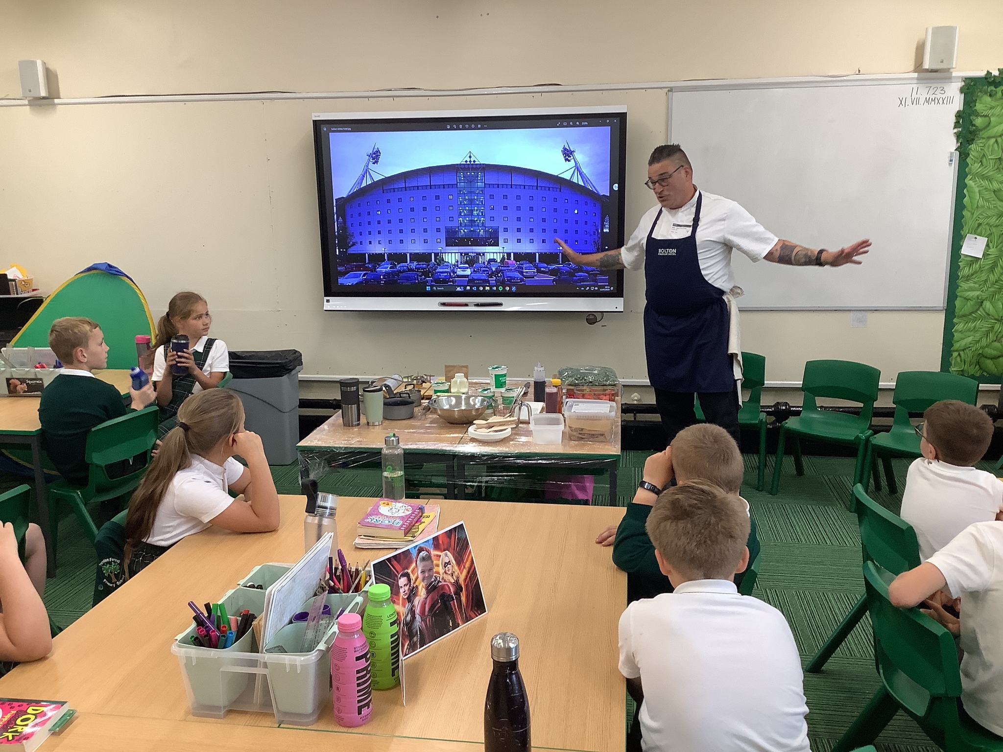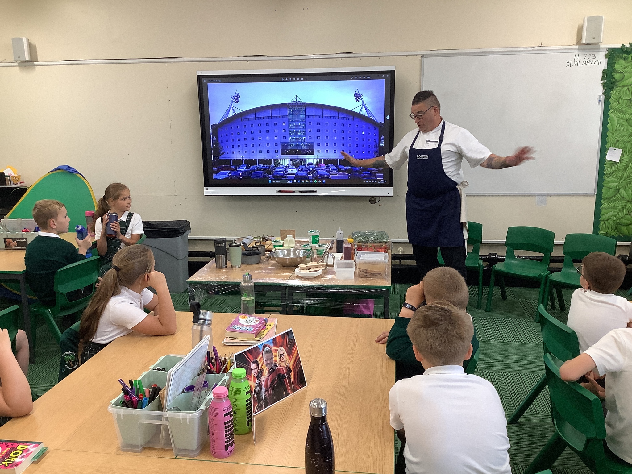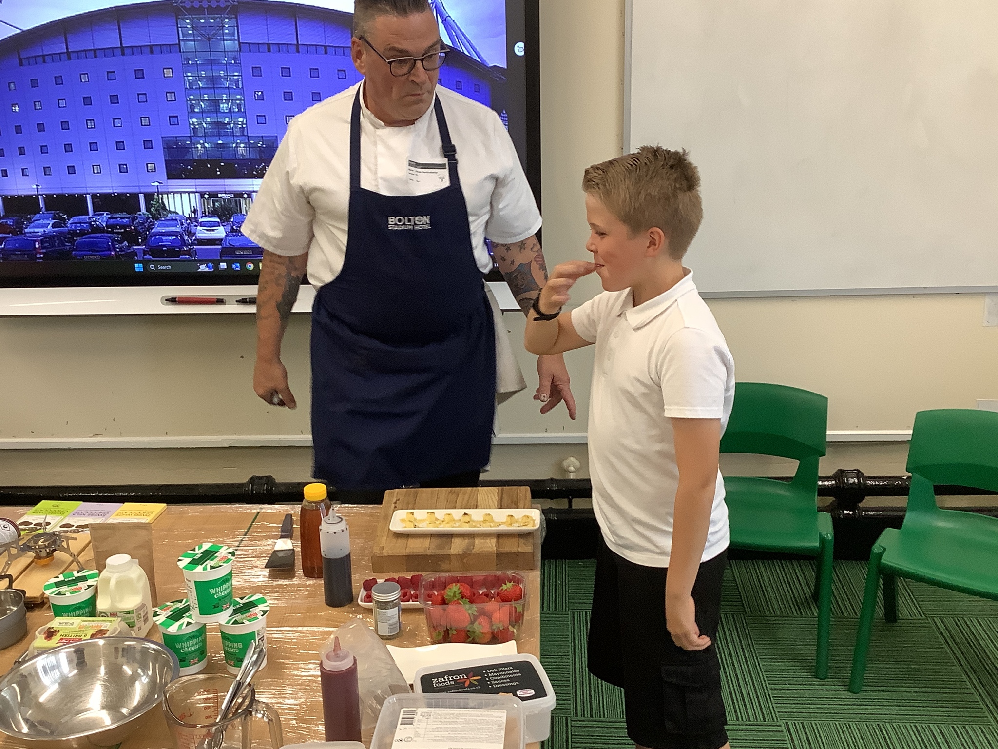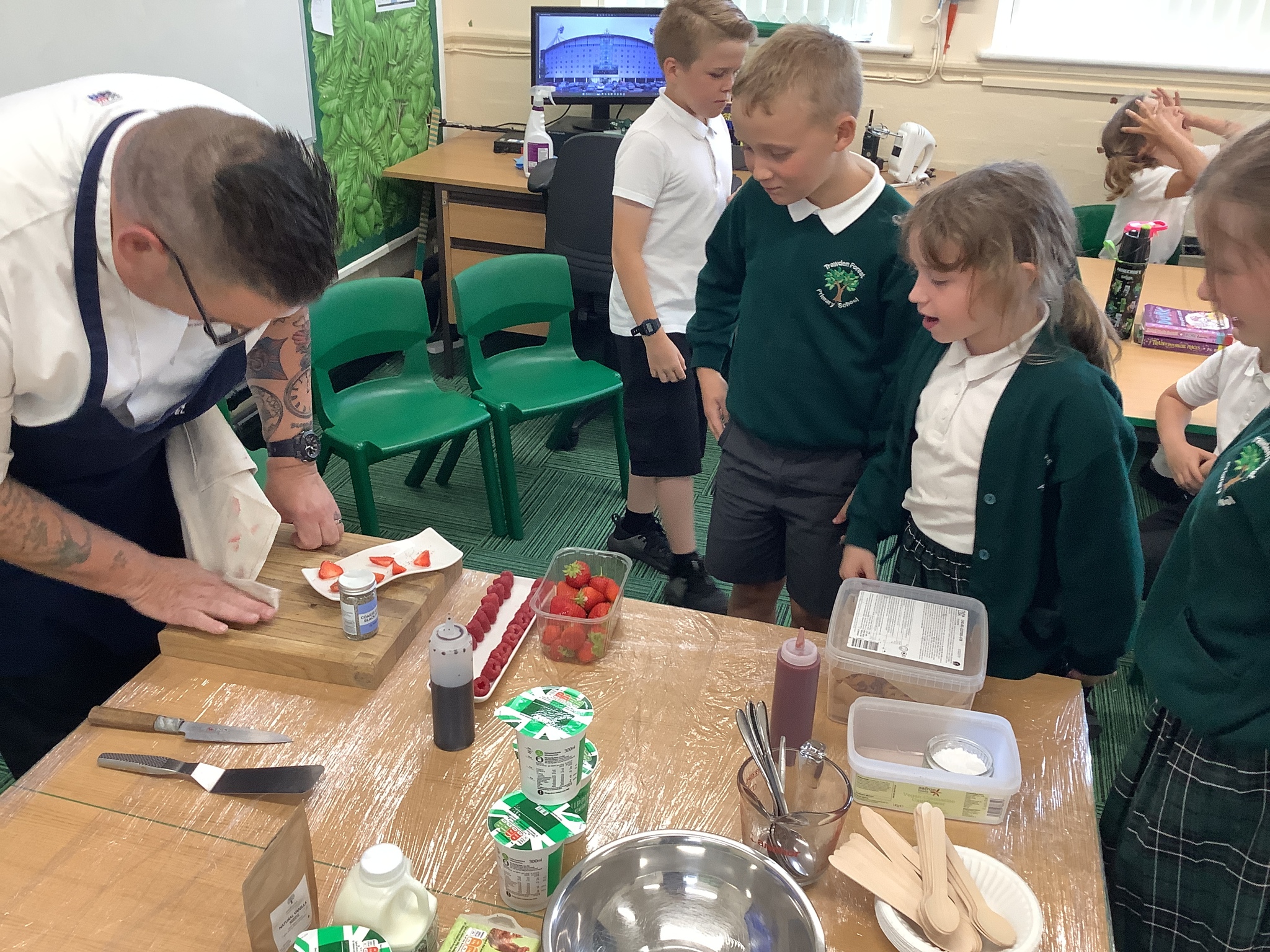 Today, Year 4 had a visit from Chef Simon (Freya's Dad), who is the executive chef at Bolton Stadium Hotel. He started by explaining we first eat with our eyes and then smell before tasting.