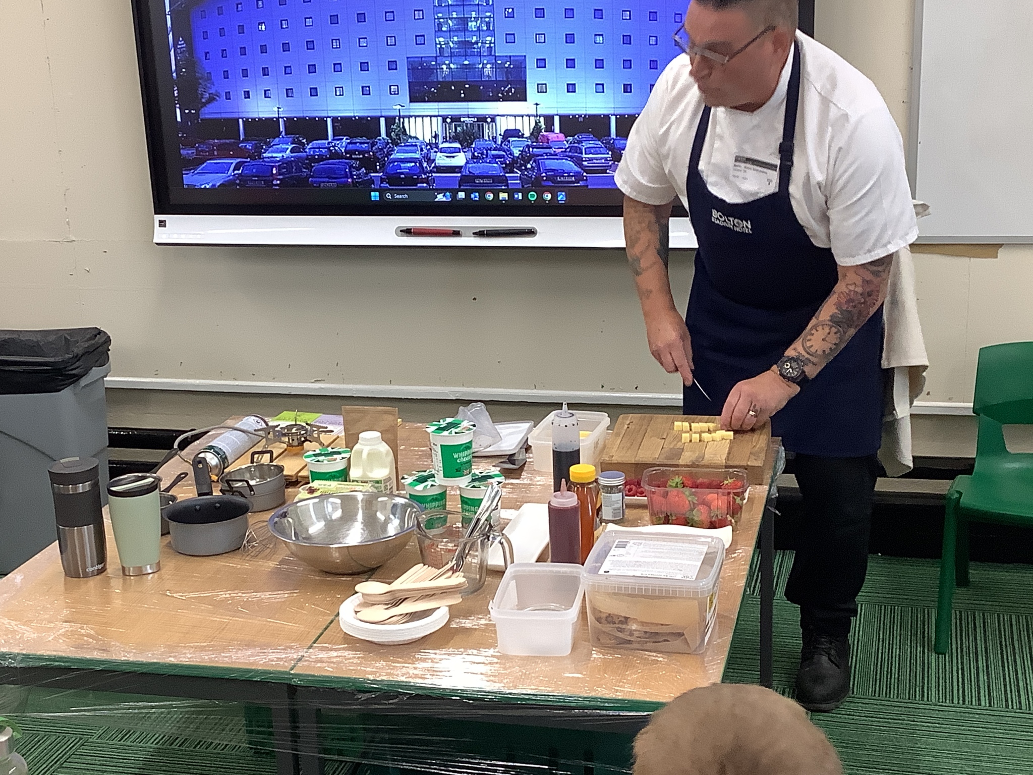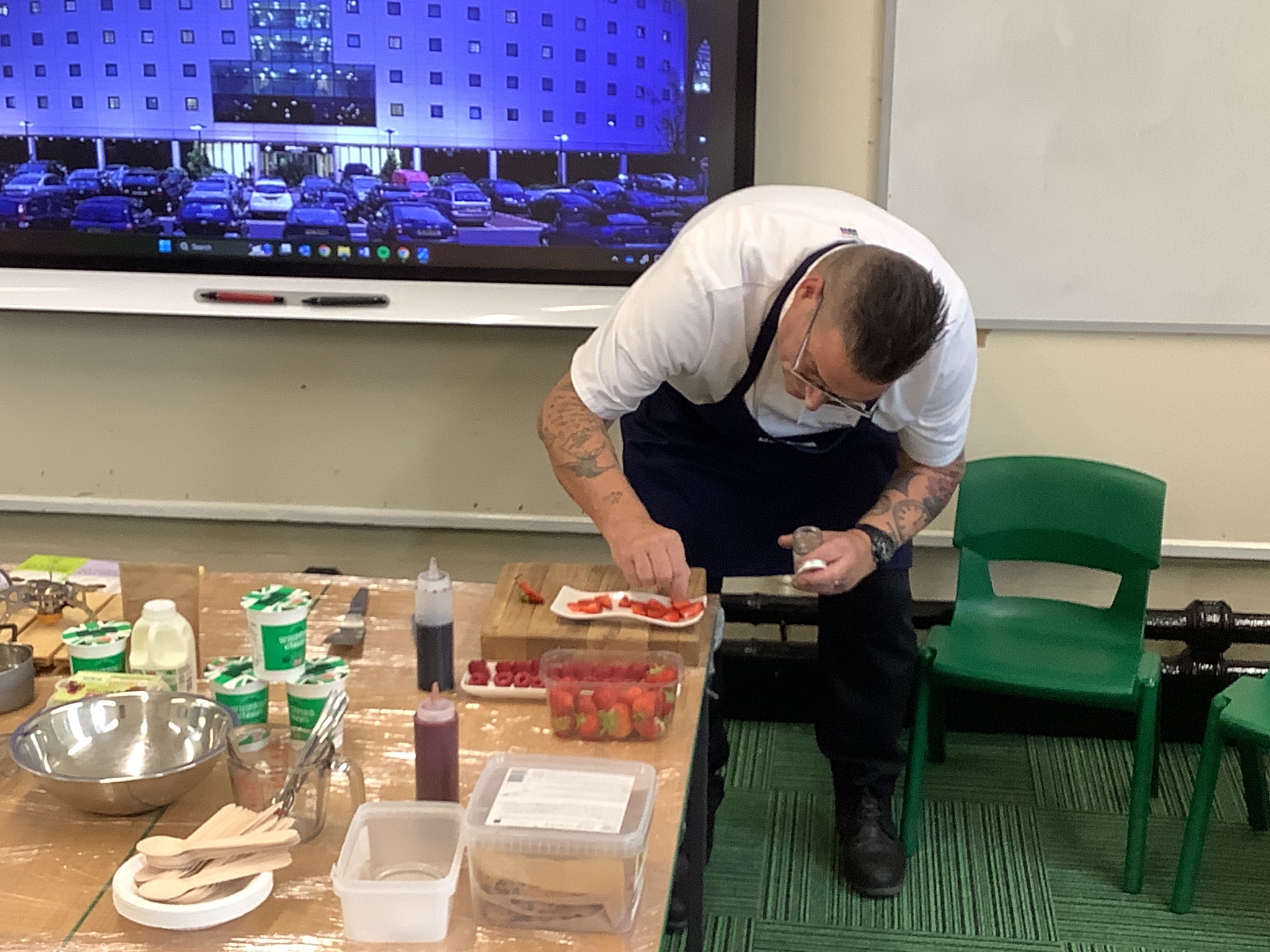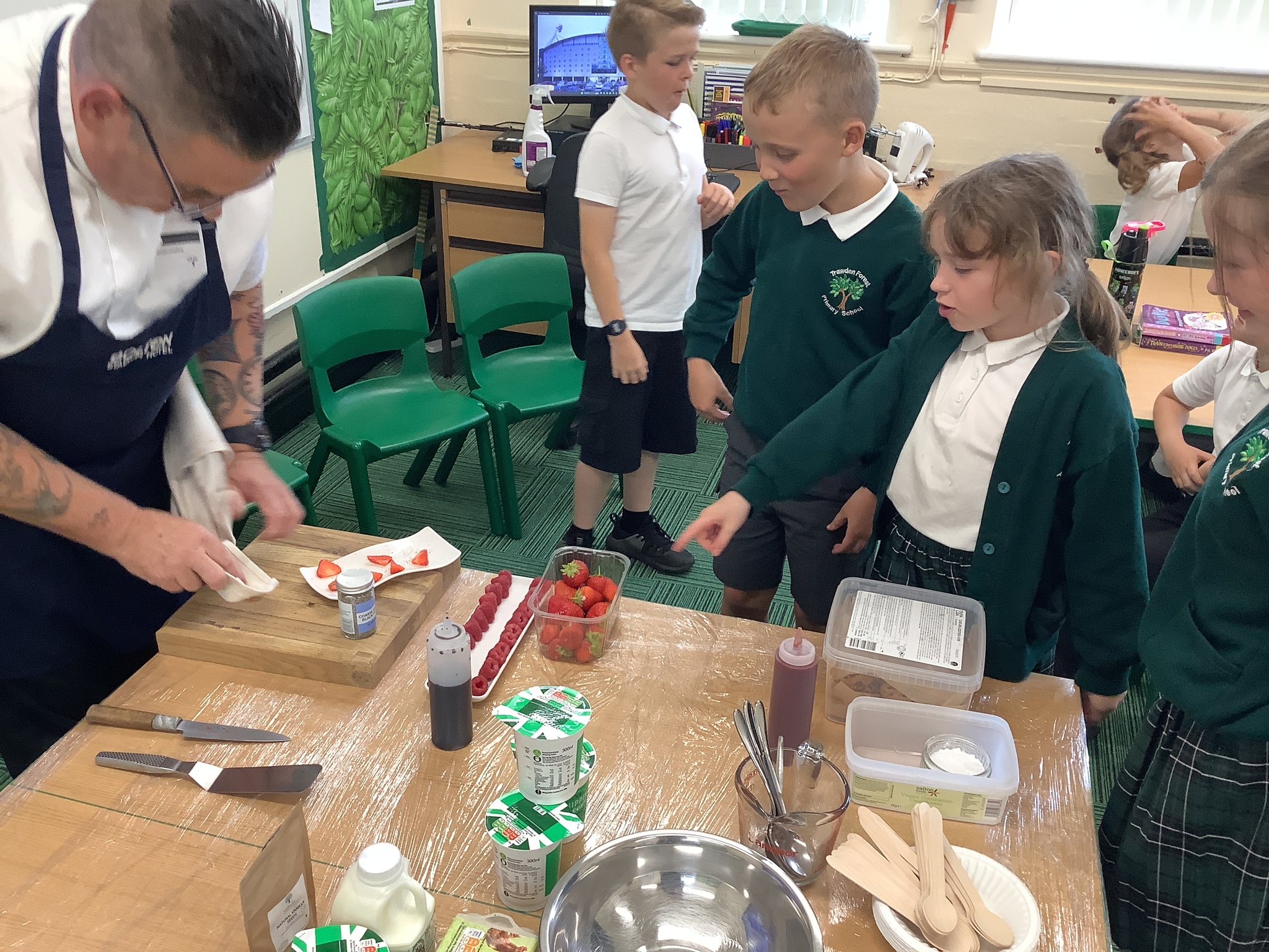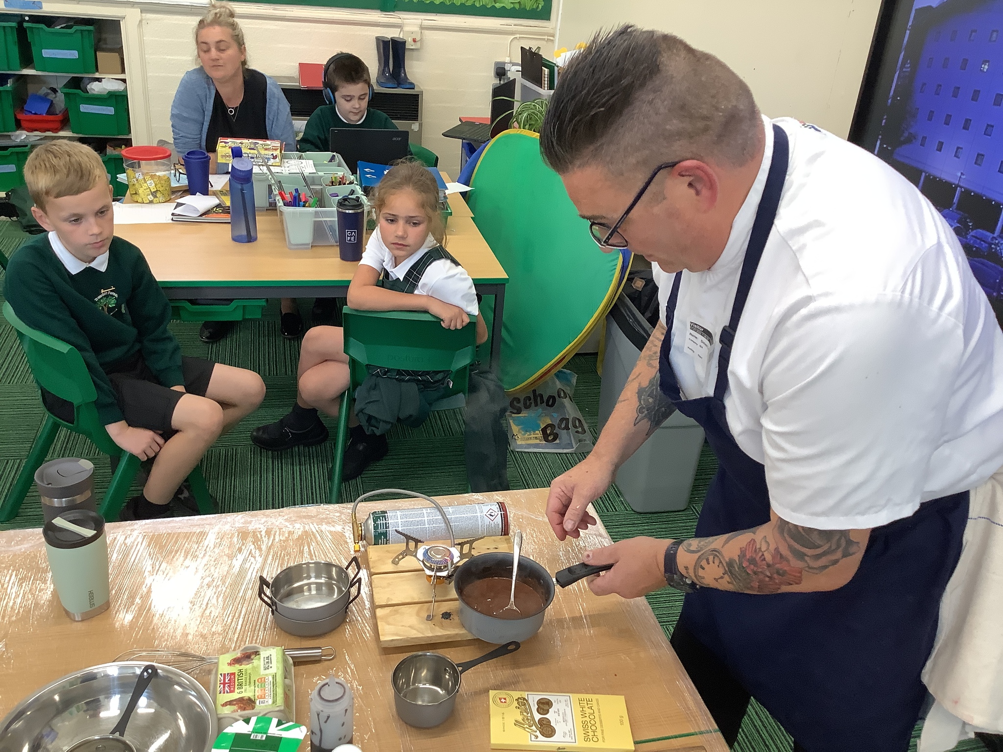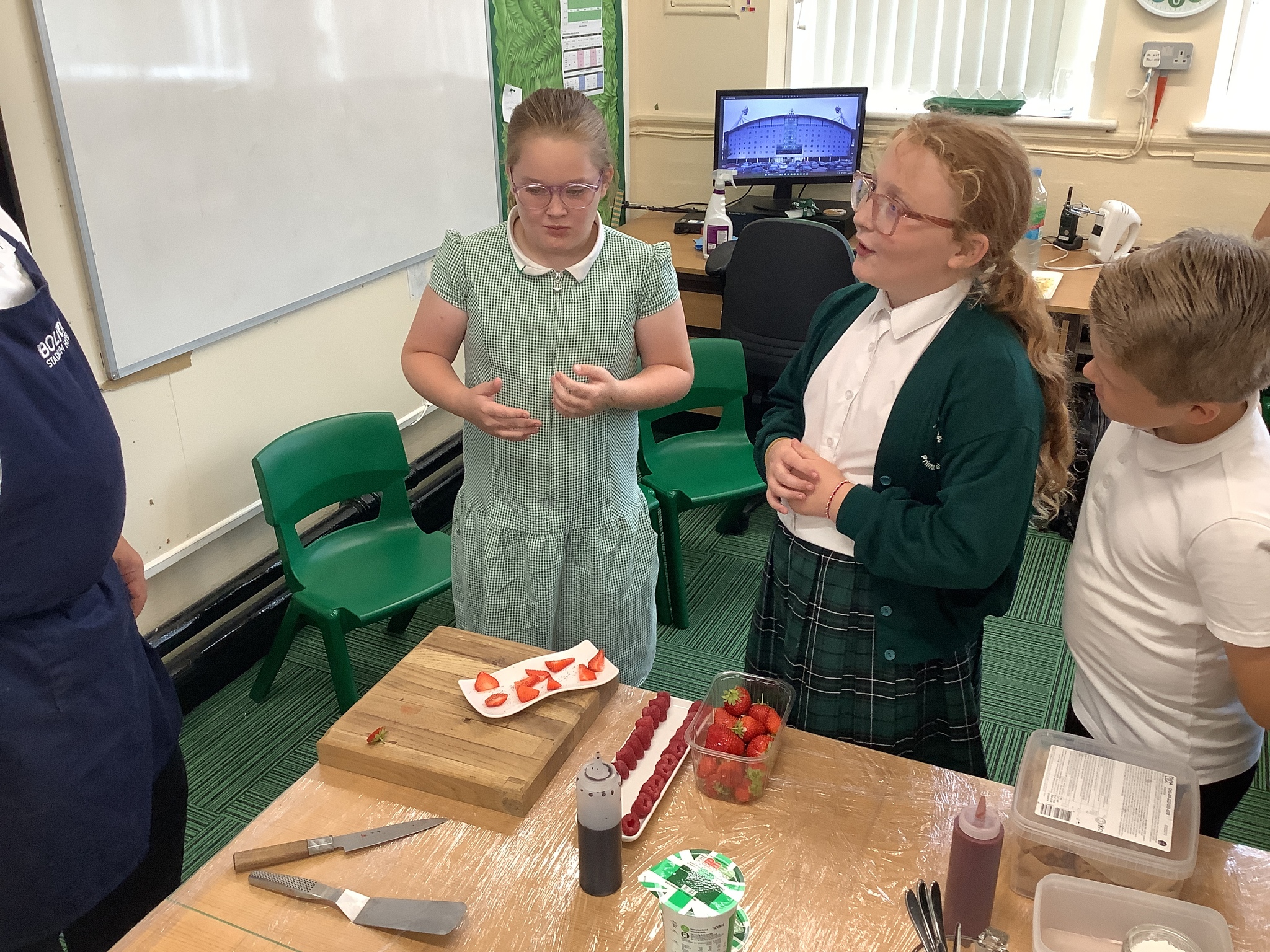 Today, Year 4 had a visit from Chef Simon (Freya's Dad), who is the executive chef at Bolton Stadium Hotel. He started by explaining we first eat with our eyes and then smell before tasting.