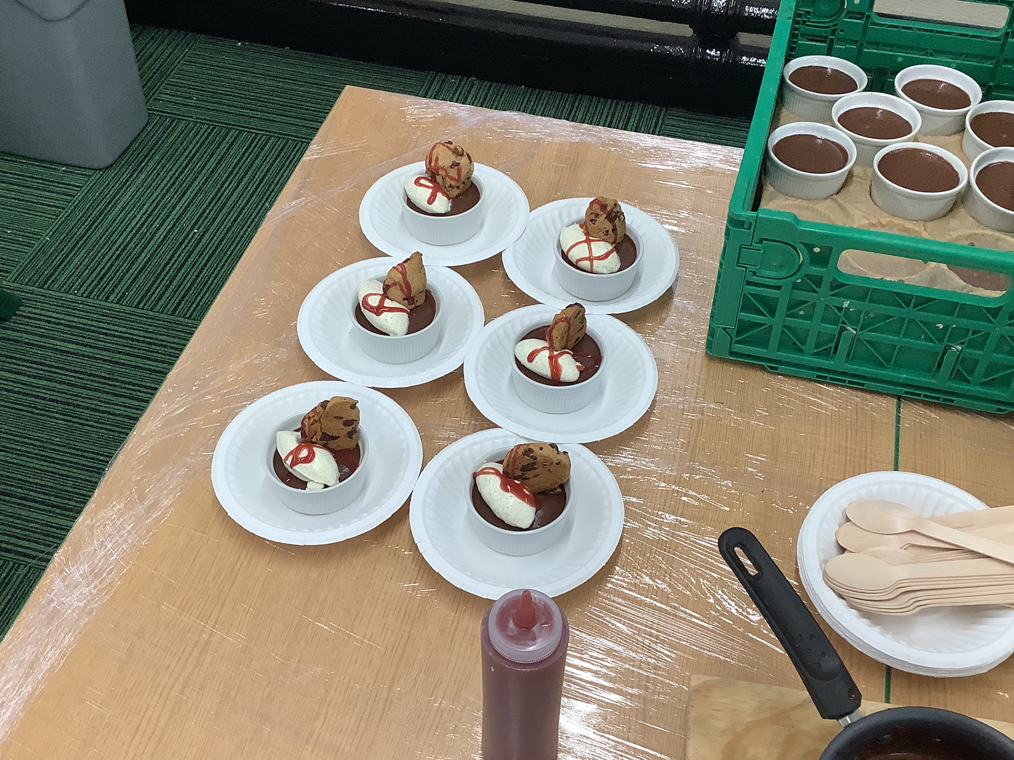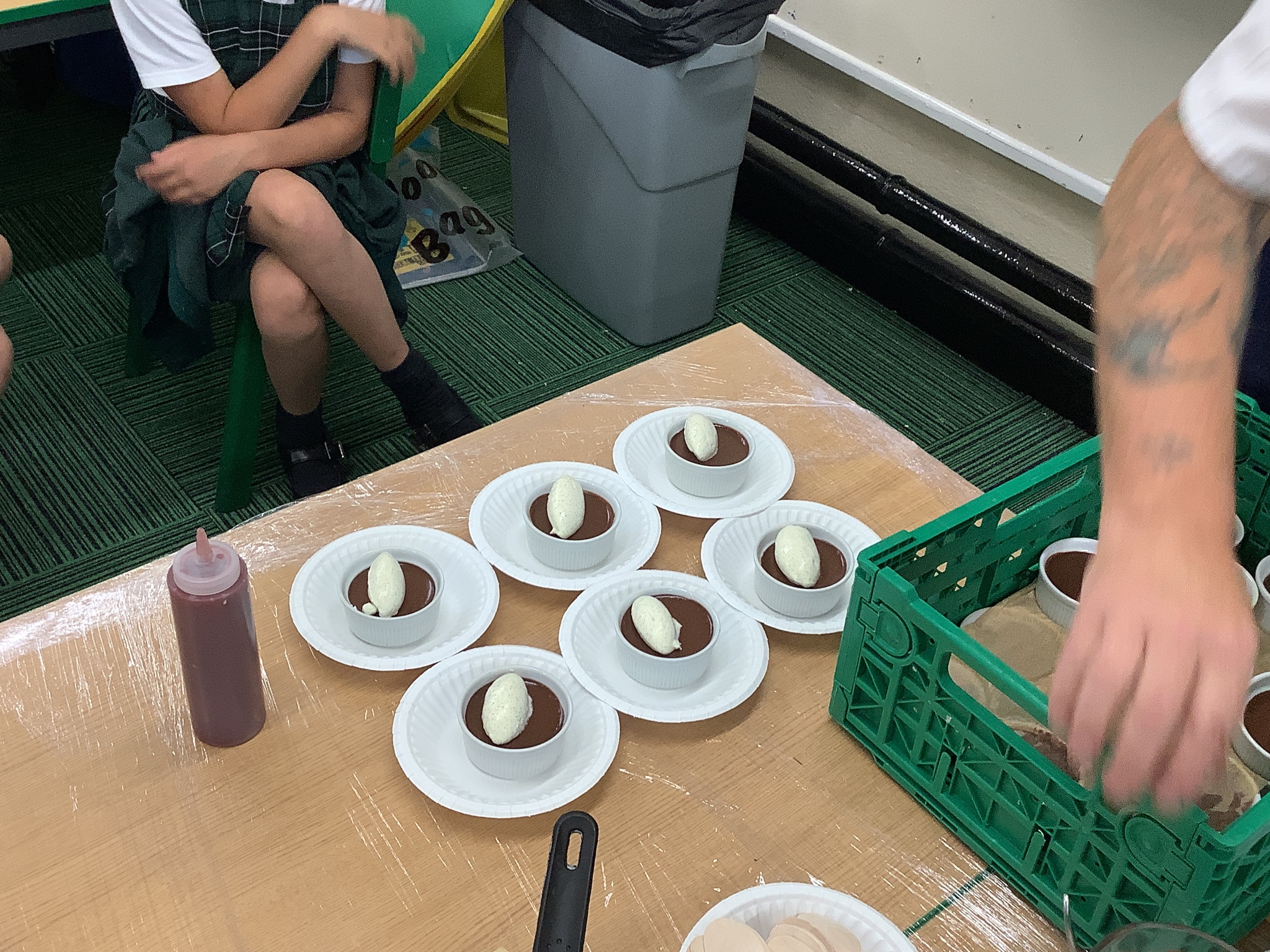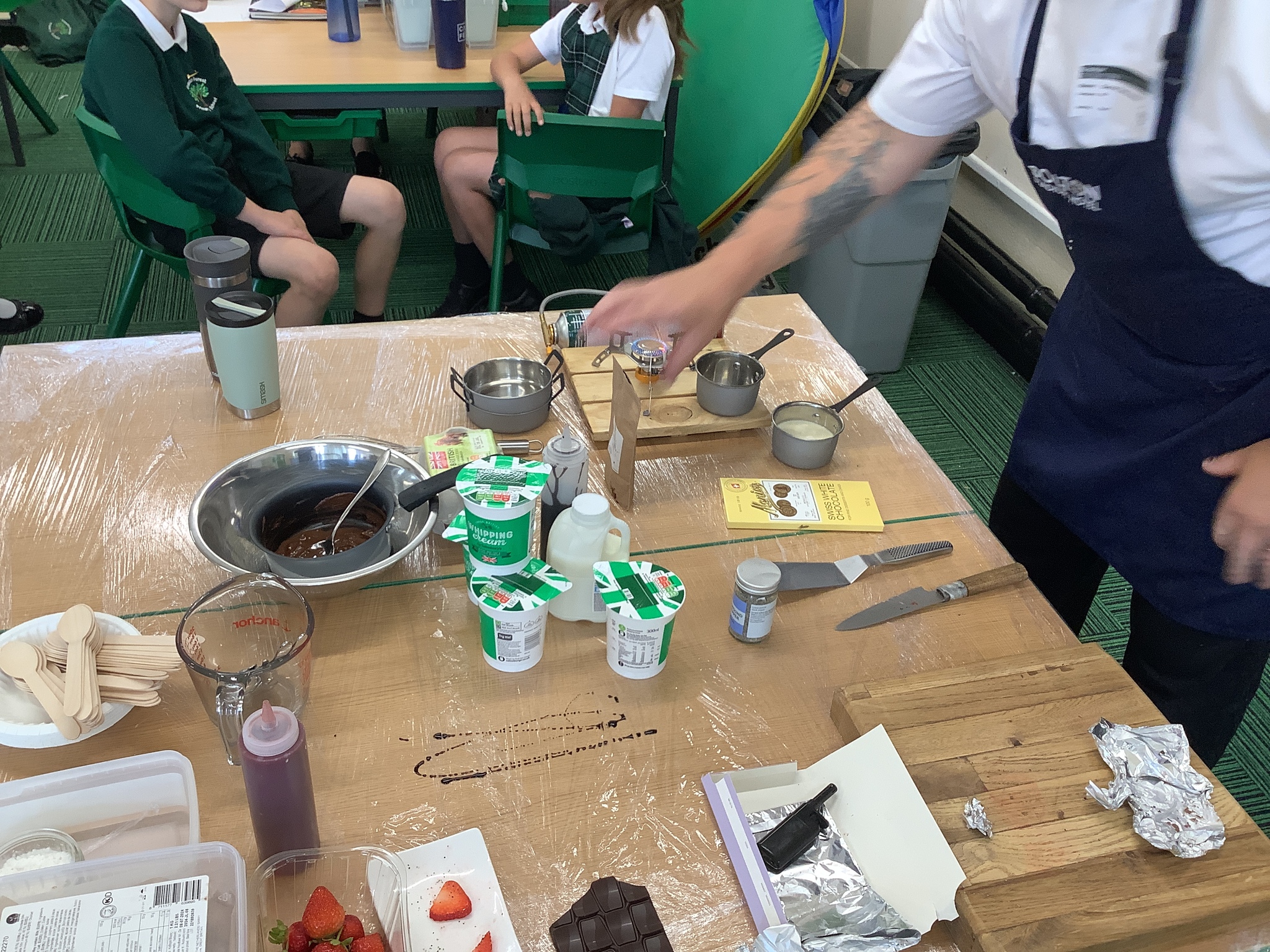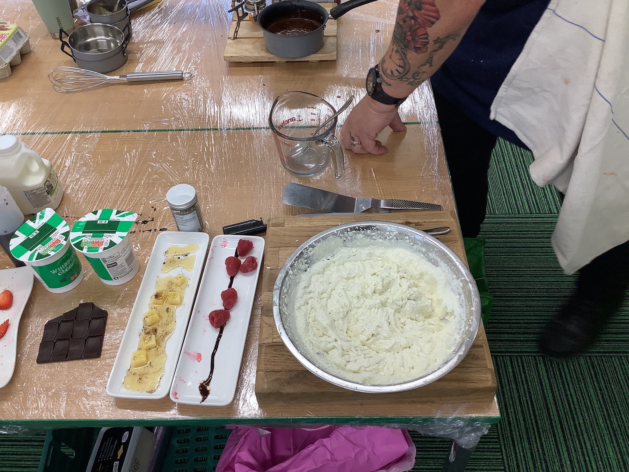 Finally, he had prepared a dessert for us to eat (and an extra couple for Mrs Stinchon and Miss Ridehalgh). This was a chocolate mousse, with freshly made quenelle whipped cream, a cookie and raspberry sauce. This is highly recommended by the children and adults!
