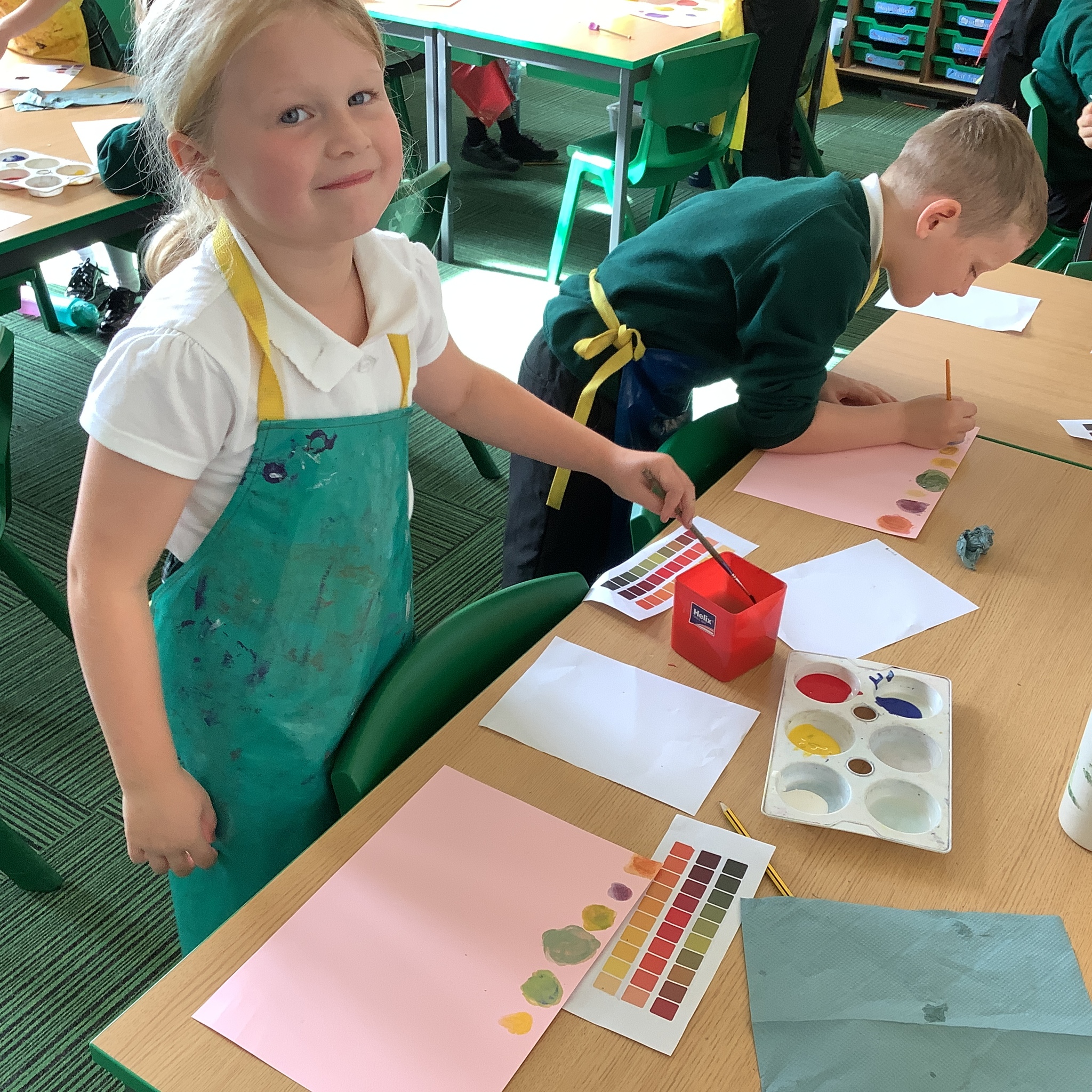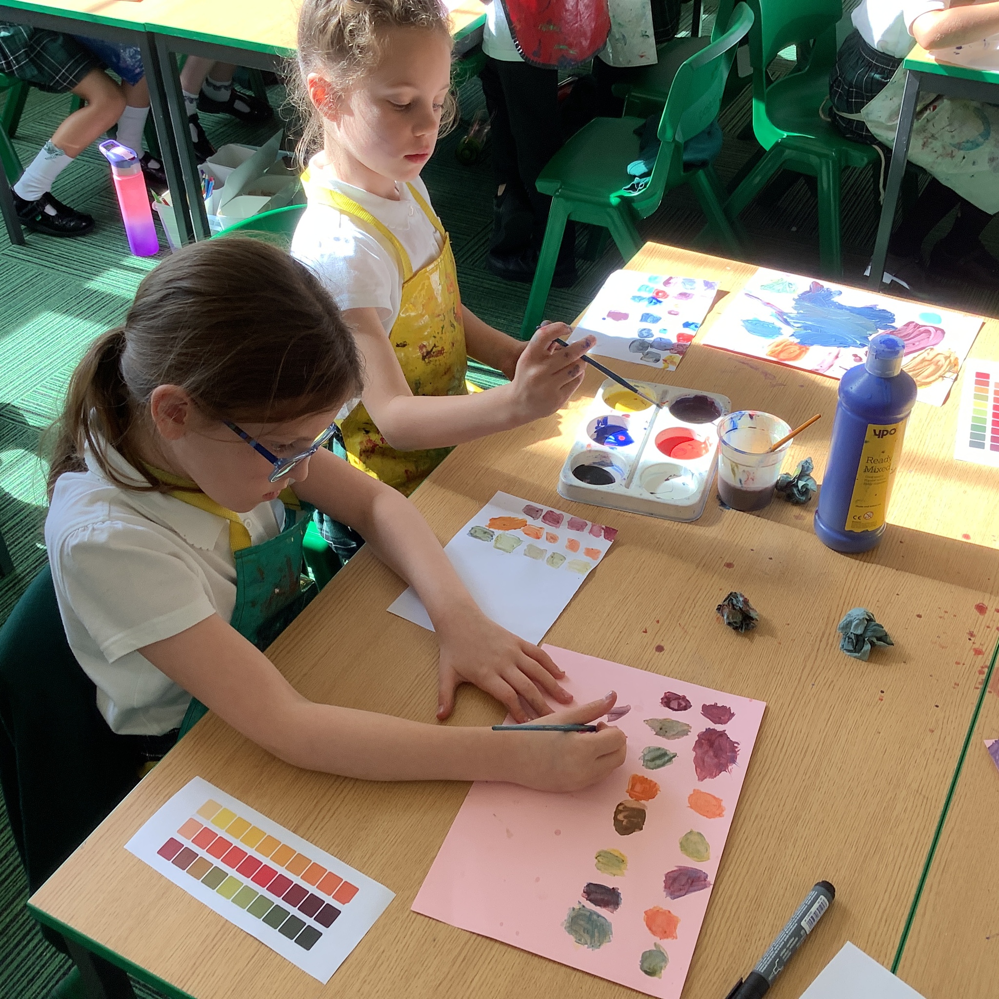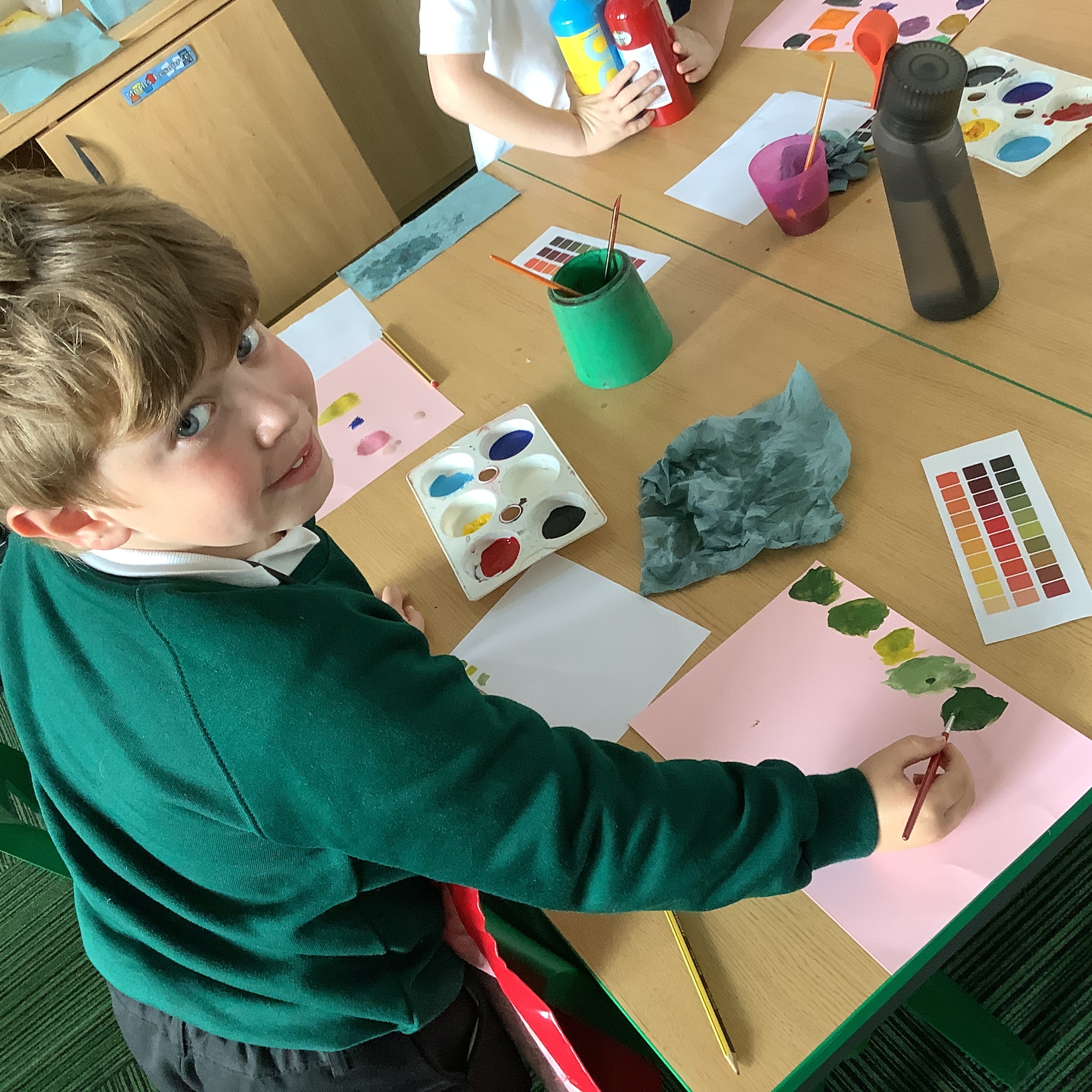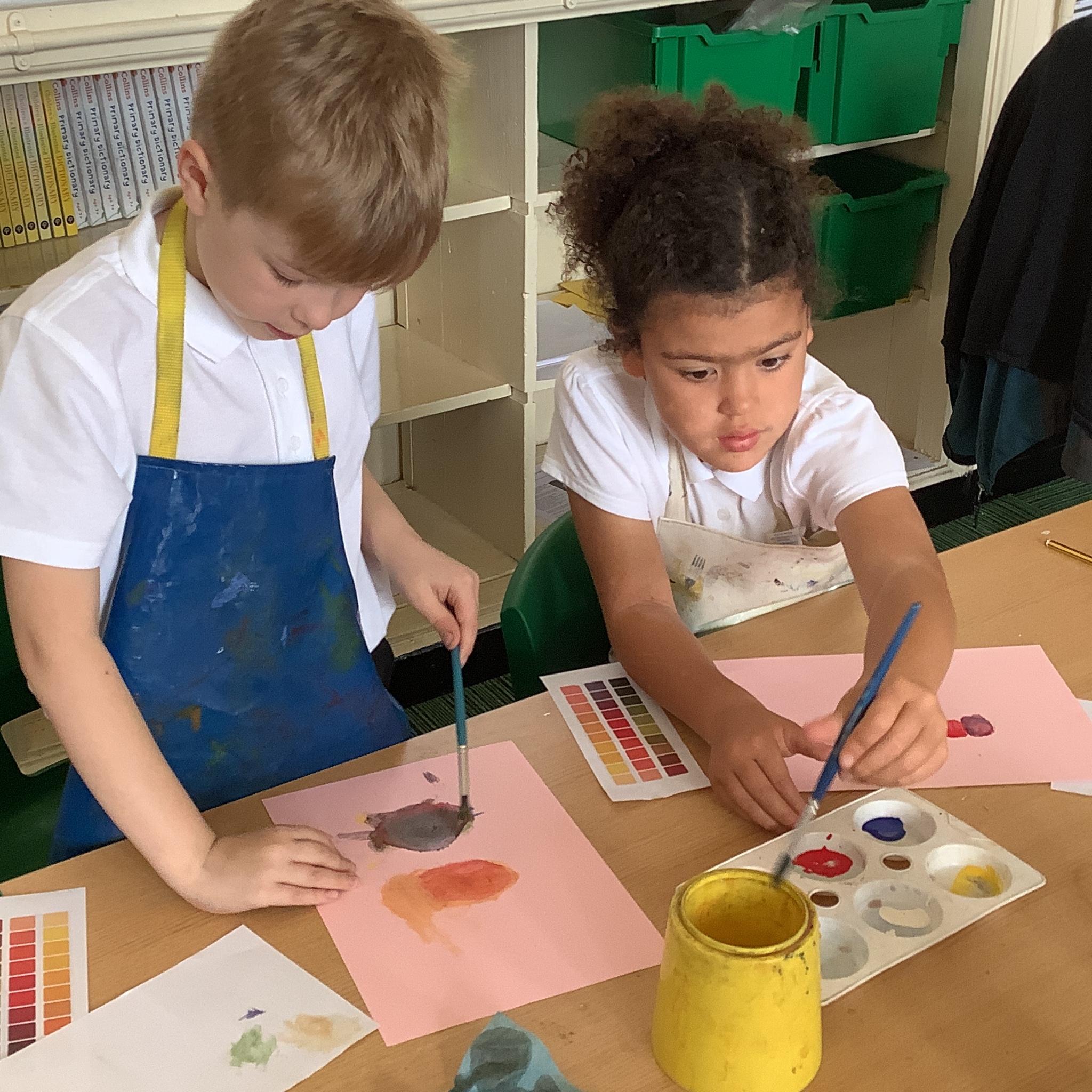 In English, we are going to write a poem about autumn so we watched a video clip of many autumnal images and events. We then discussed many alternative words for different shades of brown, yellow and red such as maroon, flame, salmon, coffee, chocolate, cherry and burnt orange. Following this, we examined some colour swatches and recreated autumn colours in paint. Year 3 did a fantastic job organising themselves and were great artistic inventors!