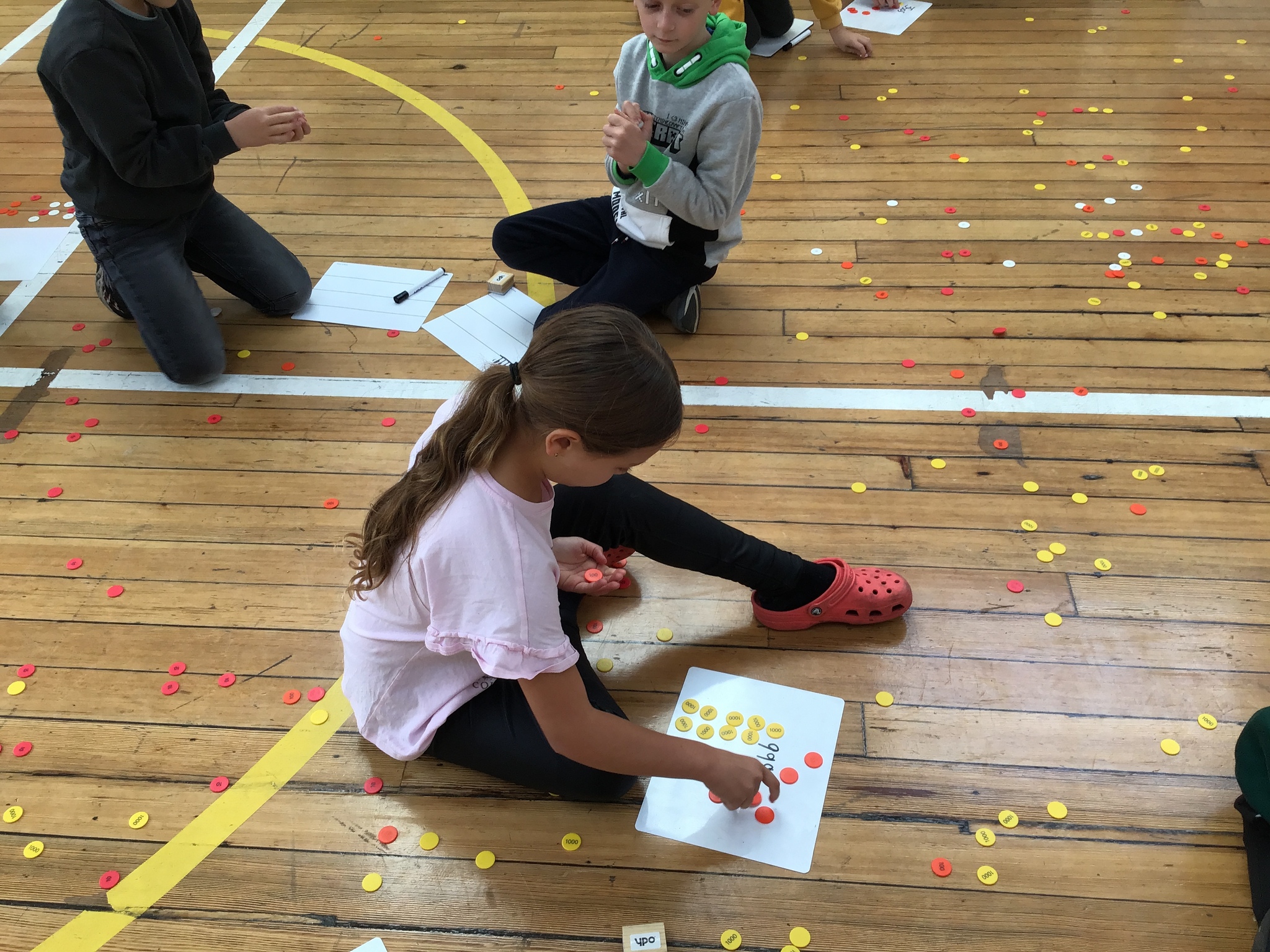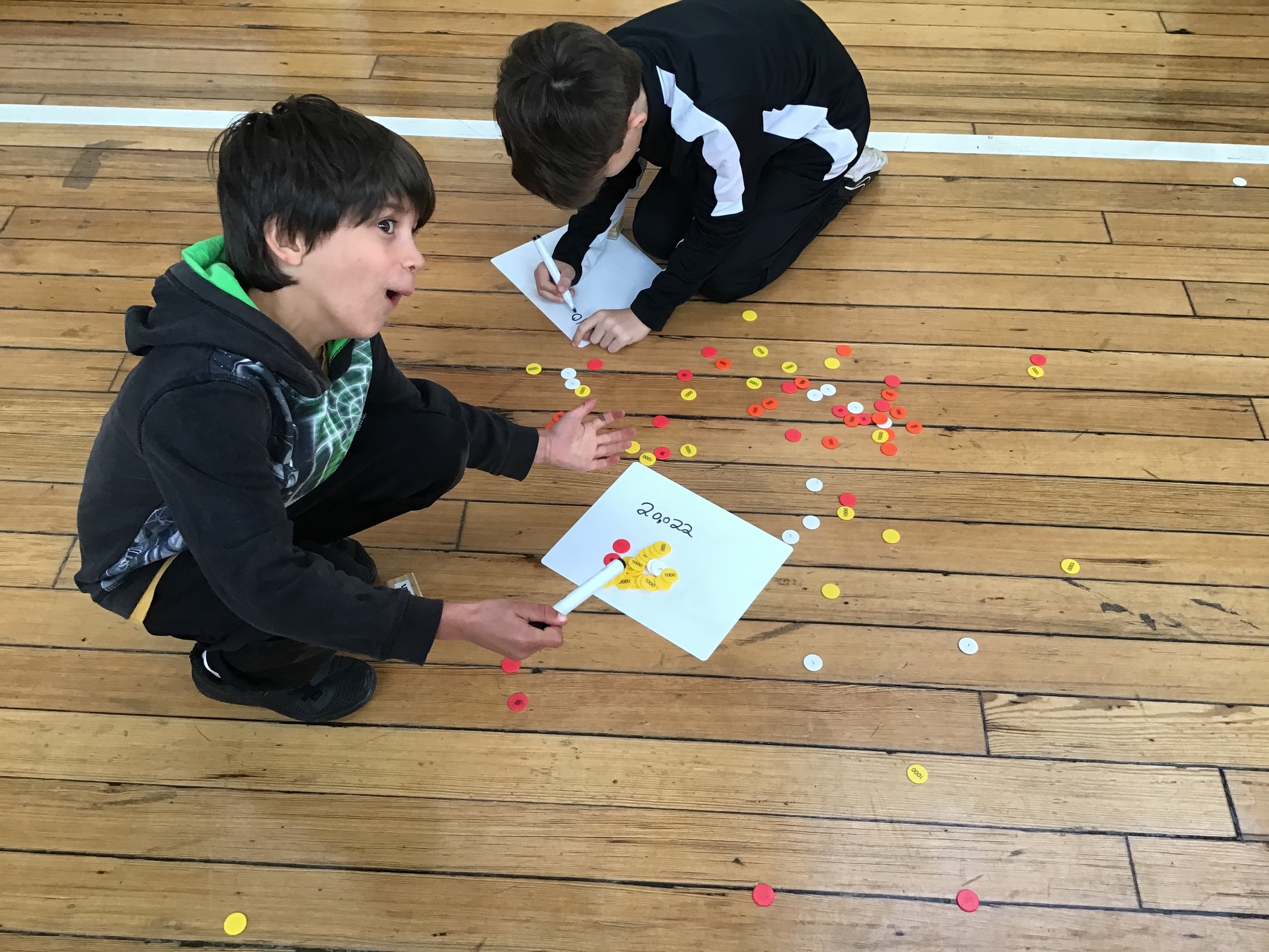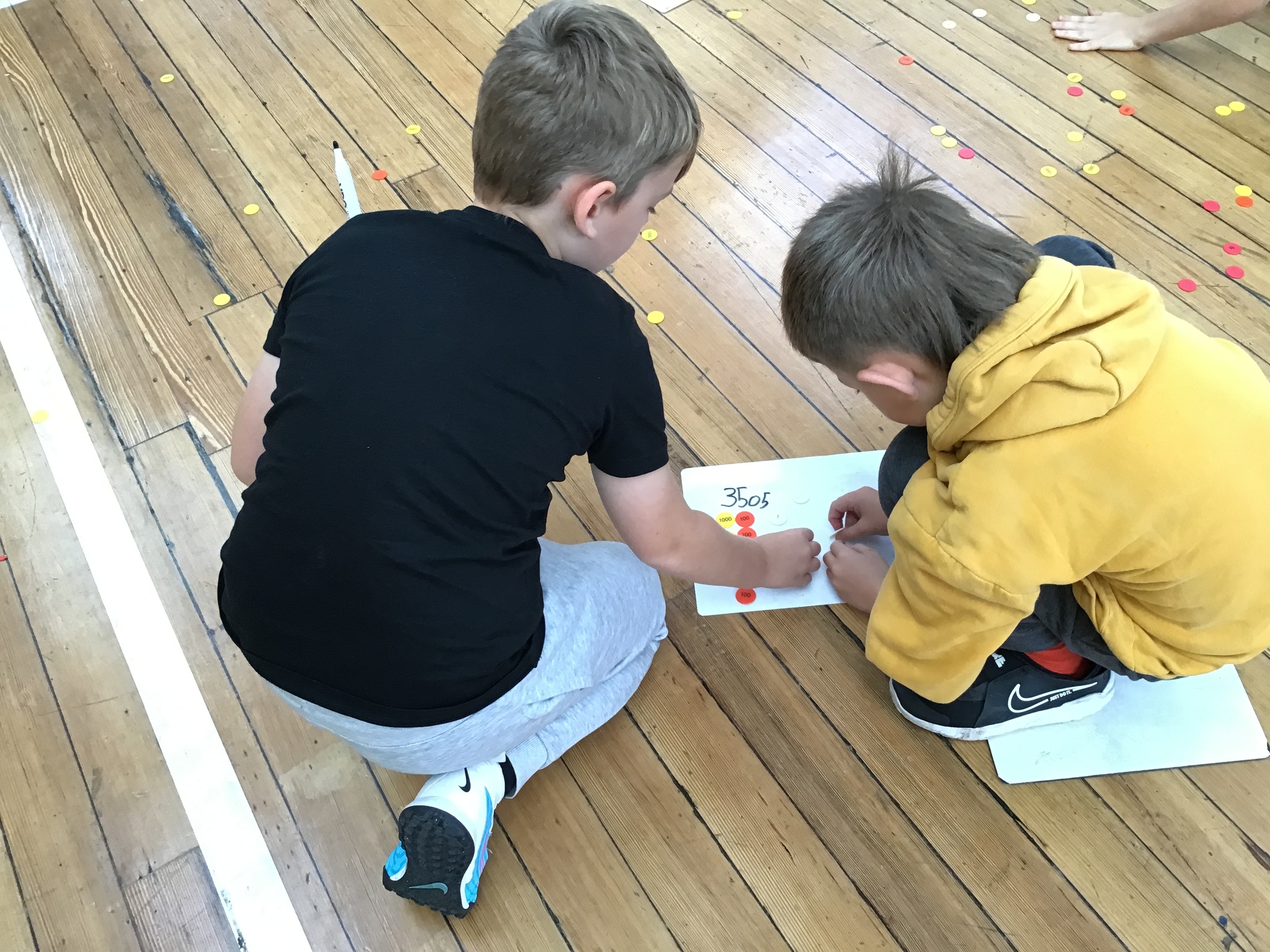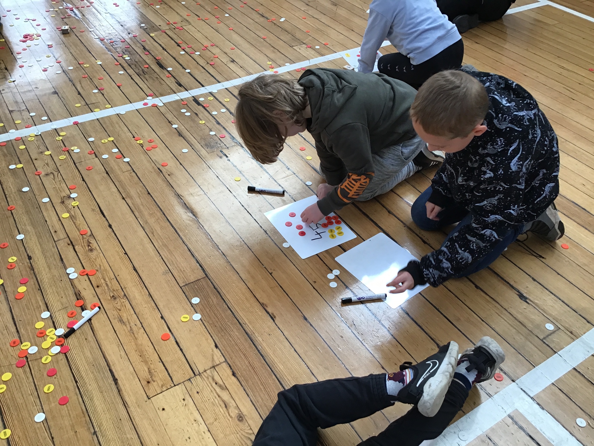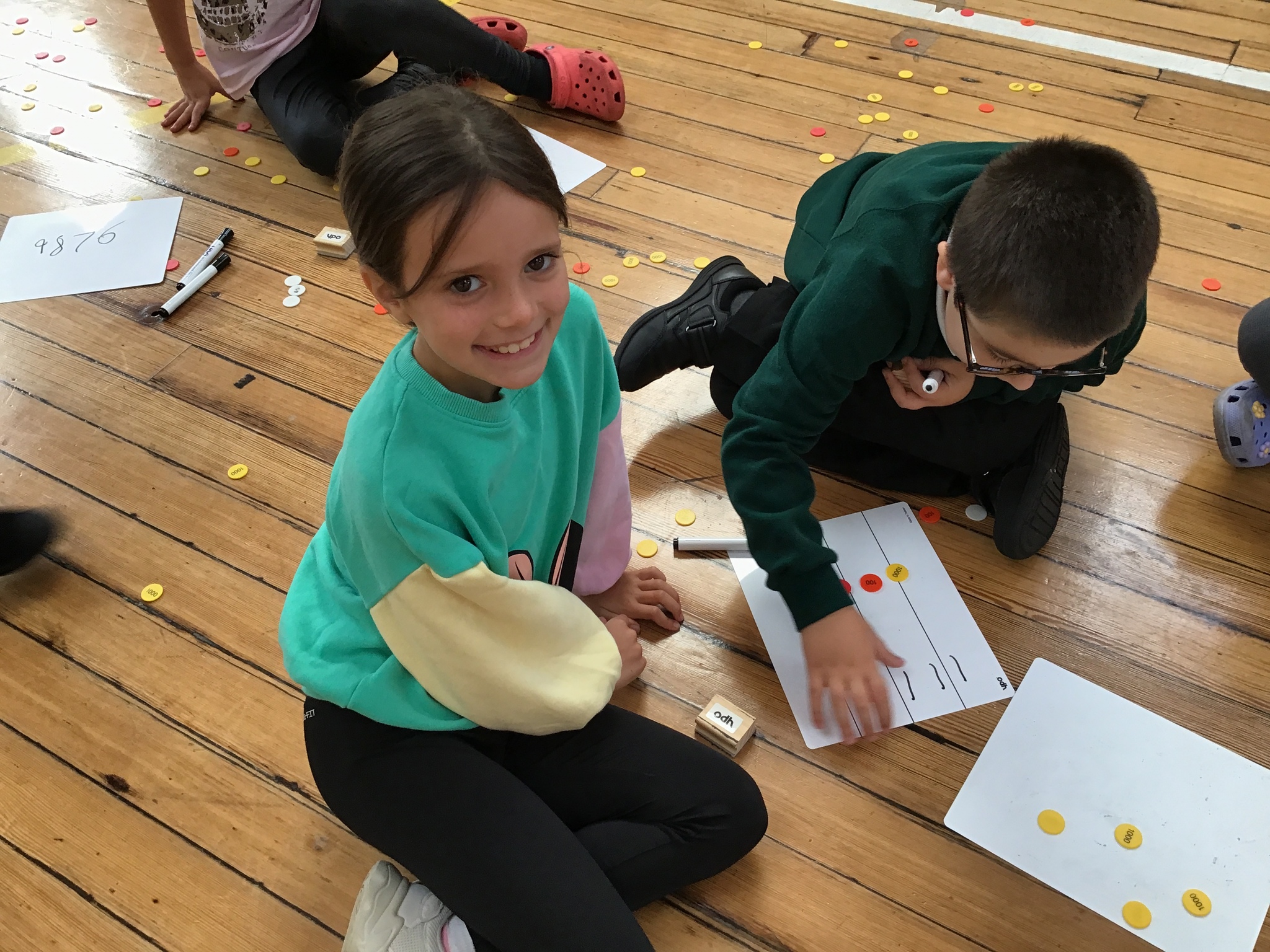 In this interactive activity, place value counters were scattered all over the hall, creating an exhilarating challenge for our little mathematicians. They had to work collaboratively with their partners to write a number and then find the counters to make that number!