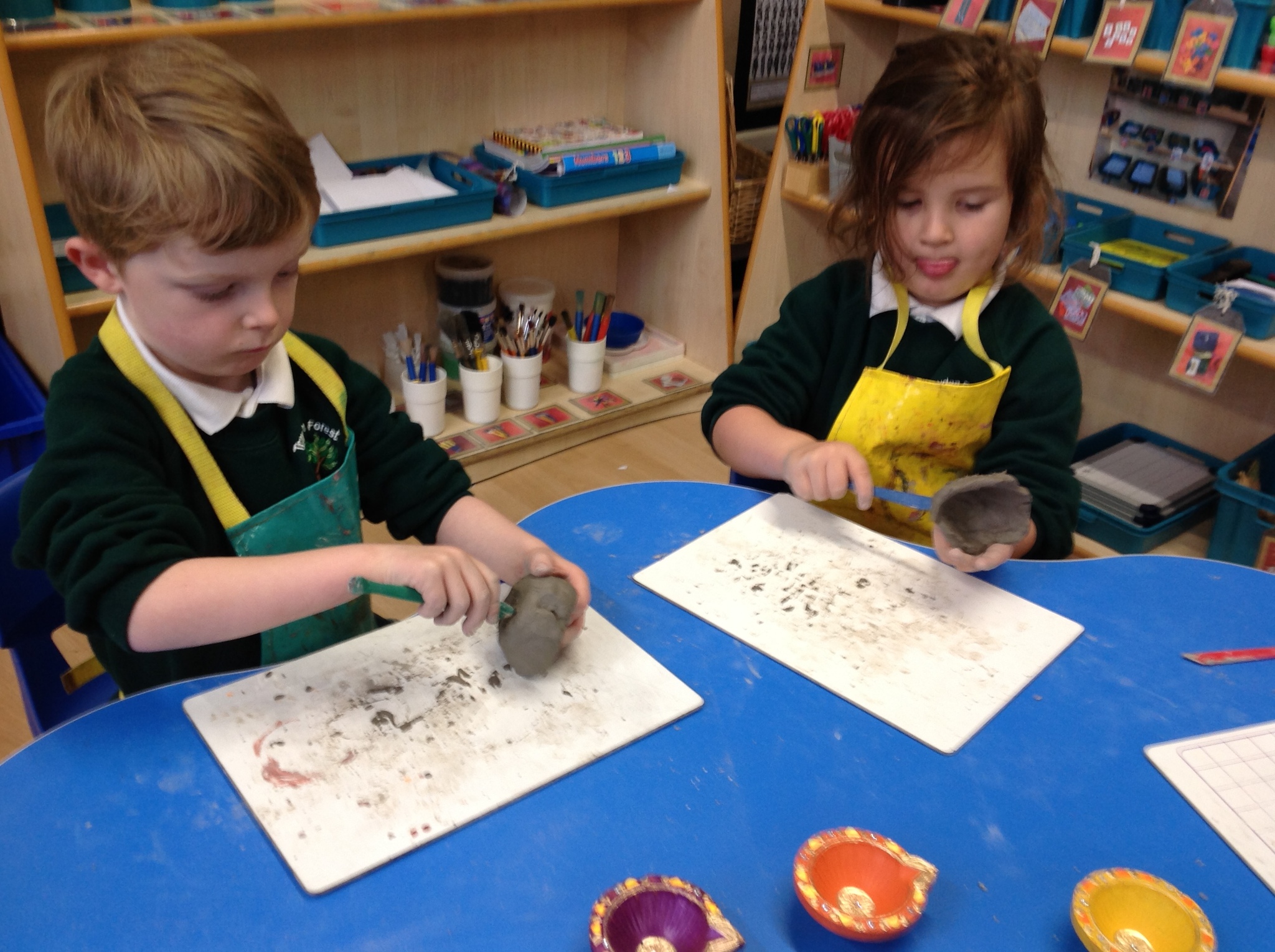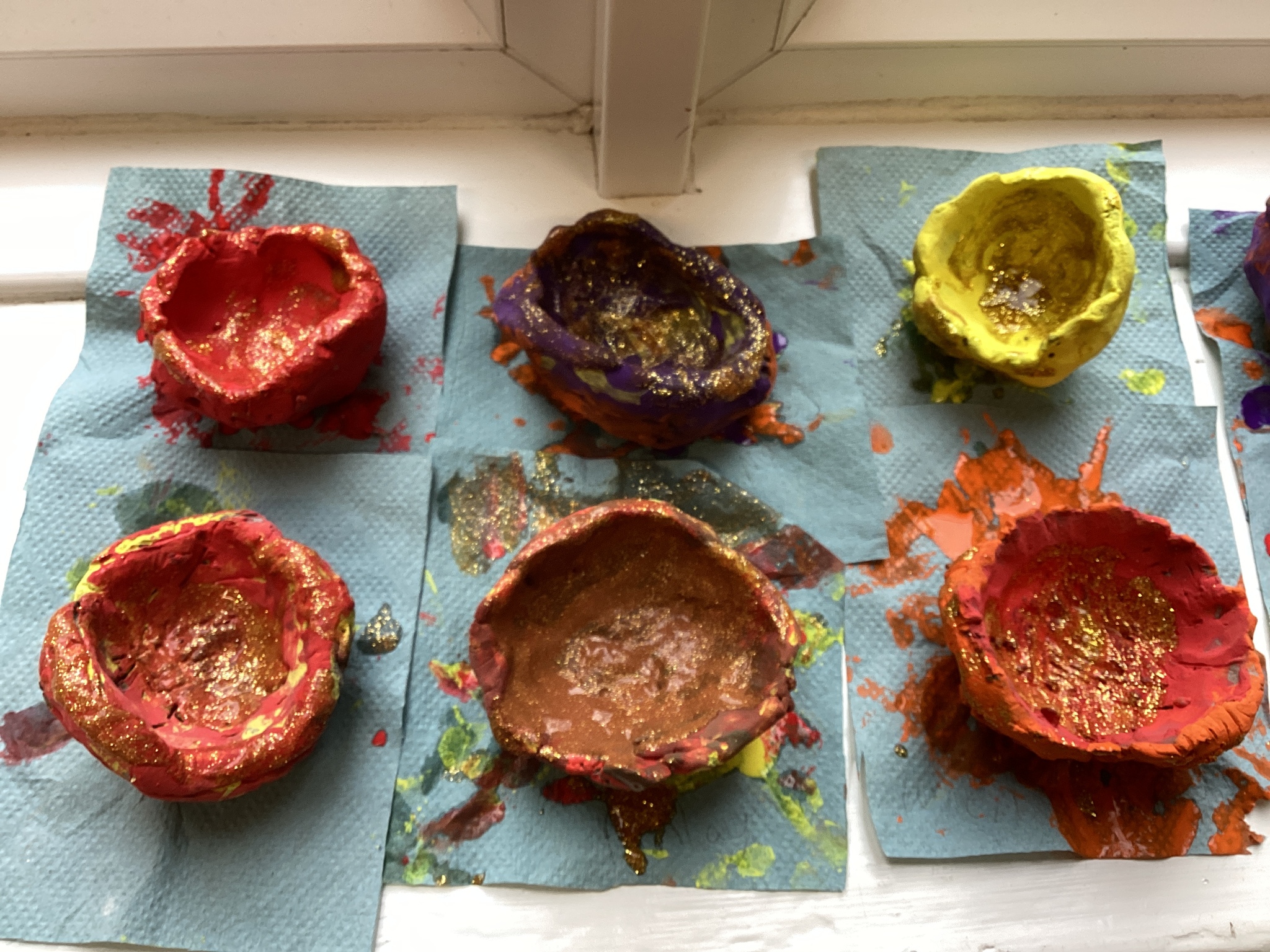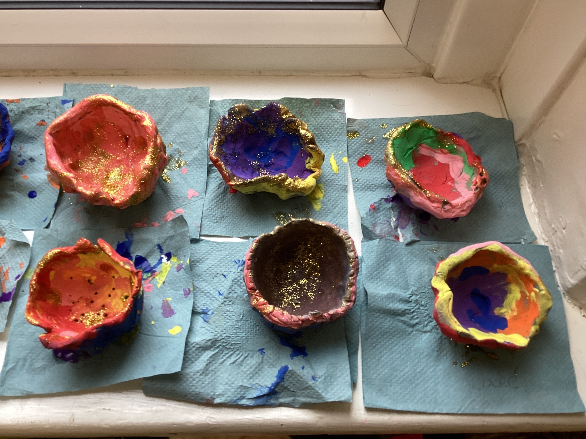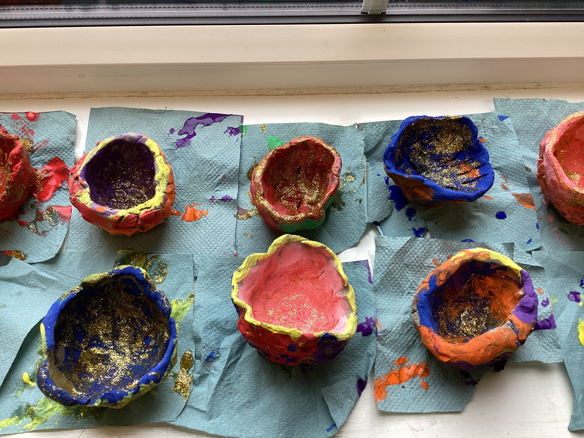 They have been learning about Divali - The festival of light and have enjoyed designing and making their own Diva Lamps which they have brought home today.