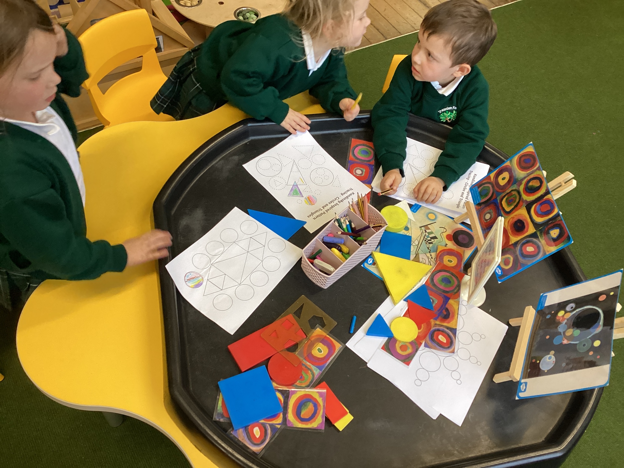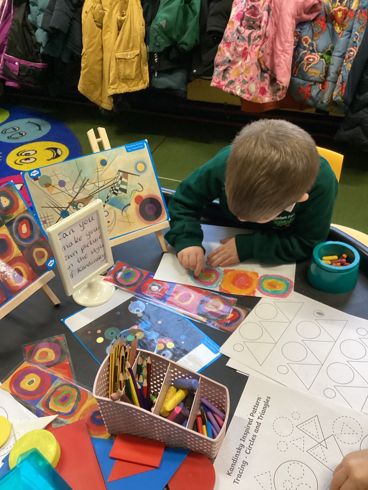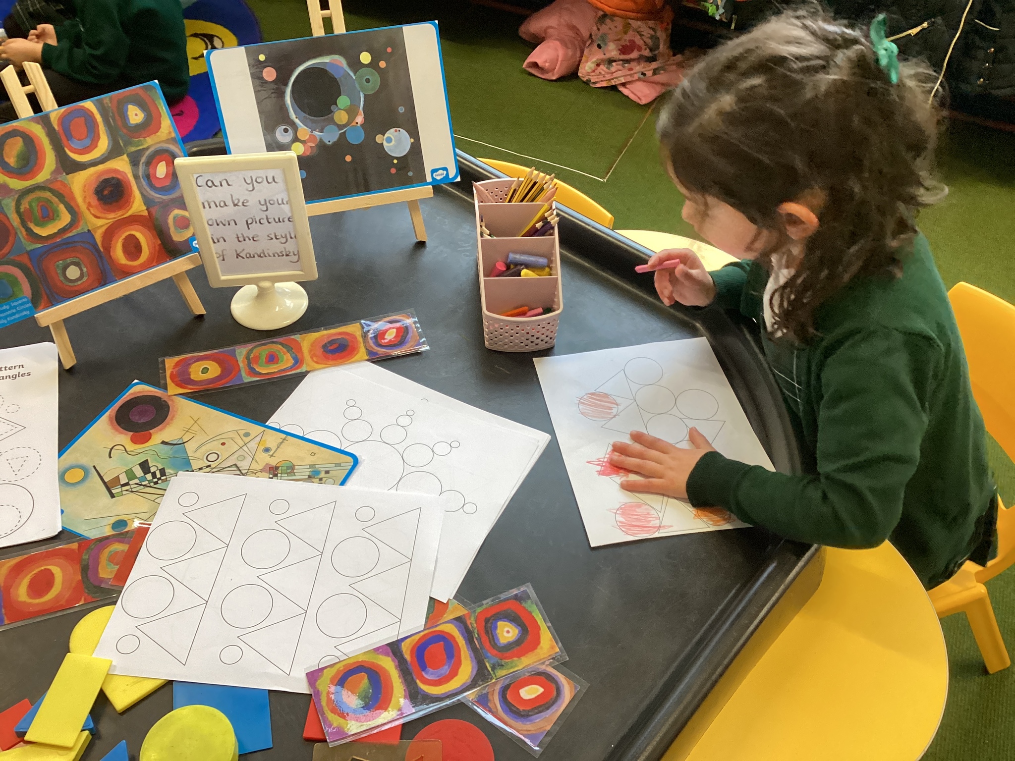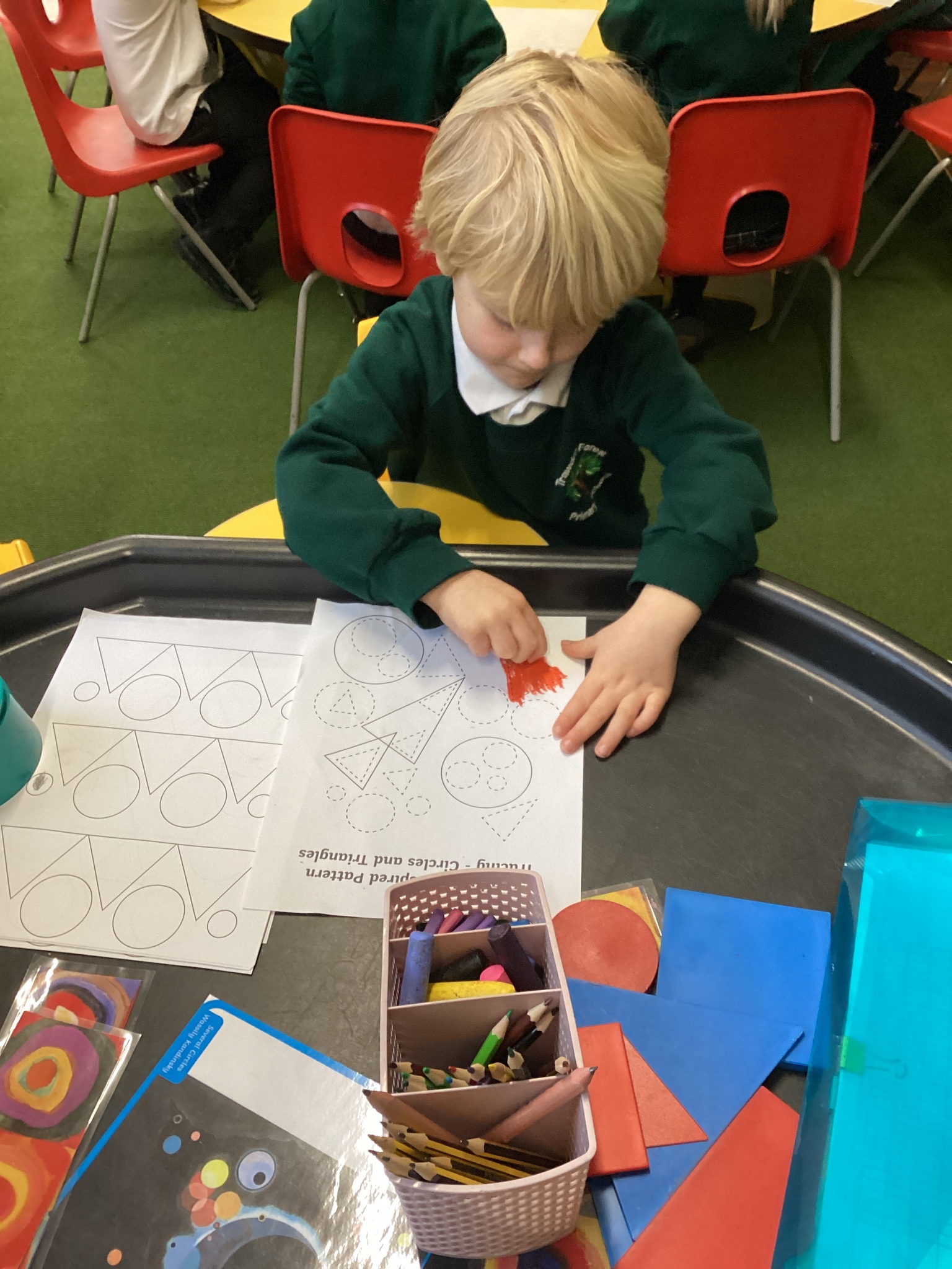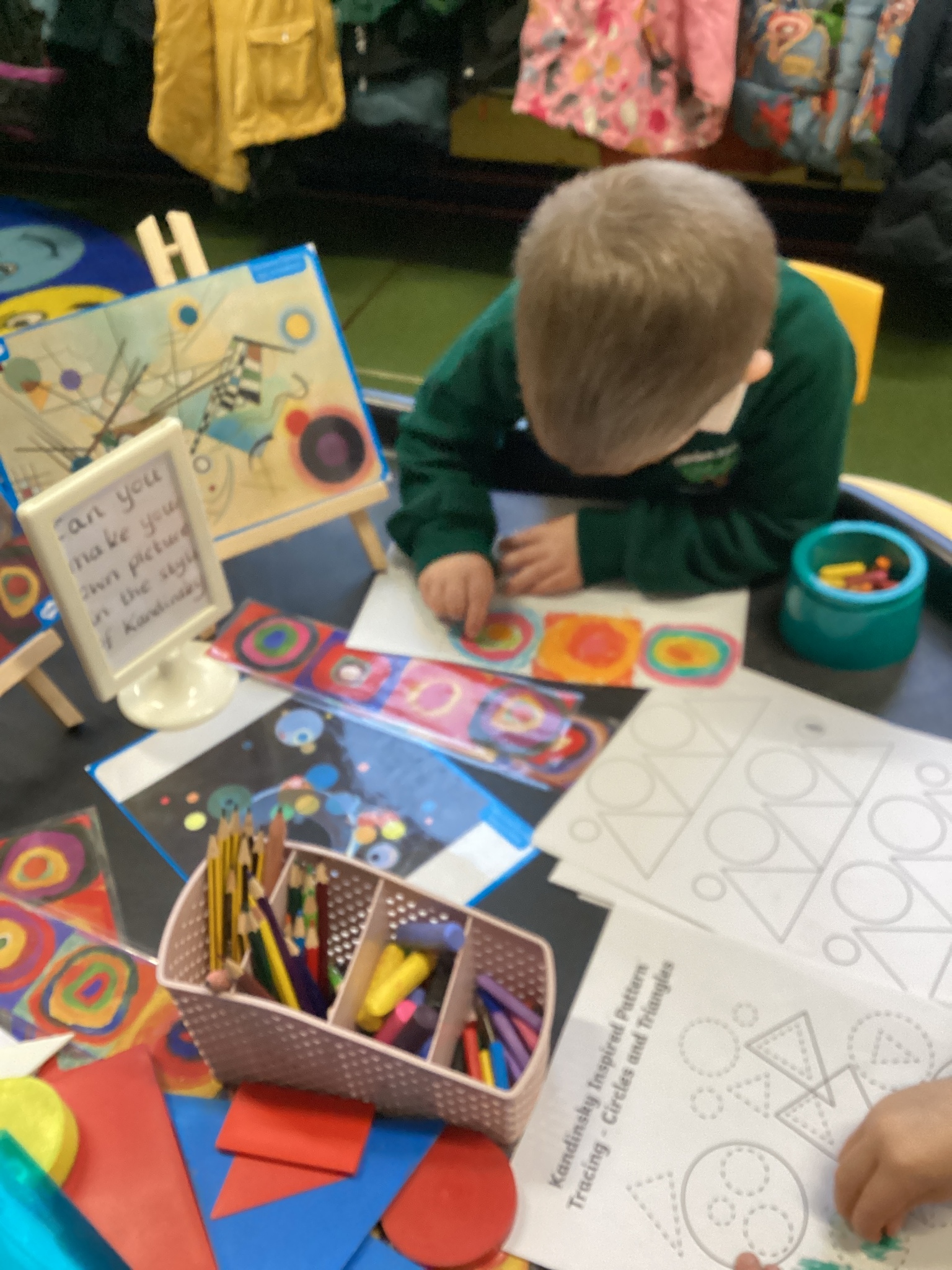 We have also been busy learning about and hunting for shapes! We have found out about Kandinsky and looked at some of his art involving shapes. We have loved making our own 'Kandinsky' style pieces of art too!