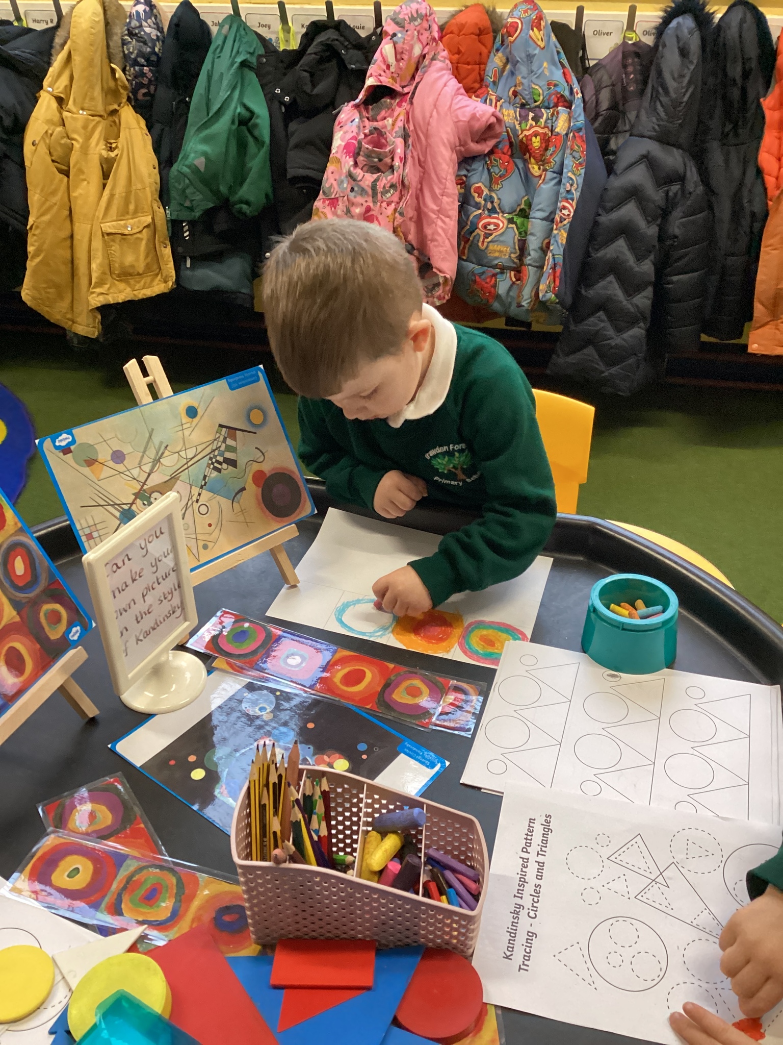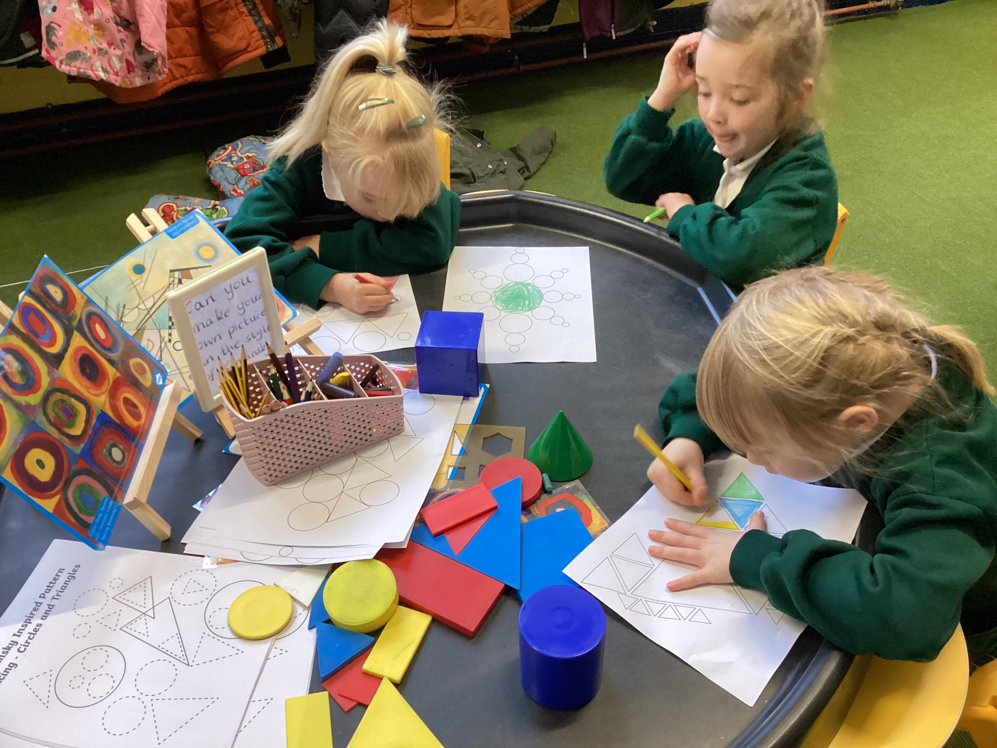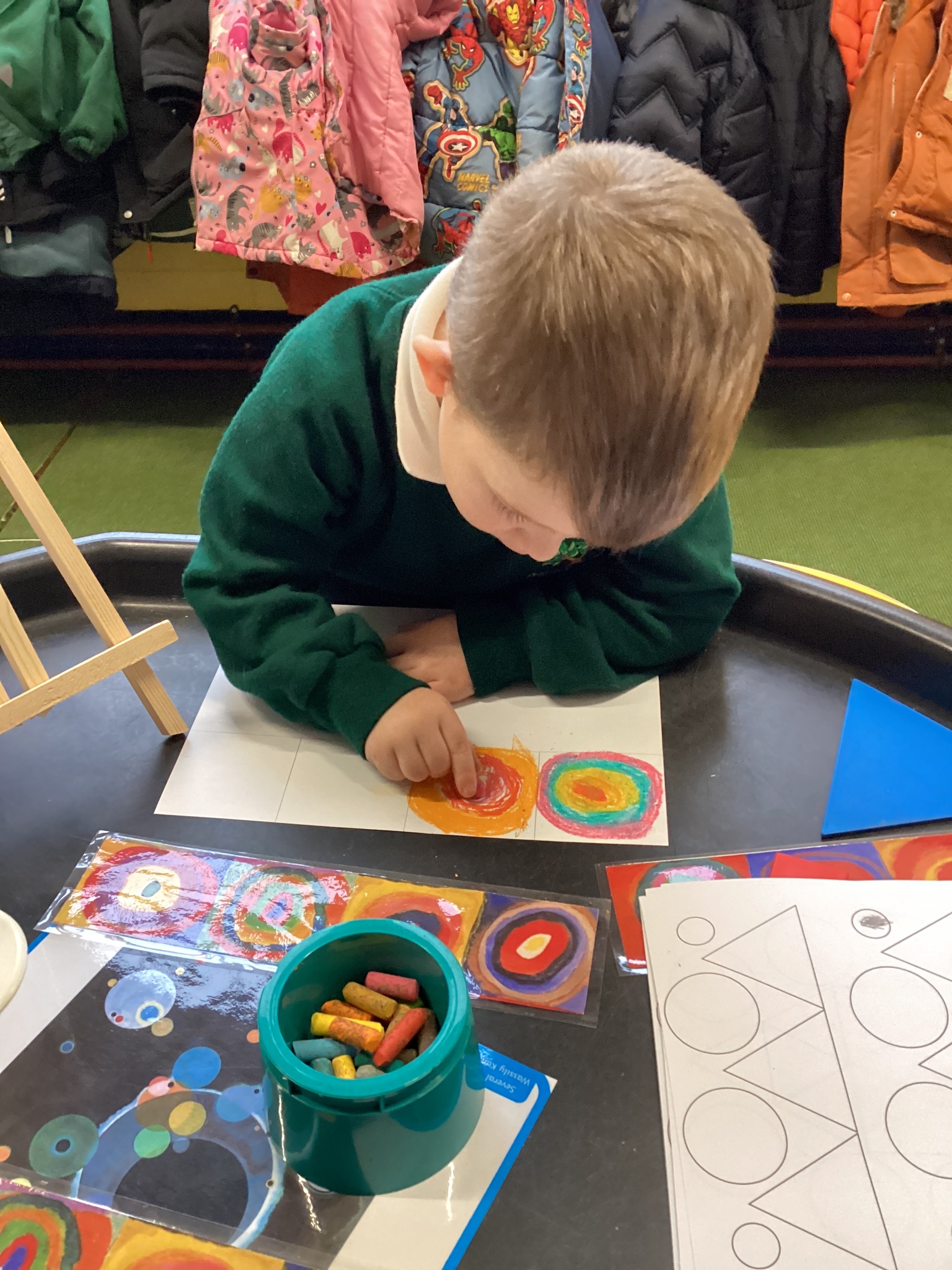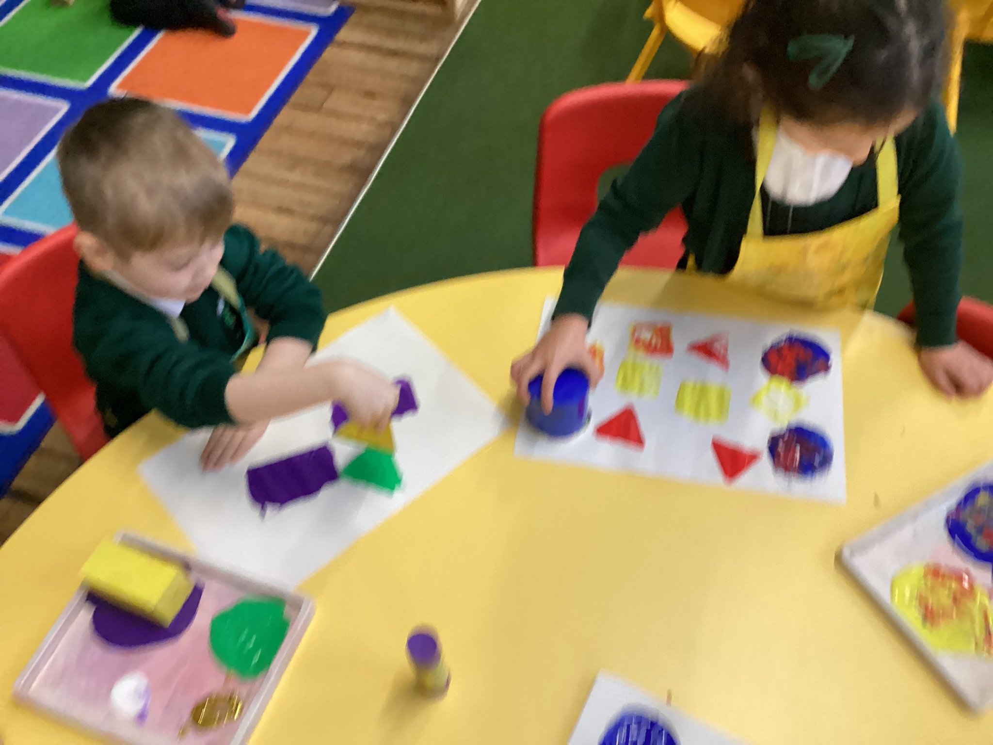 We have also been busy learning about and hunting for shapes! We have found out about Kandinsky and looked at some of his art involving shapes. We have loved making our own 'Kandinsky' style pieces of art too!
