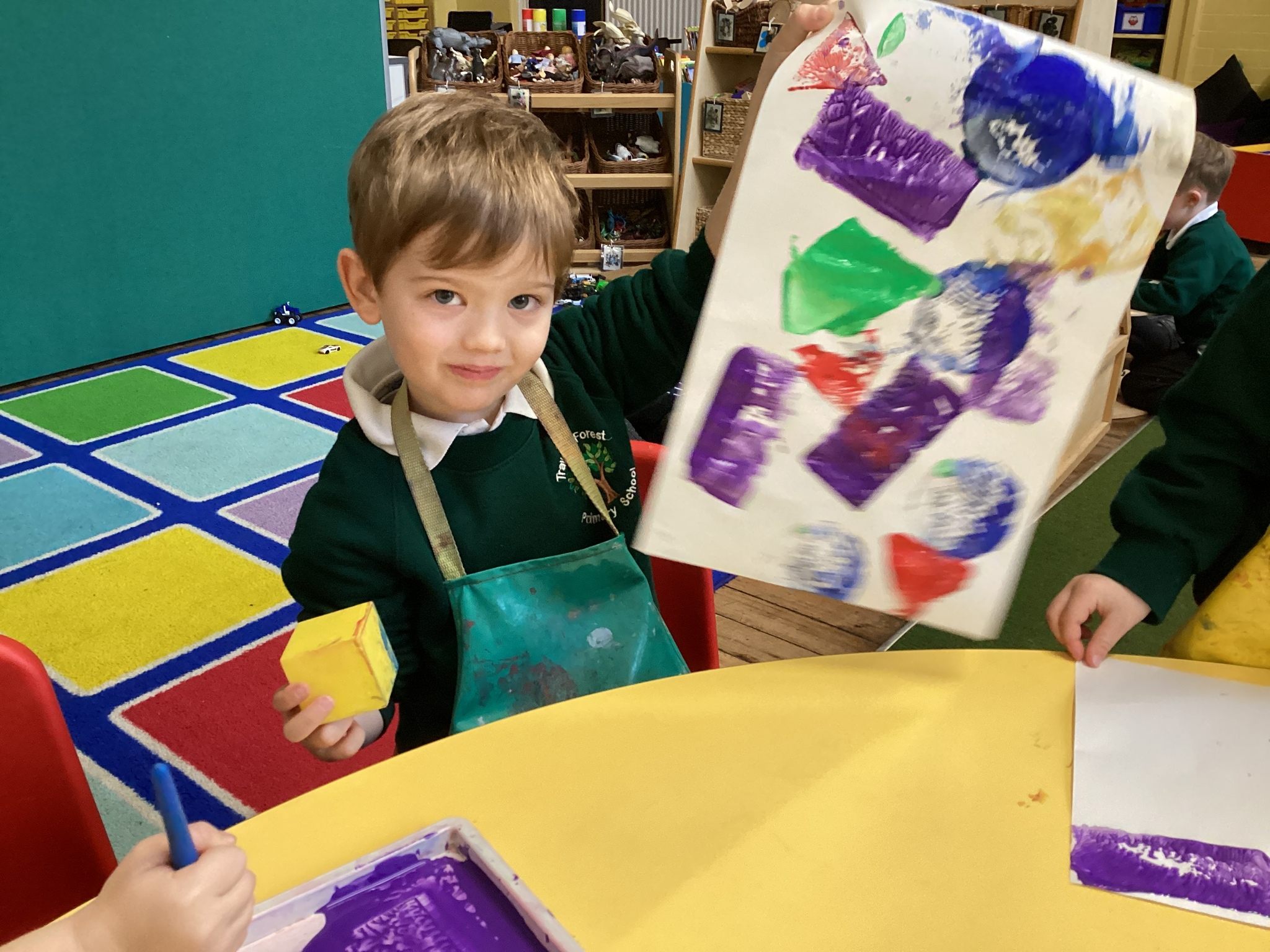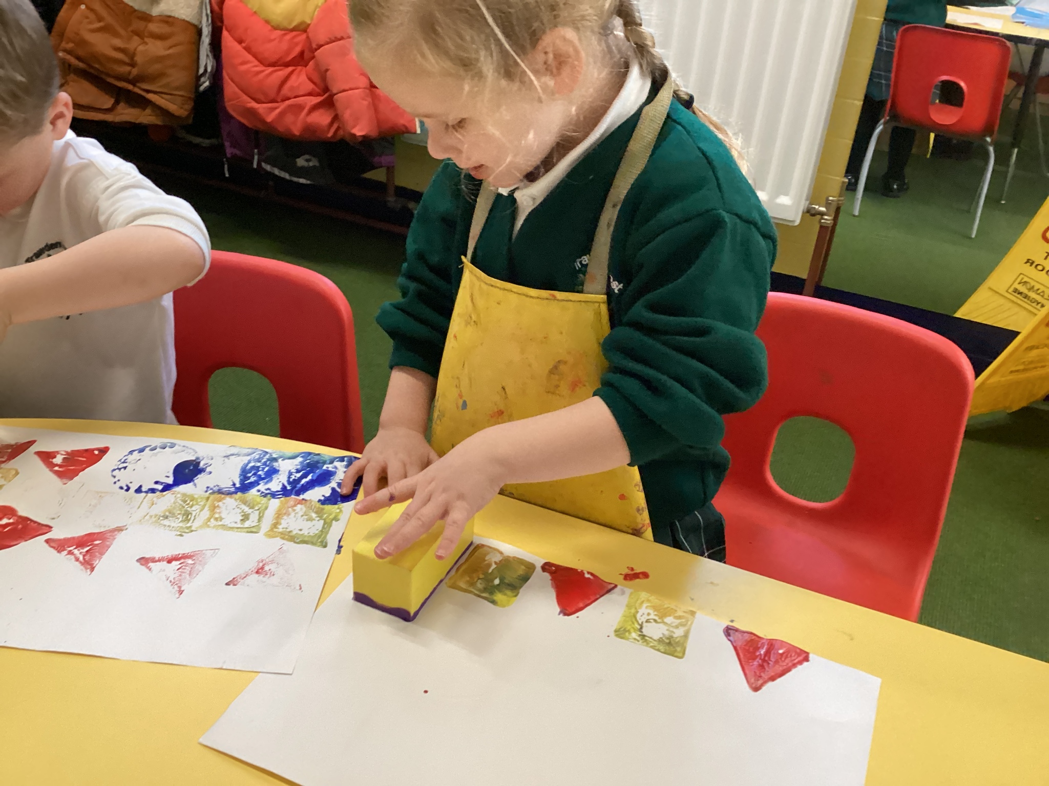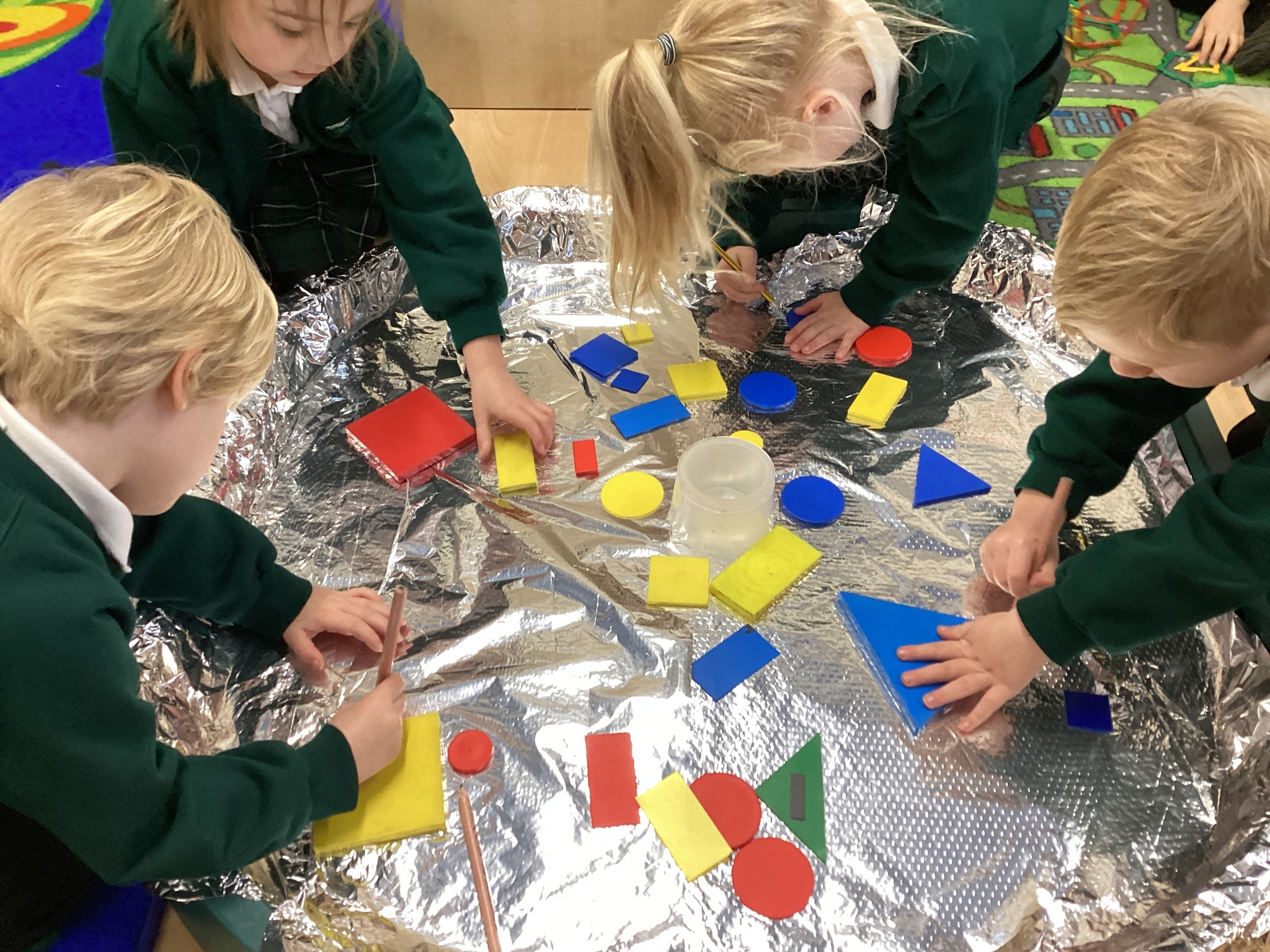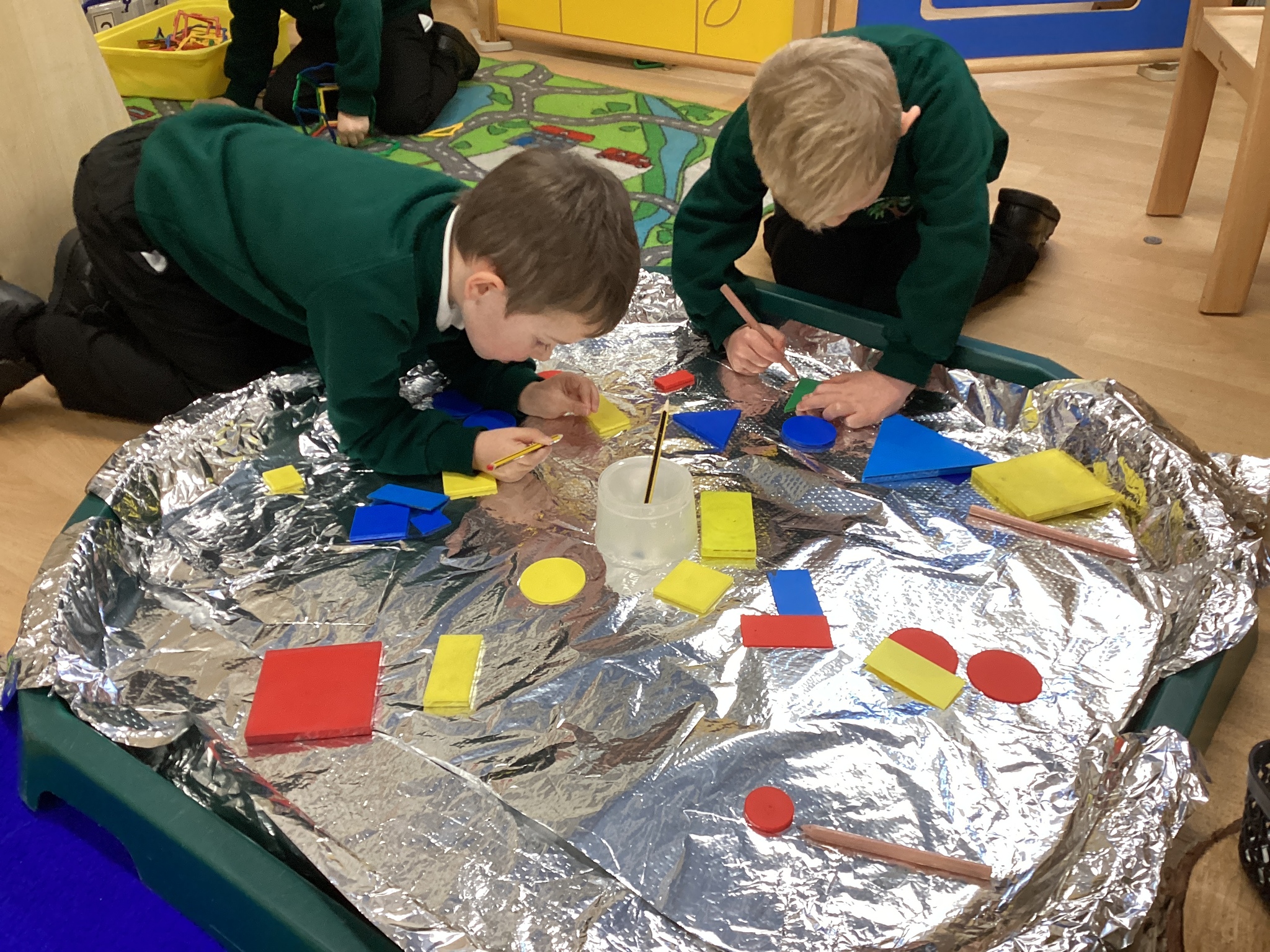 We have also been busy learning about and hunting for shapes! We have found out about Kandinsky and looked at some of his art involving shapes. We have loved making our own 'Kandinsky' style pieces of art too!