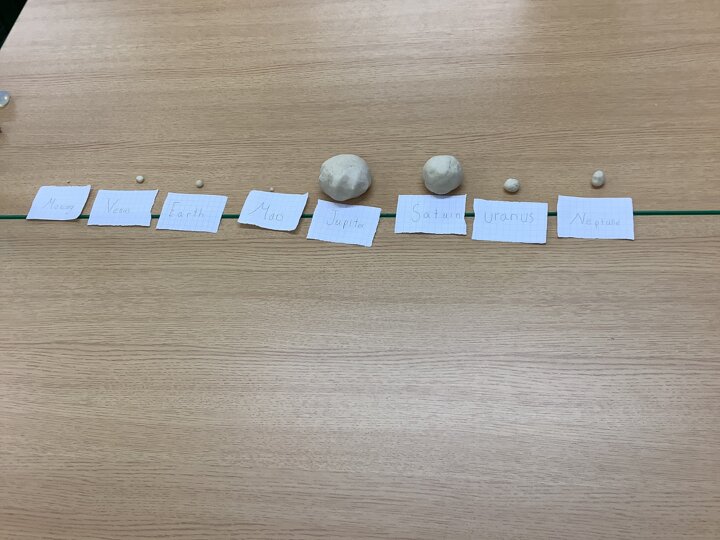 Maple class have begun their learning about Earth and Space this week, and enjoyed the opportunity to play with playdough! Following the instructions, the children used their fractions knowledge to break up the play dough into appropriately sized planetary balls linked to their relative size within the solar system. The children noticed how big Jupiter and Saturn (the gas giants) are in comparison to the rocky planets of Mercury, Venus, Earth and Mars. We enjoyed this practical science activity, and look forward to learning more about it at Forest School on Monday and within future lessons this term.