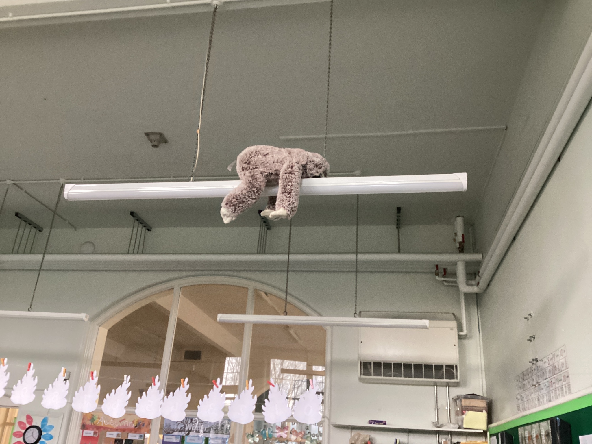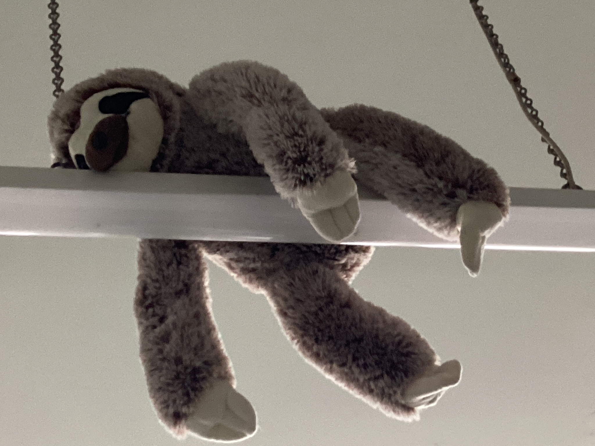 We came in to class on Wednesday to discover a sloth hanging from the speaker!
