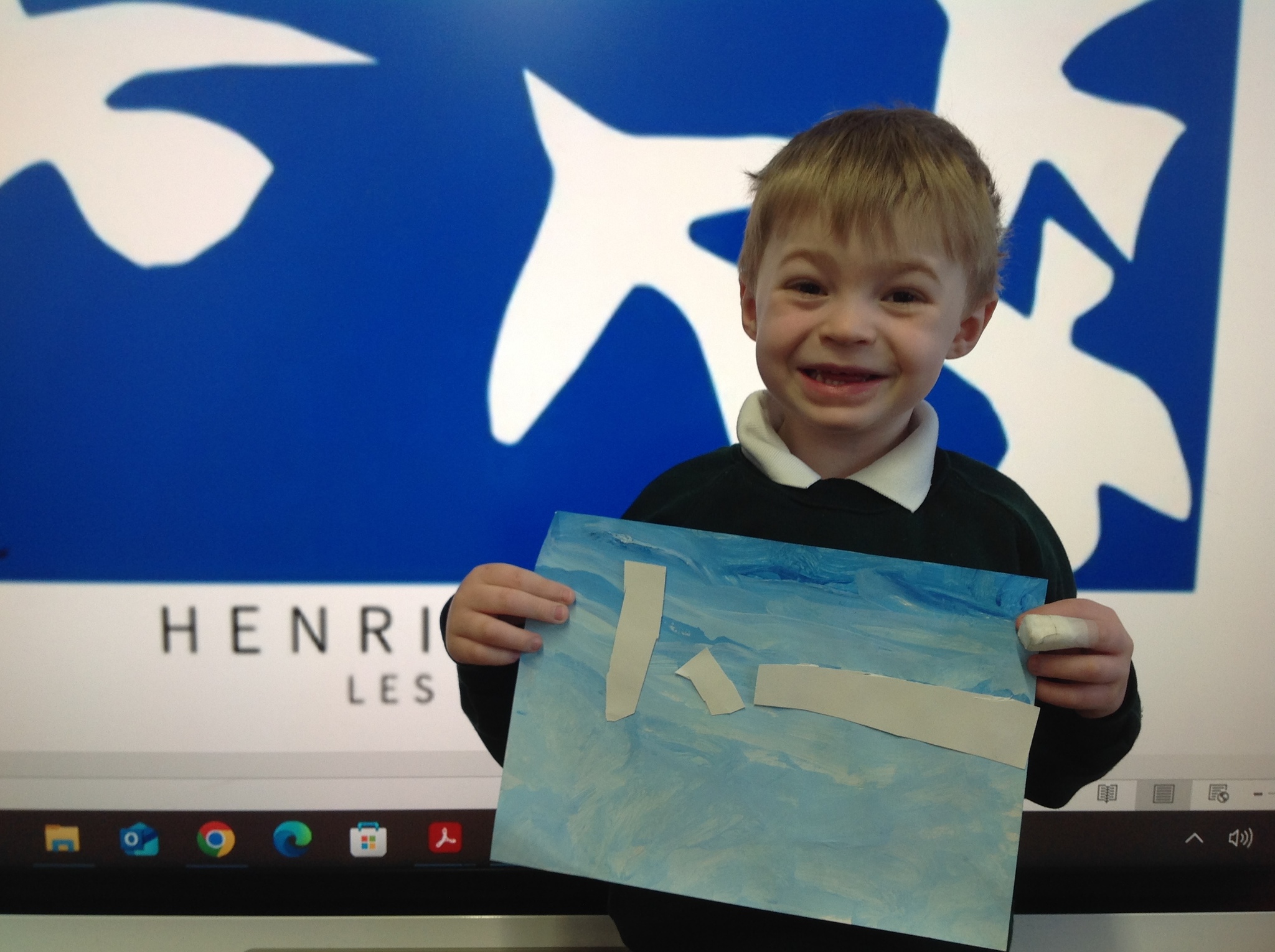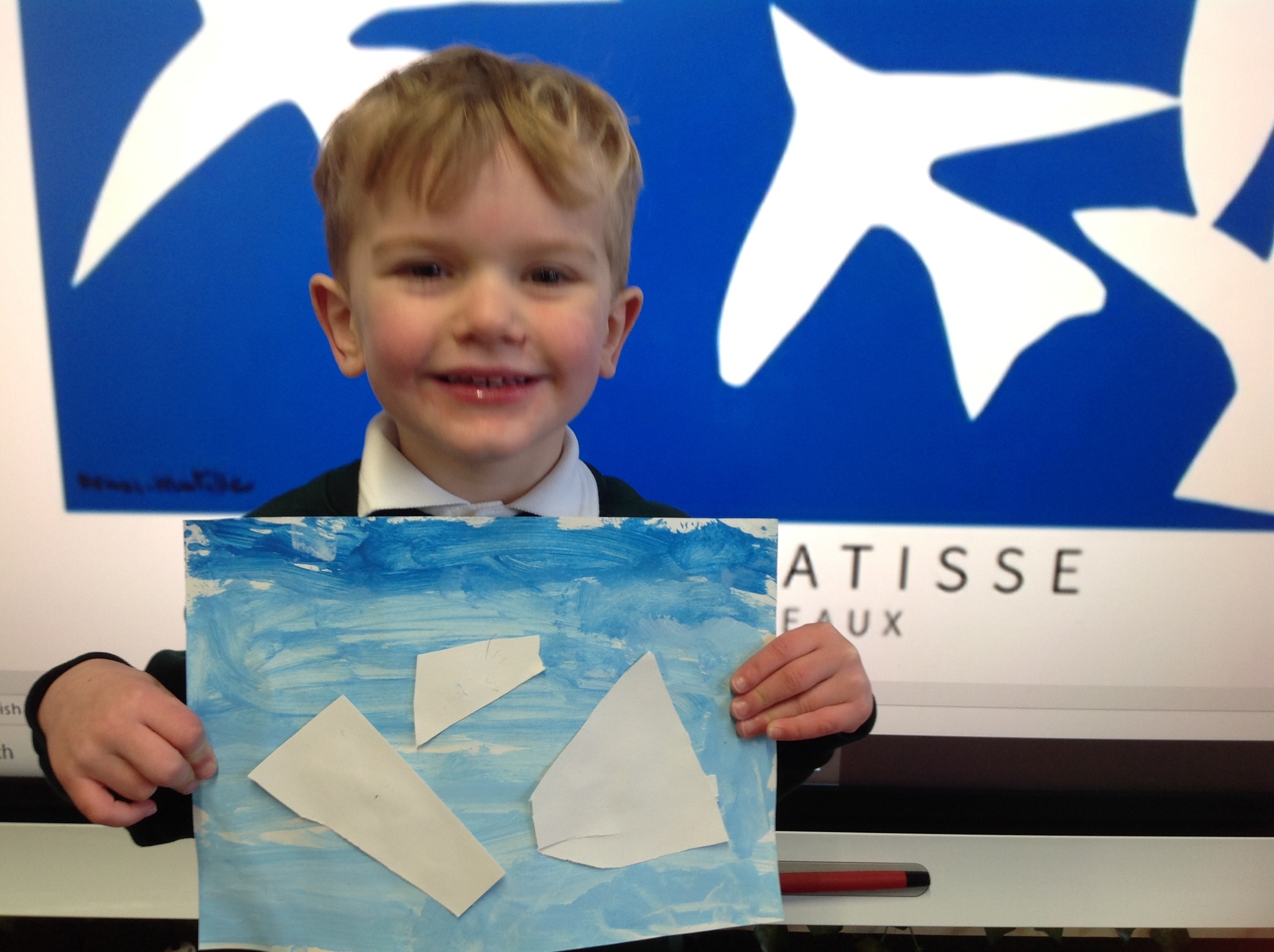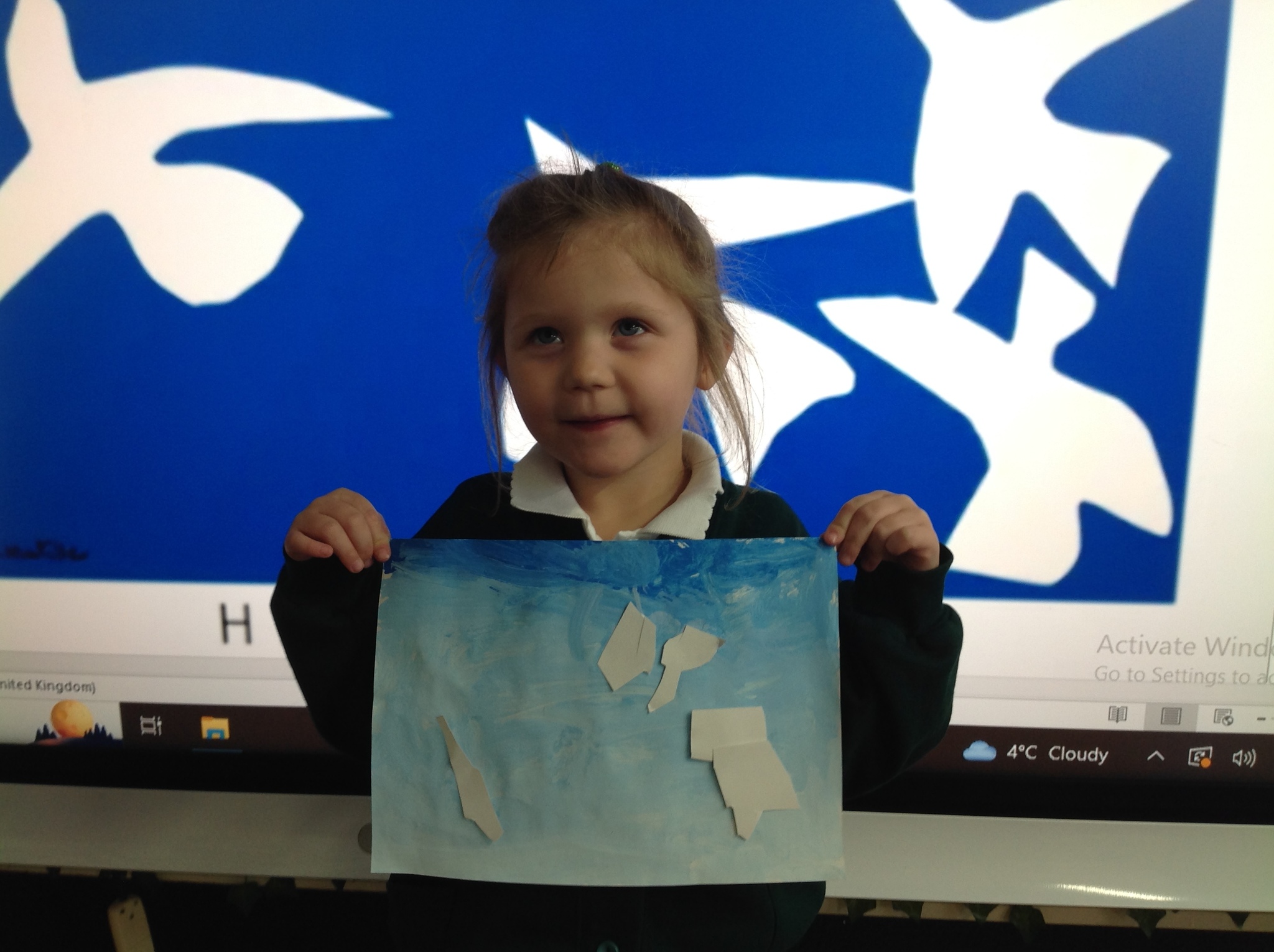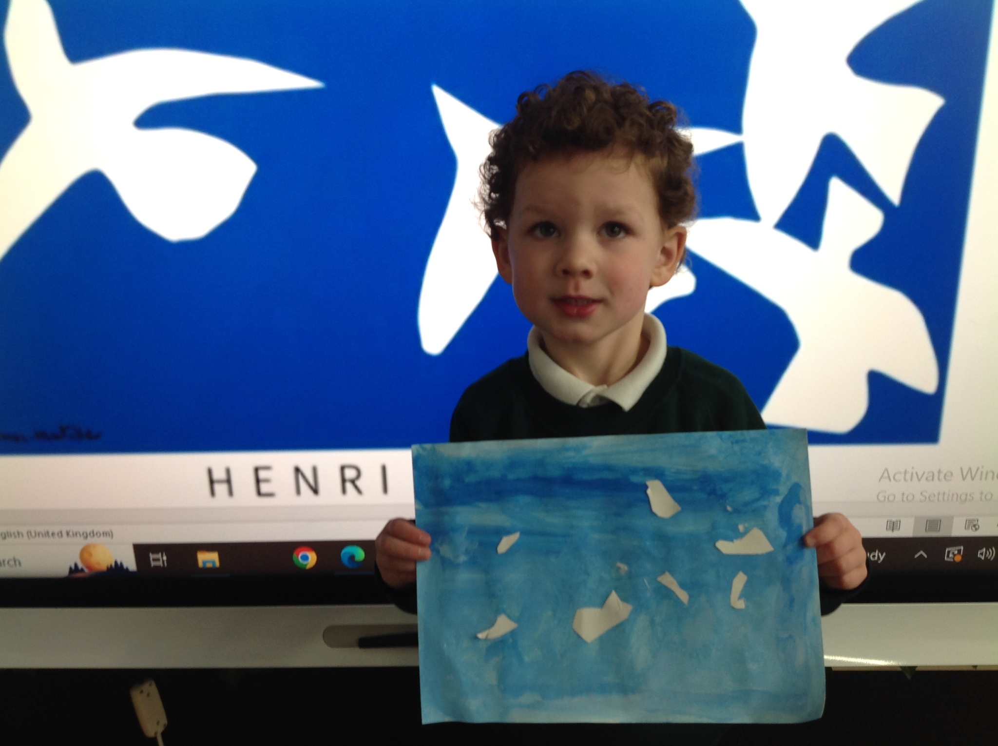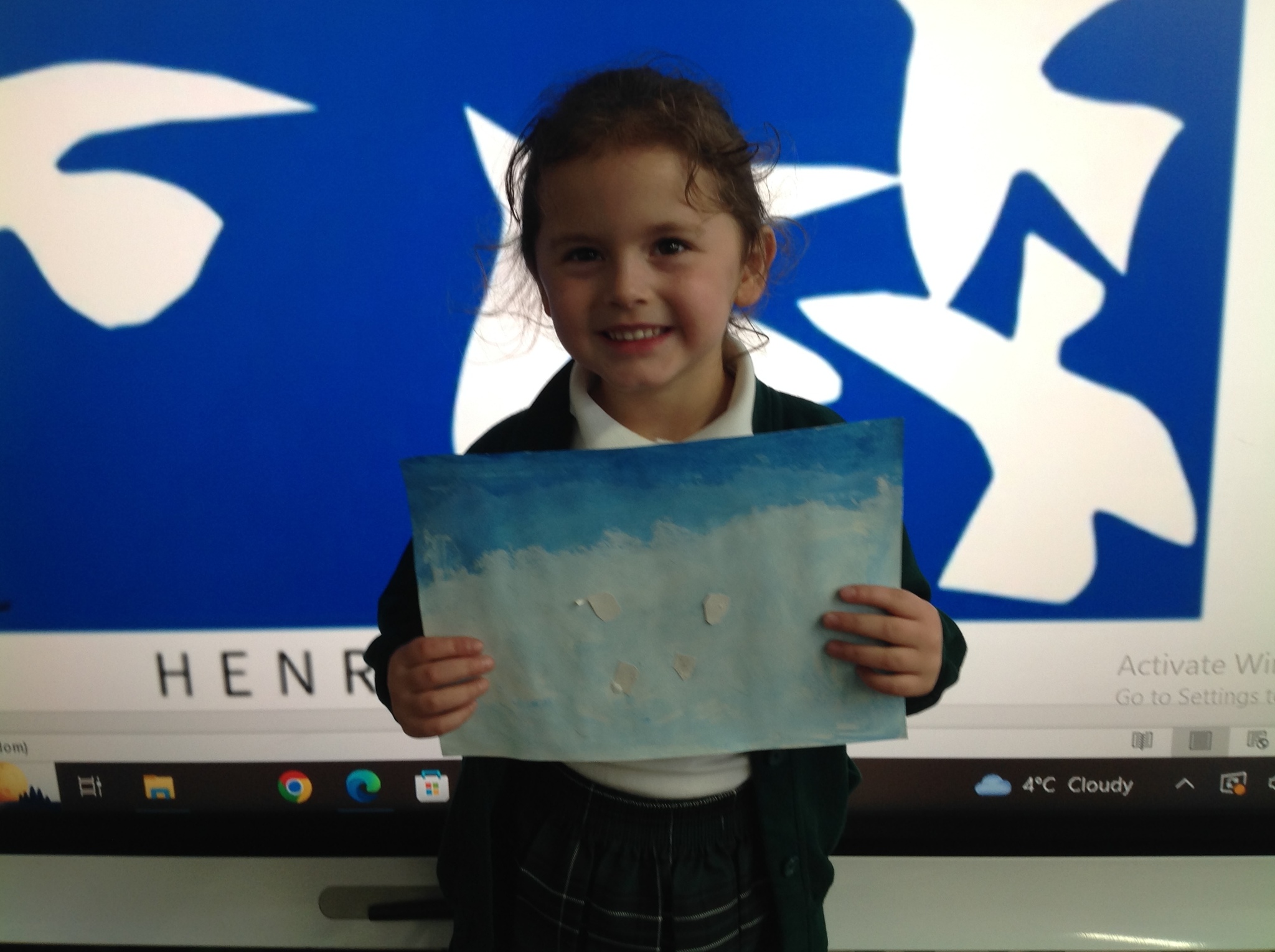 The children created their own wonderful versions of ‘Les oiseaux’ by Henri Matisse. They explored colour mixing to create different shades of blue for the background. They then drew birds similar to Henri’s and cut them out to stick on their artwork.