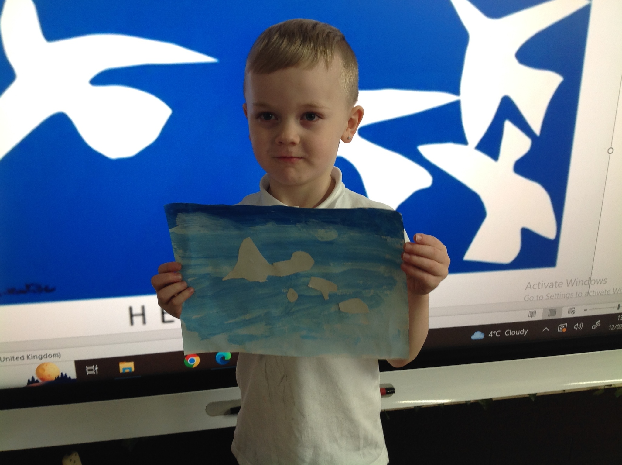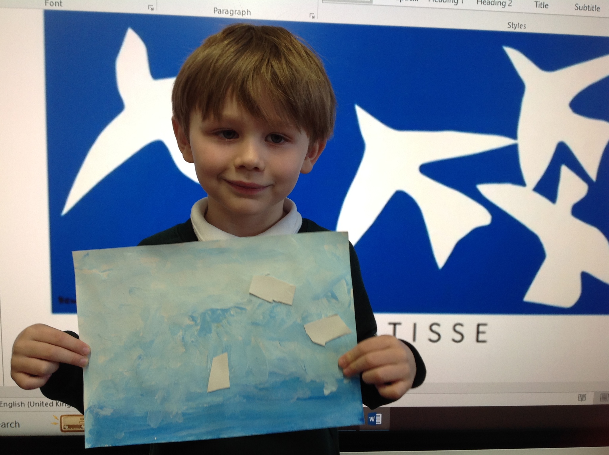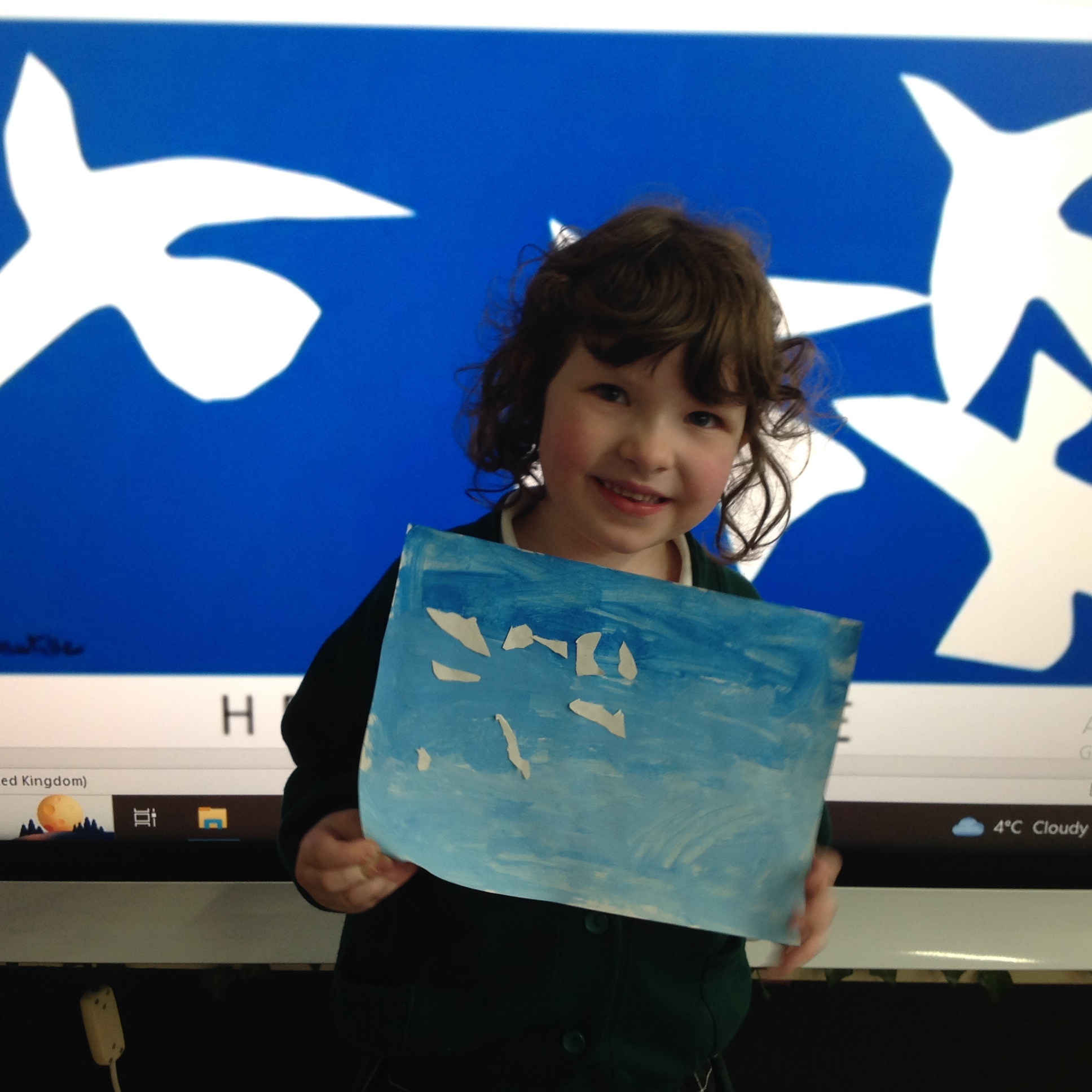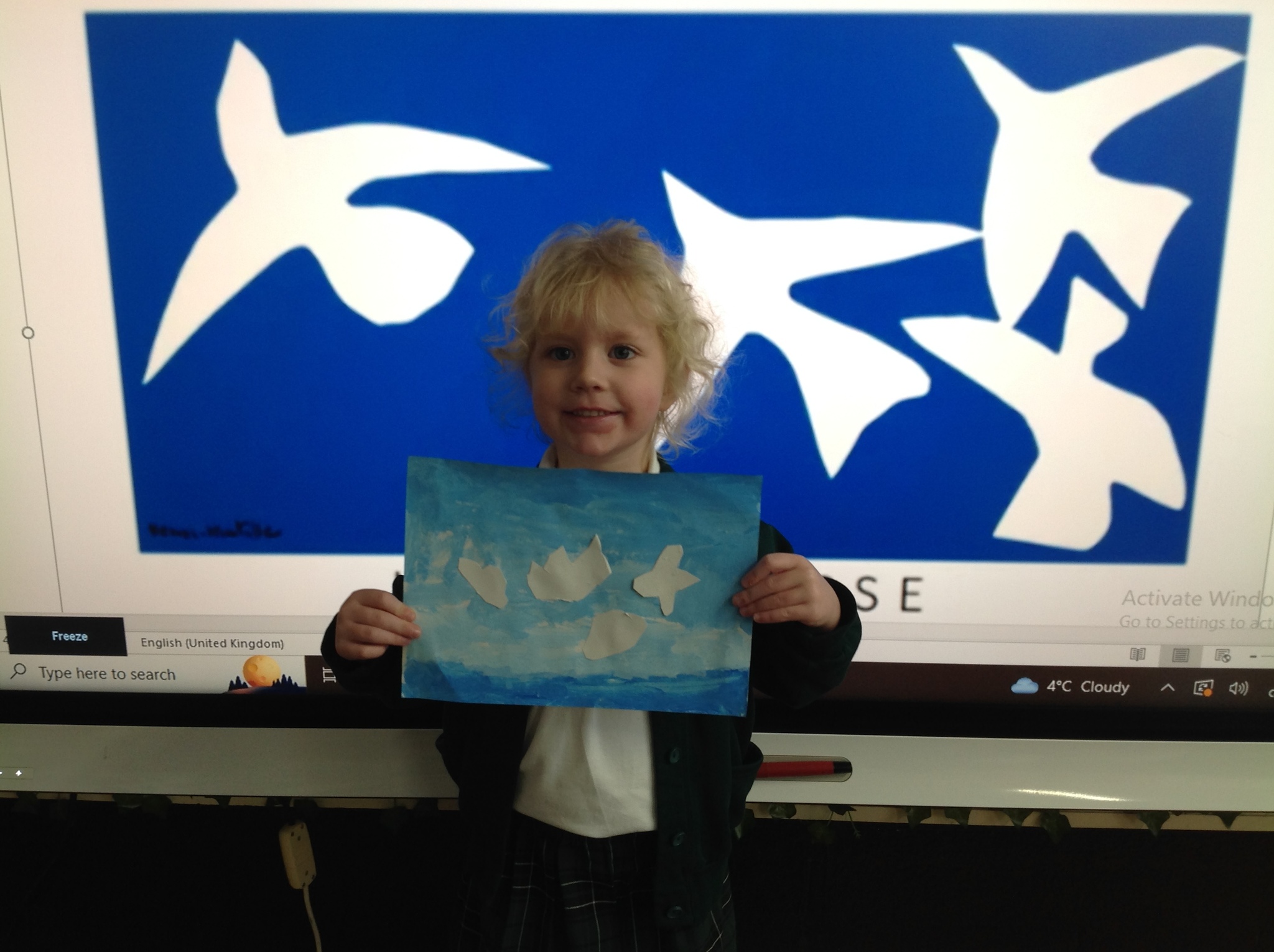 The children created their own wonderful versions of ‘Les oiseaux’ by Henri Matisse. They explored colour mixing to create different shades of blue for the background. They then drew birds similar to Henri’s and cut them out to stick on their artwork.