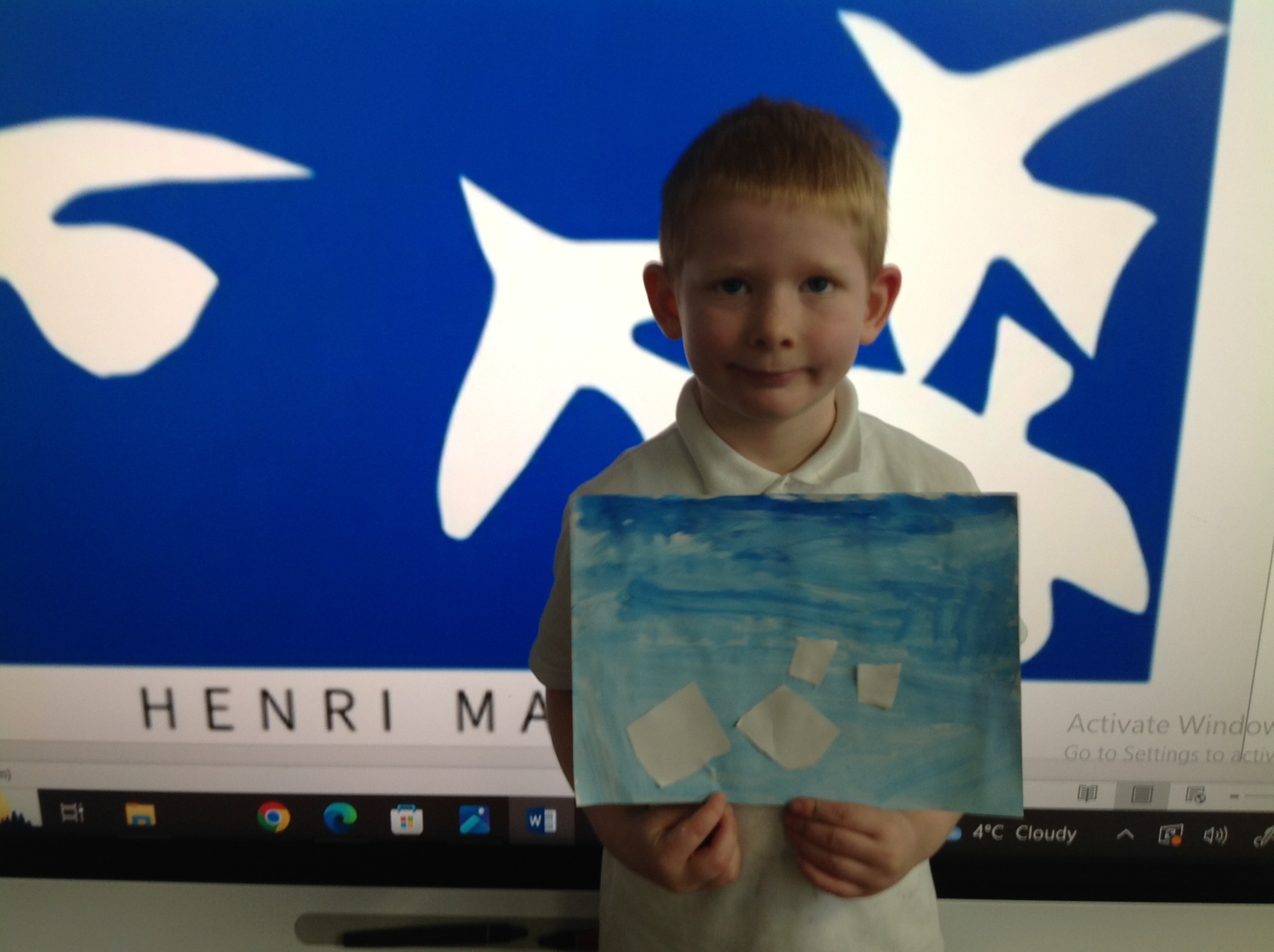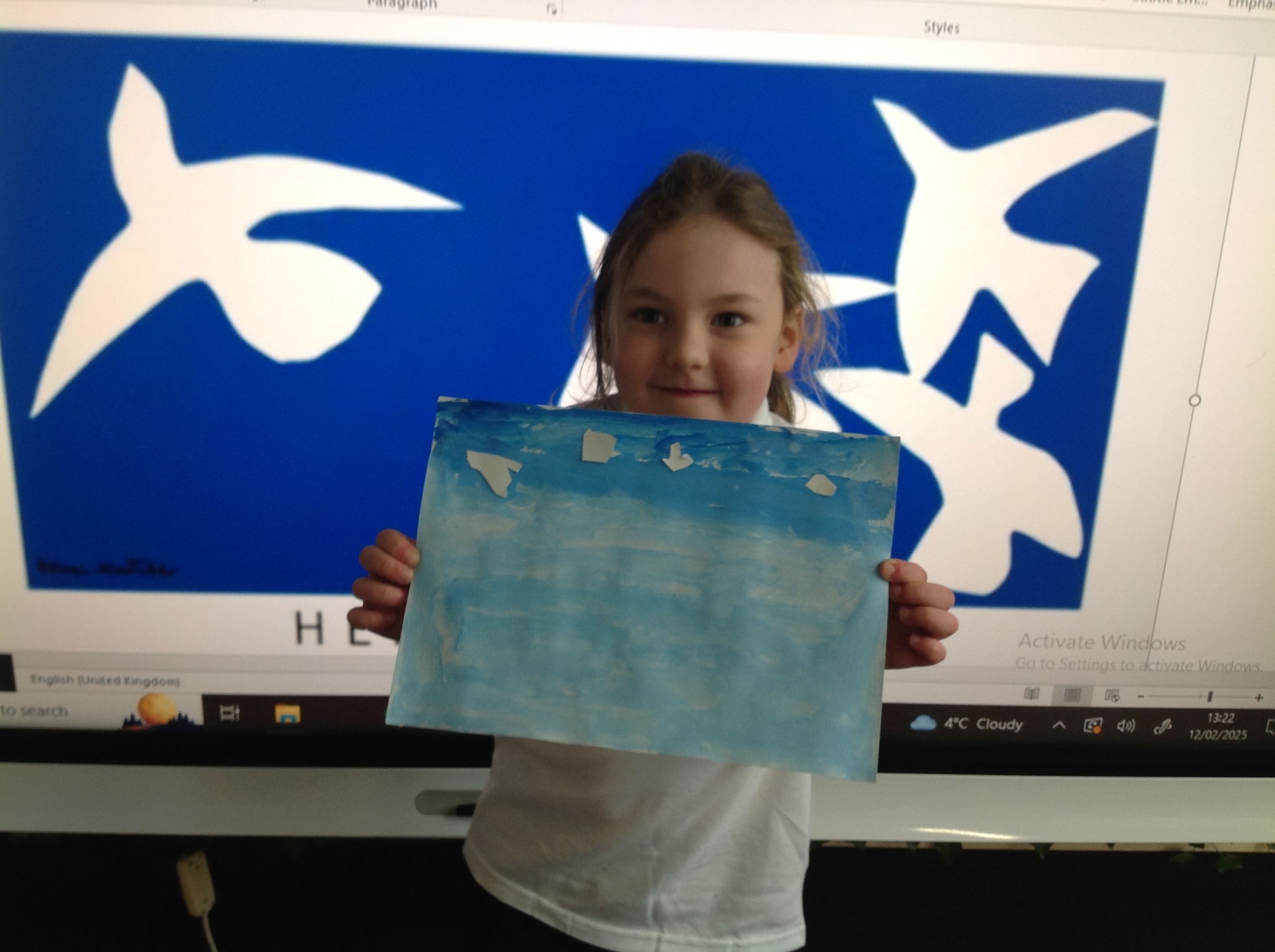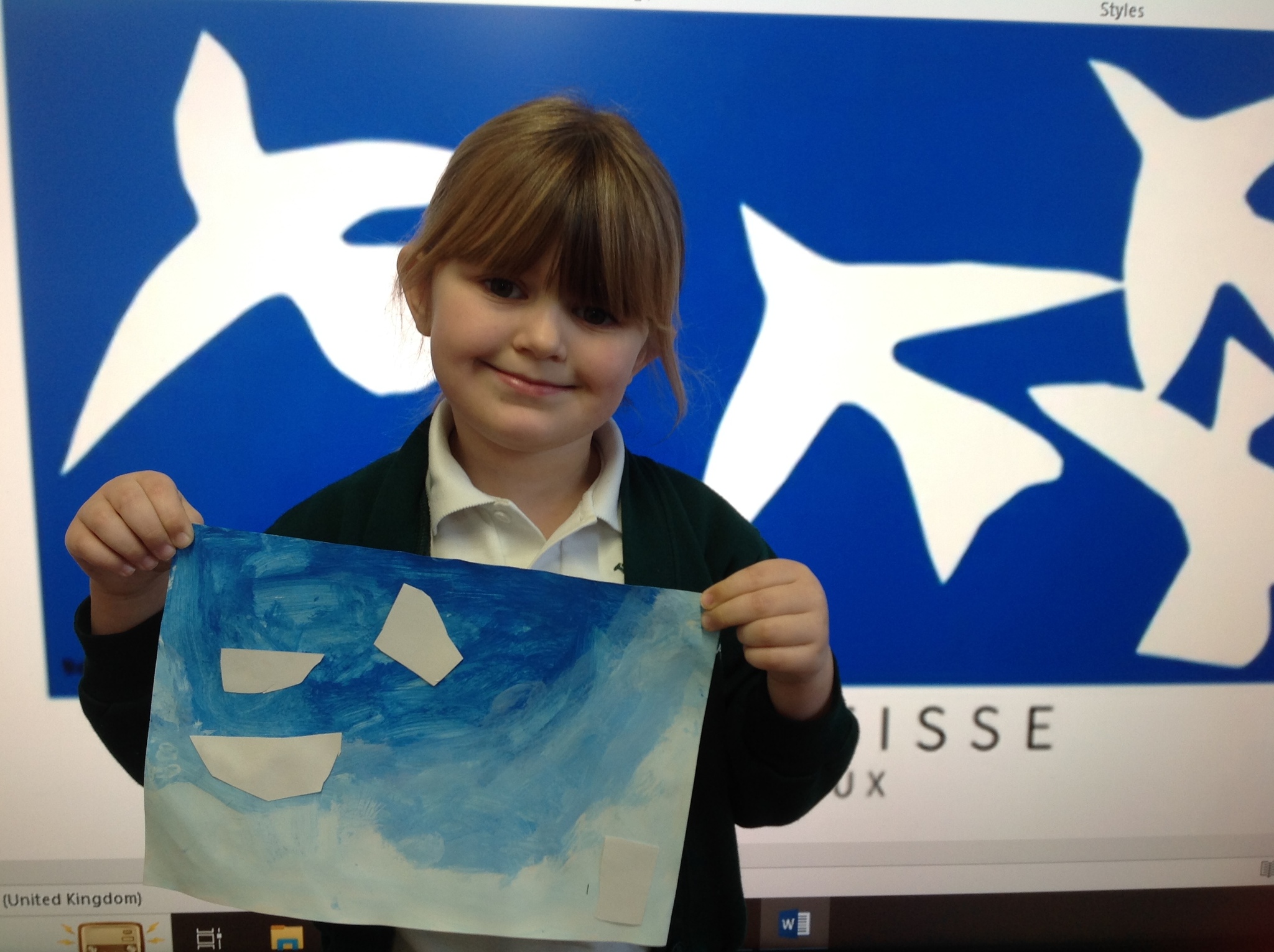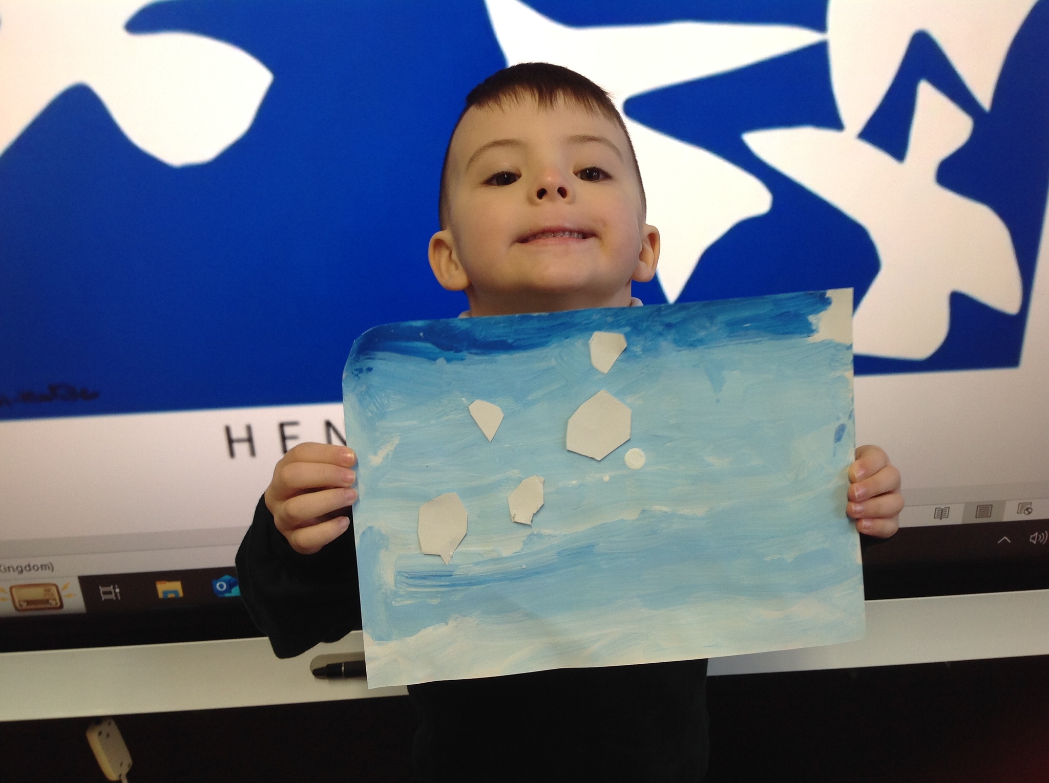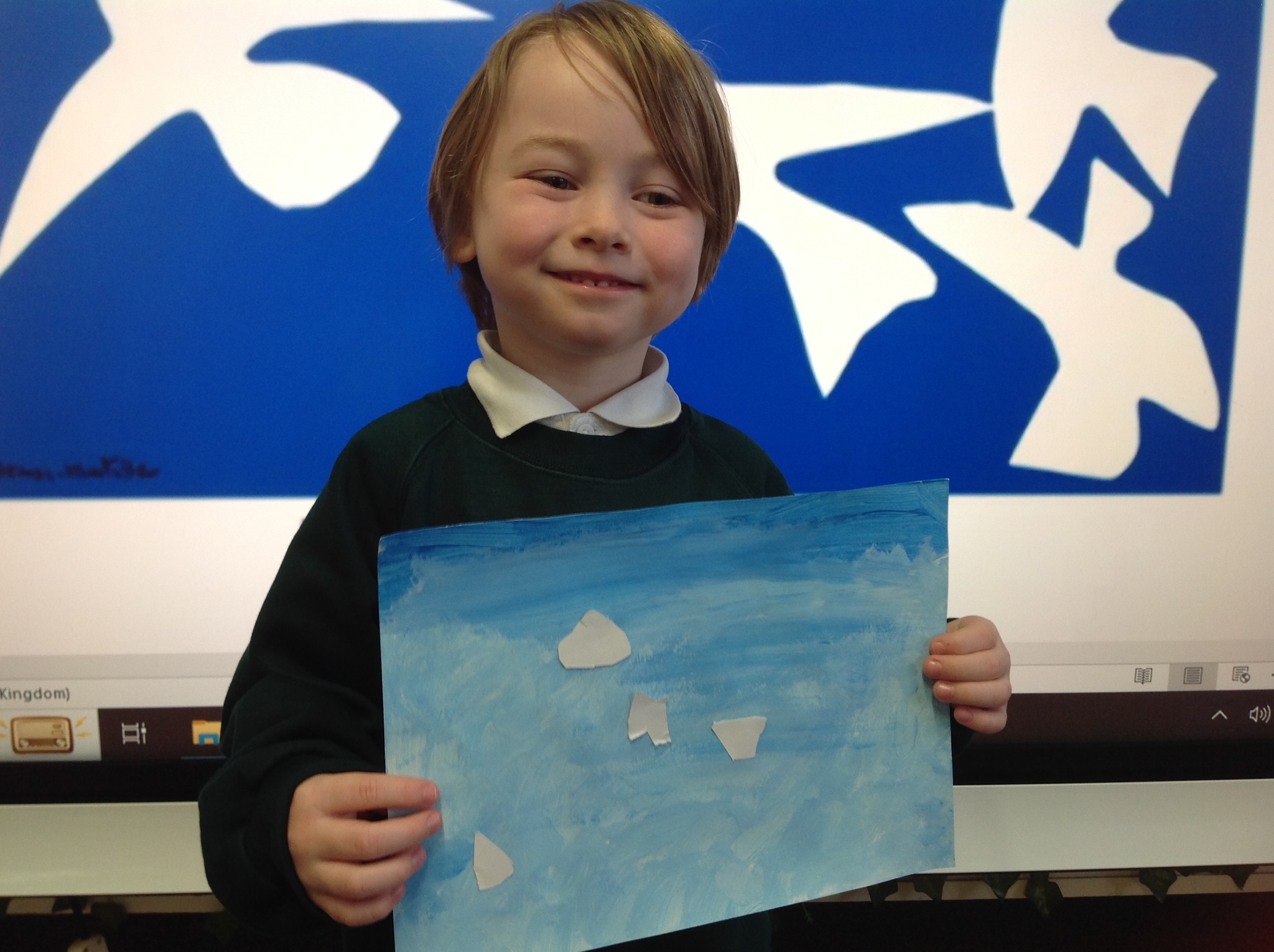 The children created their own wonderful versions of ‘Les oiseaux’ by Henri Matisse. They explored colour mixing to create different shades of blue for the background. They then drew birds similar to Henri’s and cut them out to stick on their artwork.