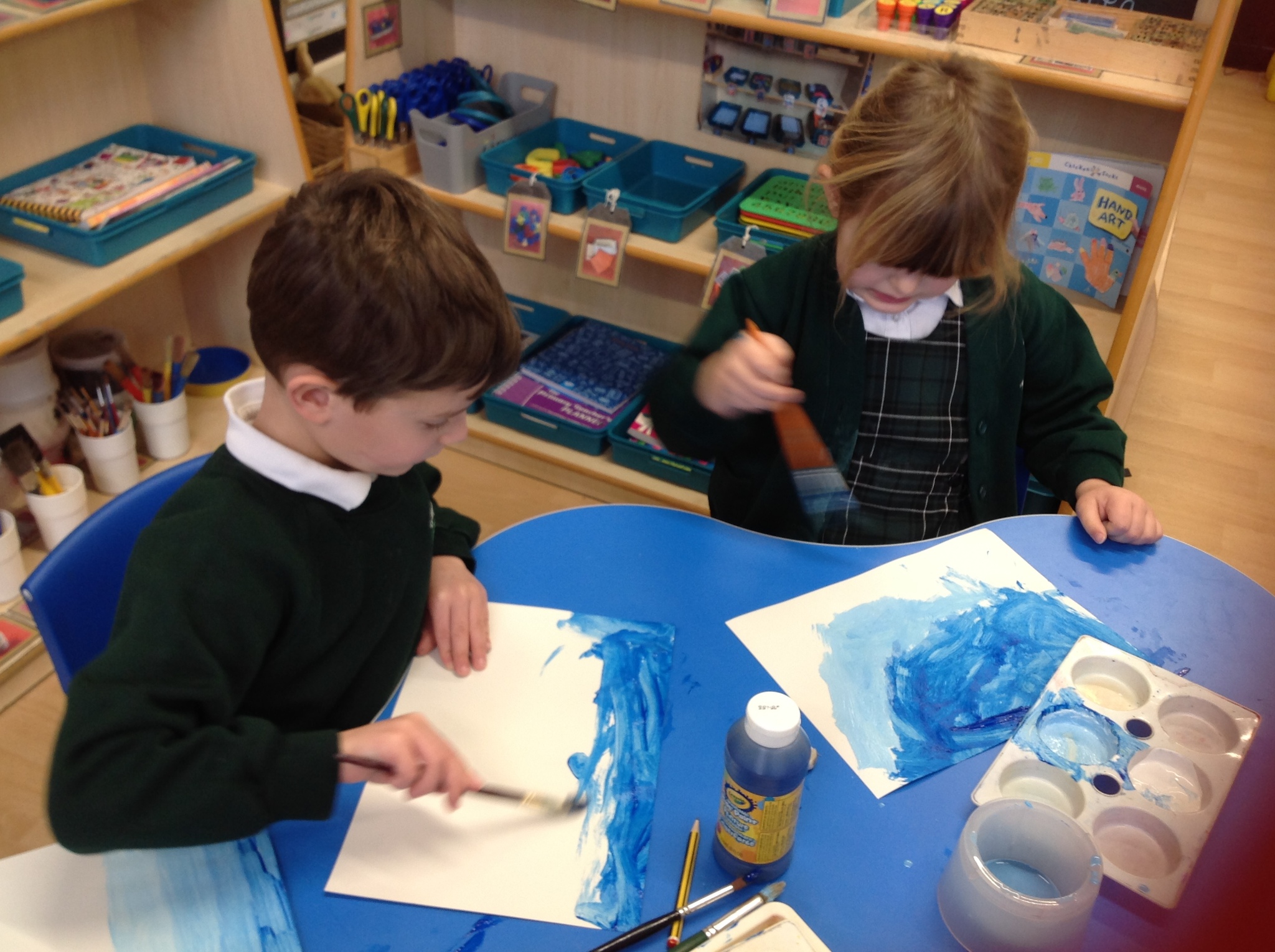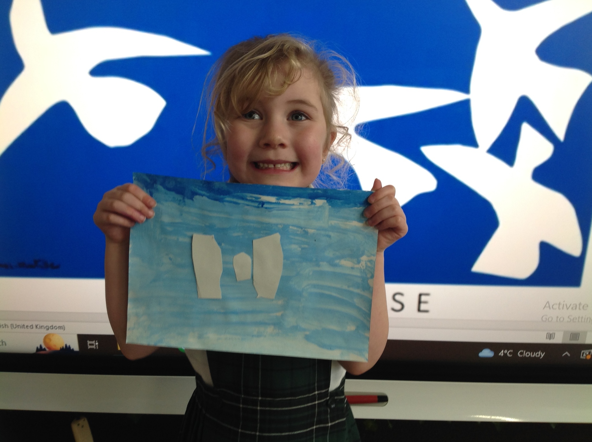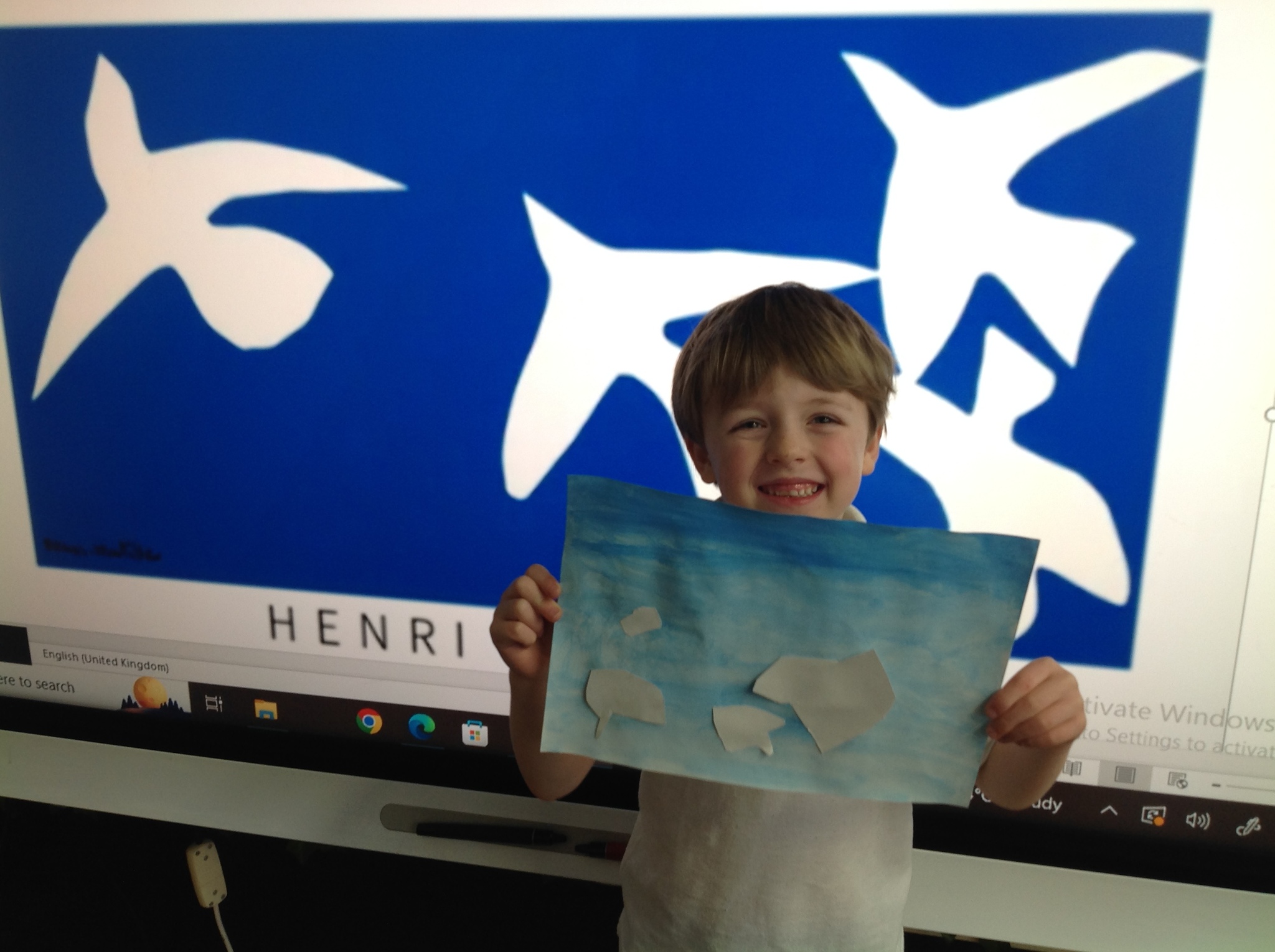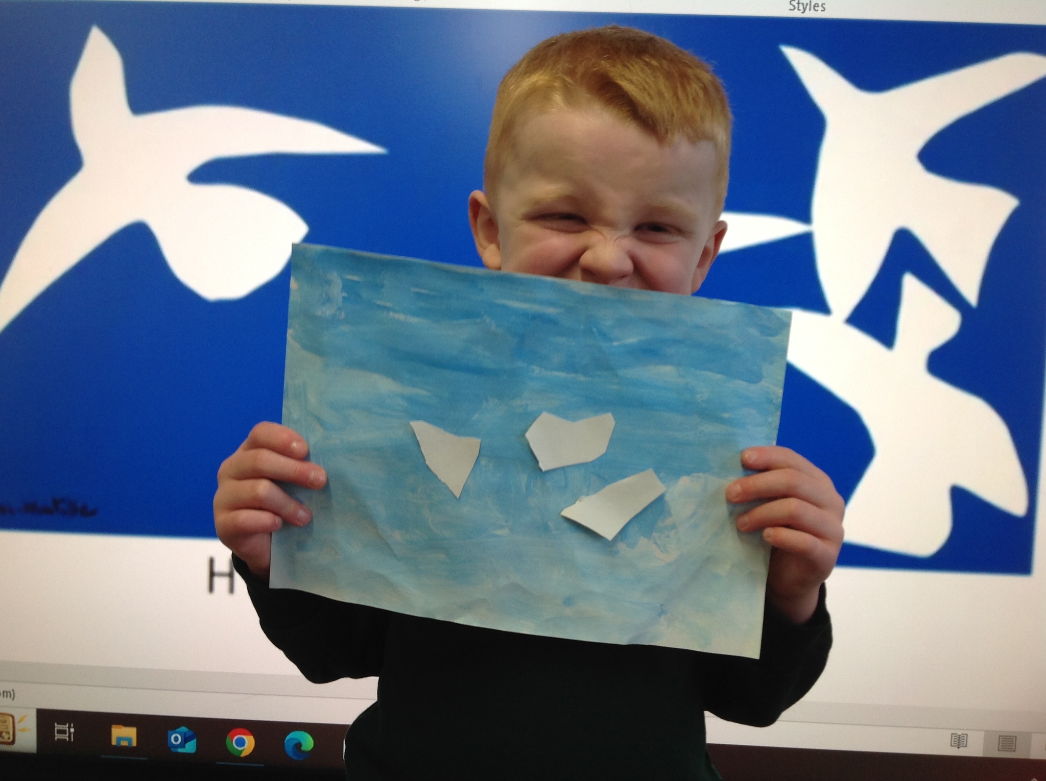 The children created their own wonderful versions of ‘Les oiseaux’ by Henri Matisse. They explored colour mixing to create different shades of blue for the background. They then drew birds similar to Henri’s and cut them out to stick on their artwork.