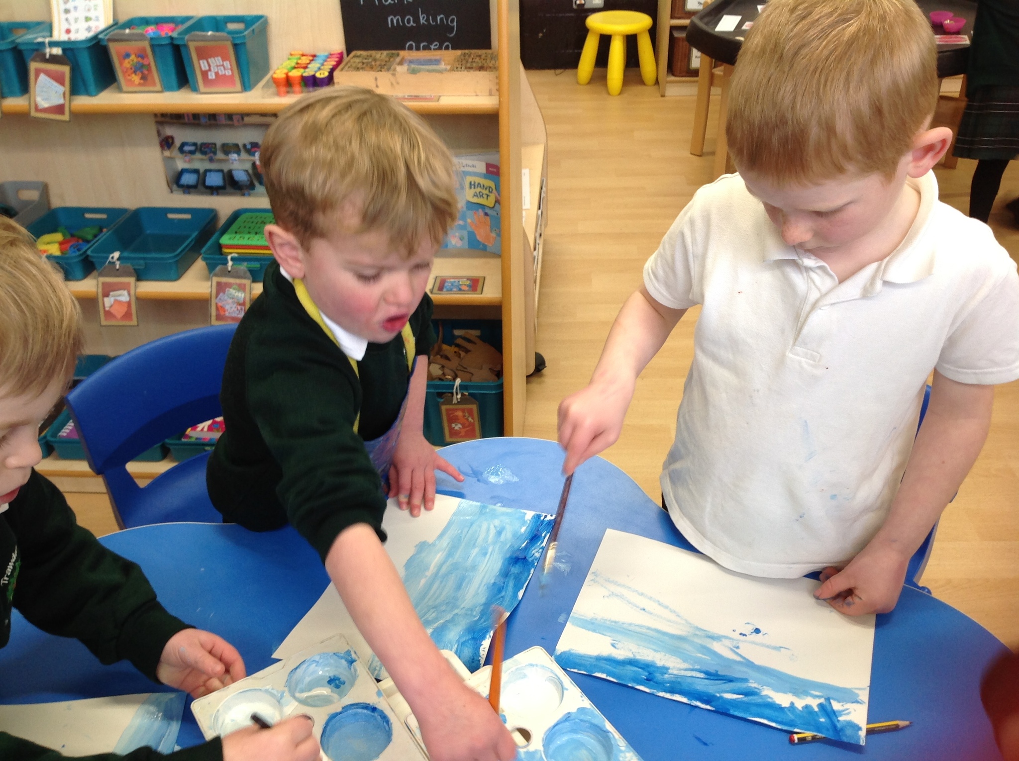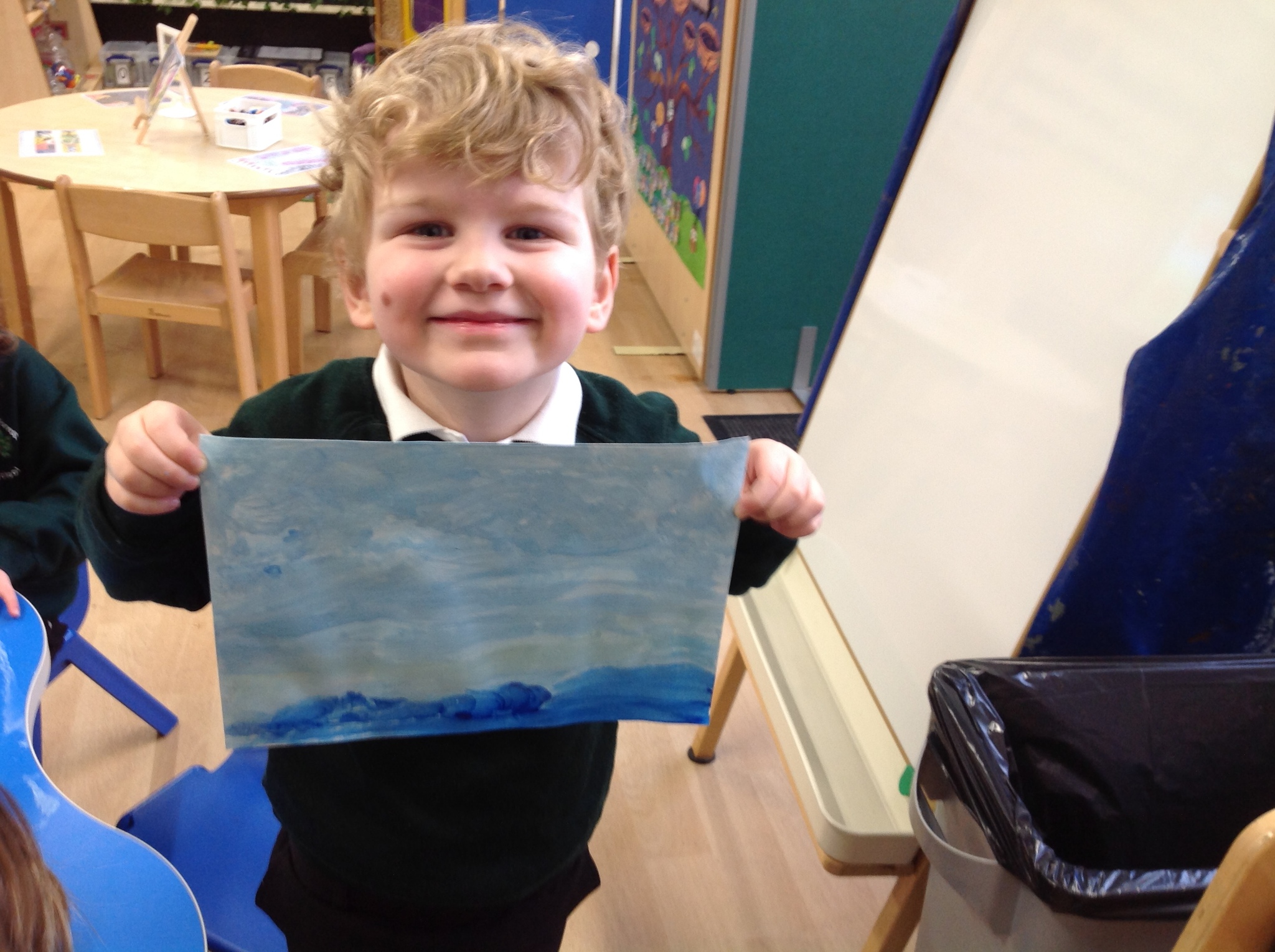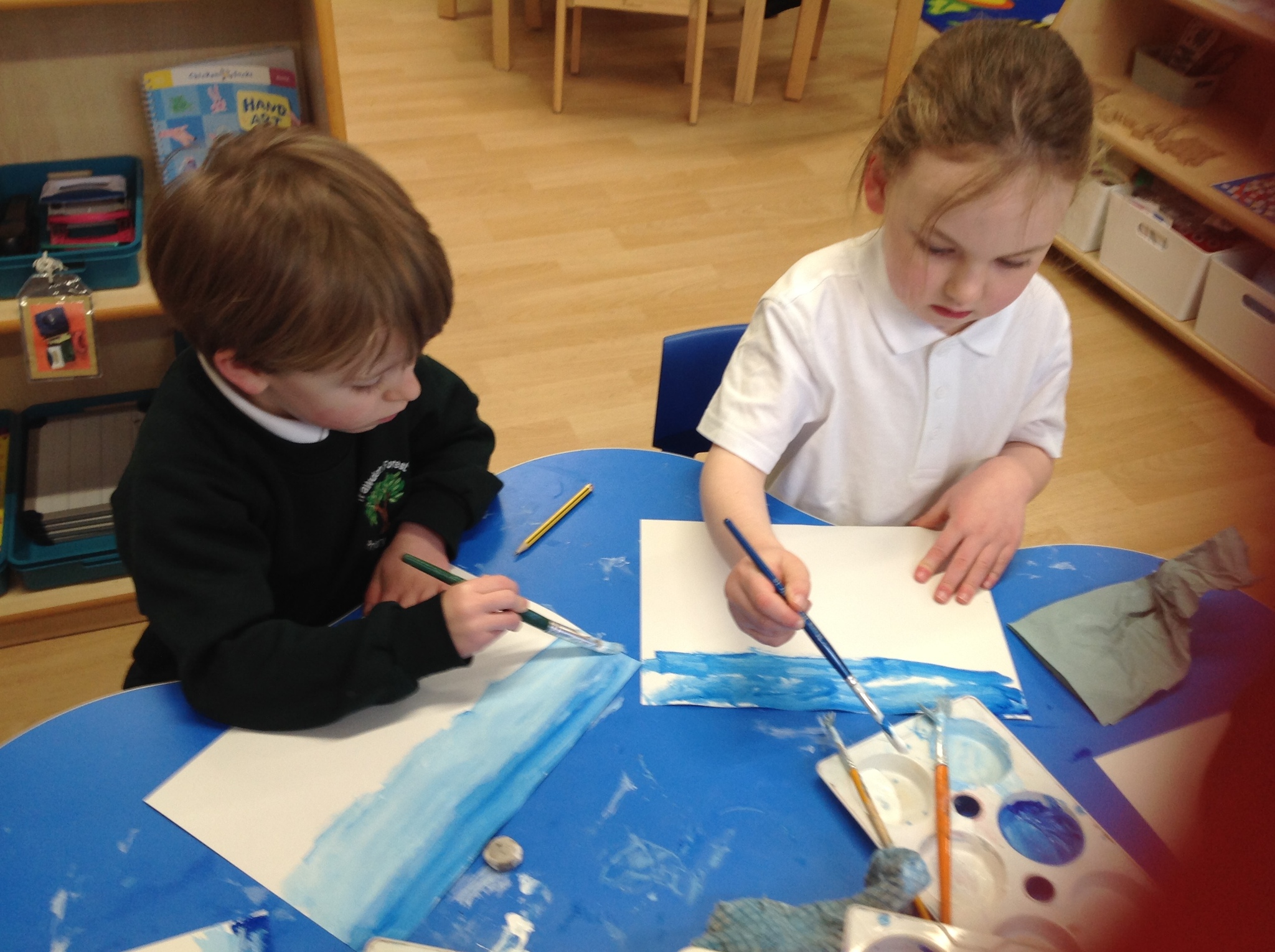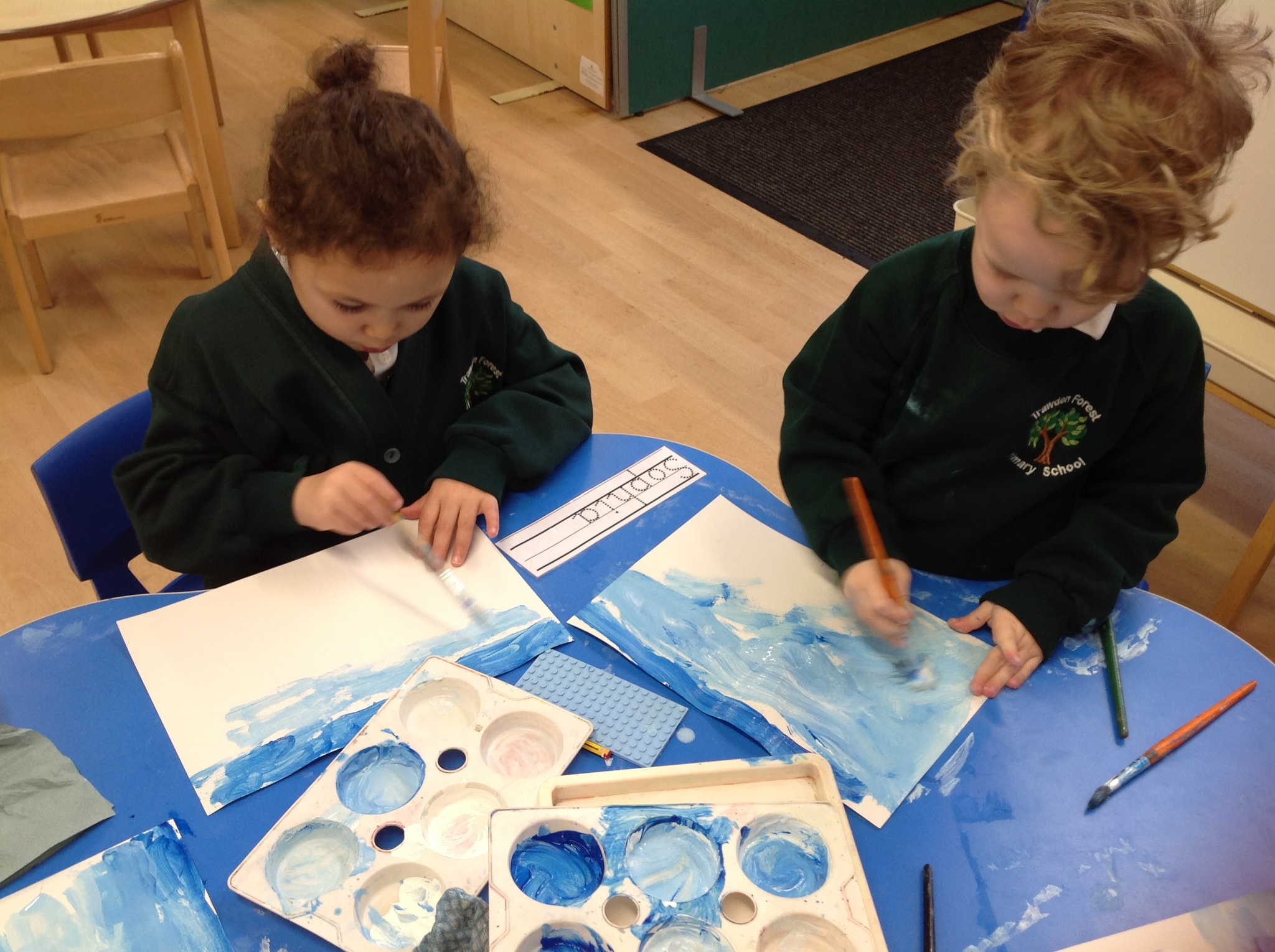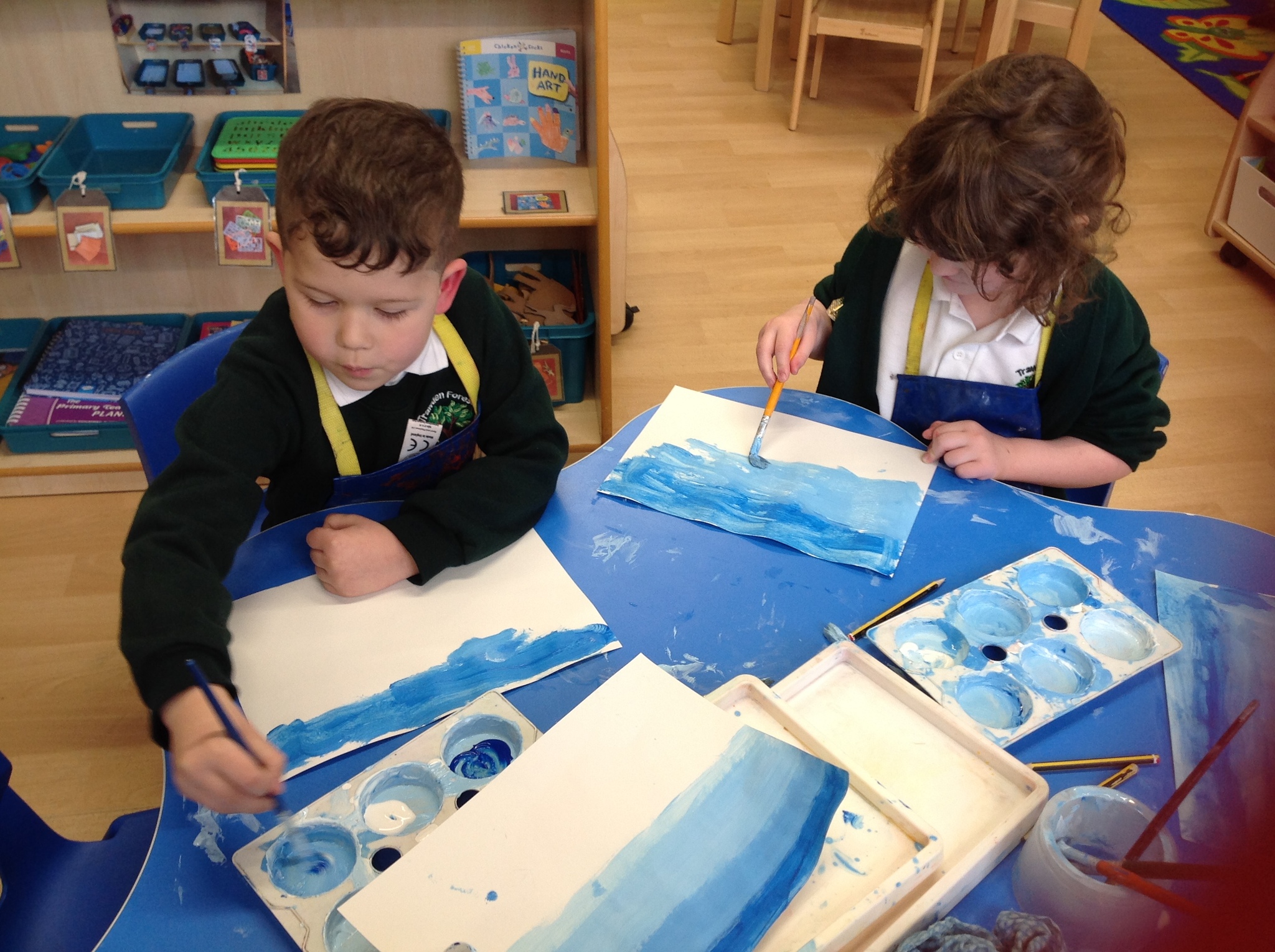 The children created their own wonderful versions of ‘Les oiseaux’ by Henri Matisse. They explored colour mixing to create different shades of blue for the background. They then drew birds similar to Henri’s and cut them out to stick on their artwork.