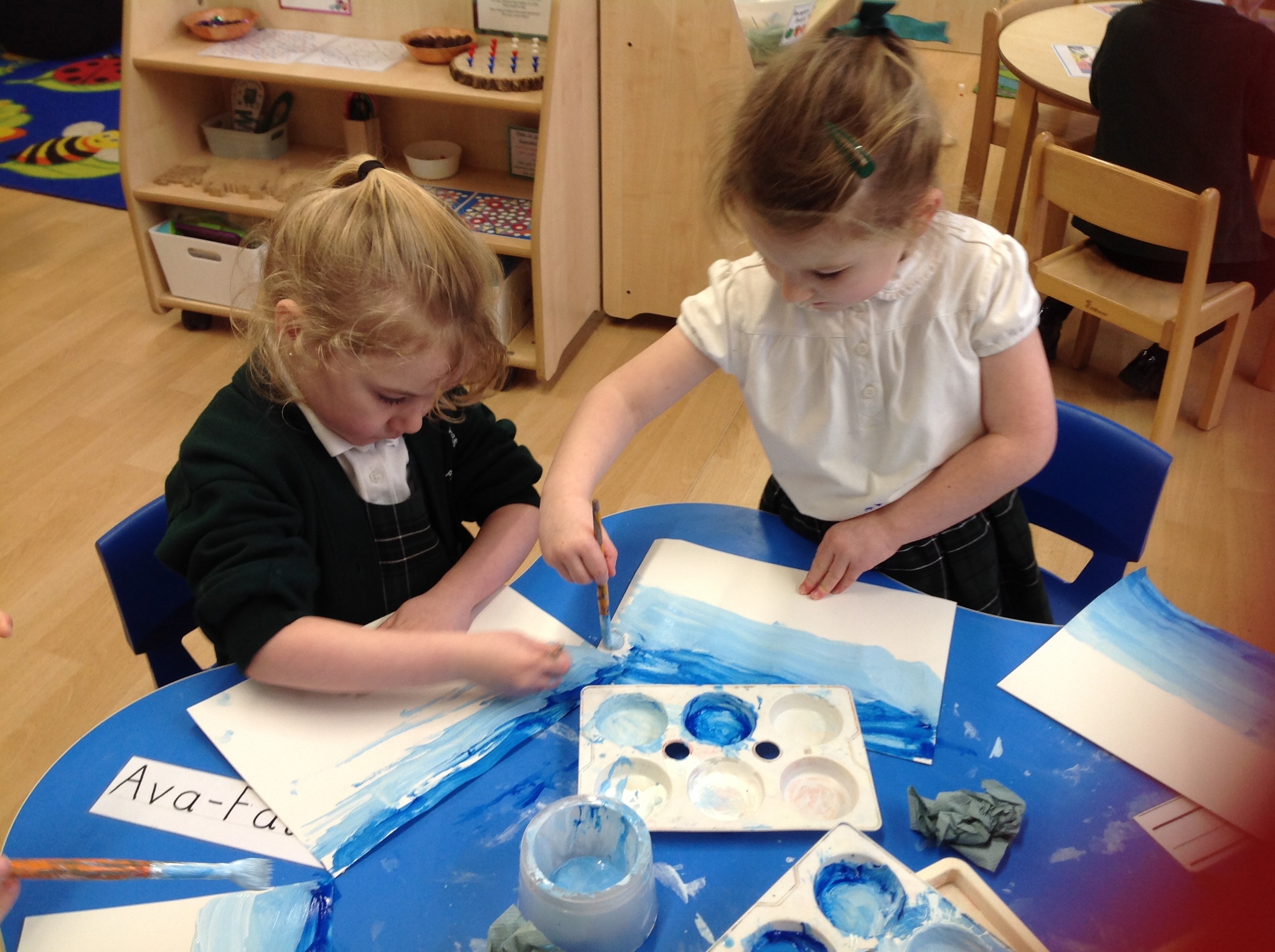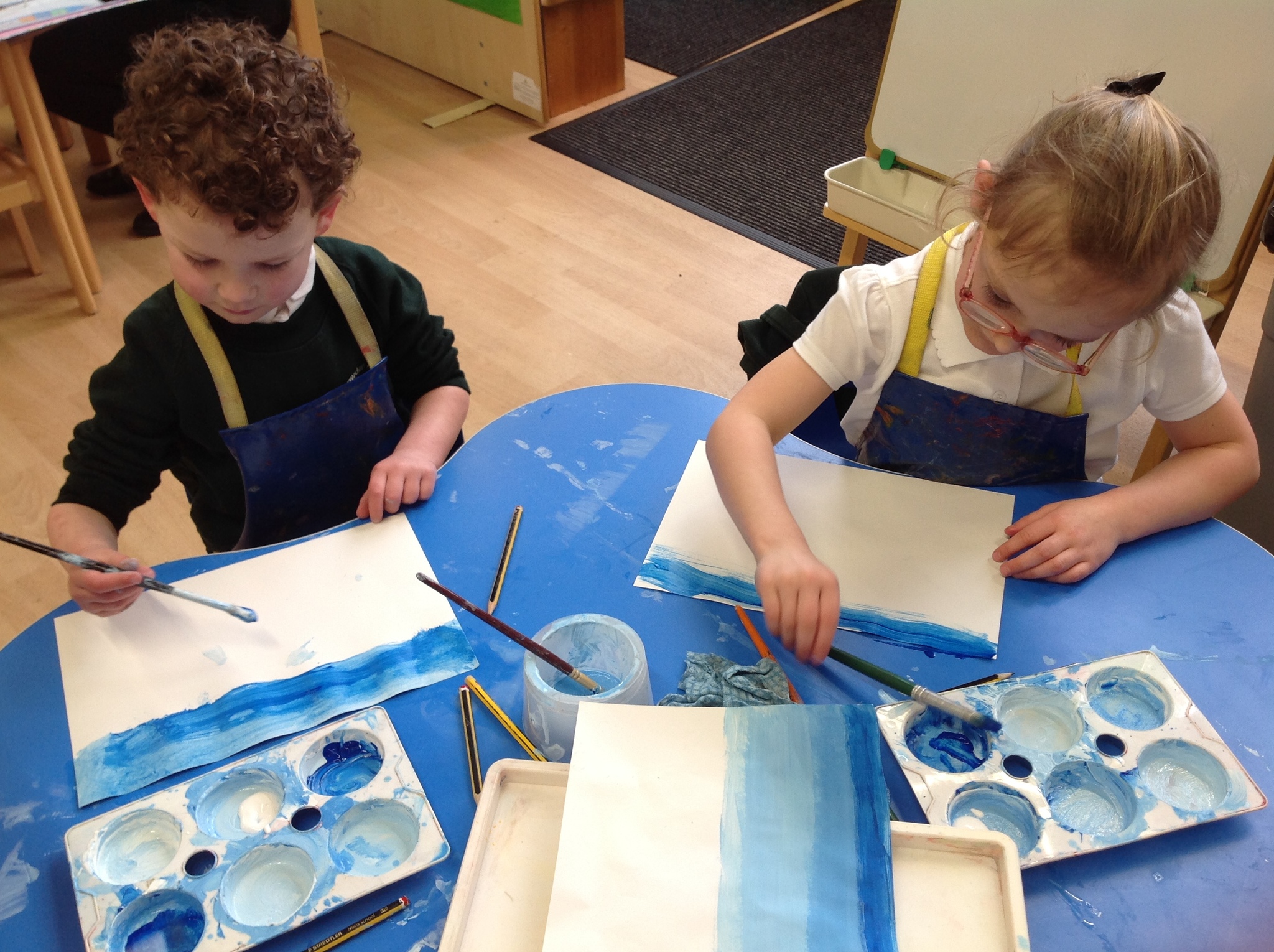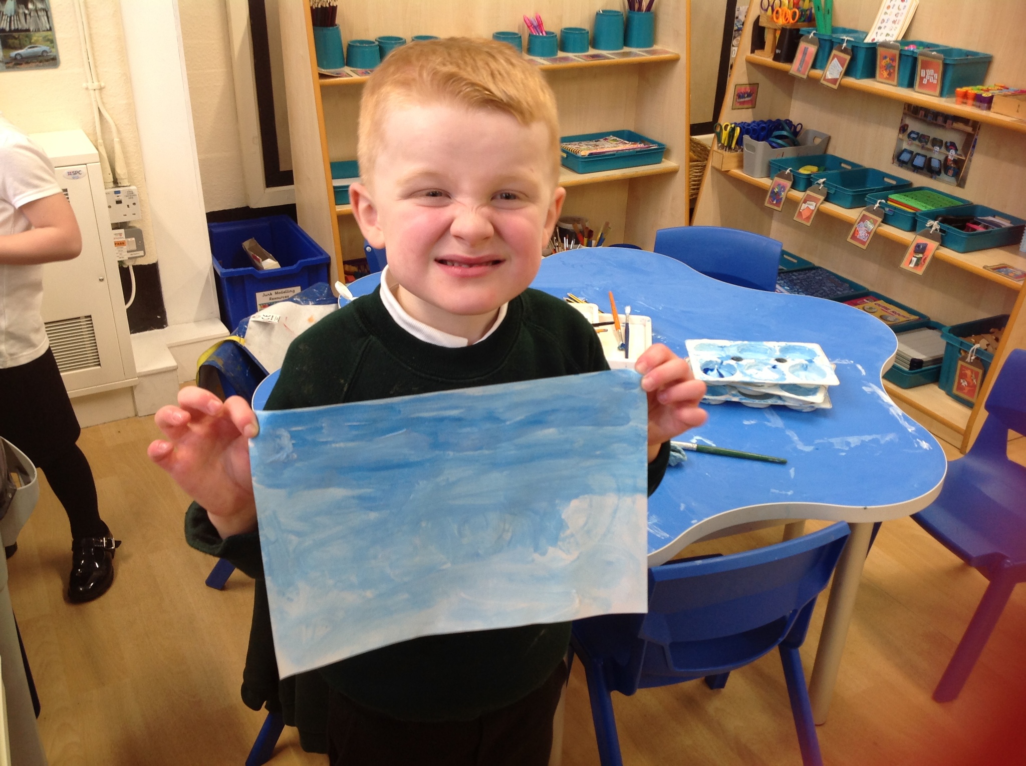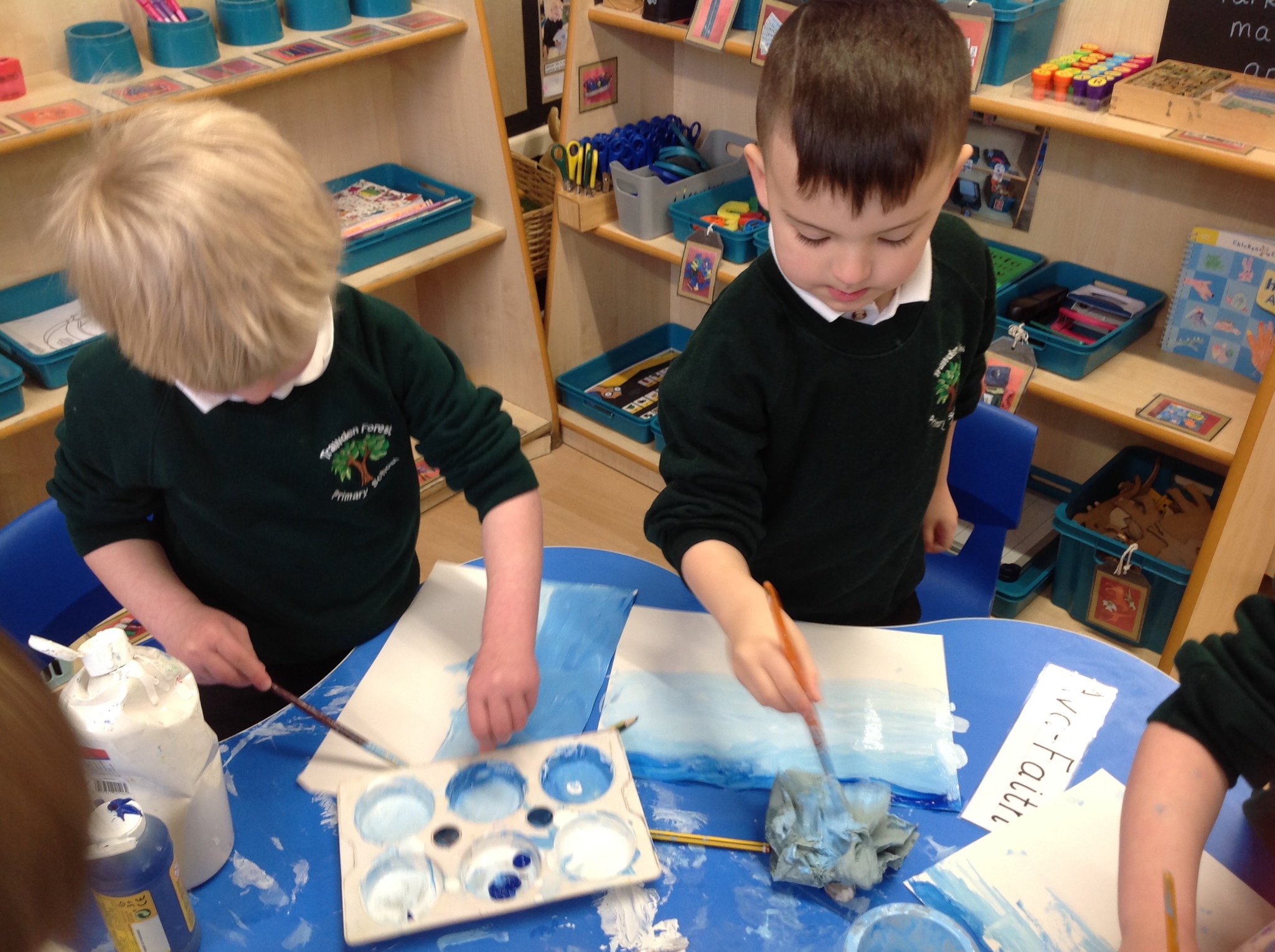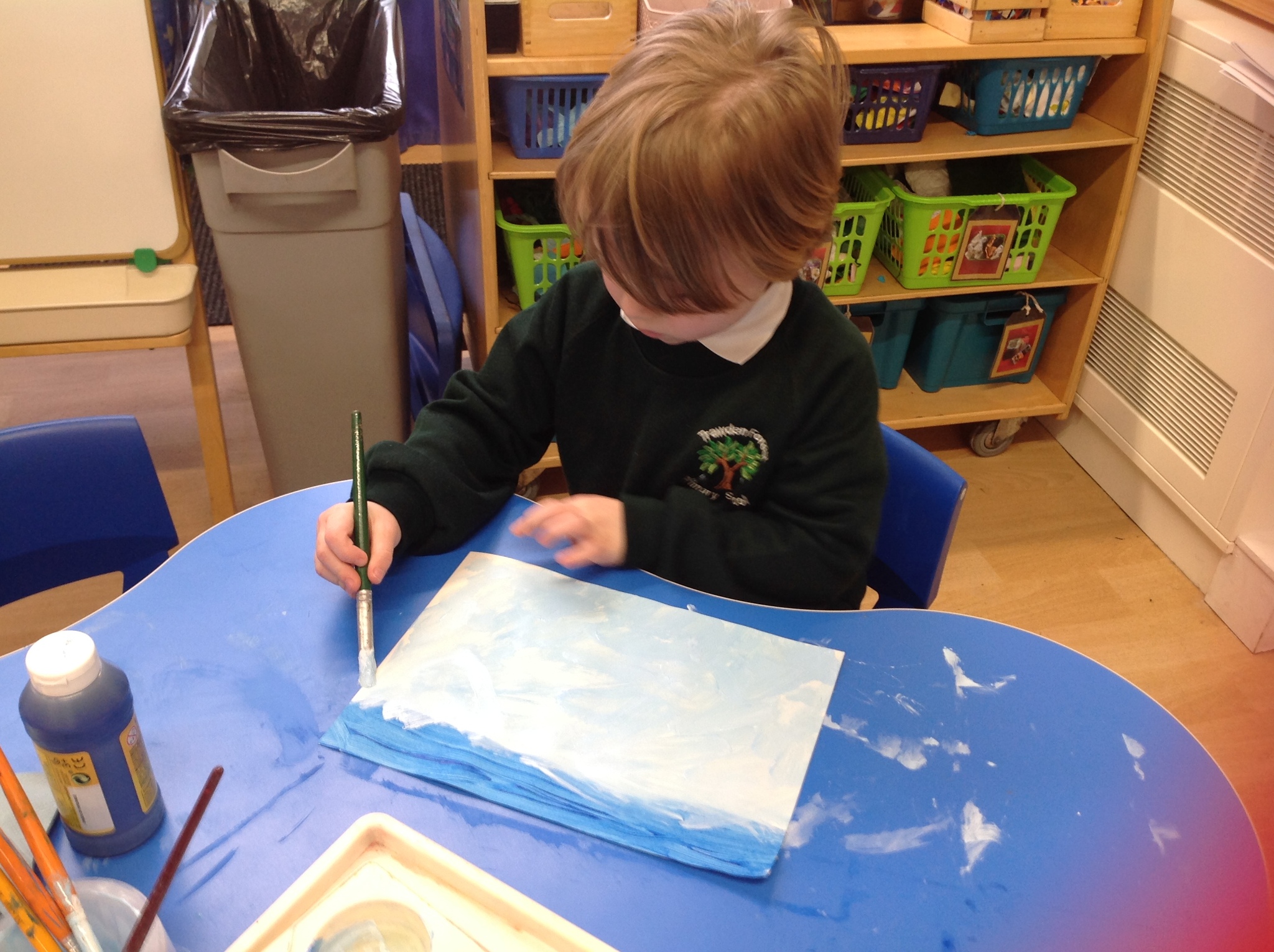 The children created their own wonderful versions of ‘Les oiseaux’ by Henri Matisse. They explored colour mixing to create different shades of blue for the background. They then drew birds similar to Henri’s and cut them out to stick on their artwork.