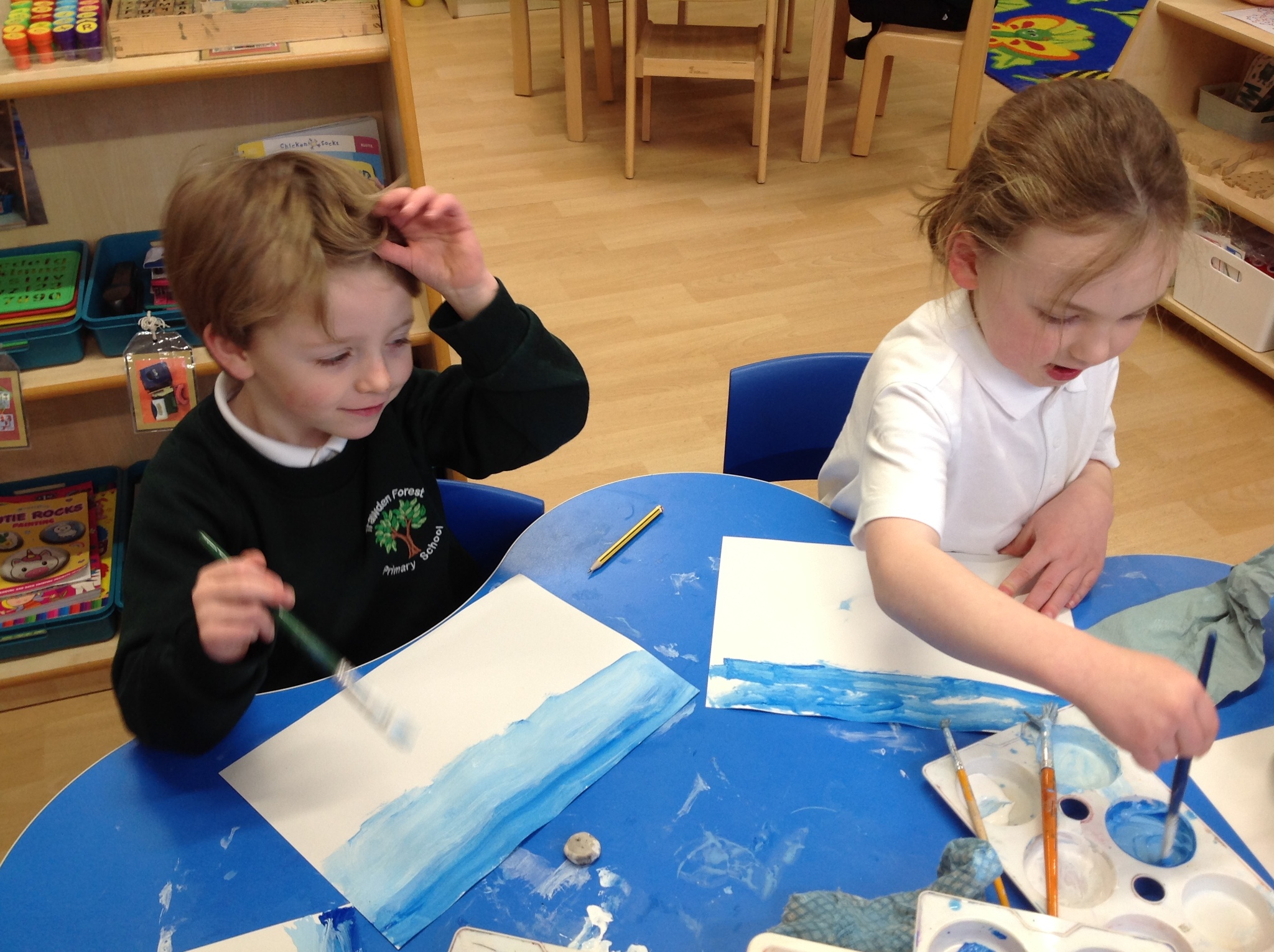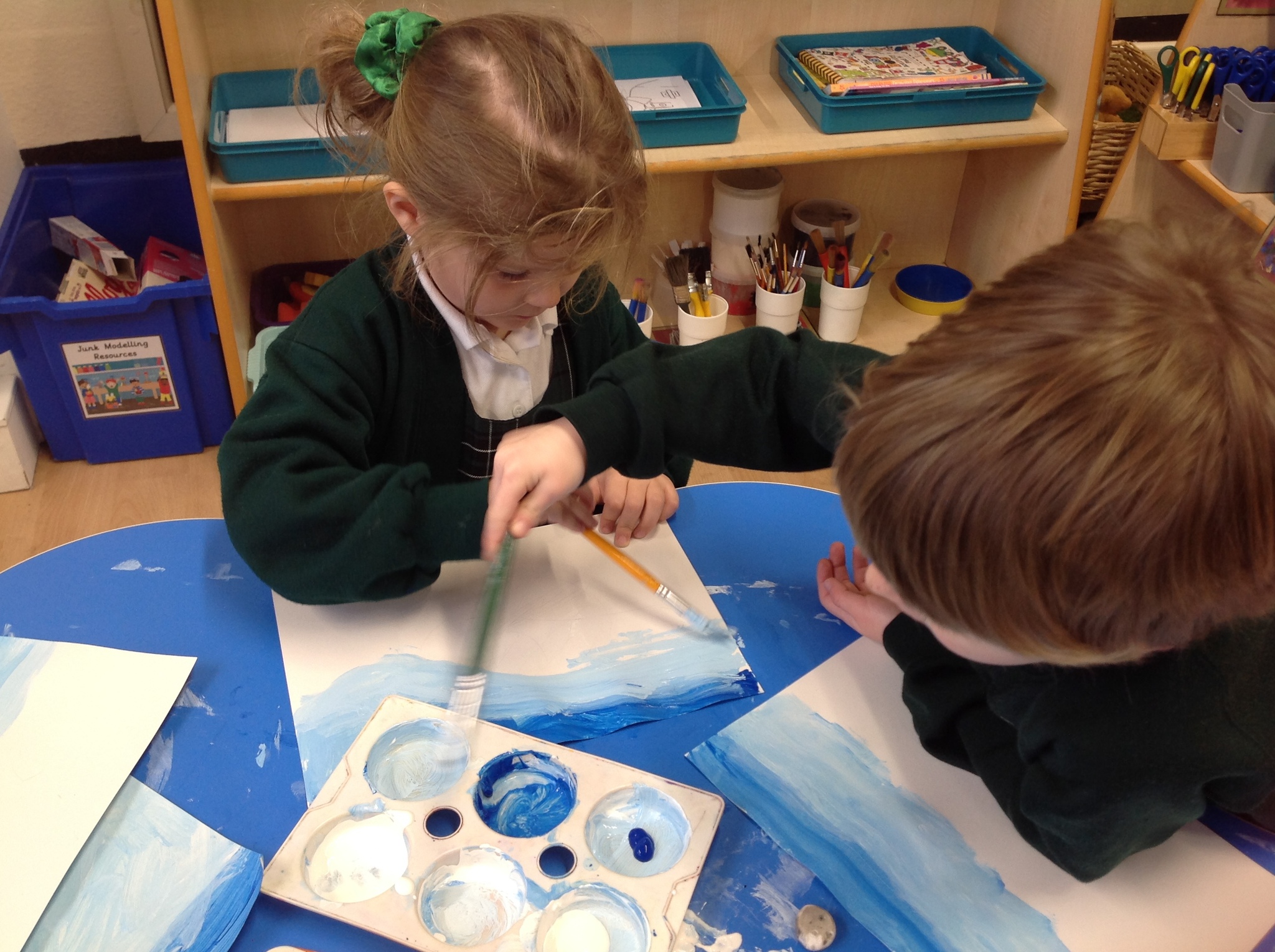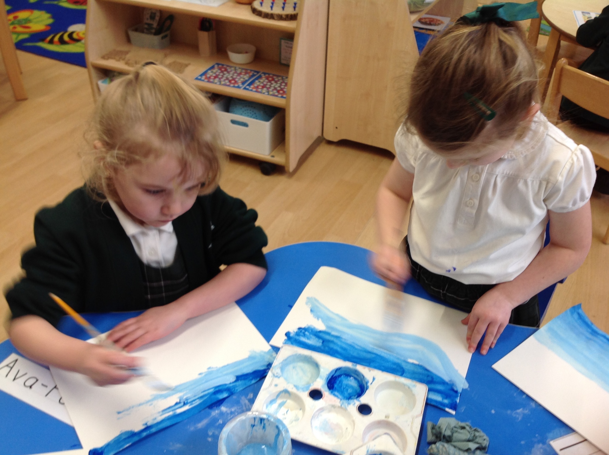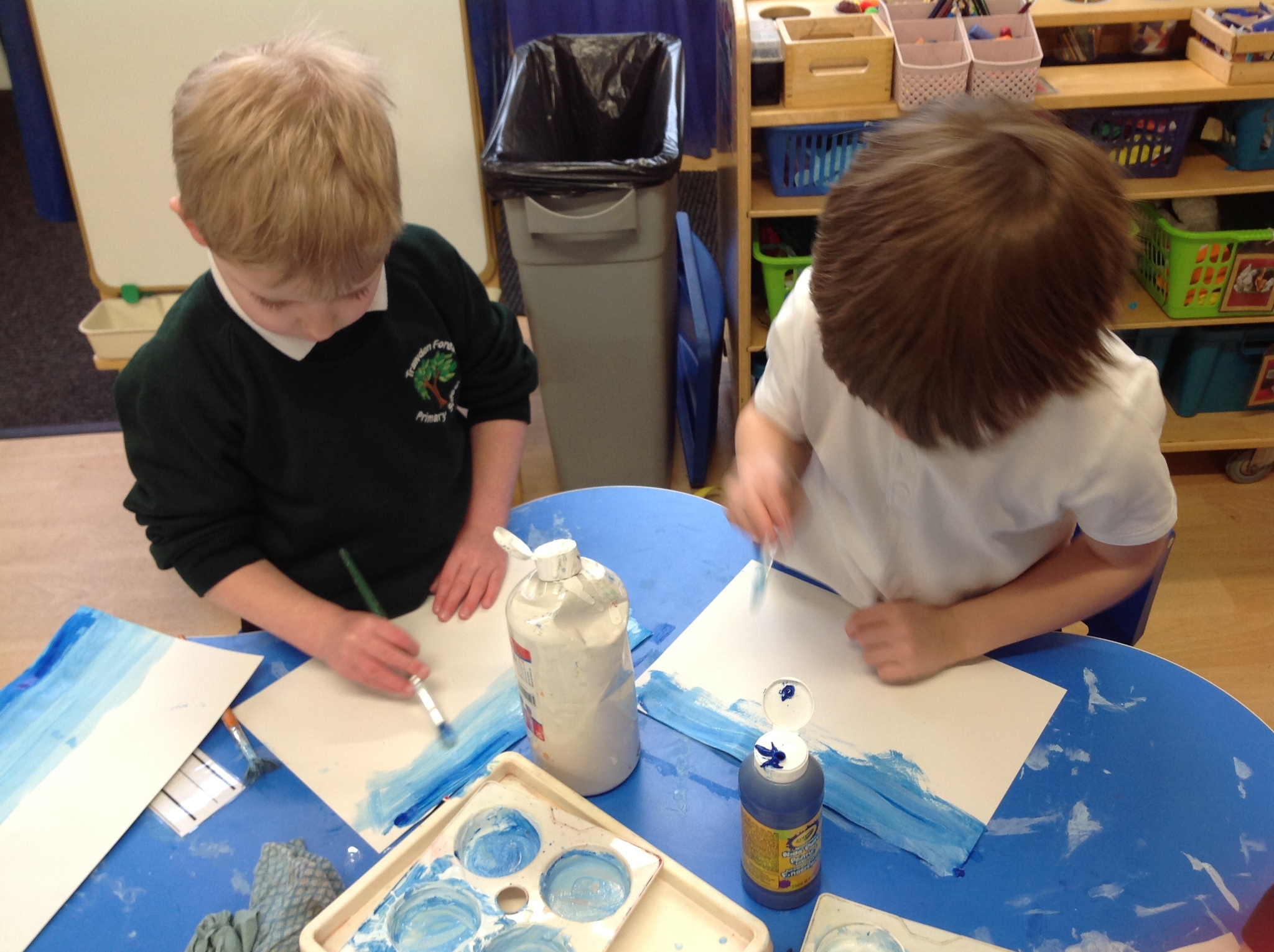 The children created their own wonderful versions of ‘Les oiseaux’ by Henri Matisse. They explored colour mixing to create different shades of blue for the background. They then drew birds similar to Henri’s and cut them out to stick on their artwork.