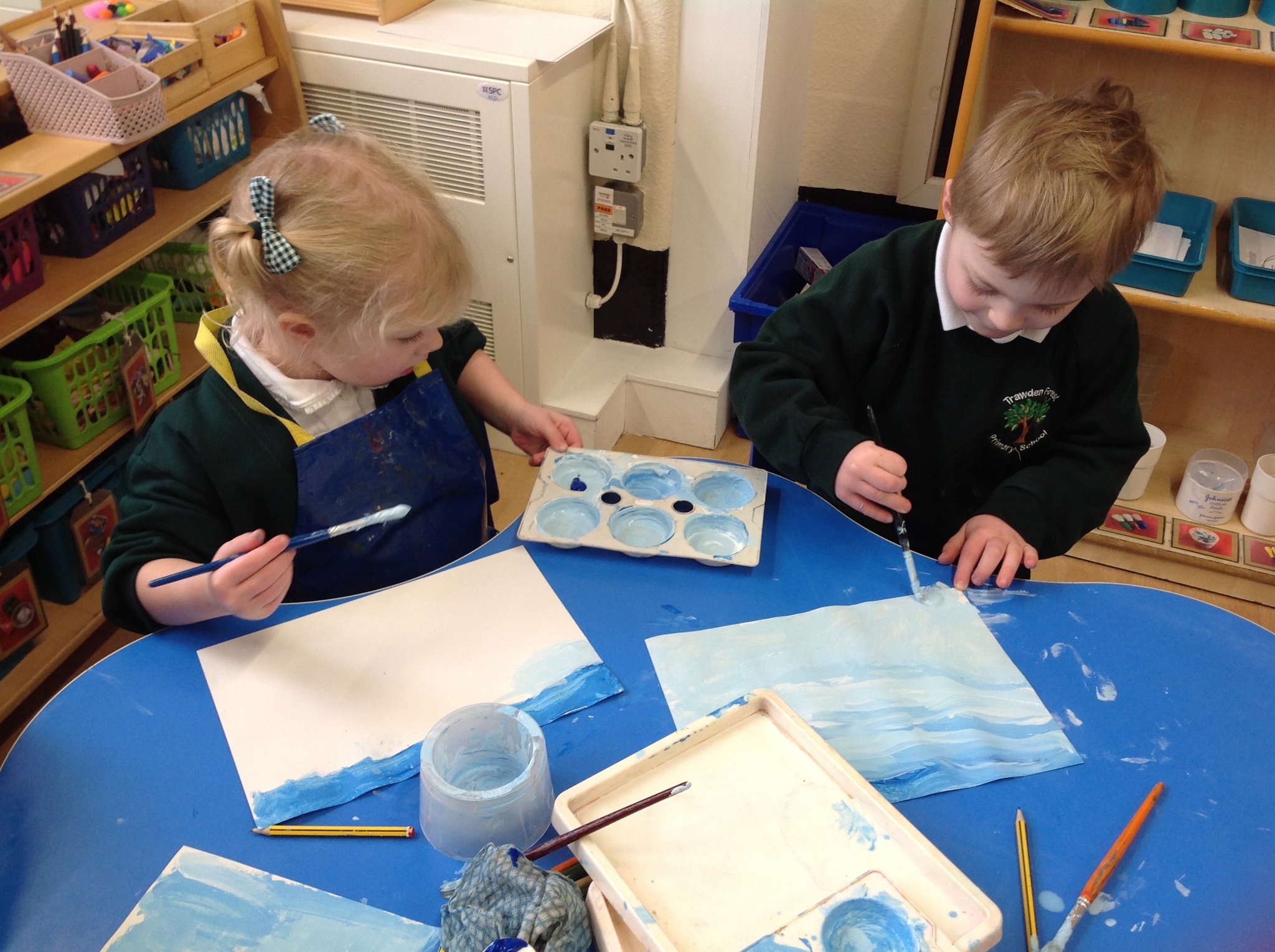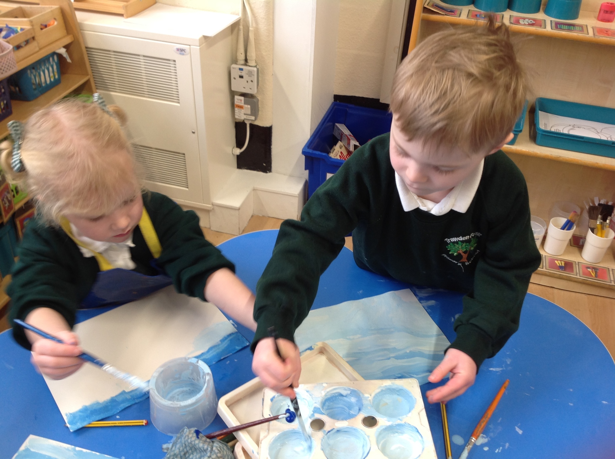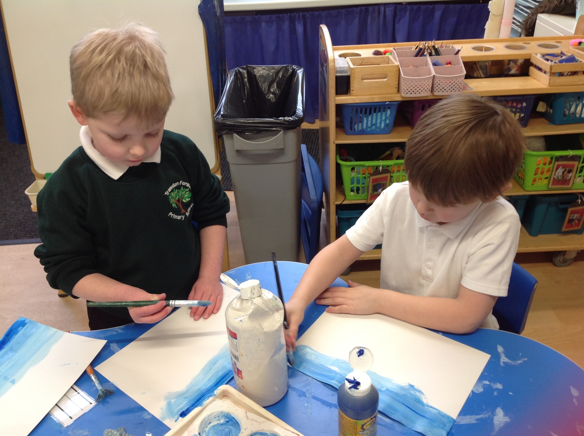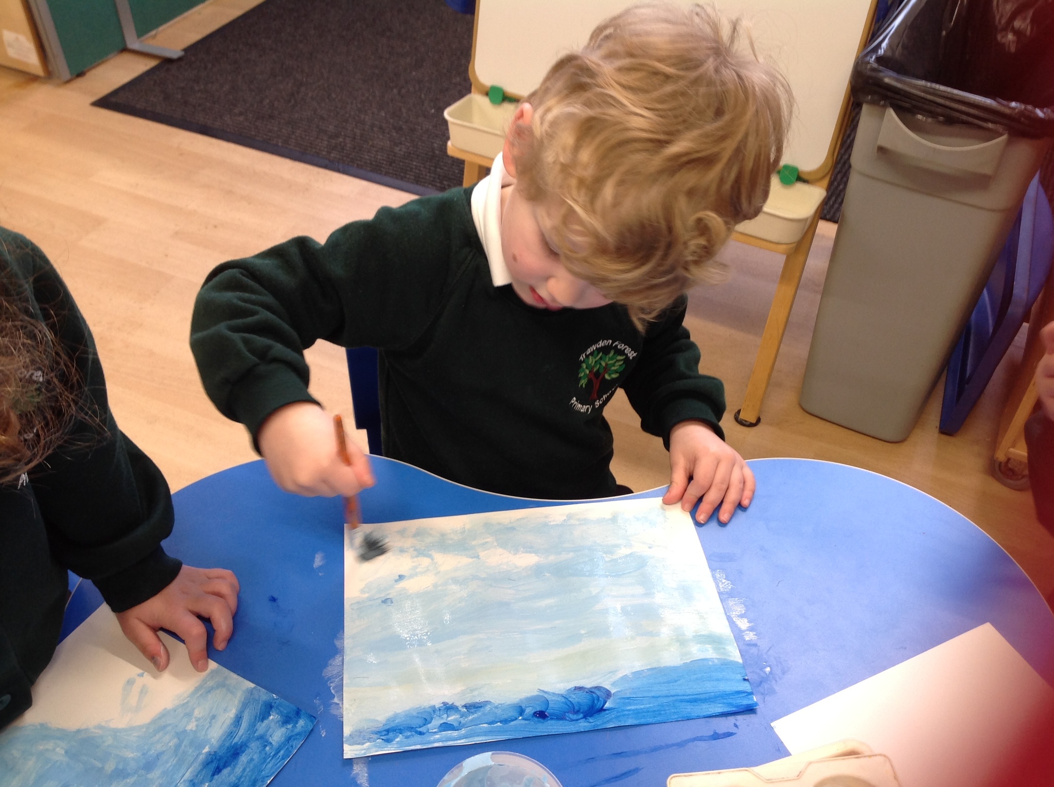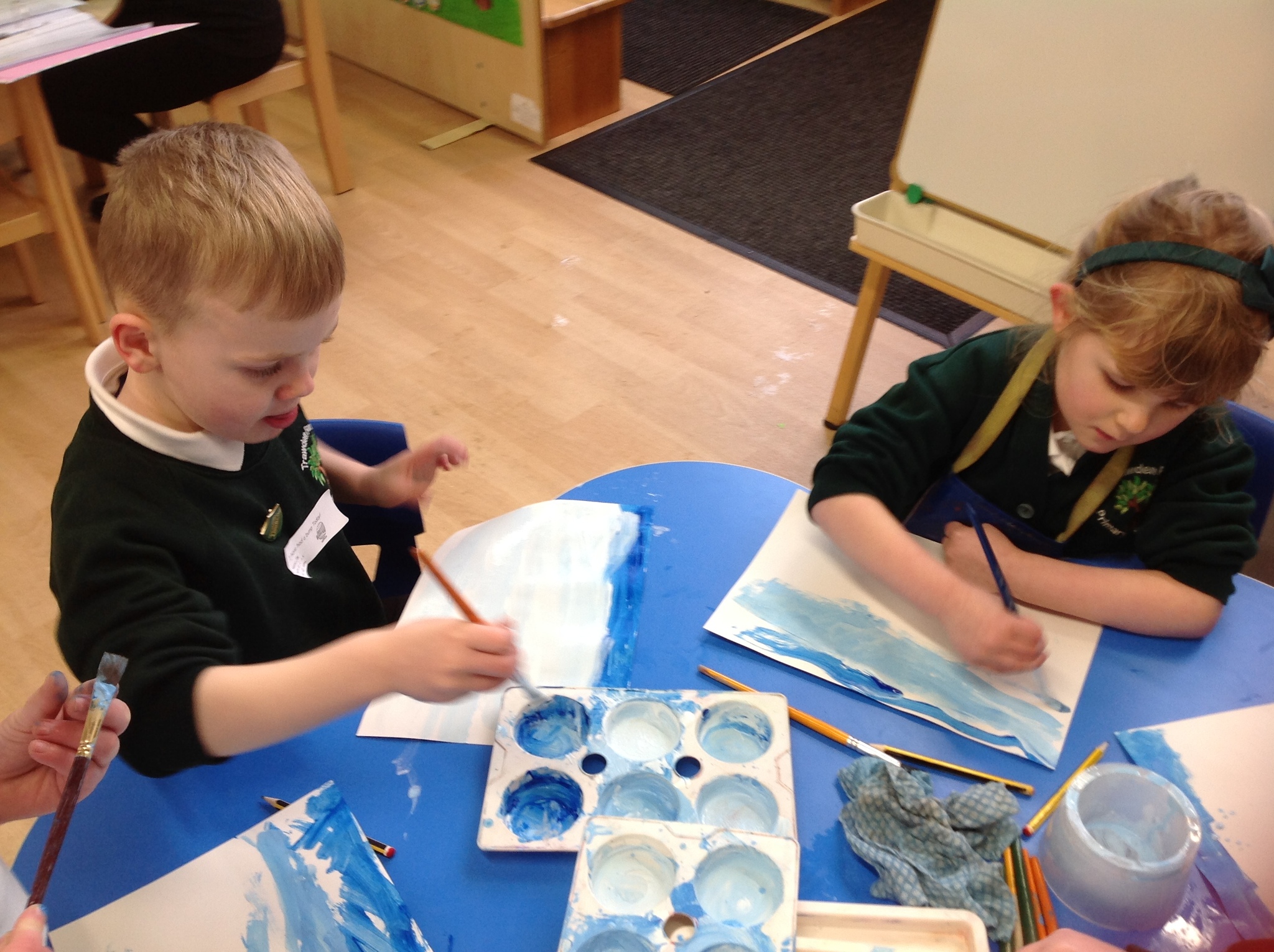 The children created their own wonderful versions of ‘Les oiseaux’ by Henri Matisse. They explored colour mixing to create different shades of blue for the background. They then drew birds similar to Henri’s and cut them out to stick on their artwork.