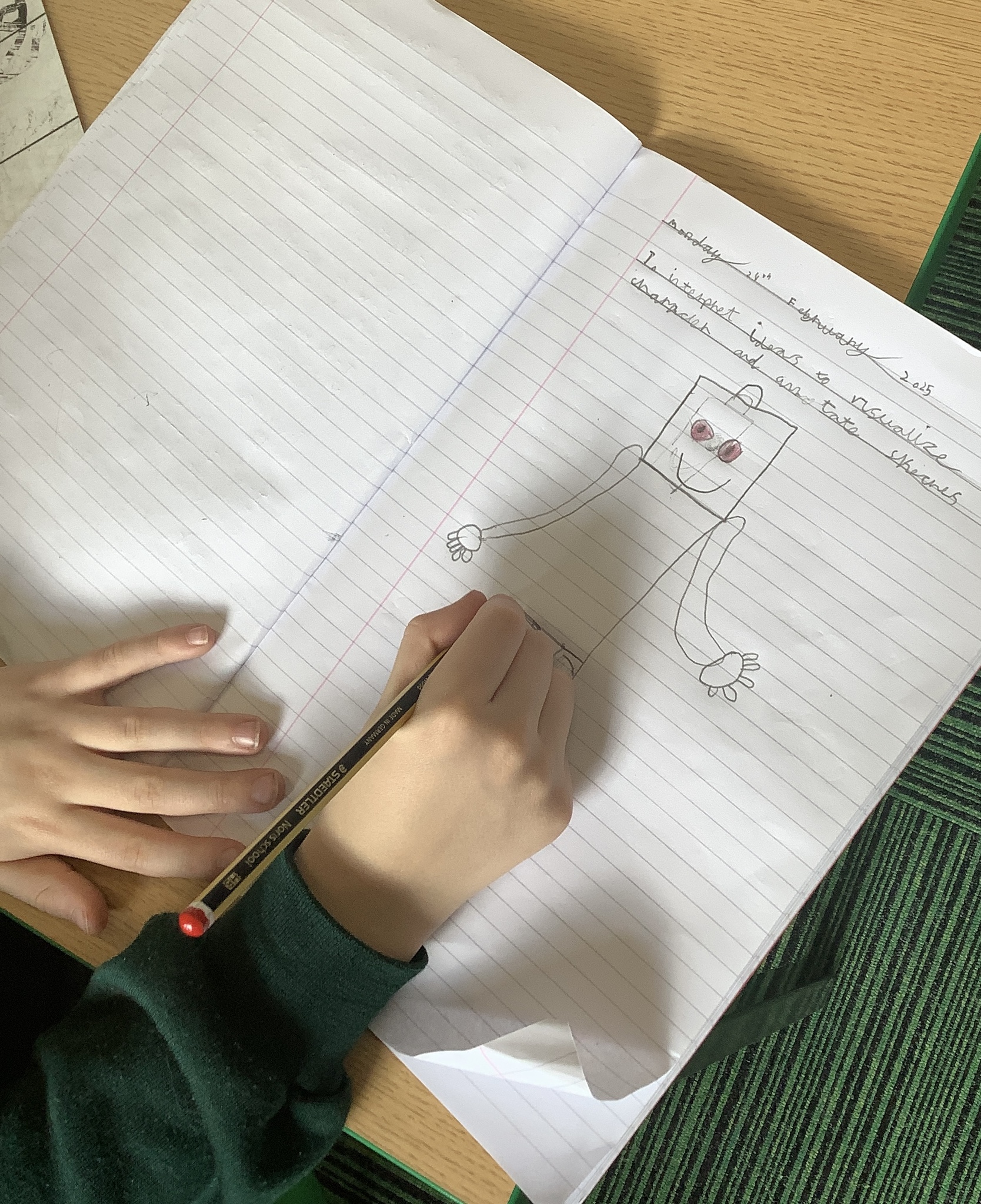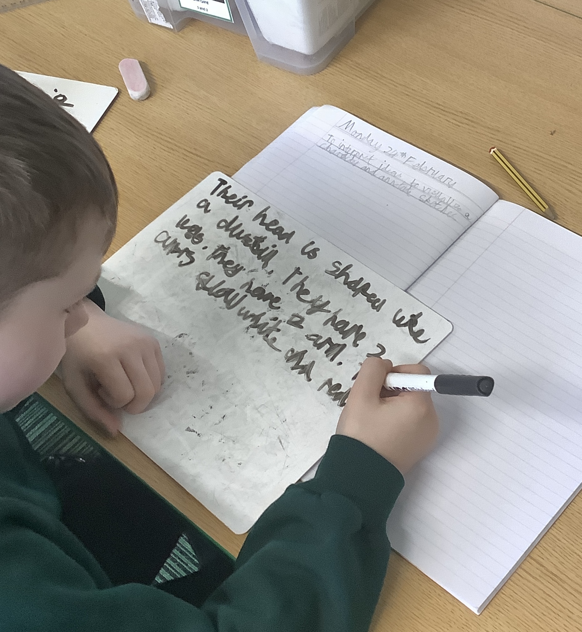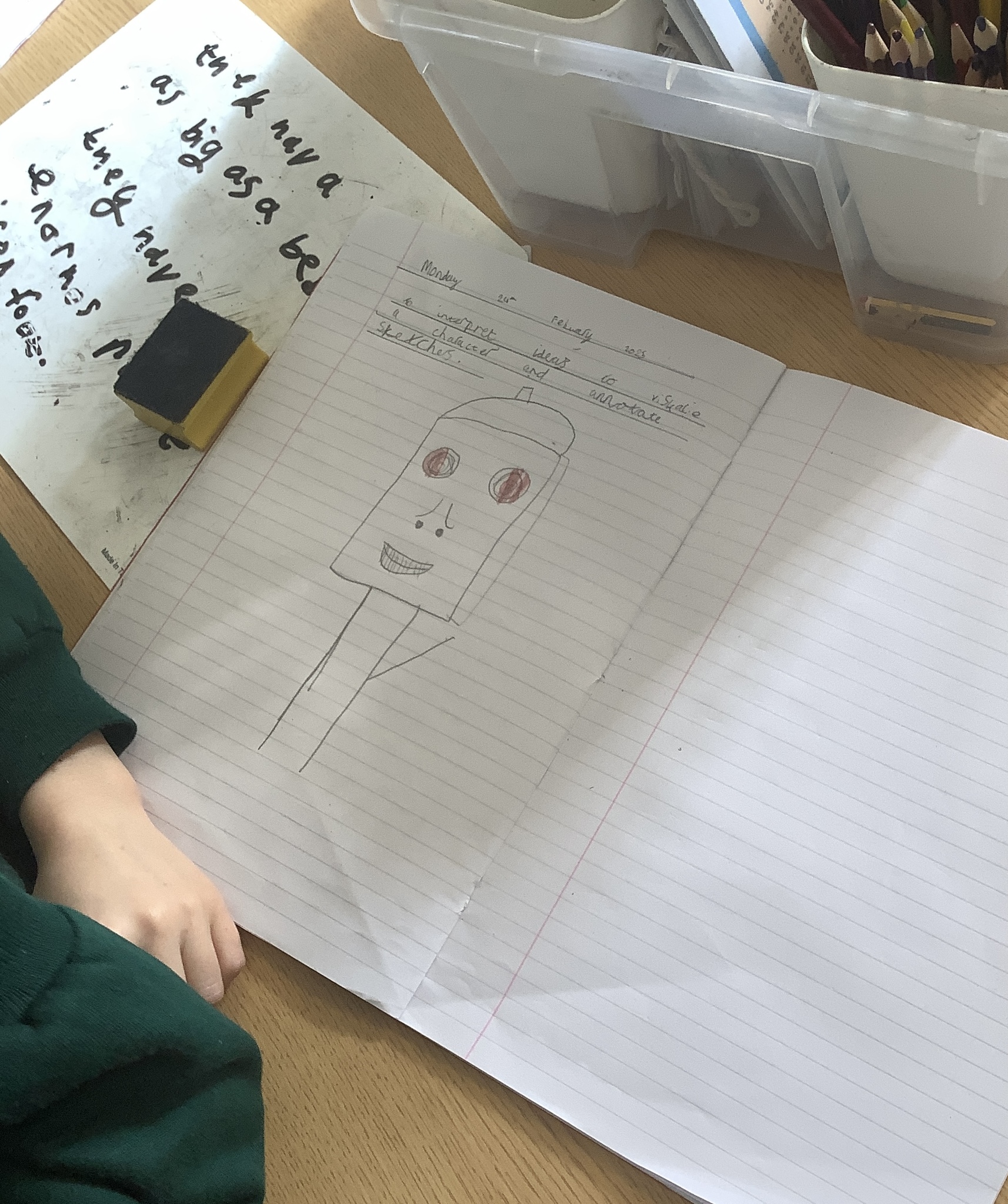 Our hardworking detectives had to search the classroom for clues that could help them to deduce who the main character is in our new book. After successfully finding all of the clues, they had to work together to examine the evidence they collected and use it to create character sketches that would allow them to identify the mystery person.