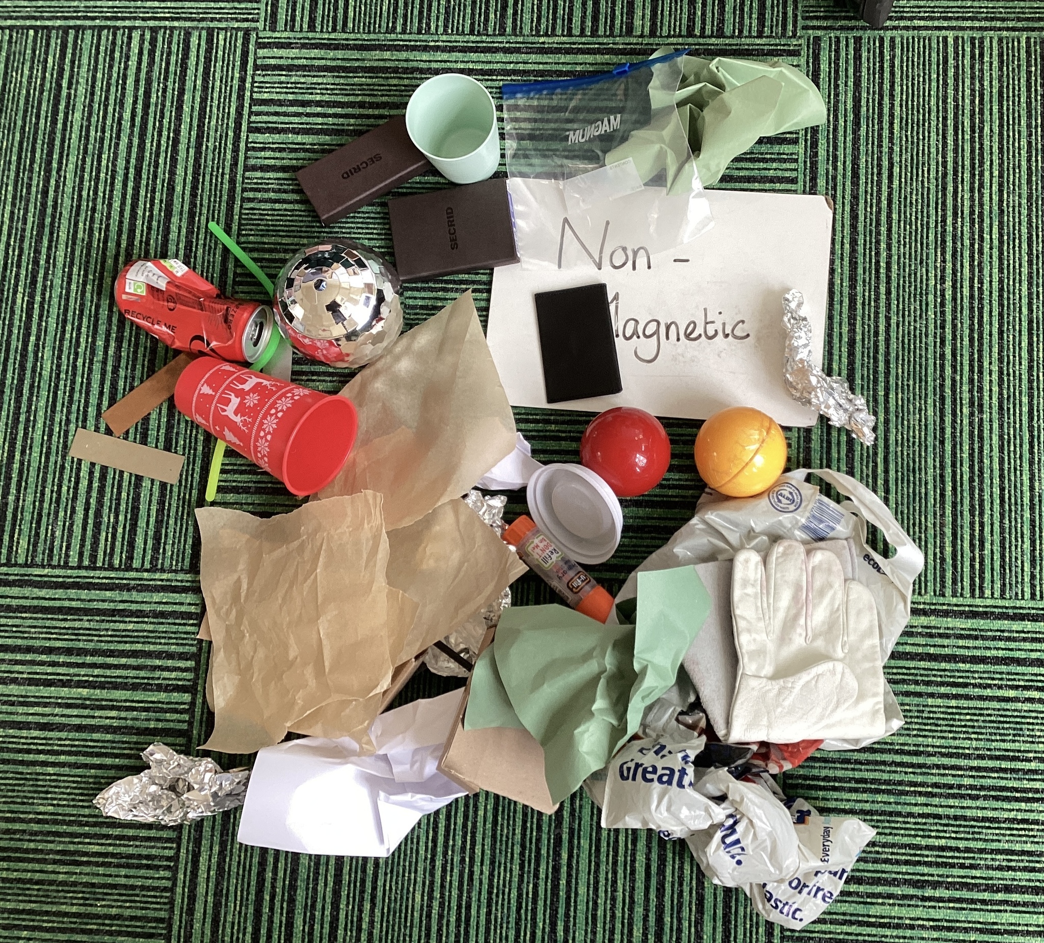 They also had to put their sorting skills to the test when the classroom turned into a mini landfill! The children were able to use their prior learning on magnetism to explore how magnets have changed the way we recycle. First, they had a go at sorting the "rubbish" into magnetic and non-magnetic materials just by using their own reasoning, and then they worked together as a team to use magnets to sort the "rubbish" to see if we missed or mislabelled any materials, deepening their understanding of magnetism as well as the importance of recycling our waste.