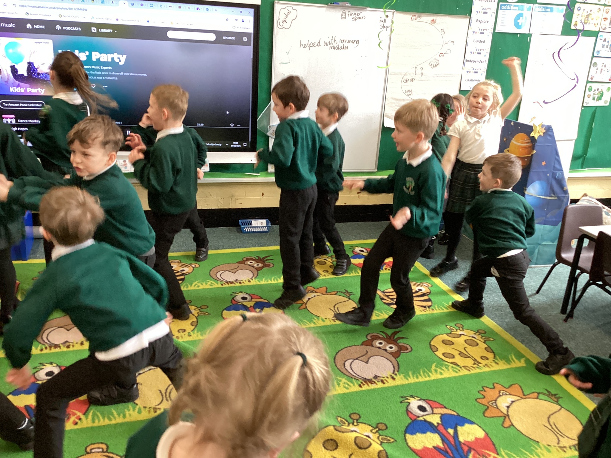The classroom was decorated with bunting and balloons and we had party music playing. The children suggested the types of things we do at a birthday party and we made a list.
