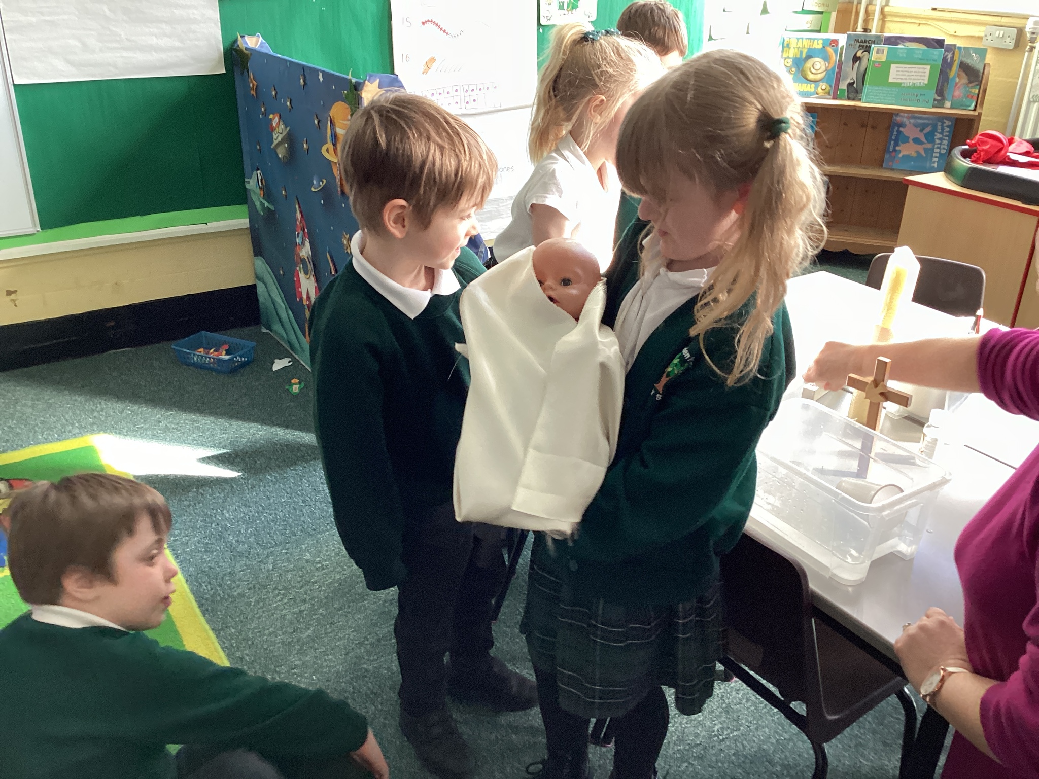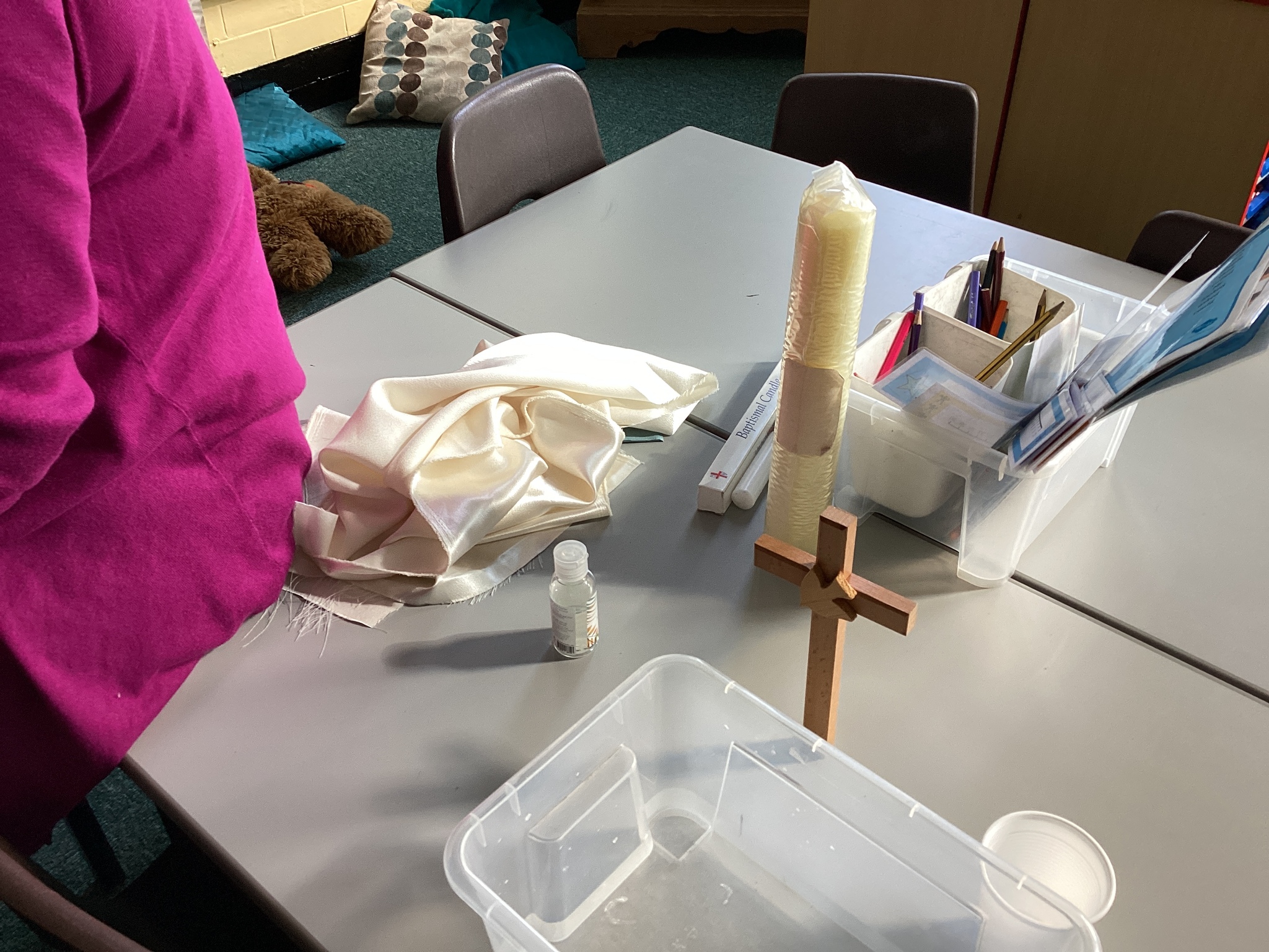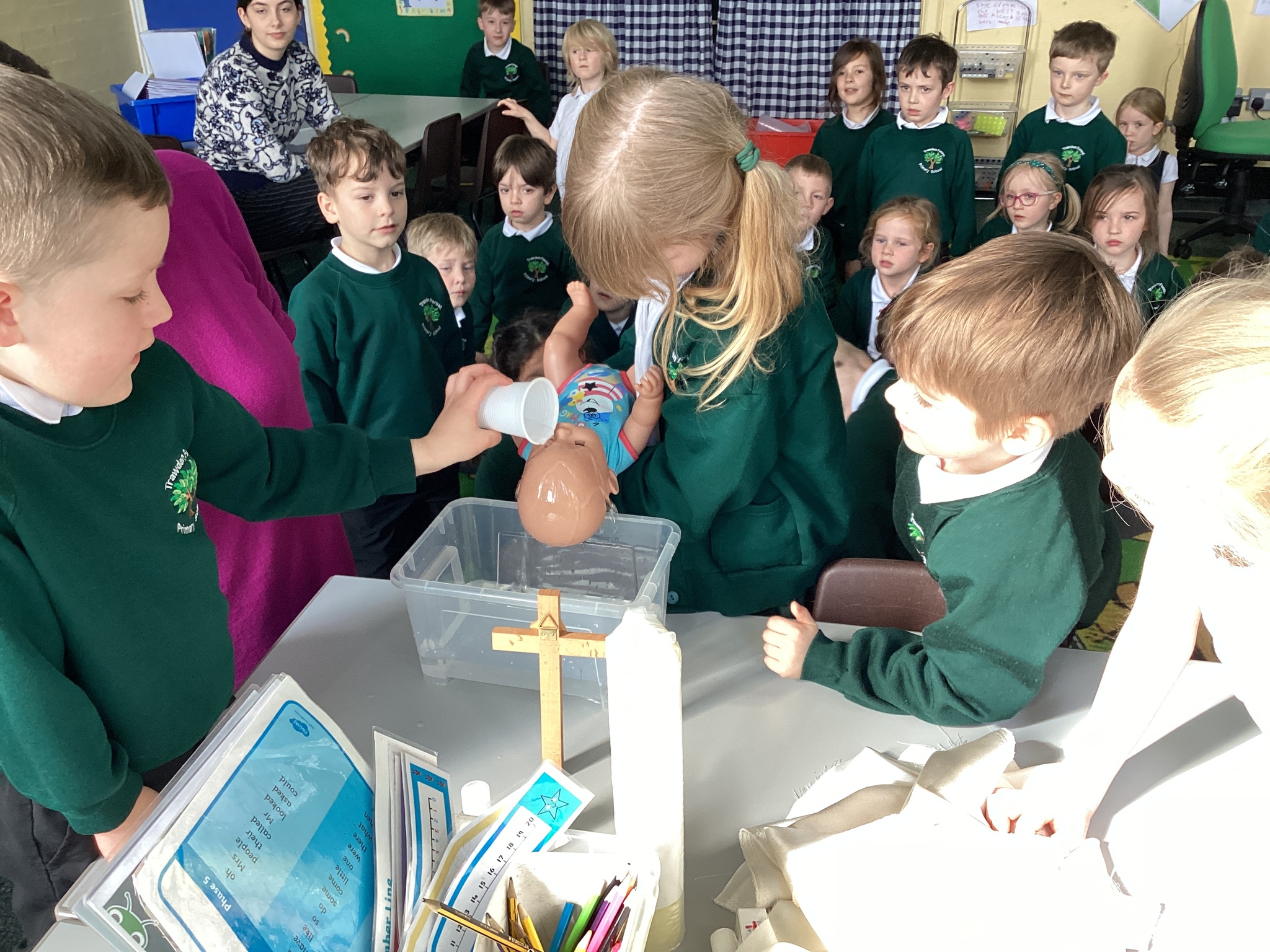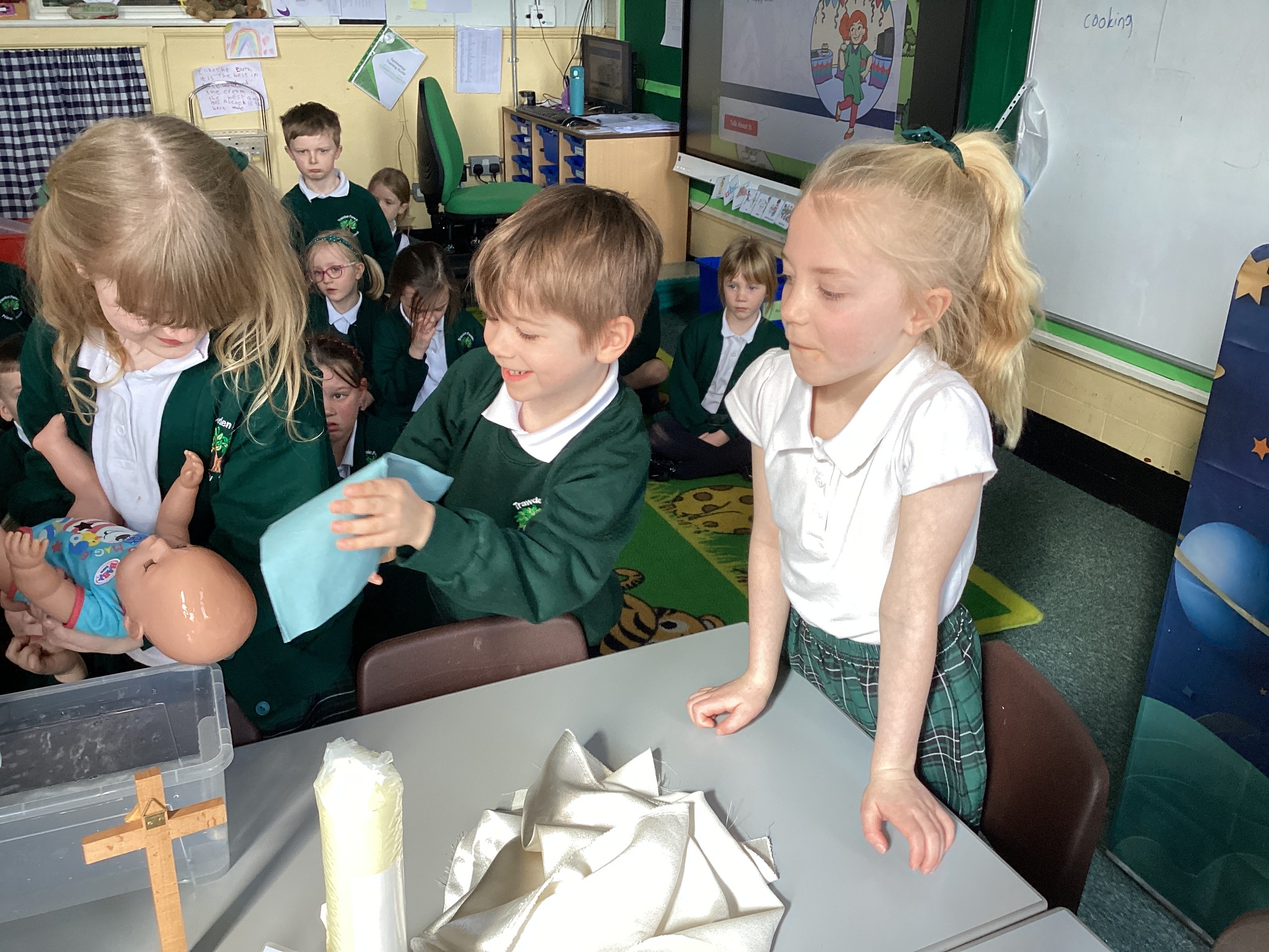 We acted out our own baptisms with parents, priest, godparents and a very well behaved baby. The children did a great job of recognising the symbols used and remembering what to say.