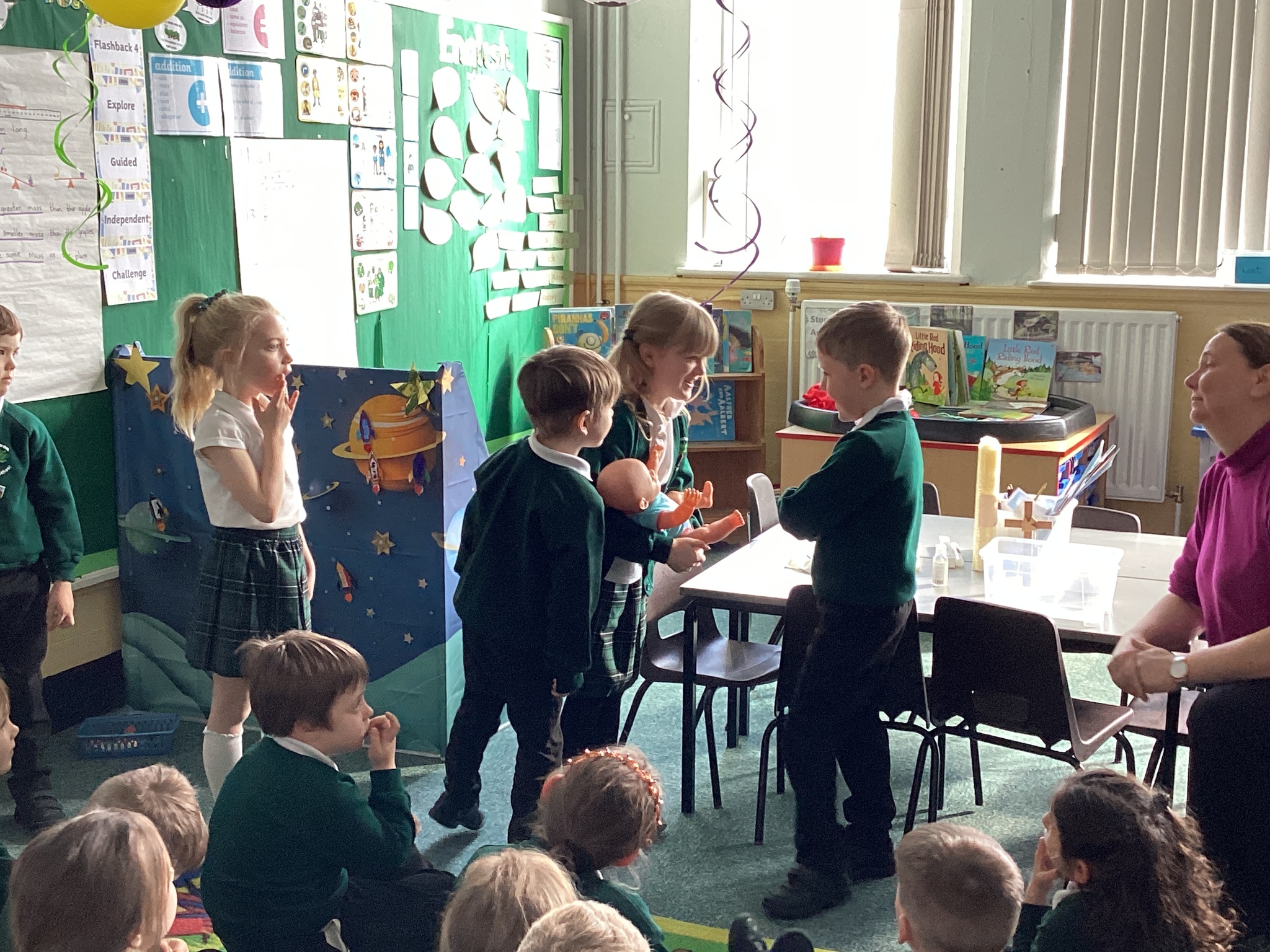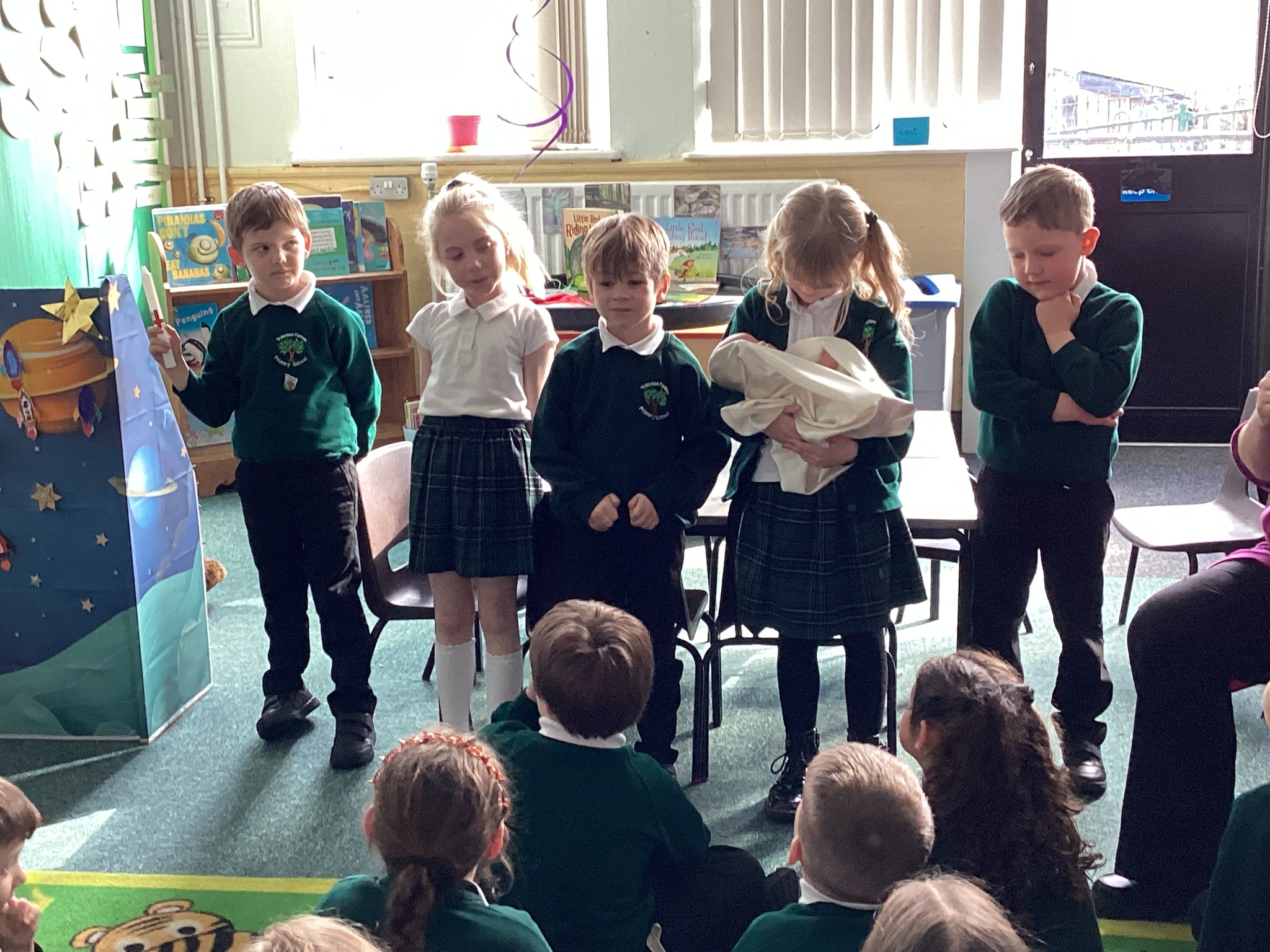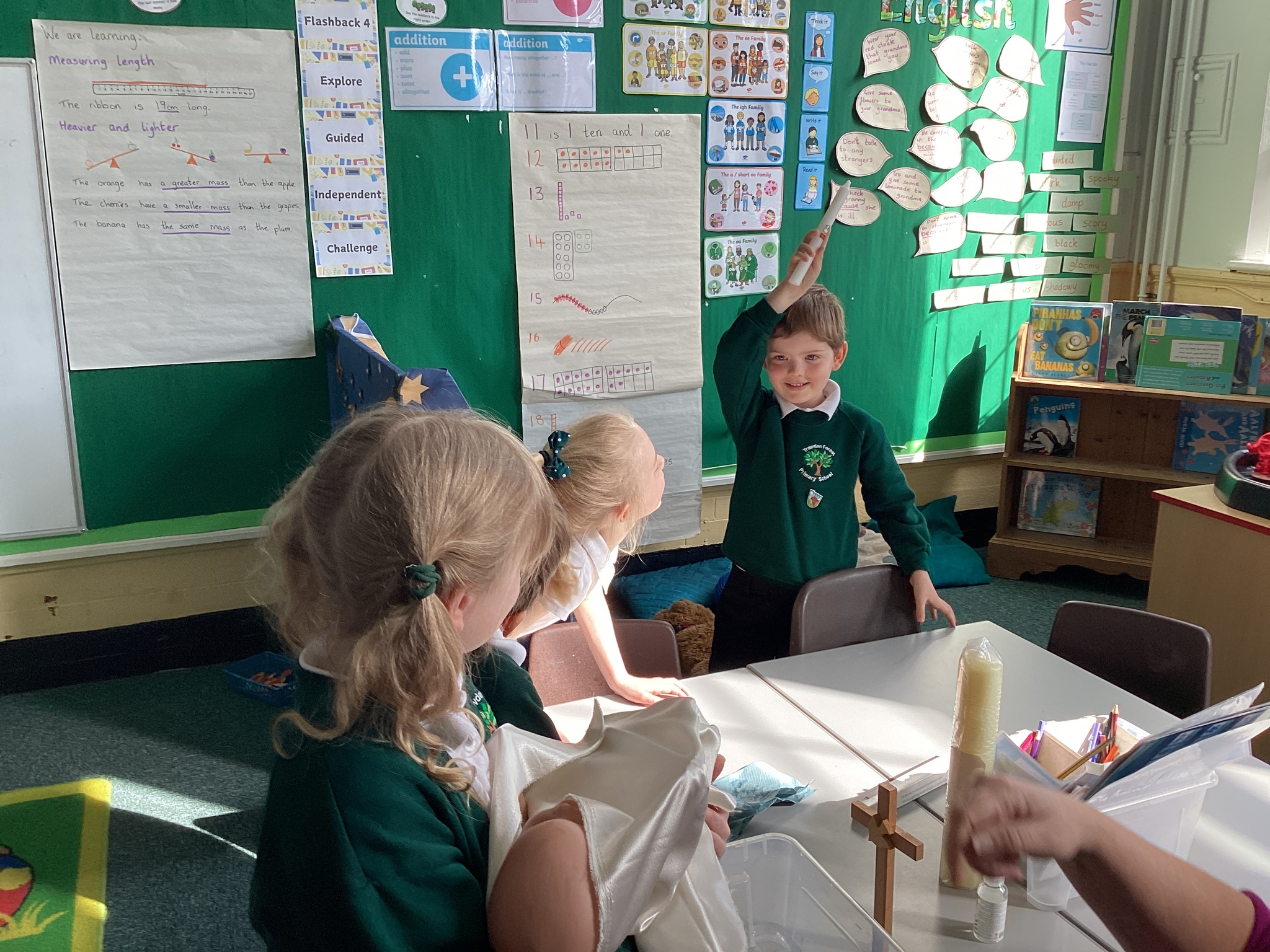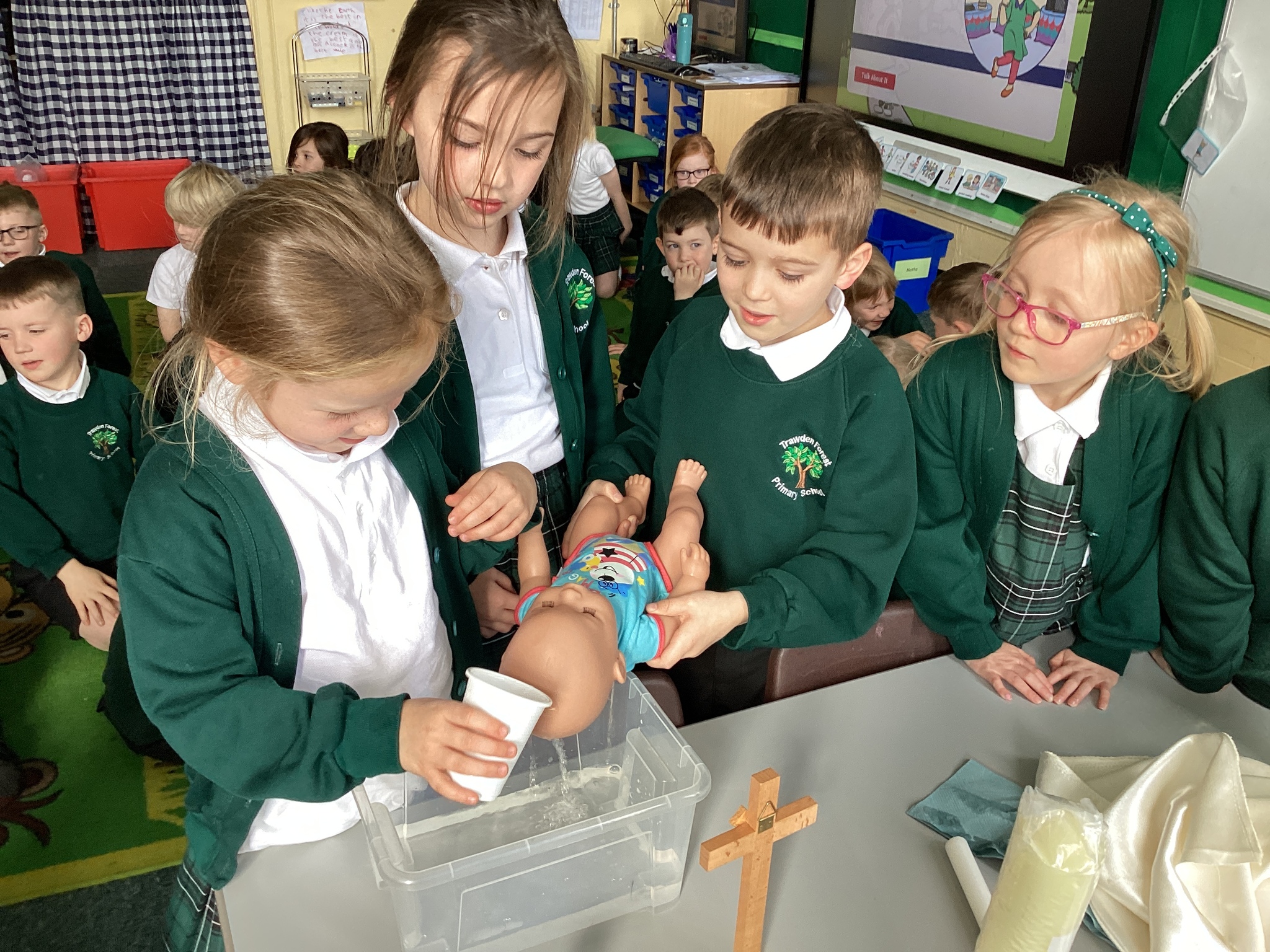 We acted out our own baptisms with parents, priest, godparents and a very well behaved baby. The children did a great job of recognising the symbols used and remembering what to say.