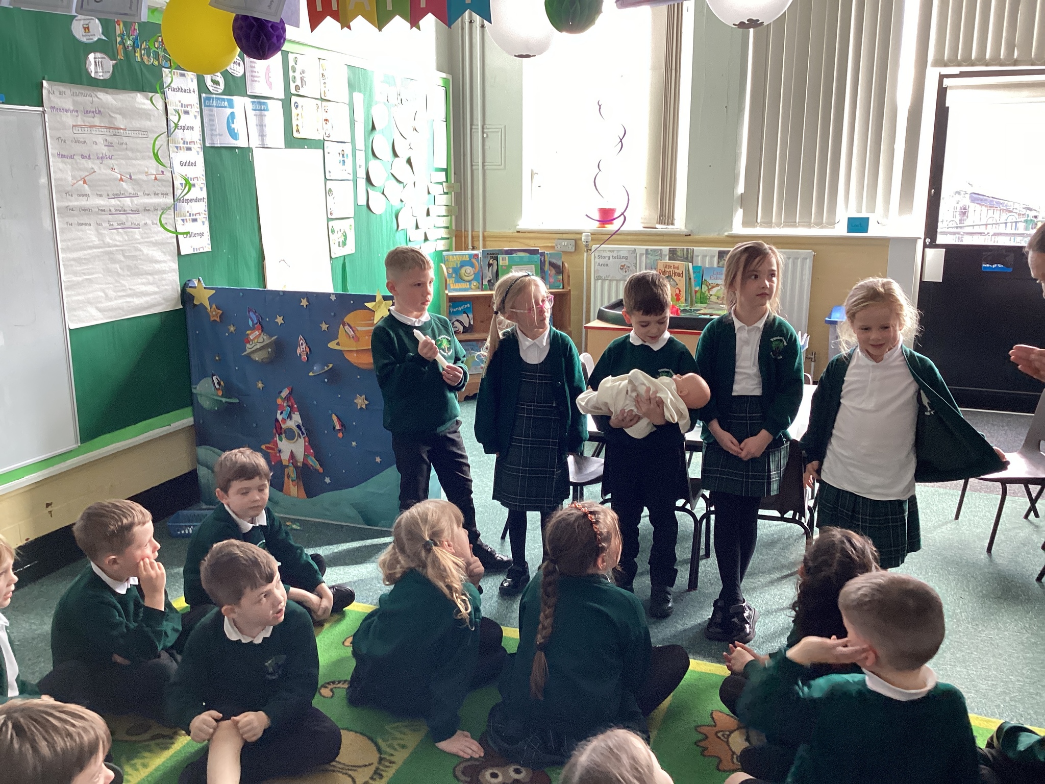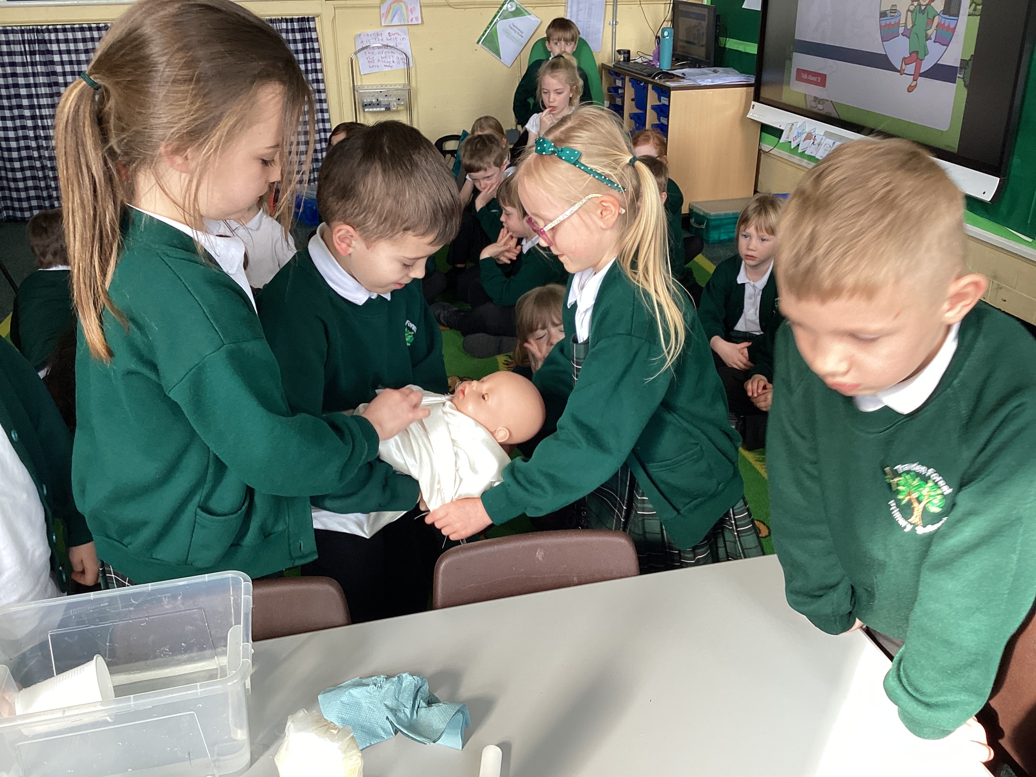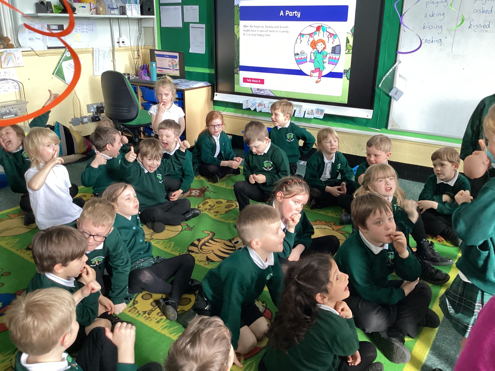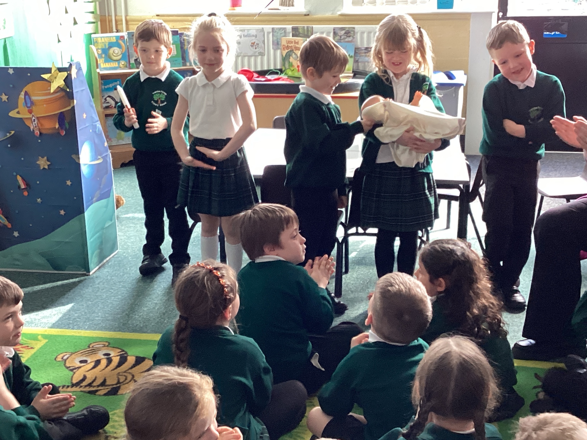 We acted out our own baptisms with parents, priest, godparents and a very well behaved baby. The children did a great job of recognising the symbols used and remembering what to say.