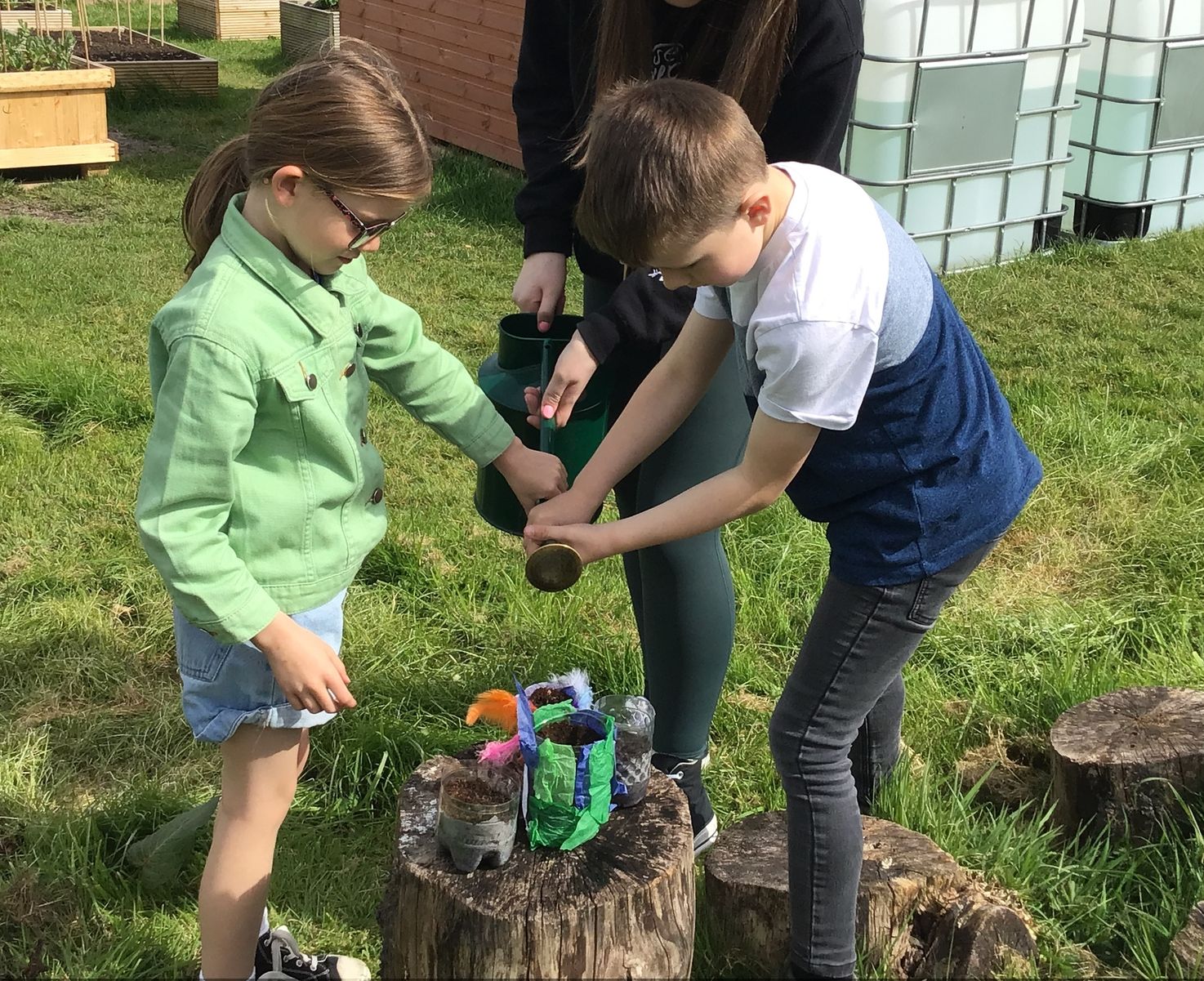 First we cut and decorated the plastic bottles, before taking them up to the field where we filled them with compost, planted sunflower seeds and watered them.