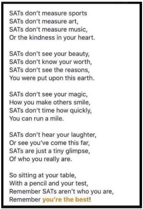 As you gear up for your SATs, we want to take a moment to wish you all the best of luck! We are incredibly proud of the hard work and dedication you’ve shown throughout the year. Your enthusiasm and determination have been truly remarkable, and it's been a joy to teach you and watch you grow. Remember, no matter the outcome, you are all shining stars who bring something special to our school. Keep believing in yourselves, stay calm, and give it your all. We know you'll do brilliantly! Good luck, Year 6 – we’re cheering for you every step of the way! See you on Monday morning from 8.30am for a breakfast boost!