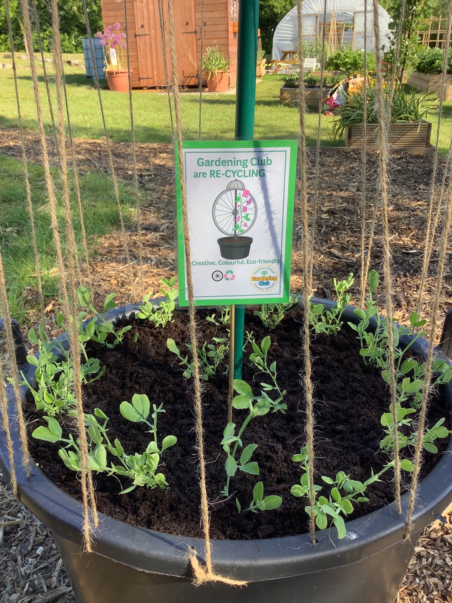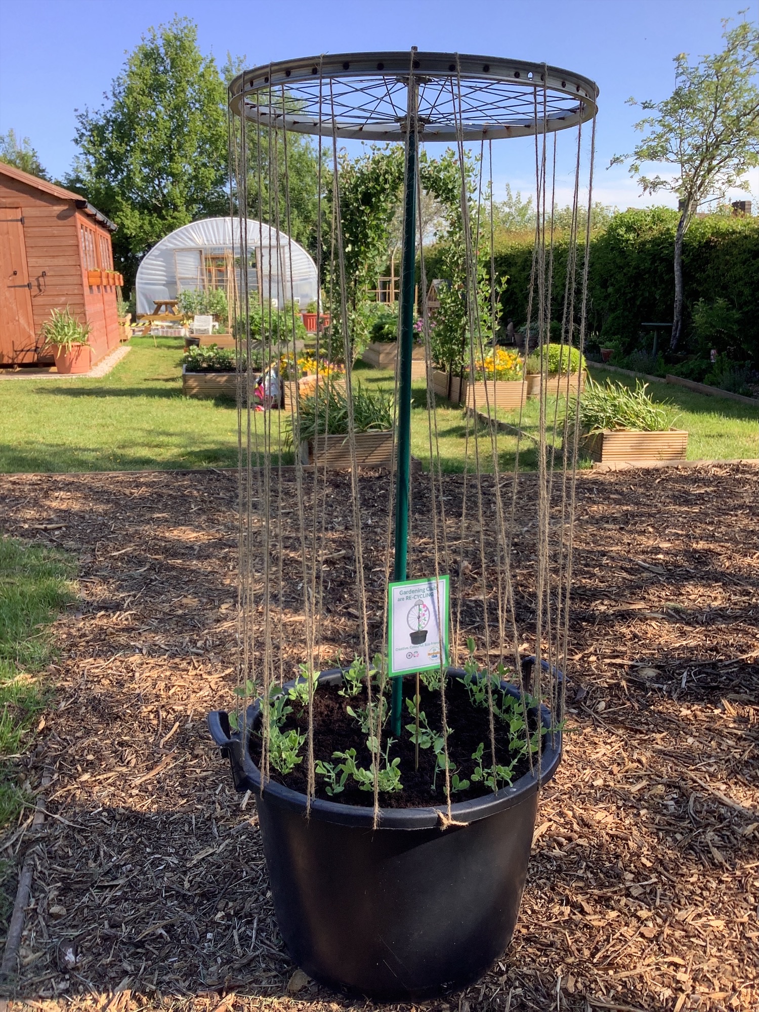 Re-CYCLING! We have repurposed an old bicycle wheel as a creative plant trellis - perfect for our sweet peas to climb!