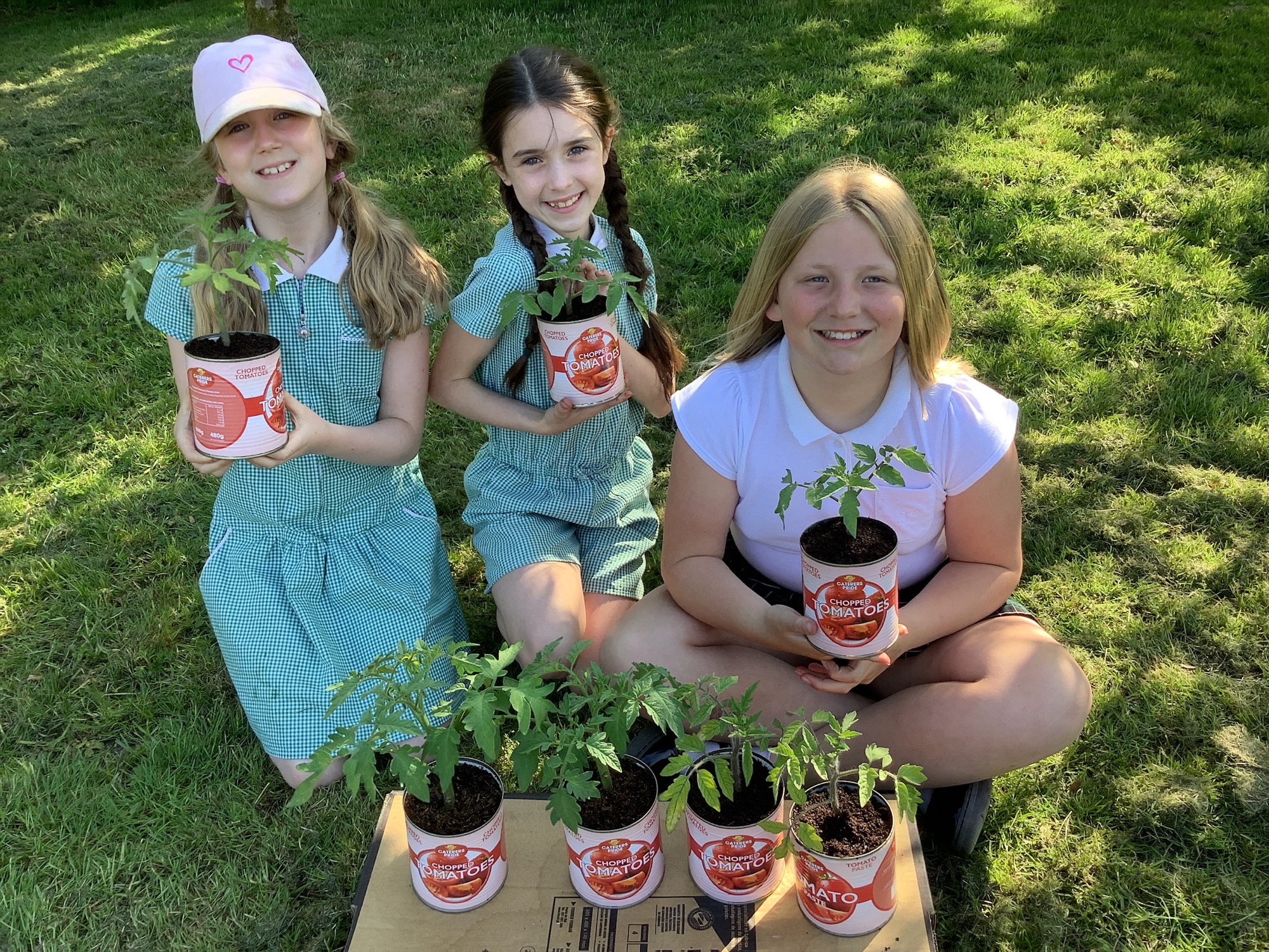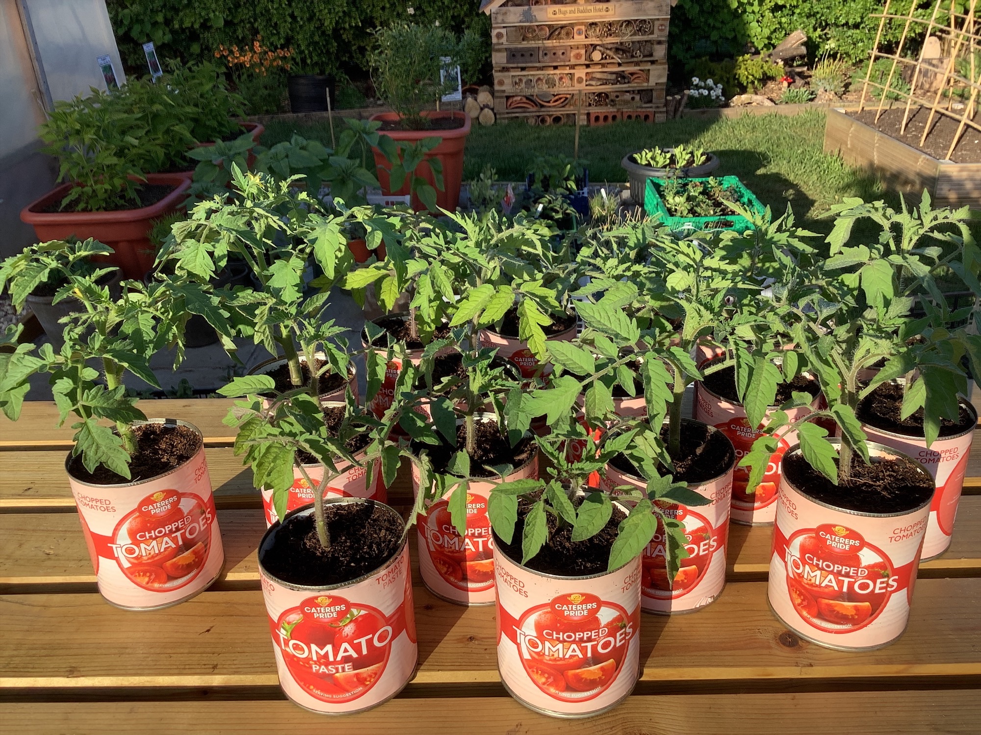 Tomato cans are now home to our growing tomato plants - true 'tinned tomatoes!"