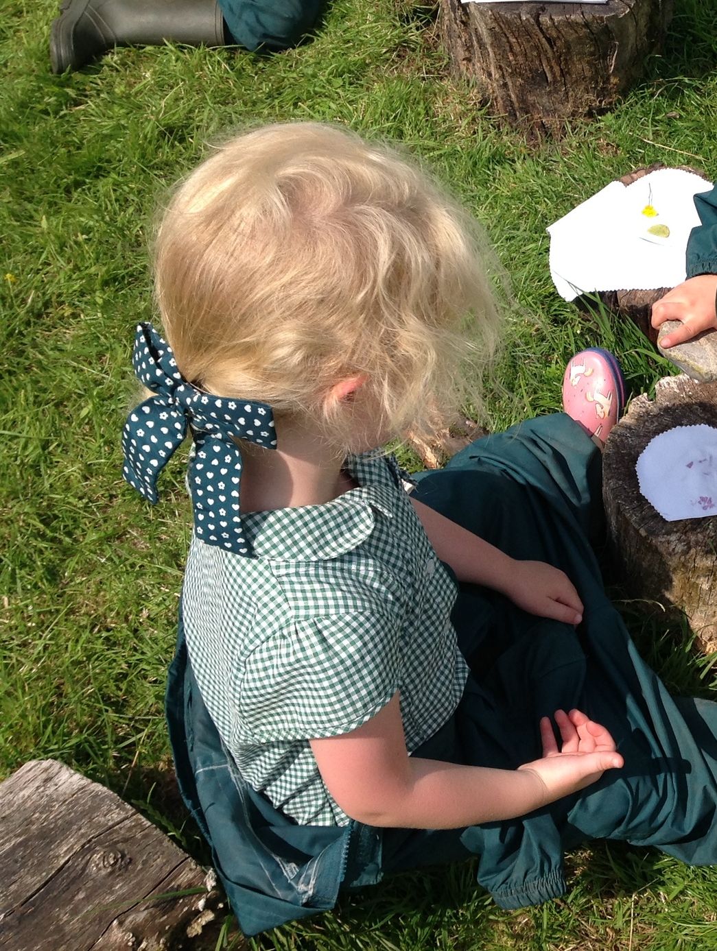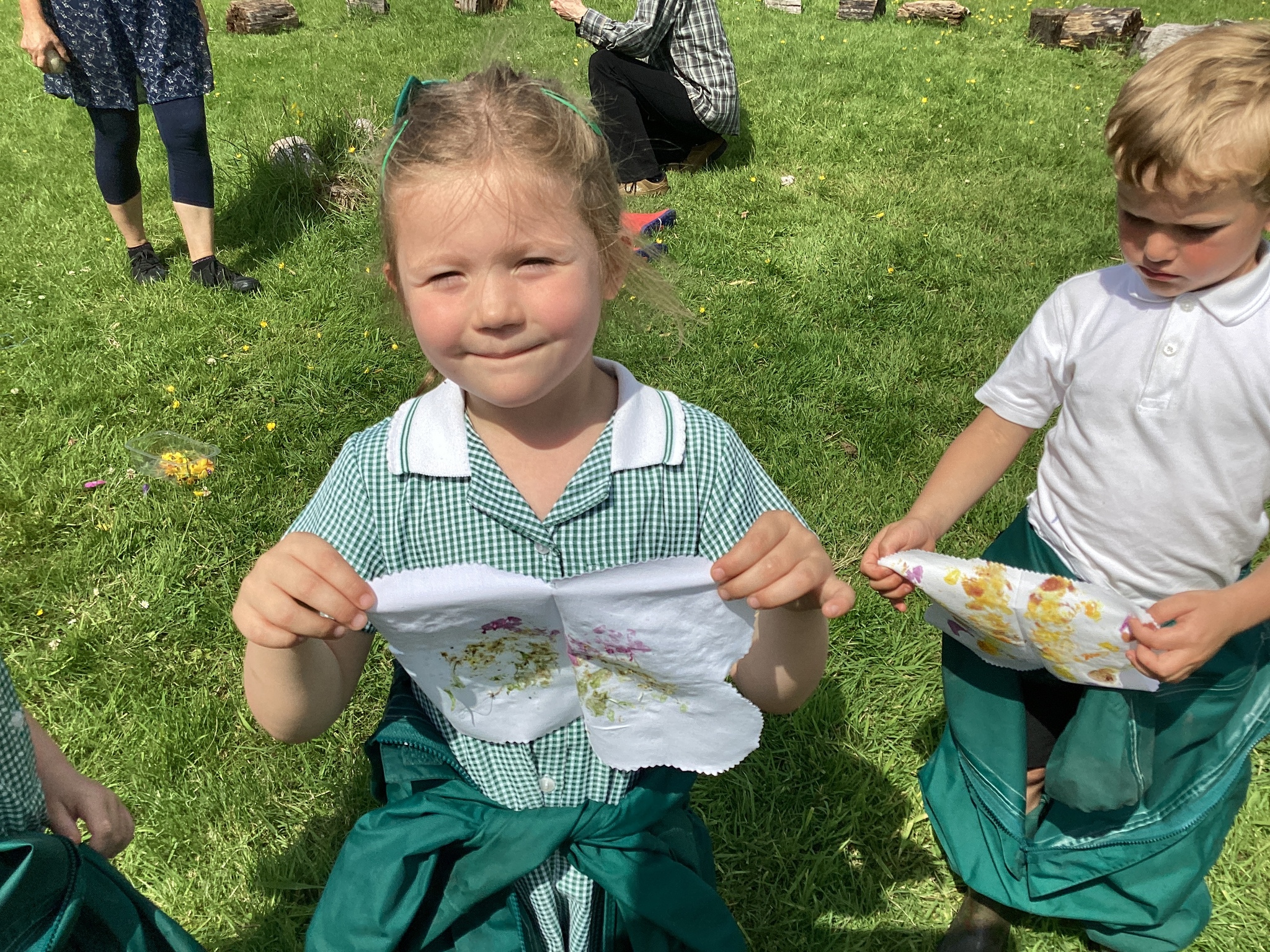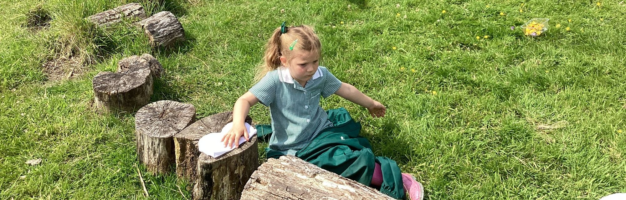 We started by reading the classic story The Very Hungry Caterpillar, which inspired our creative activity. The children then ventured out onto the field to collect natural materials like leaves, grass, flowers, and even some dead-headed blooms from the garden.