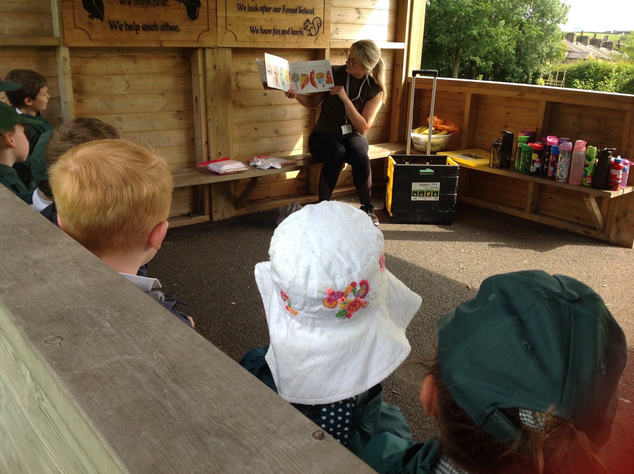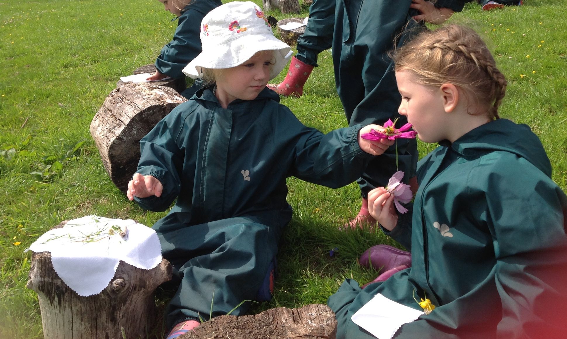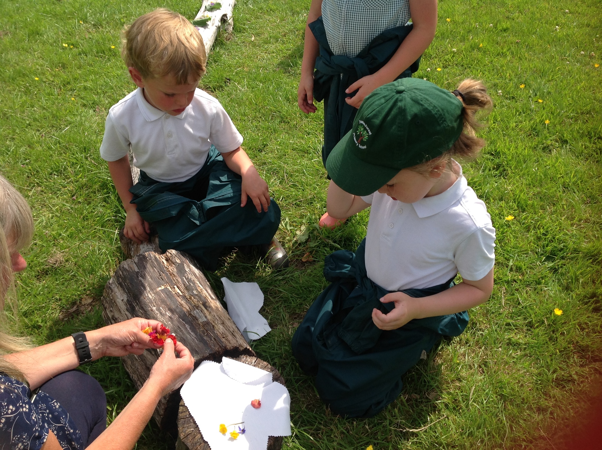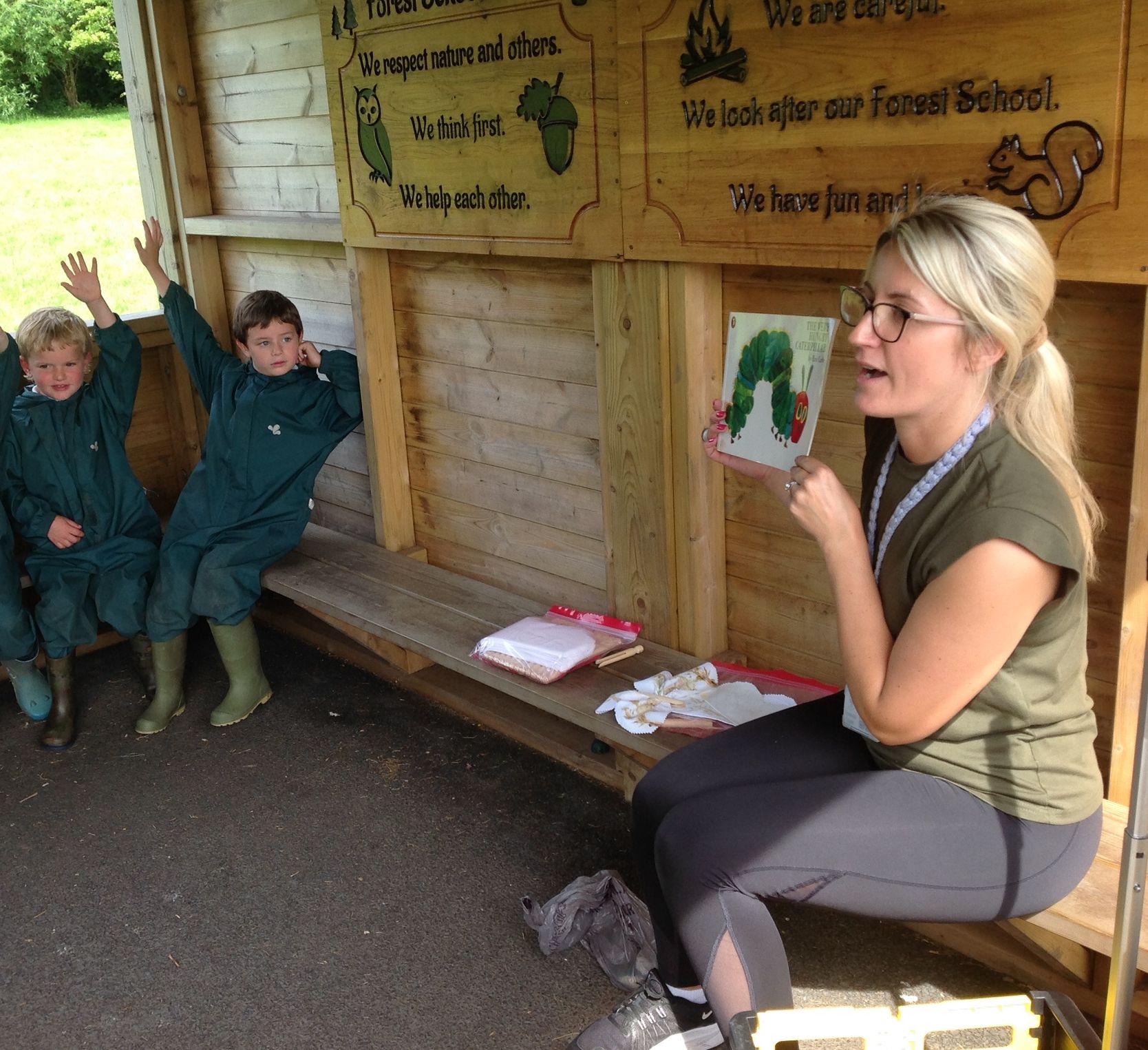 We started by reading the classic story The Very Hungry Caterpillar, which inspired our creative activity. The children then ventured out onto the field to collect natural materials like leaves, grass, flowers, and even some dead-headed blooms from the garden.