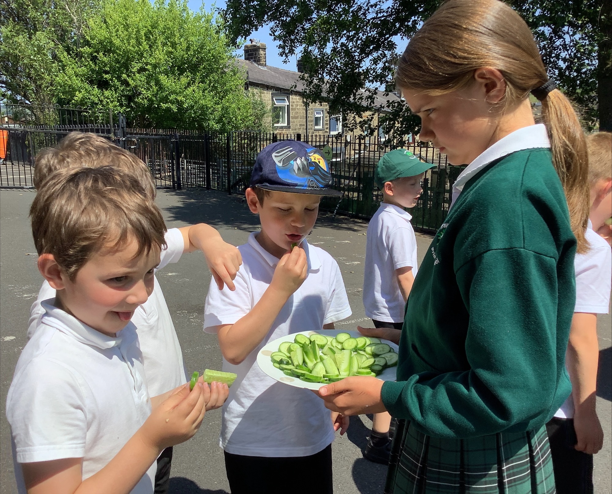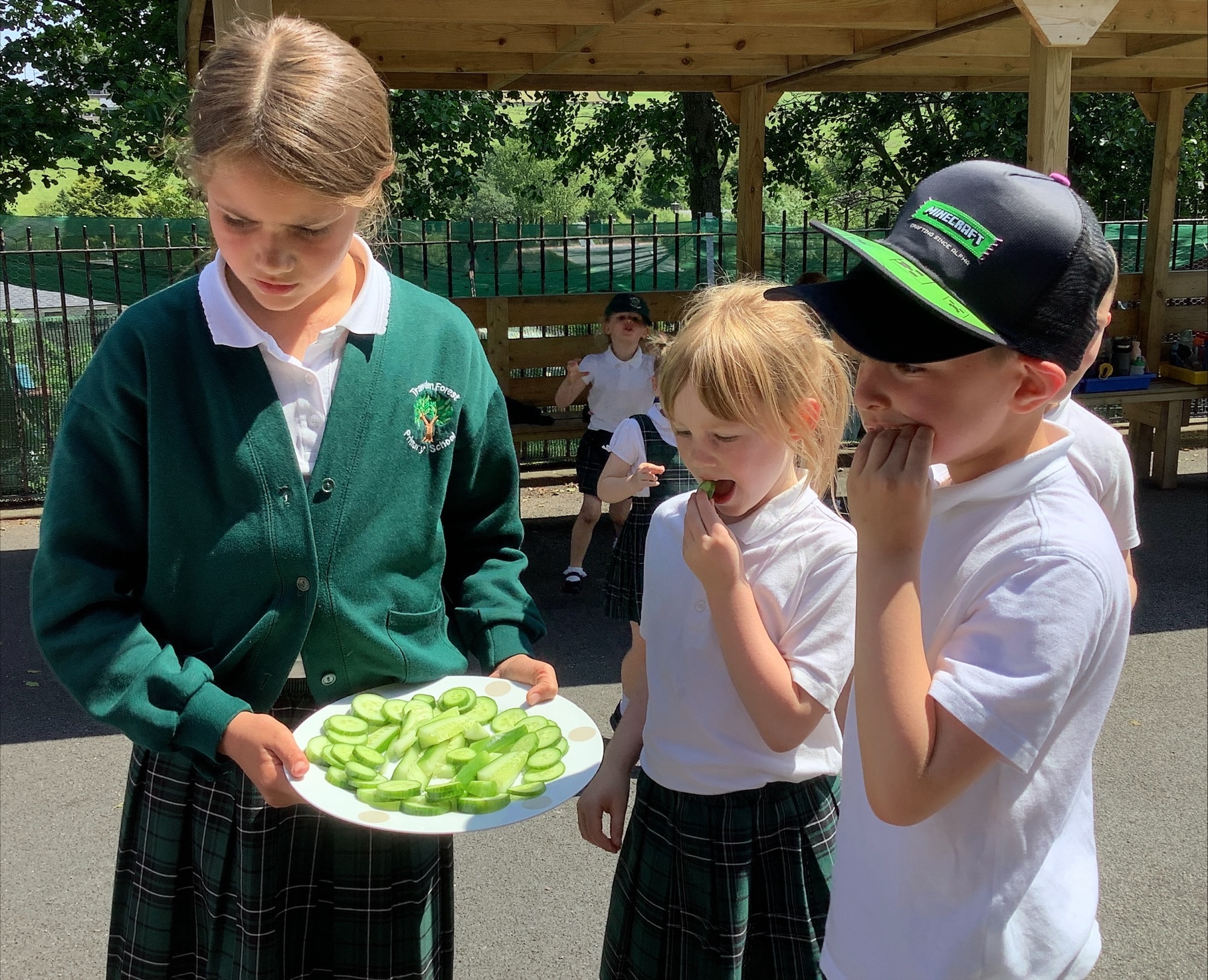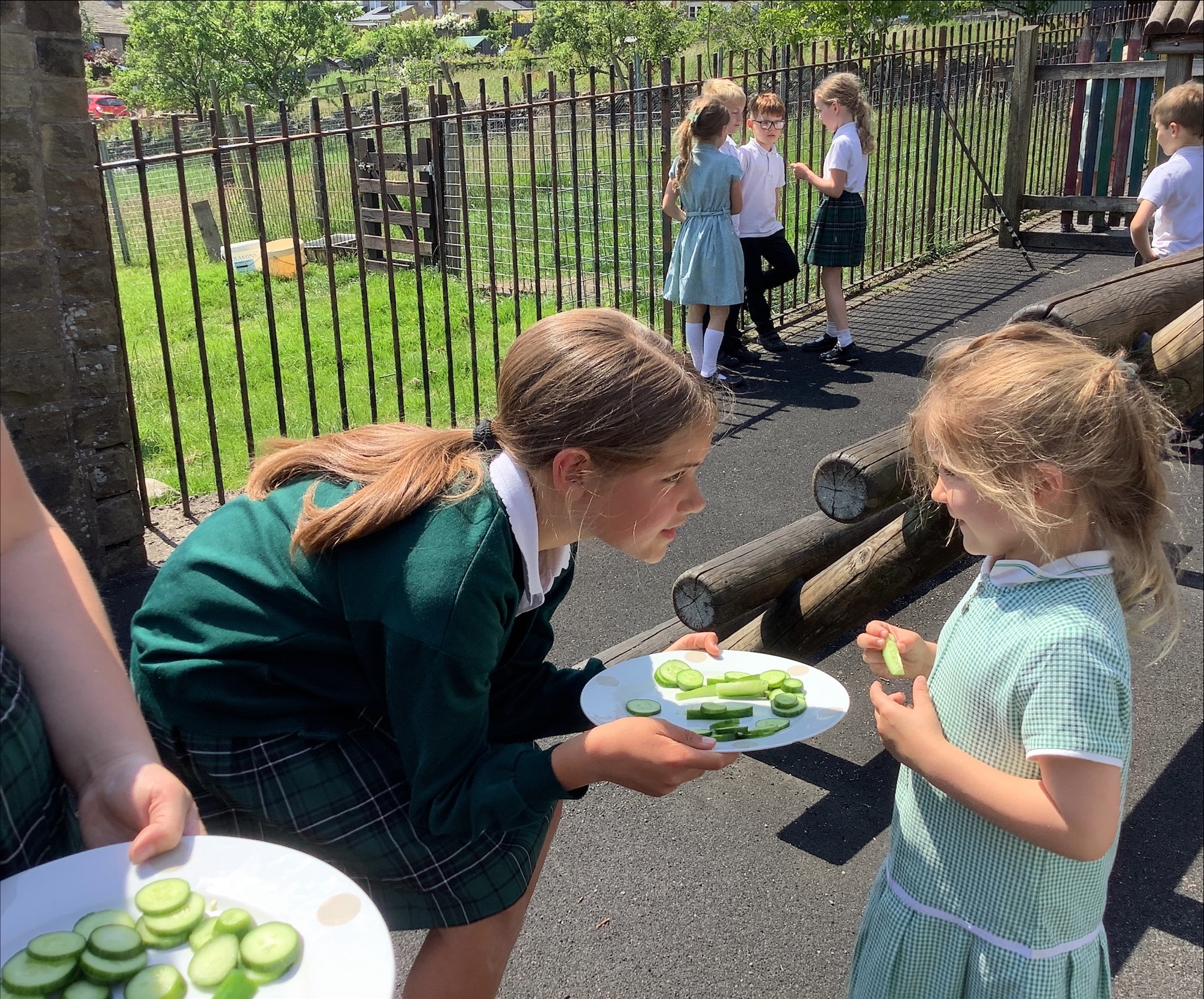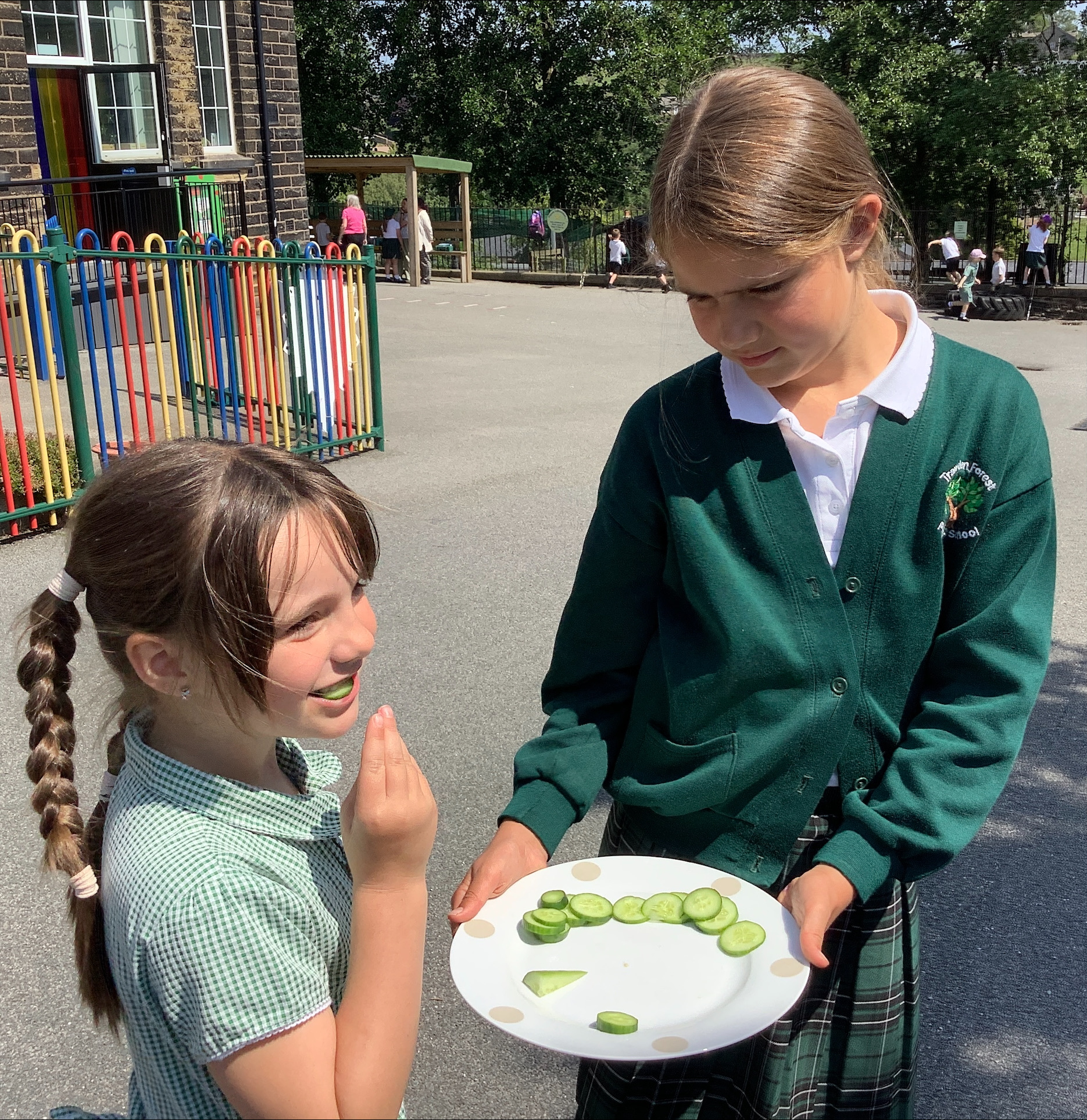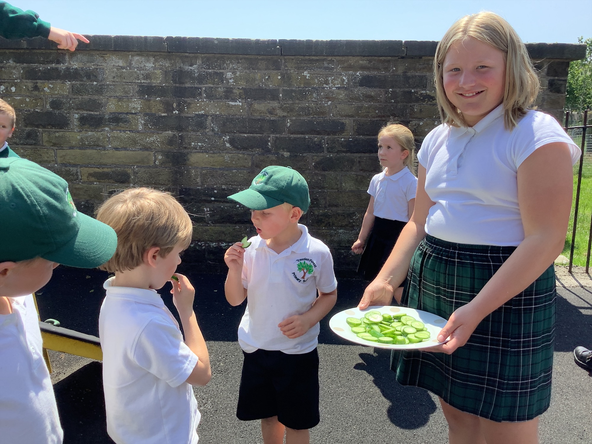 After all their hard work growing from seed and tending the plants, some of our gardeners got busy slicing up the harvest and taking the cucumbers around the school yard at breaktime for everyone to try.