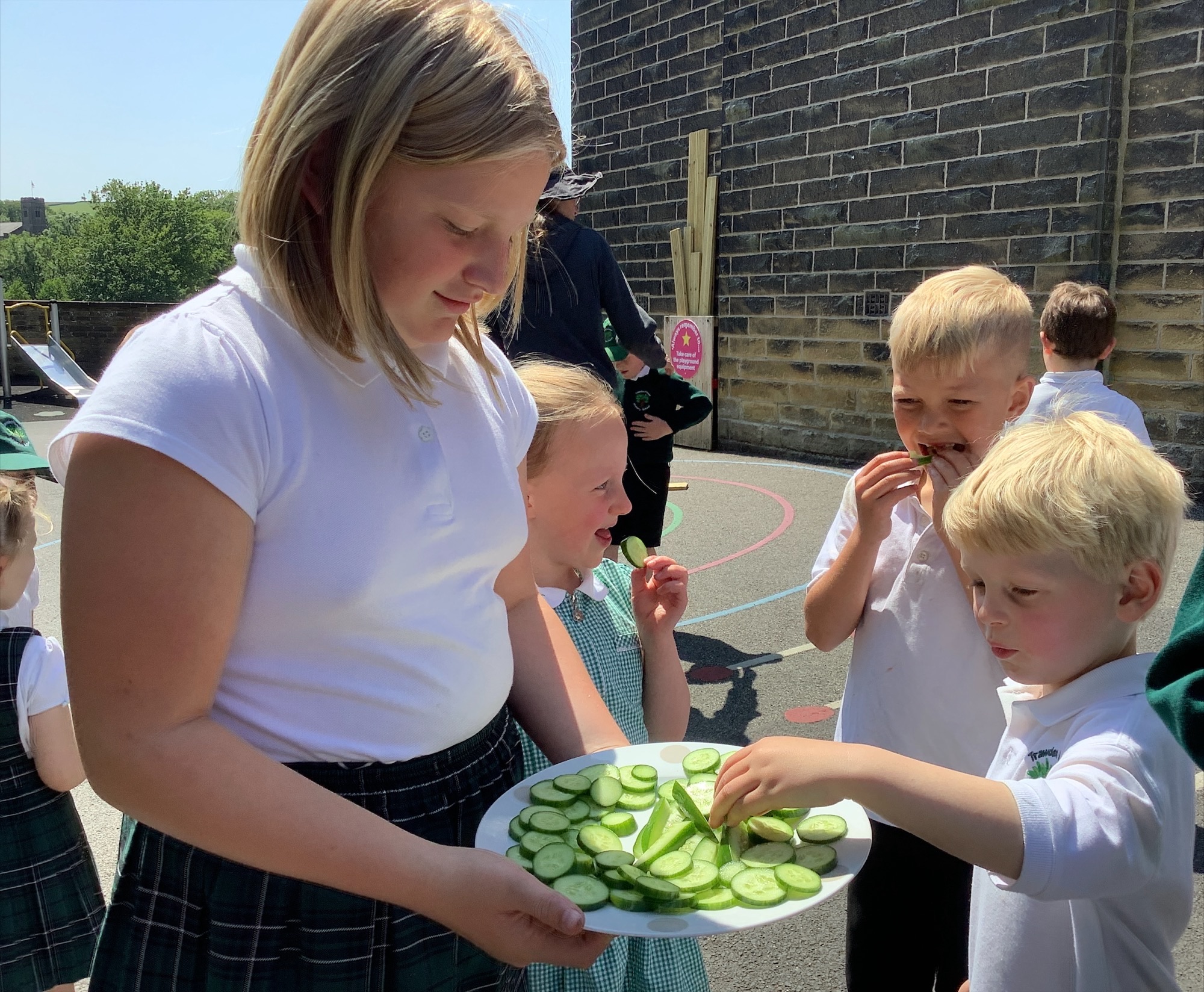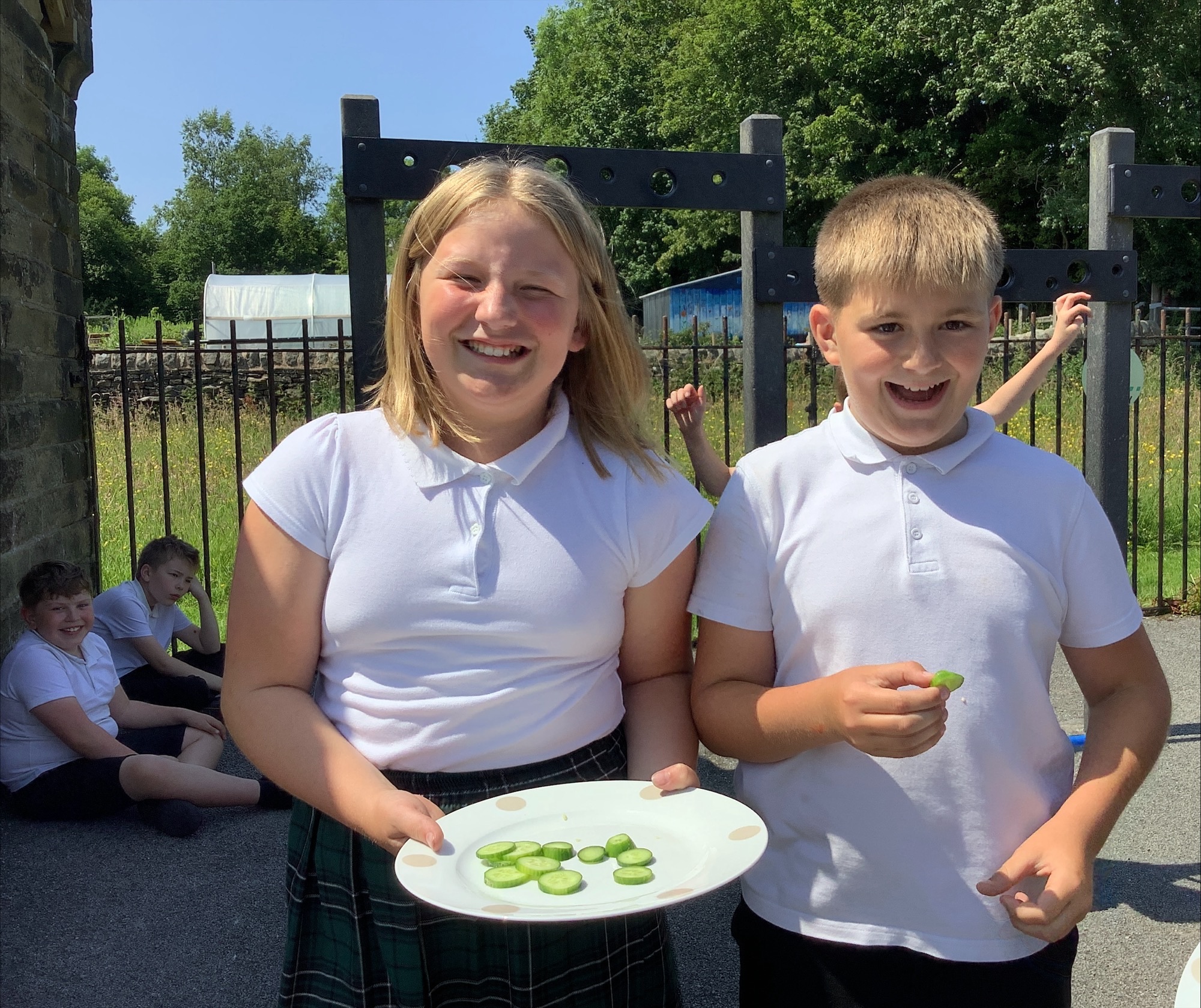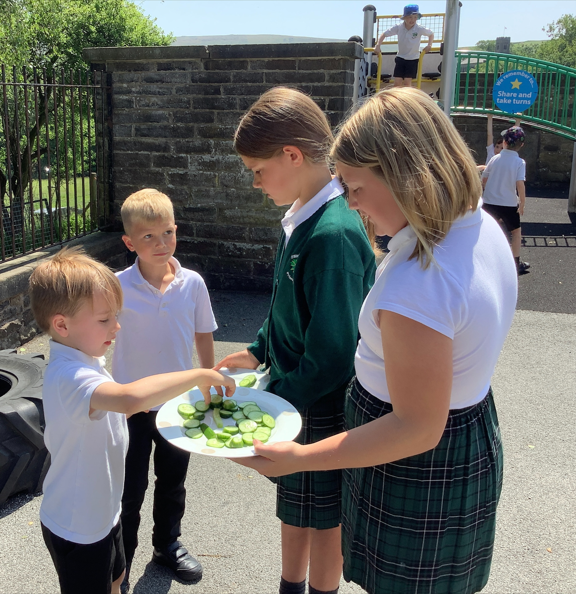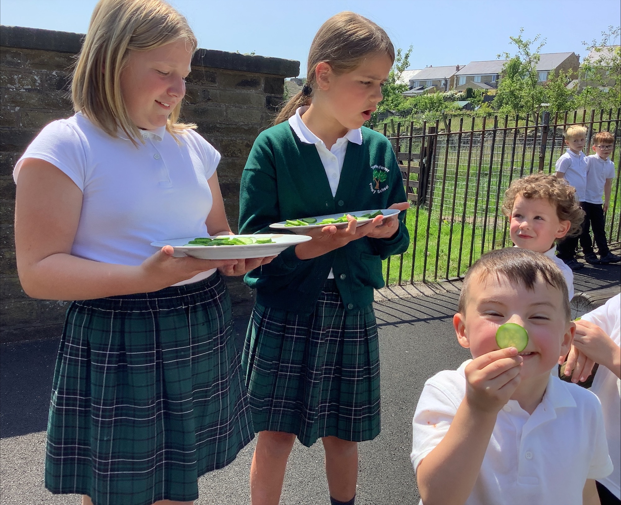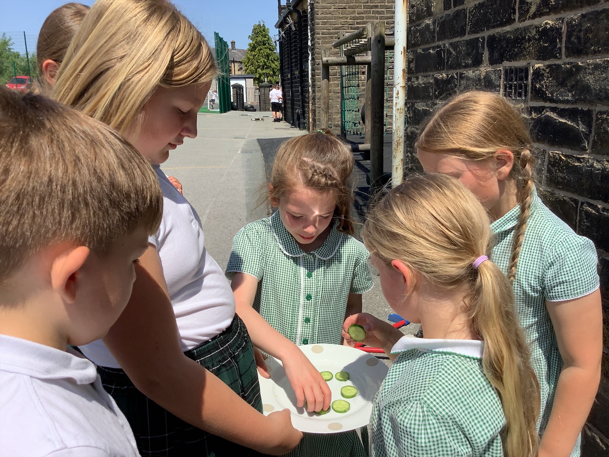 After all their hard work growing from seed and tending the plants, some of our gardeners got busy slicing up the harvest and taking the cucumbers around the school yard at breaktime for everyone to try.