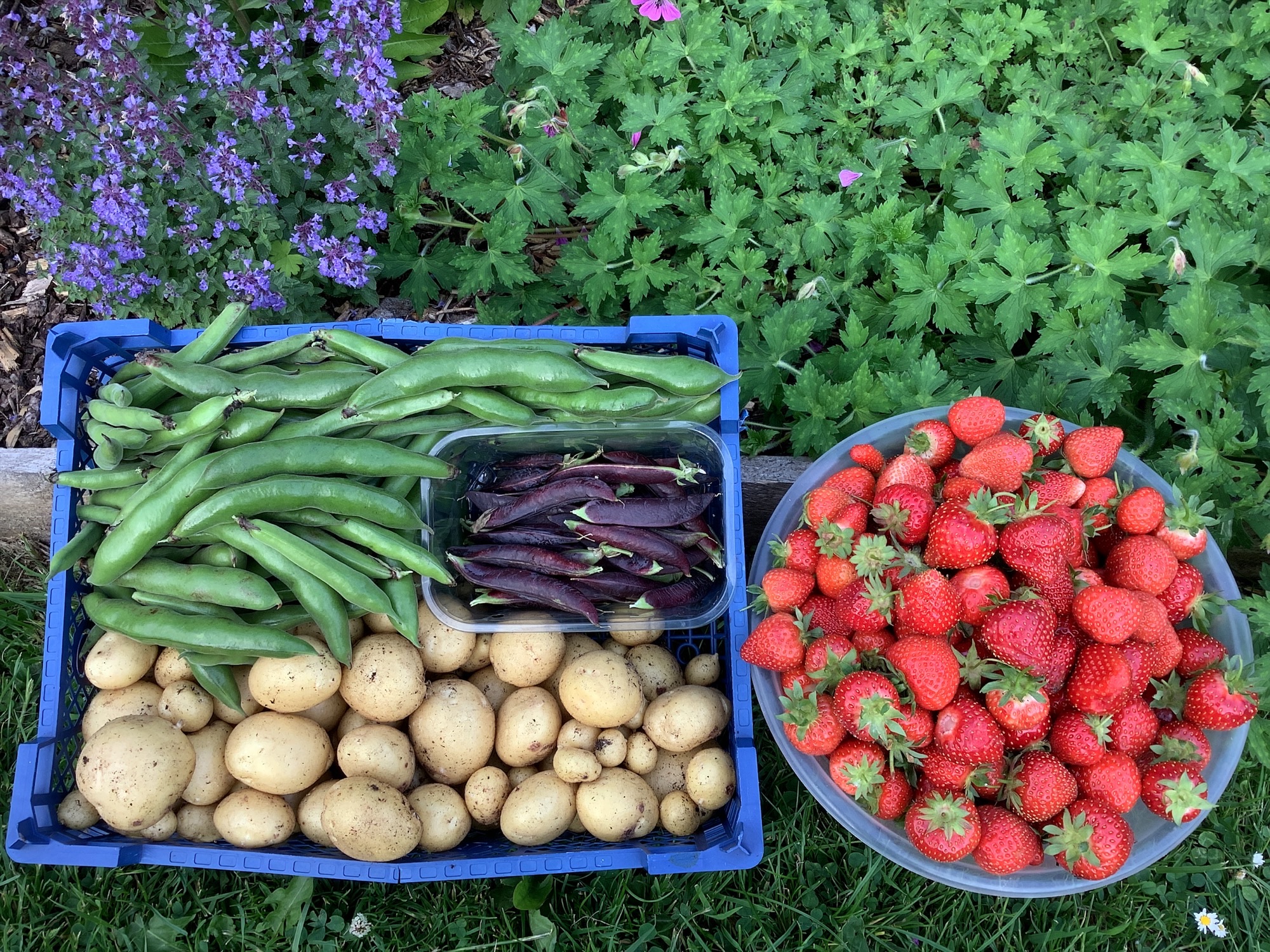 This week’s harvest included a fabulous crop of broad beans, purple podded peas, new potatoes, and juicy strawberries.