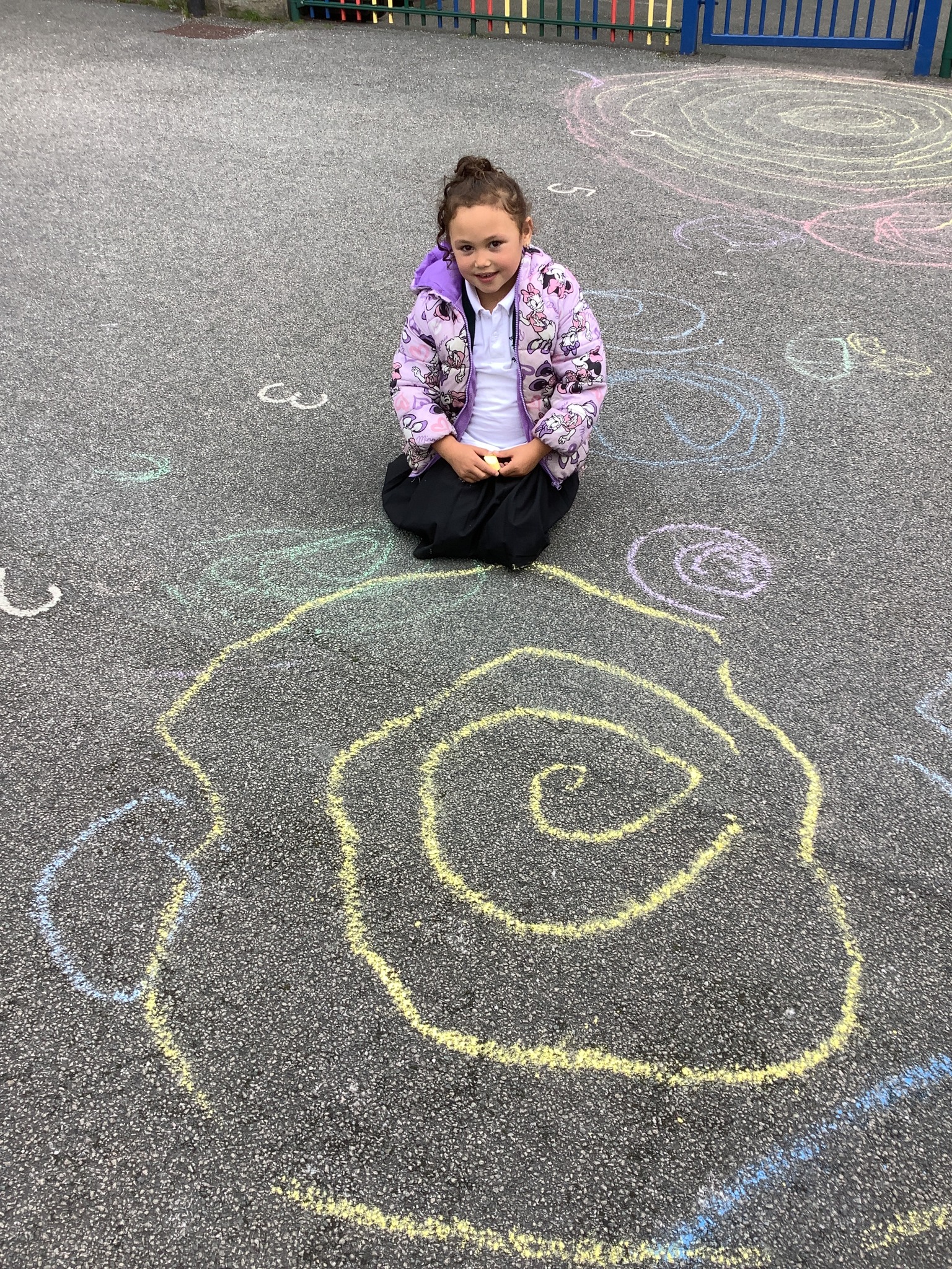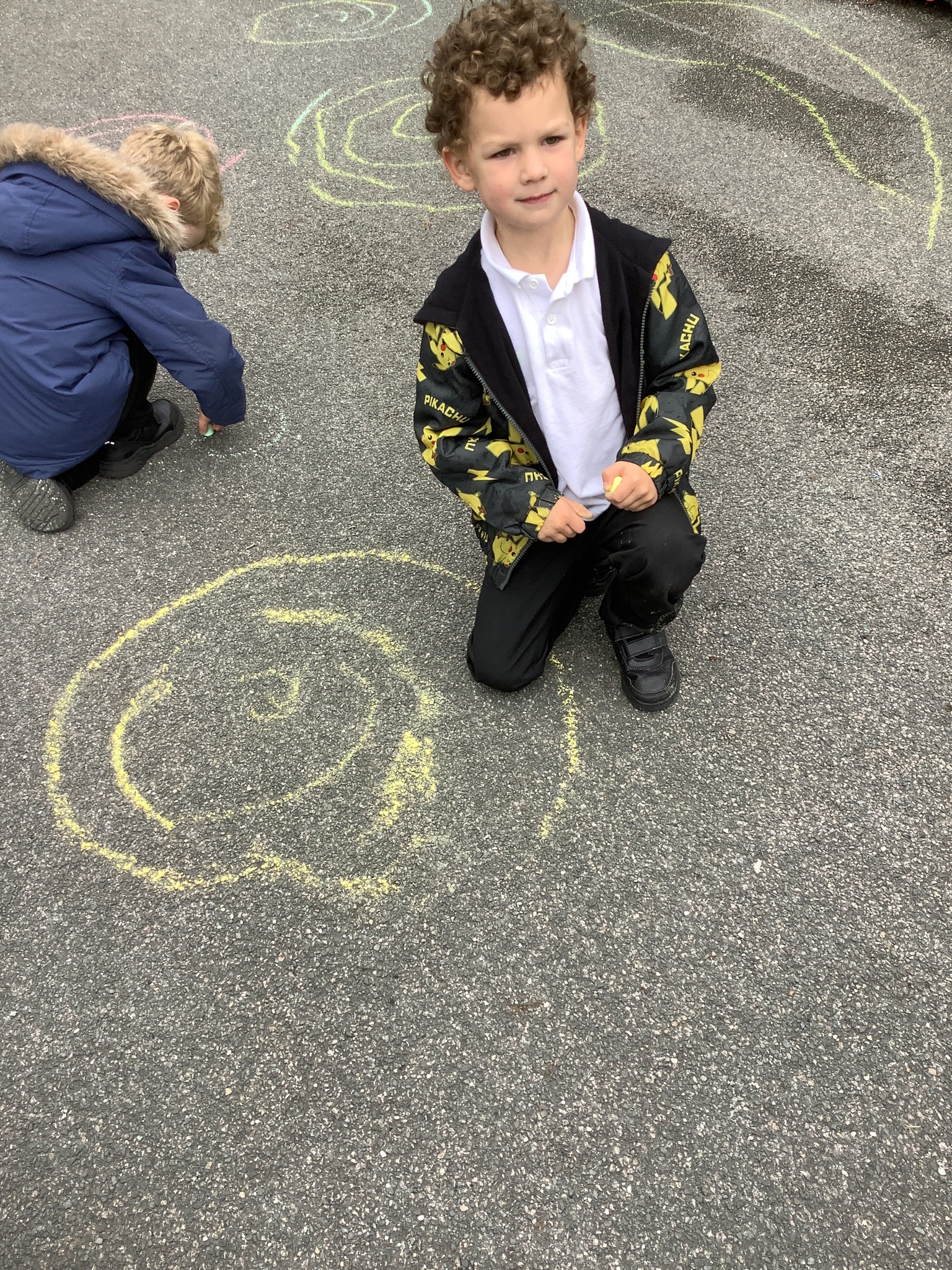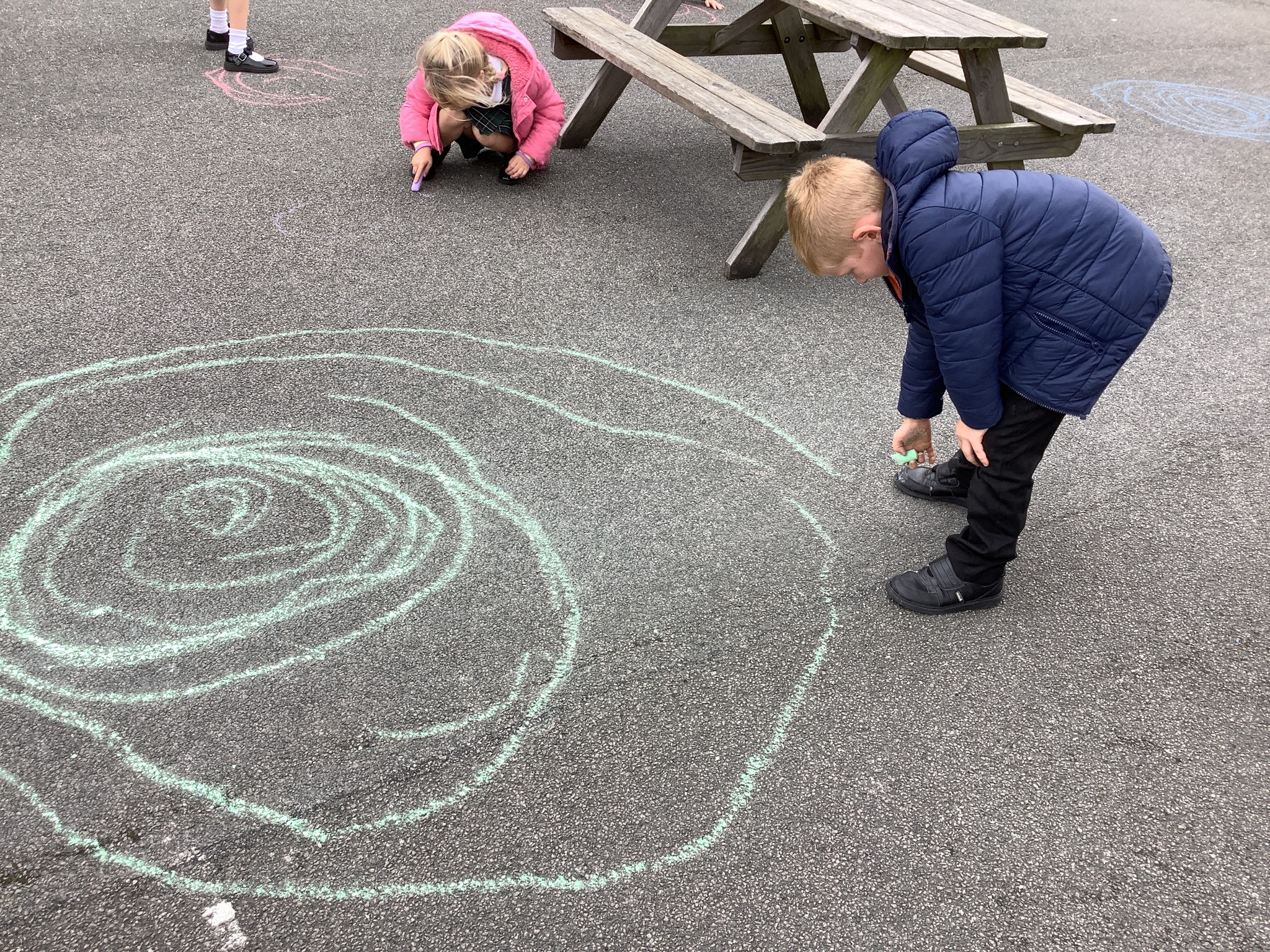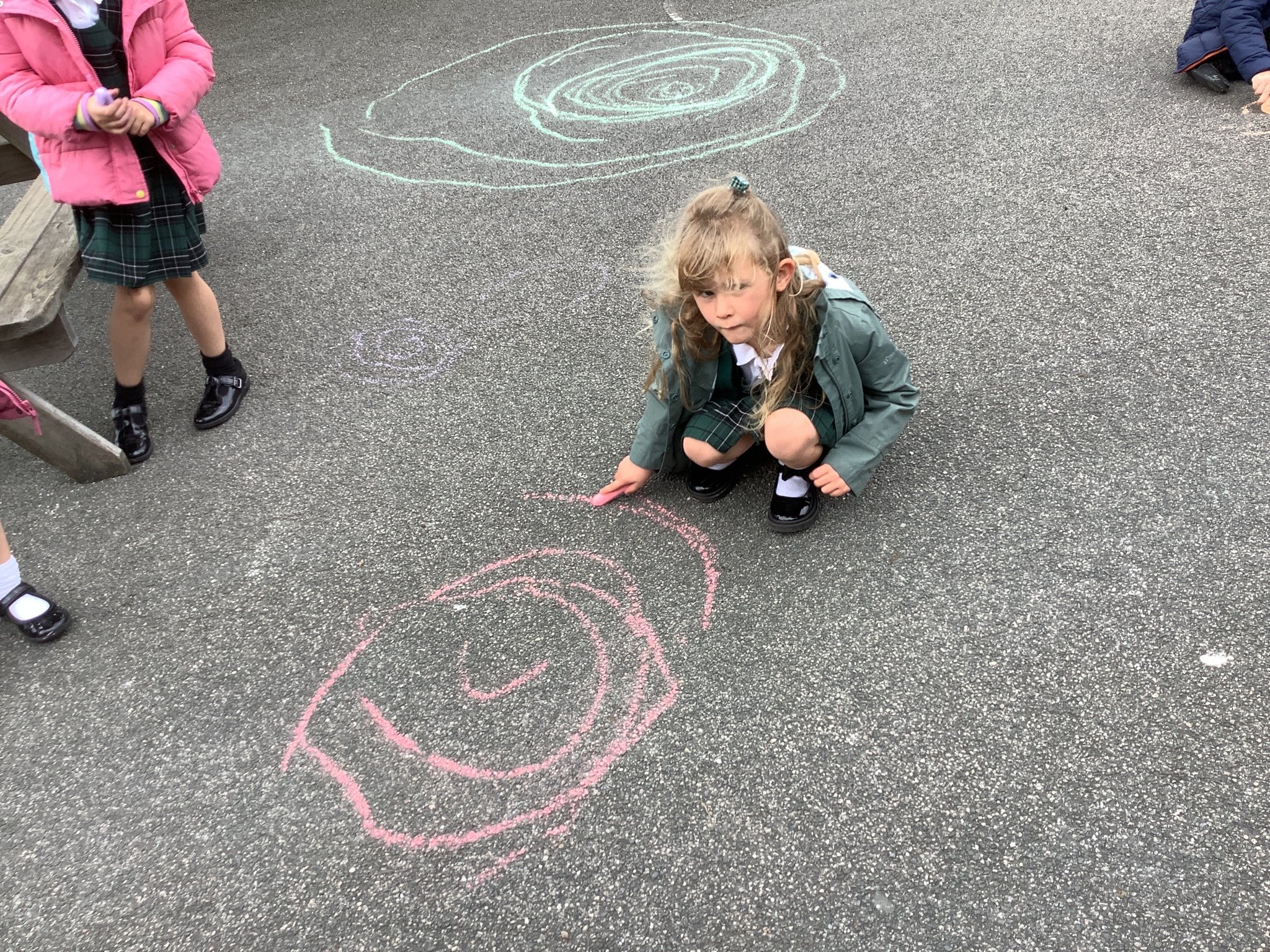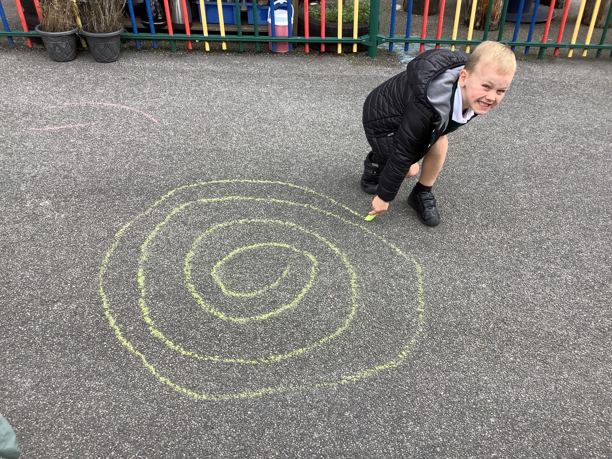 The children created small spirals on drawing paper at tables using a range of colours, large spirals using highlighters on large pieces of paper on the floor and enormous spirals with chalk on the playground.