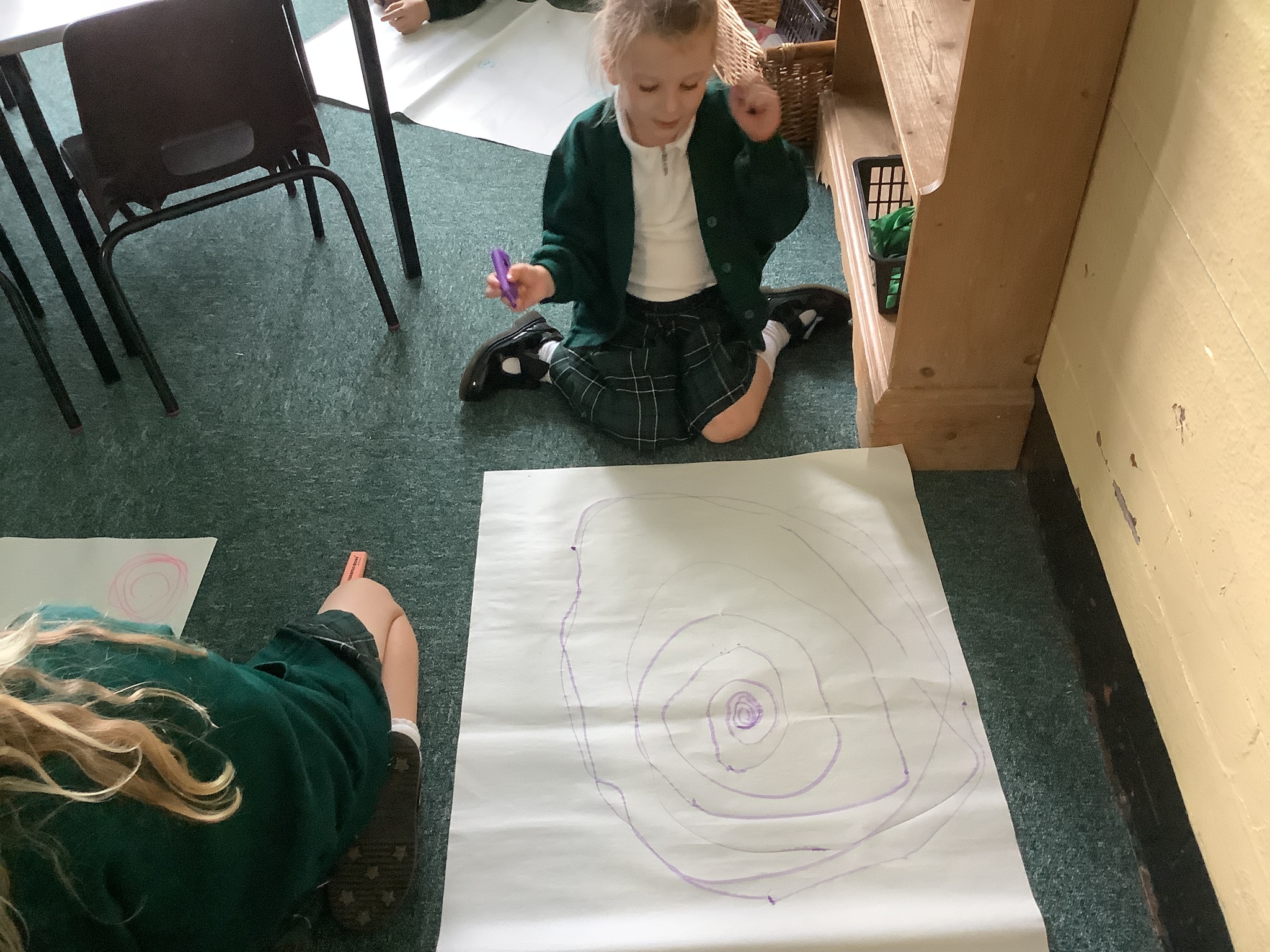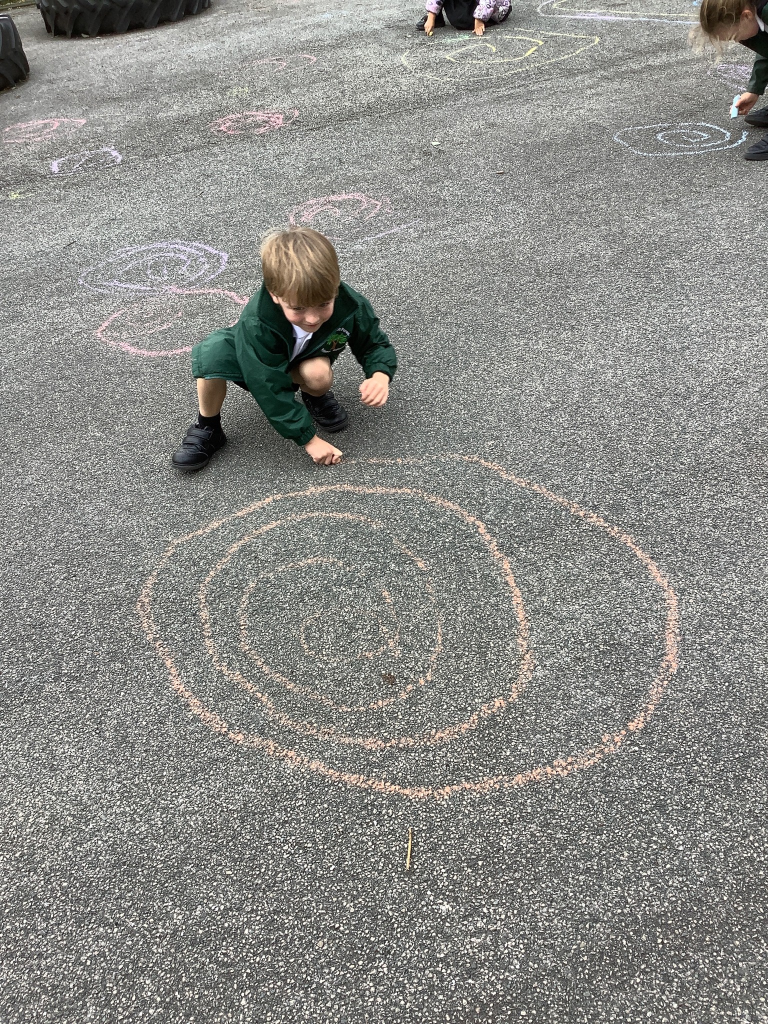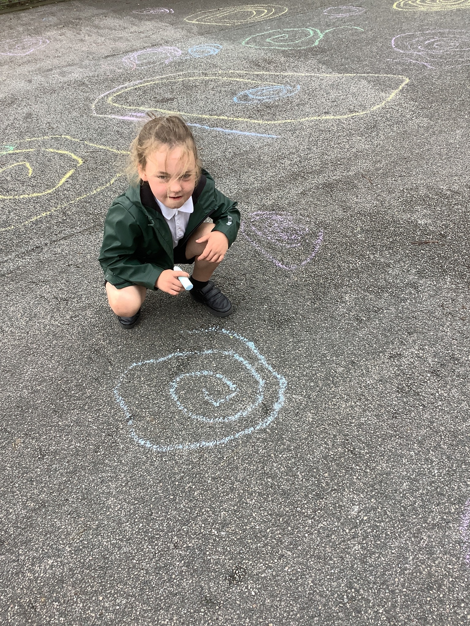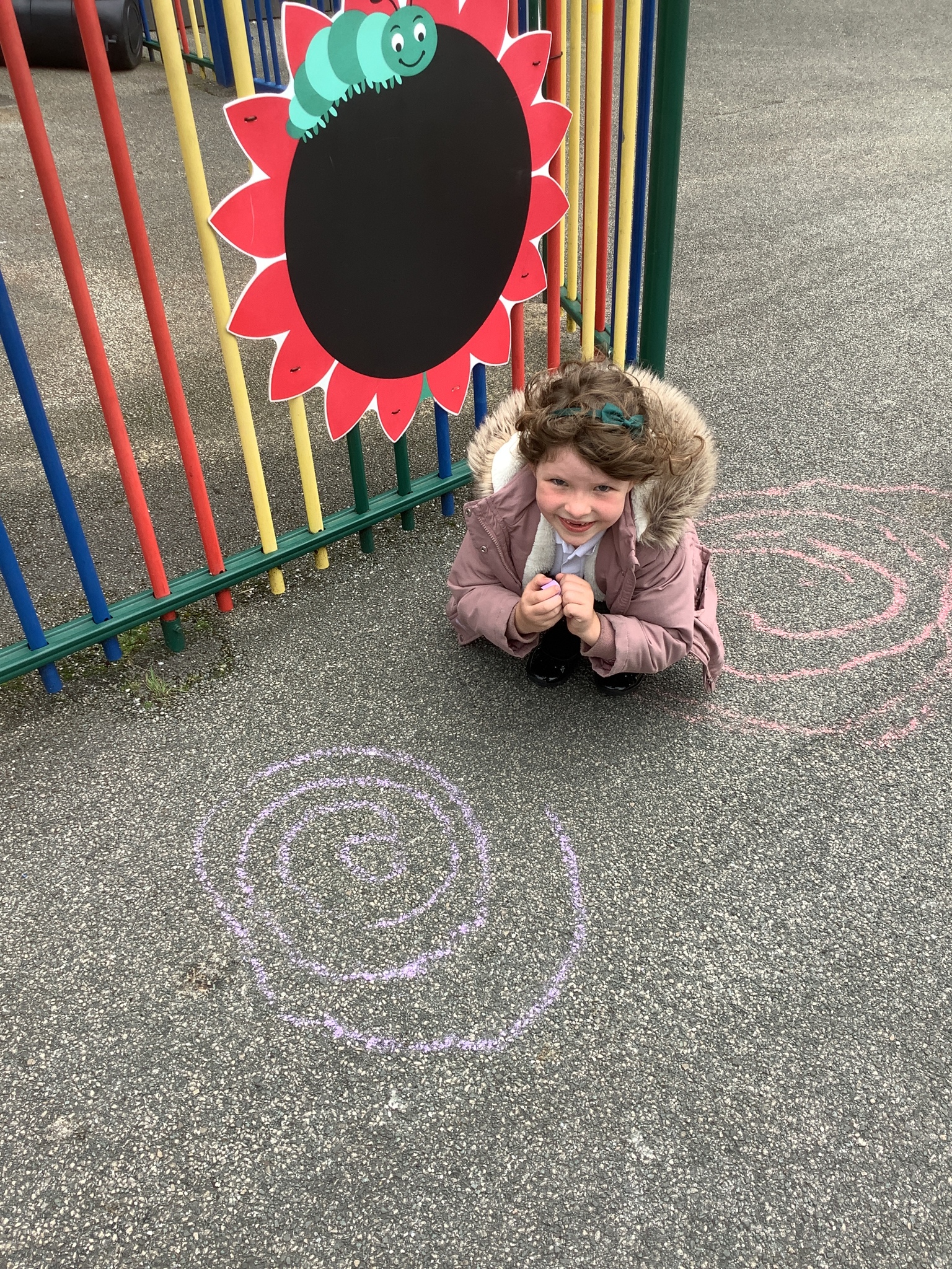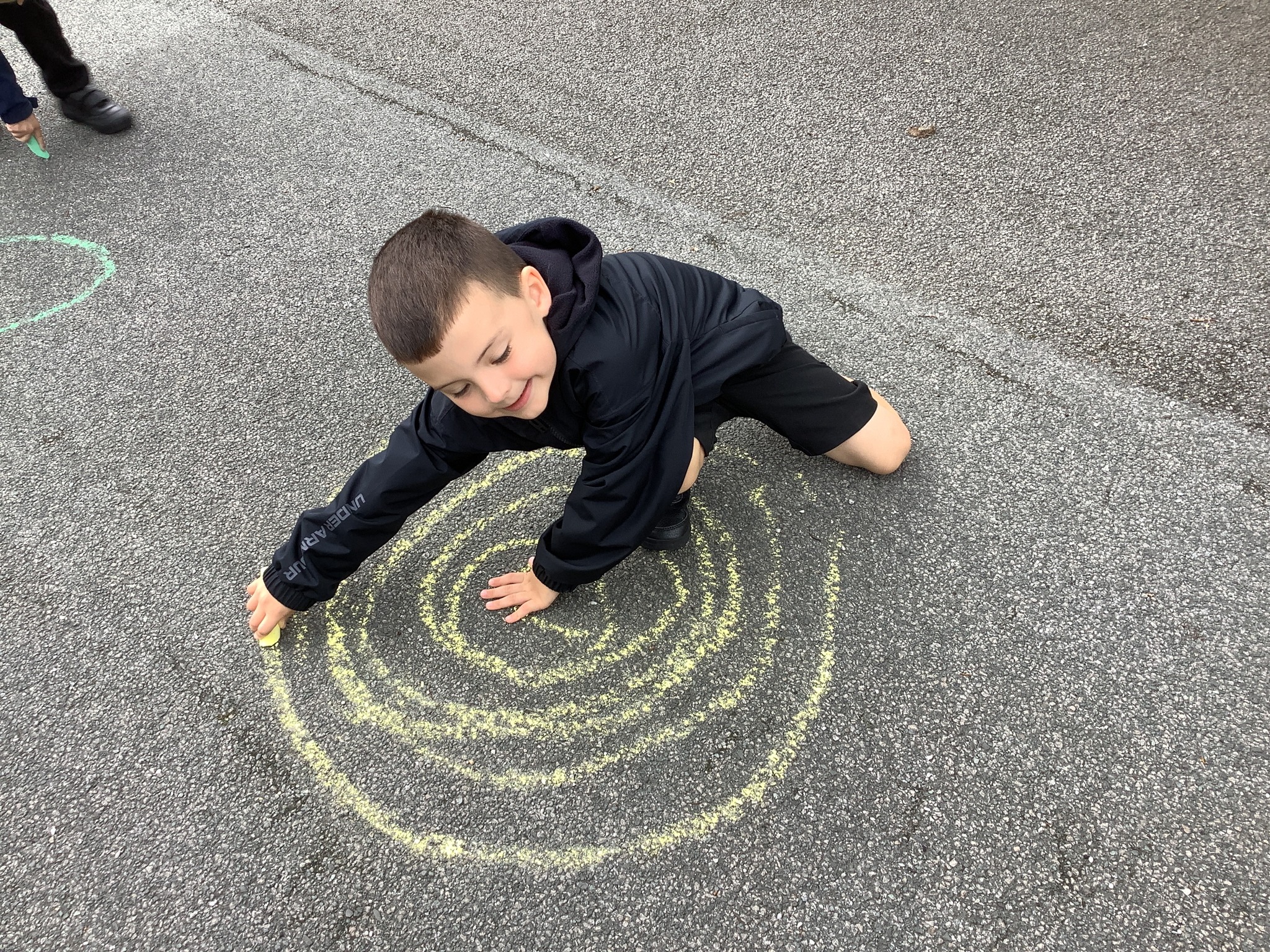 The children created small spirals on drawing paper at tables using a range of colours, large spirals using highlighters on large pieces of paper on the floor and enormous spirals with chalk on the playground.