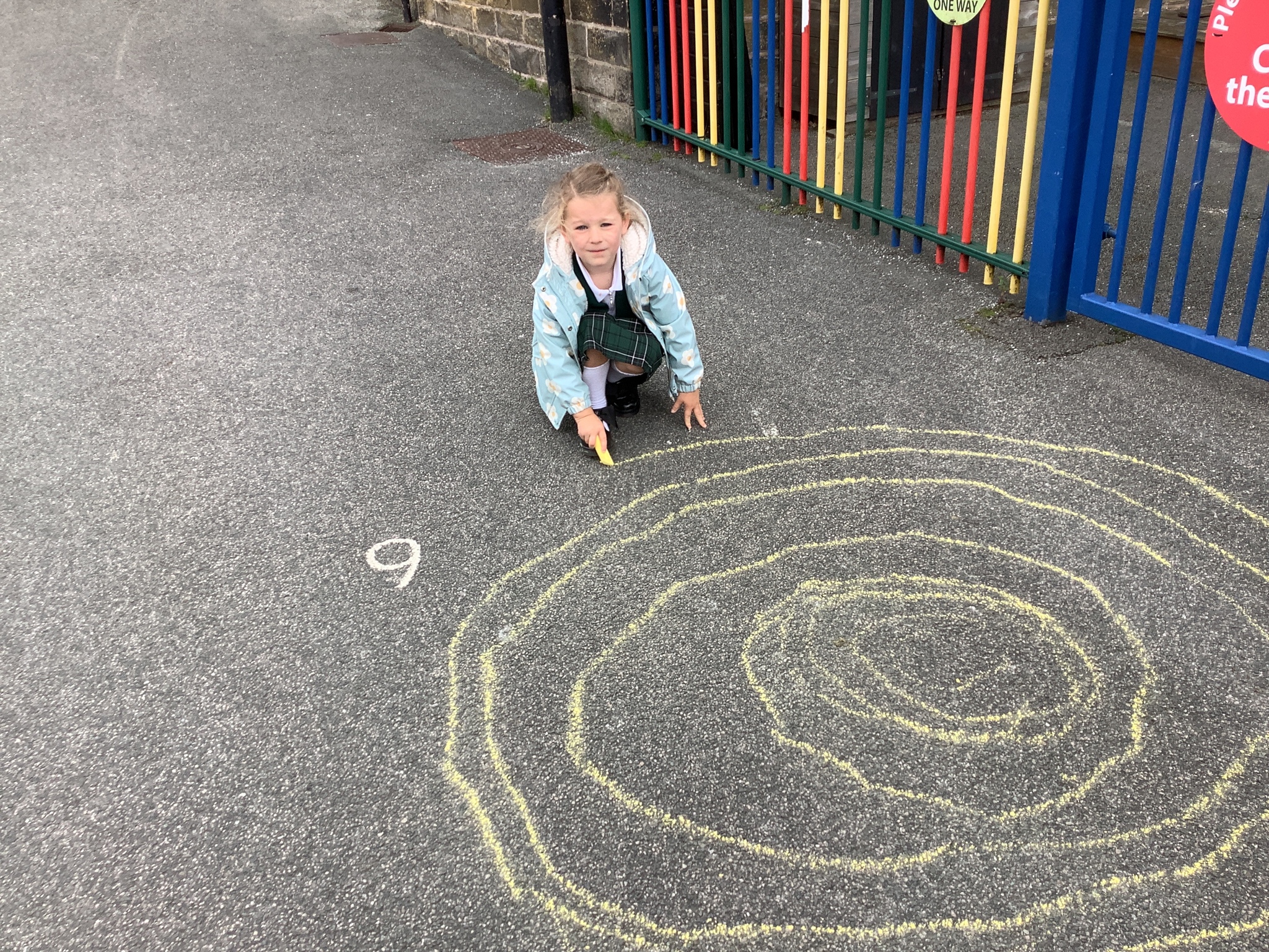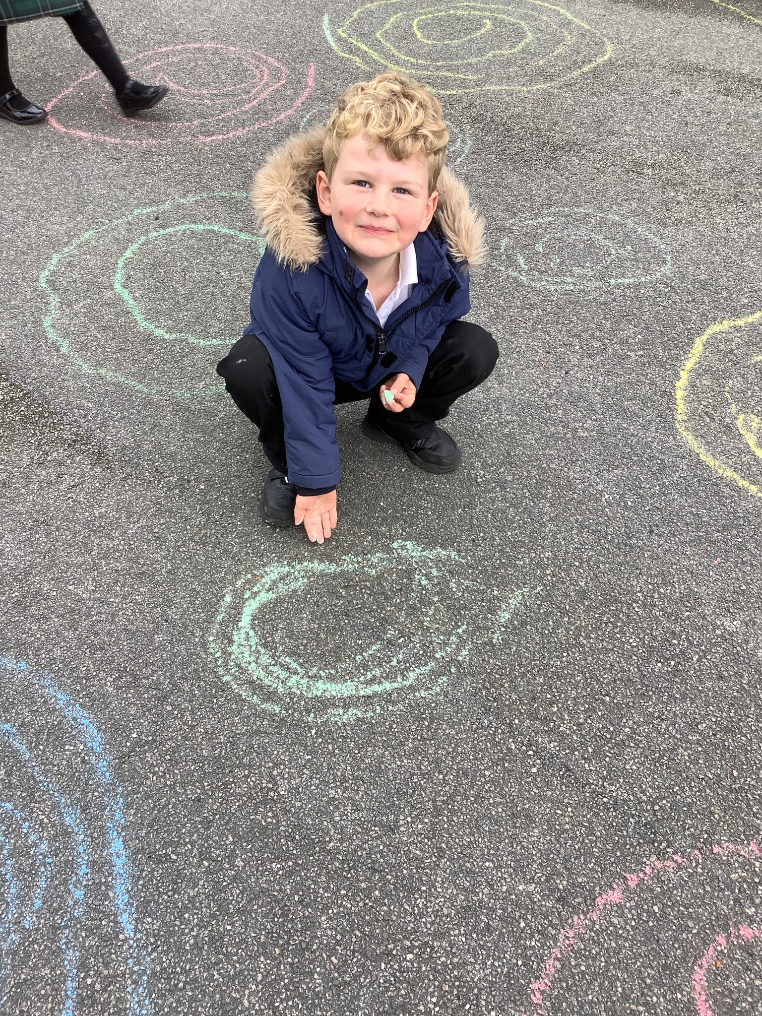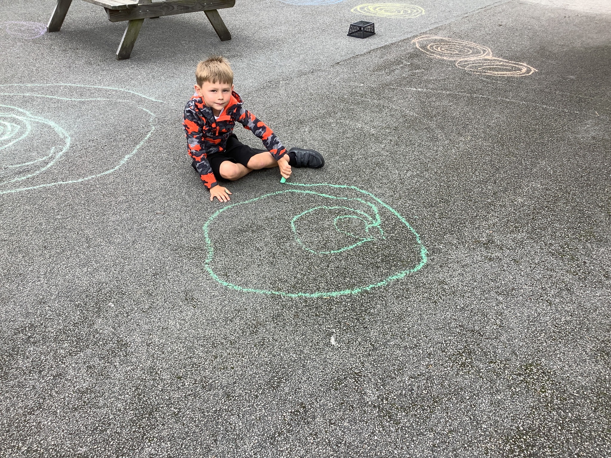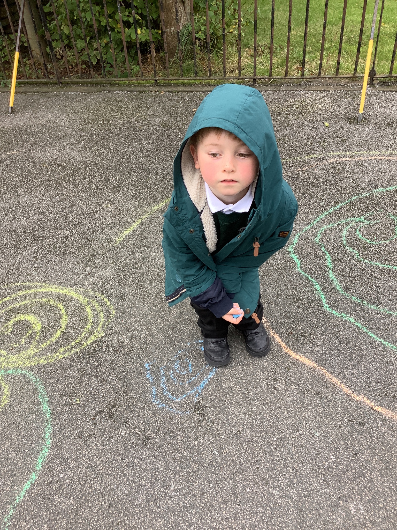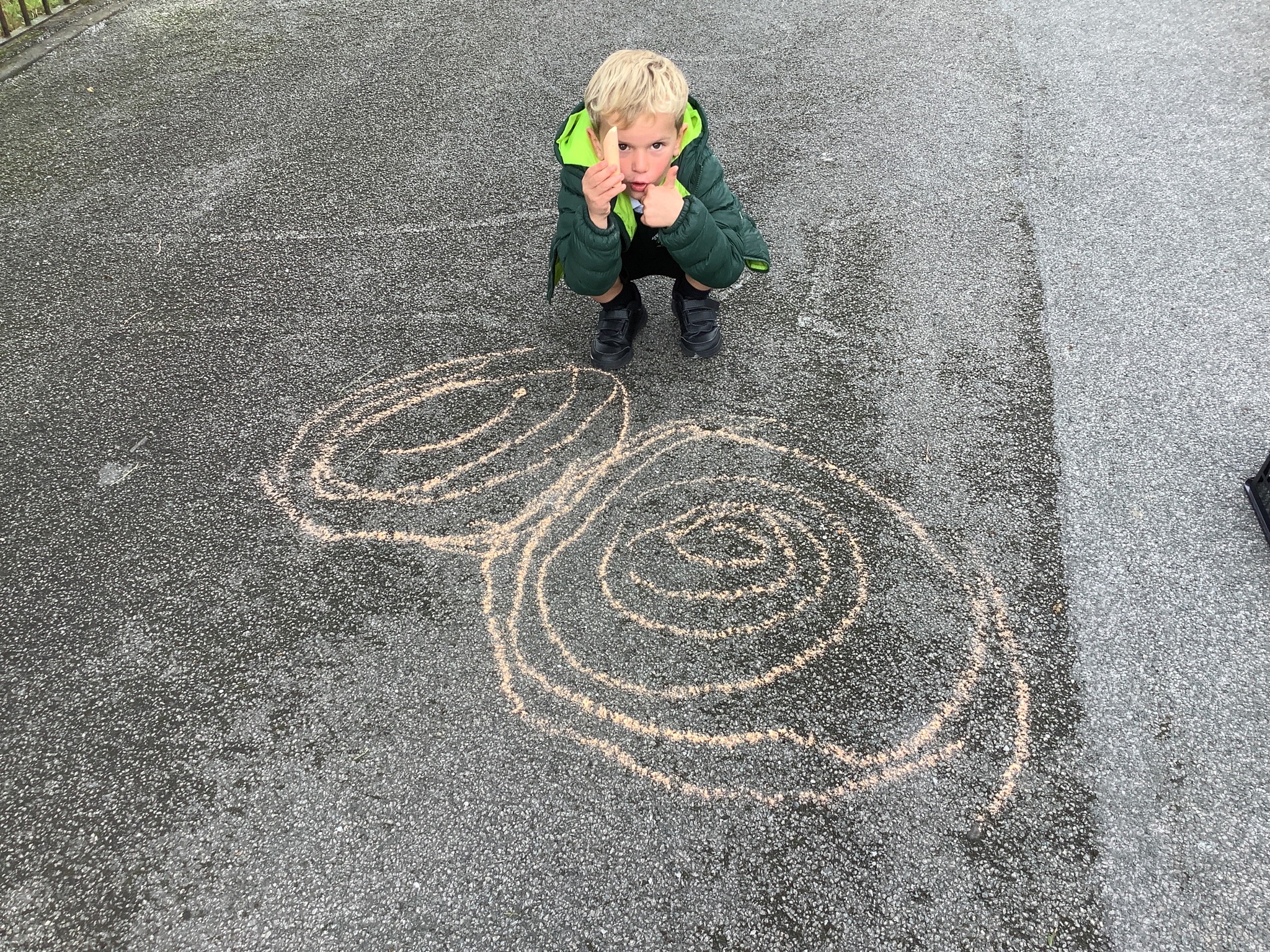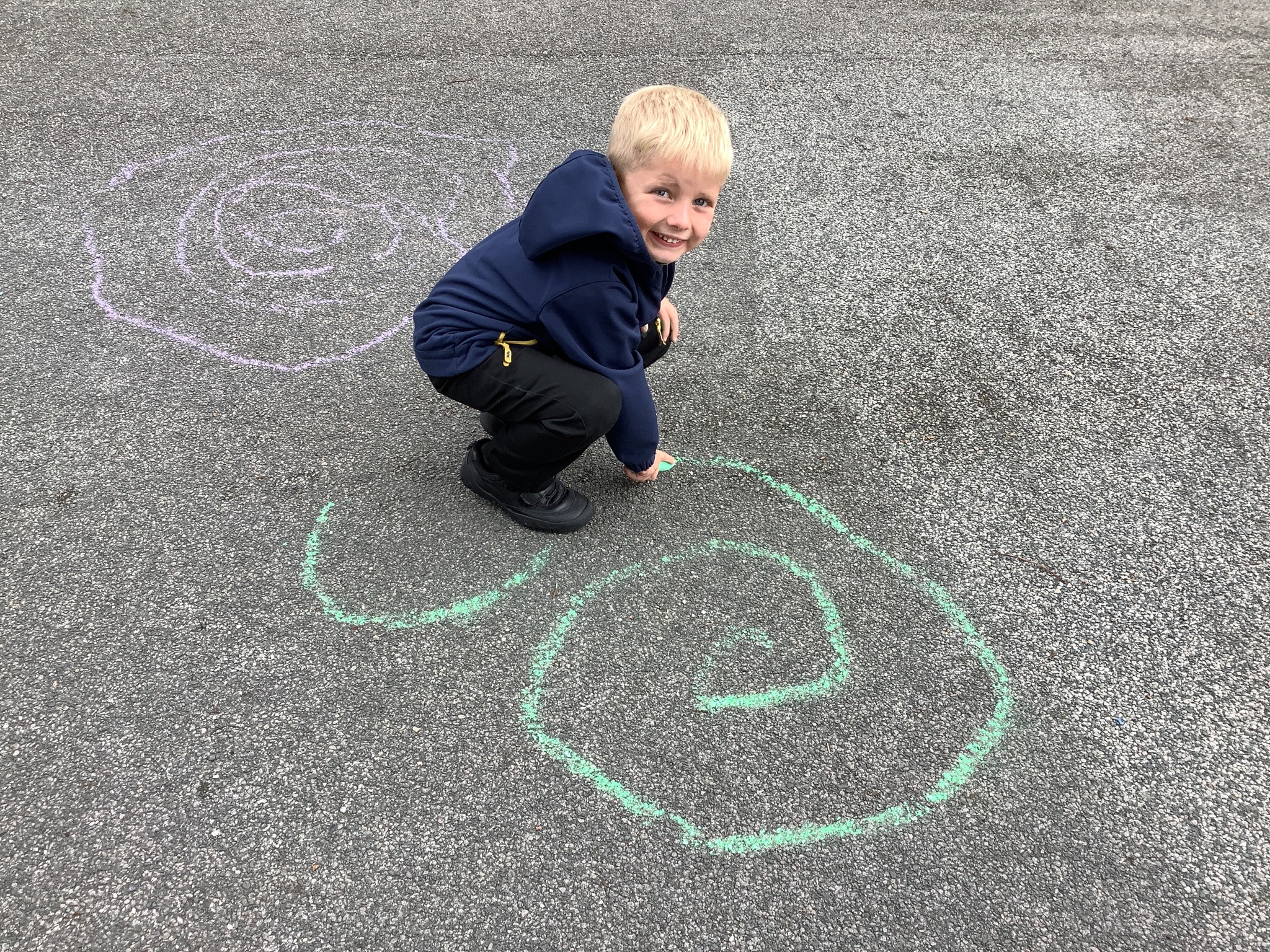The children created small spirals on drawing paper at tables using a range of colours, large spirals using highlighters on large pieces of paper on the floor and enormous spirals with chalk on the playground.