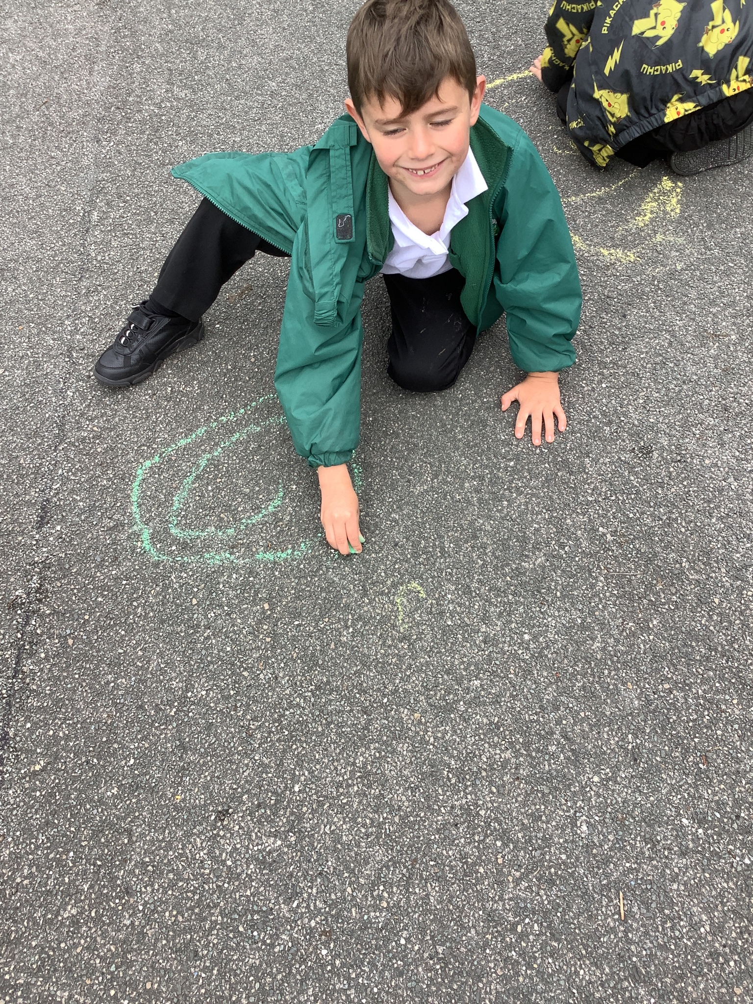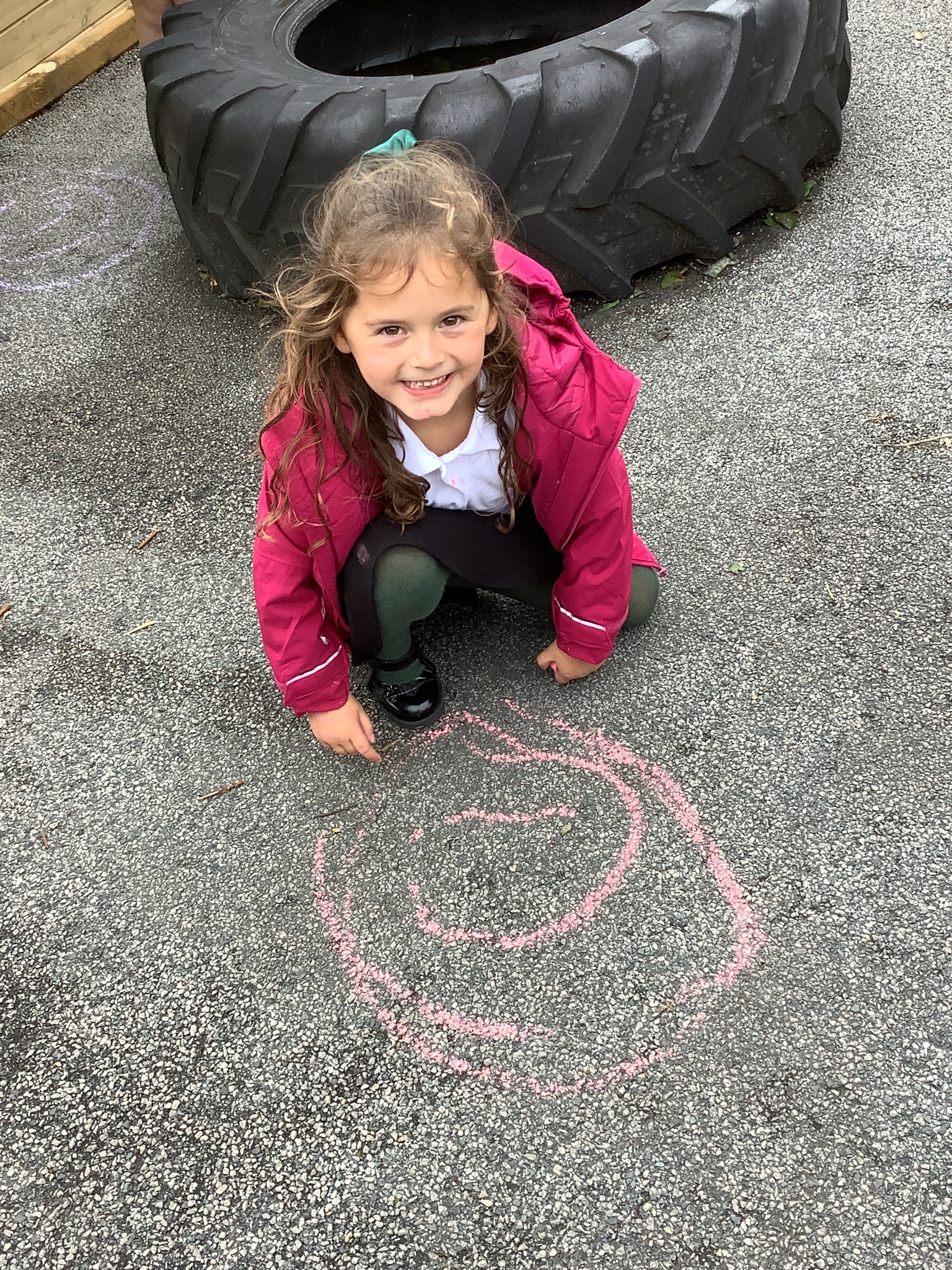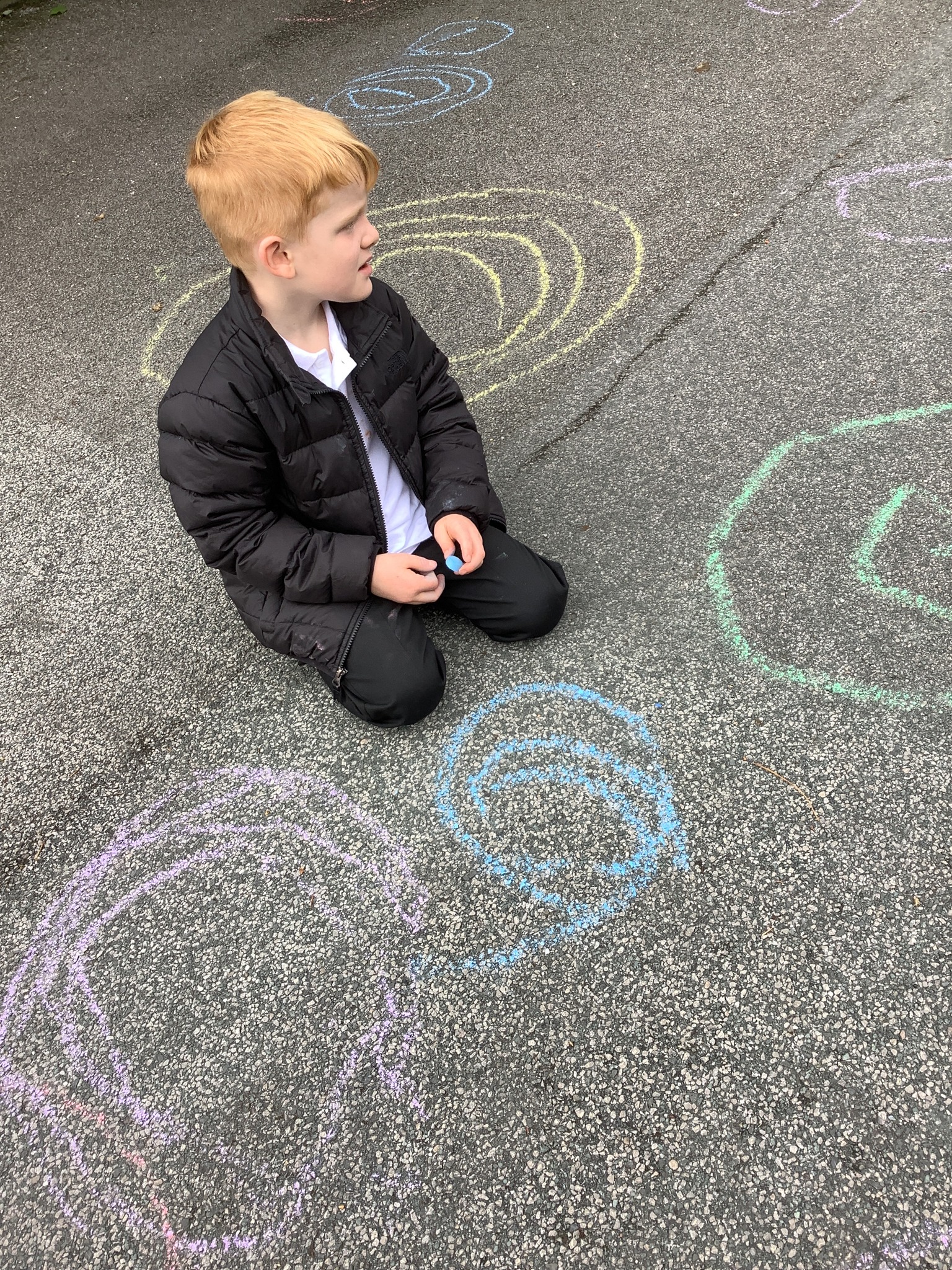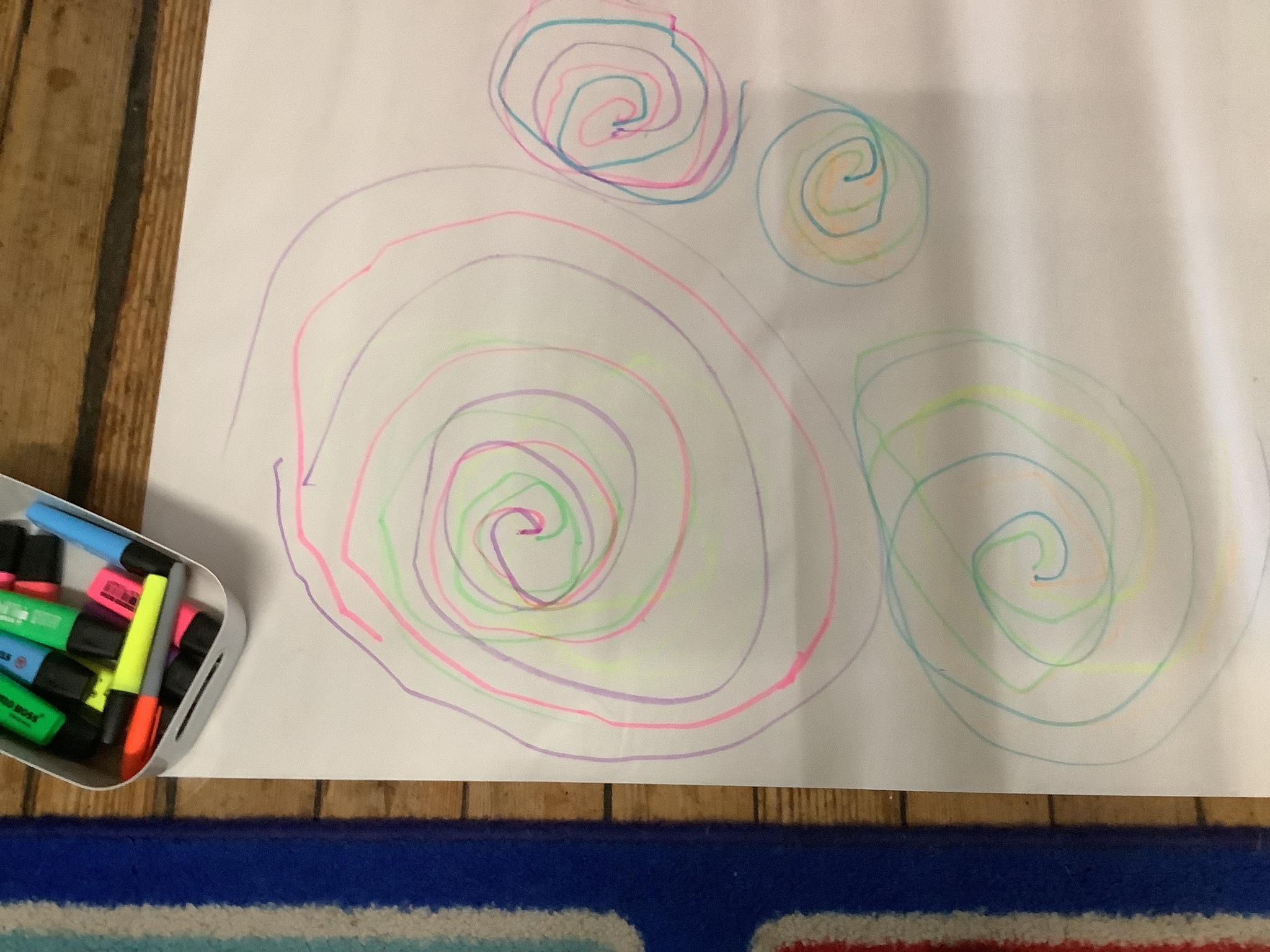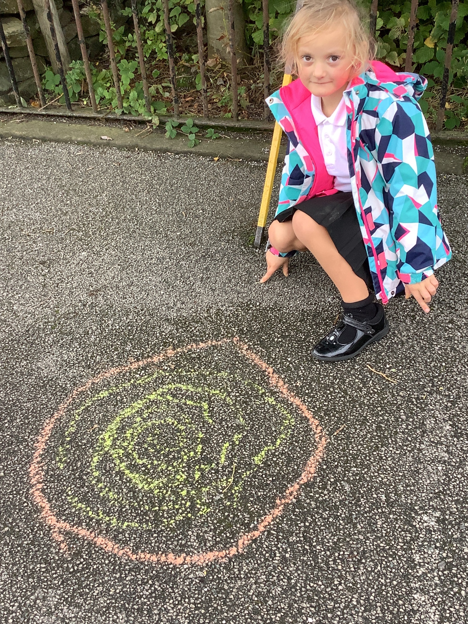 The children created small spirals on drawing paper at tables using a range of colours, large spirals using highlighters on large pieces of paper on the floor and enormous spirals with chalk on the playground.