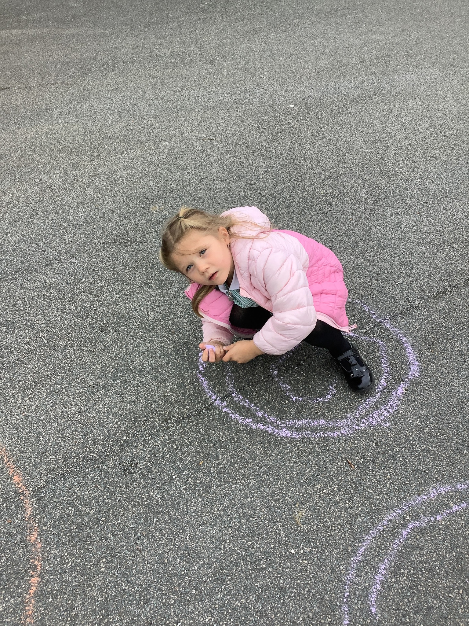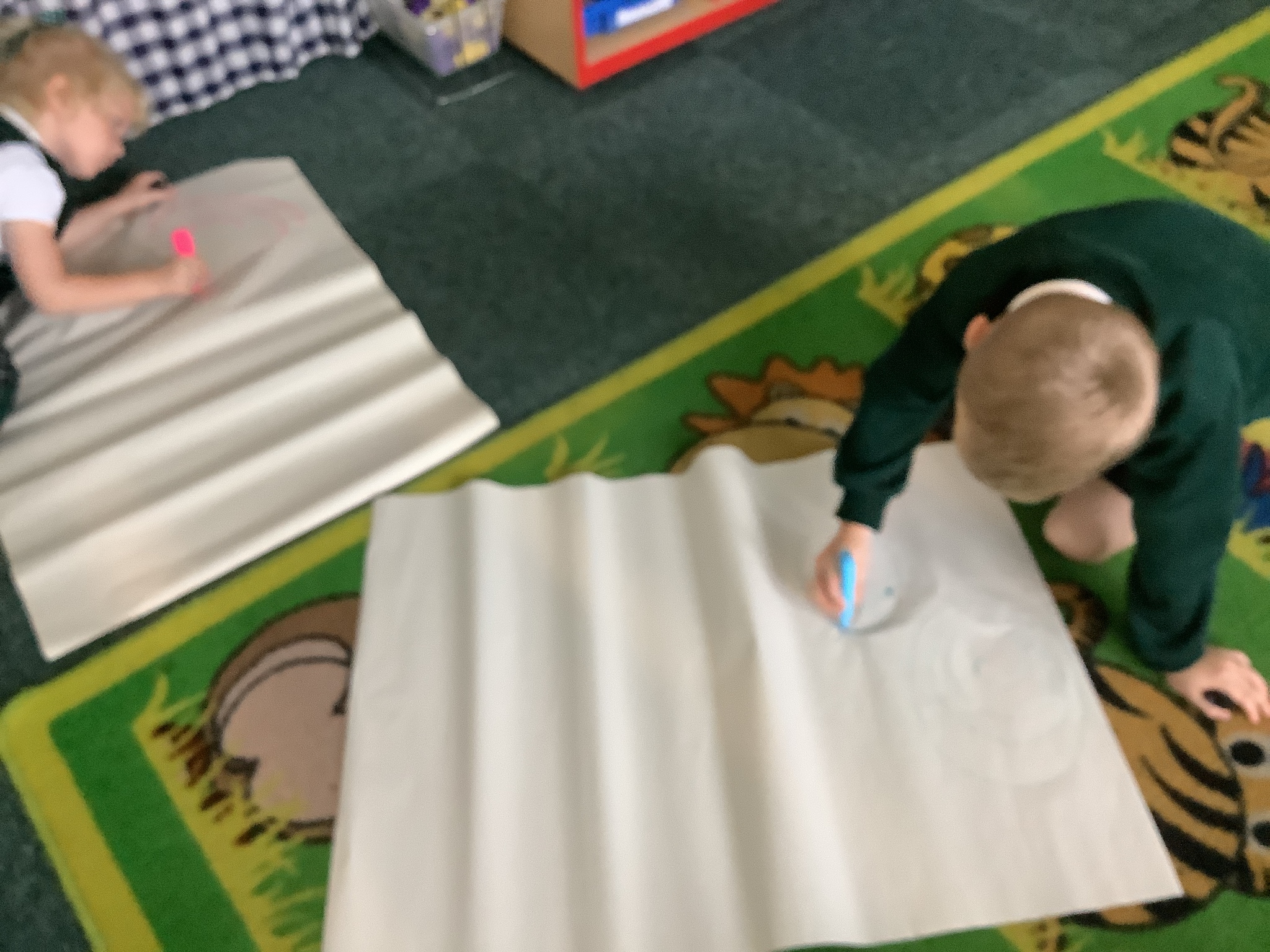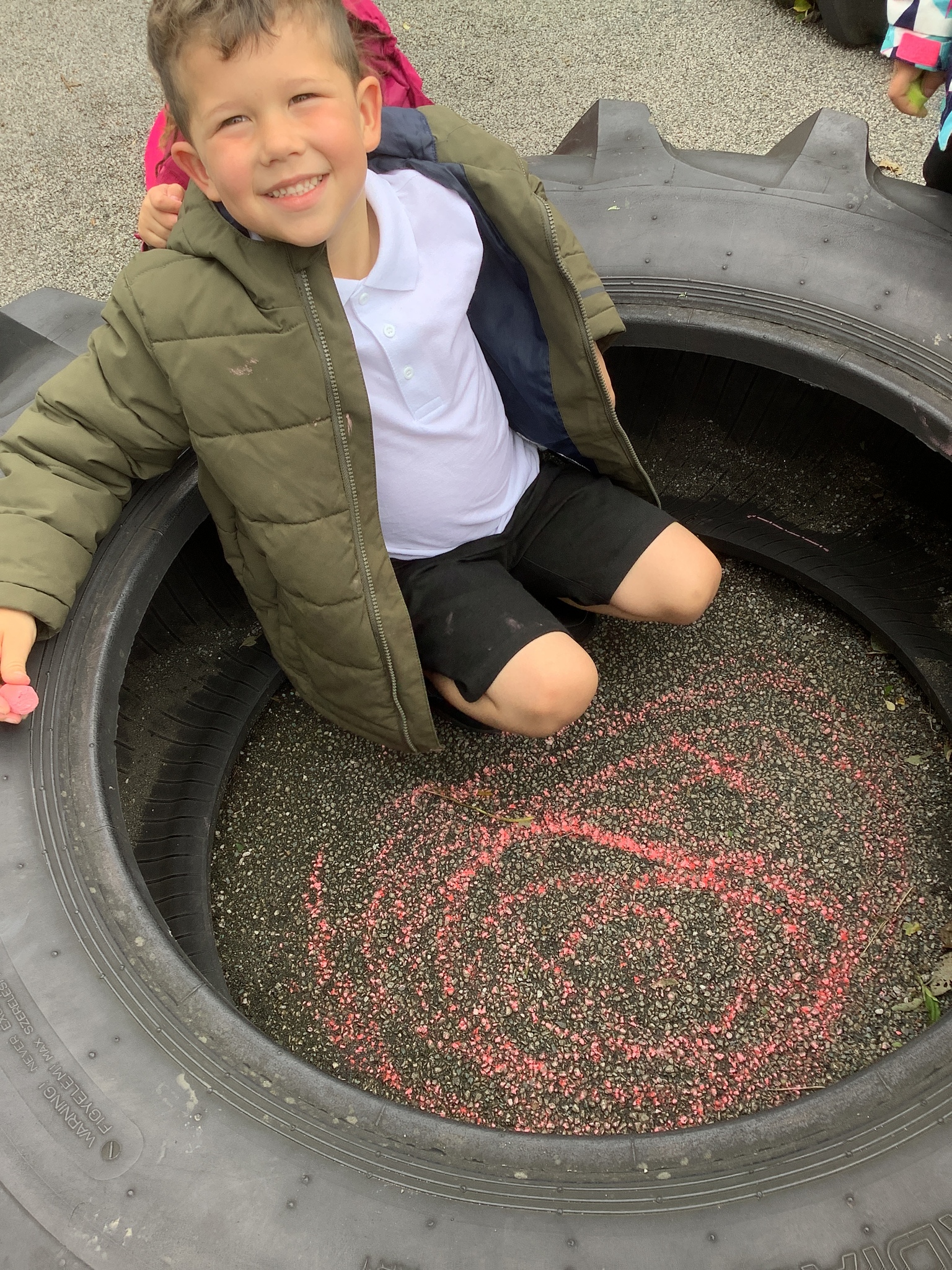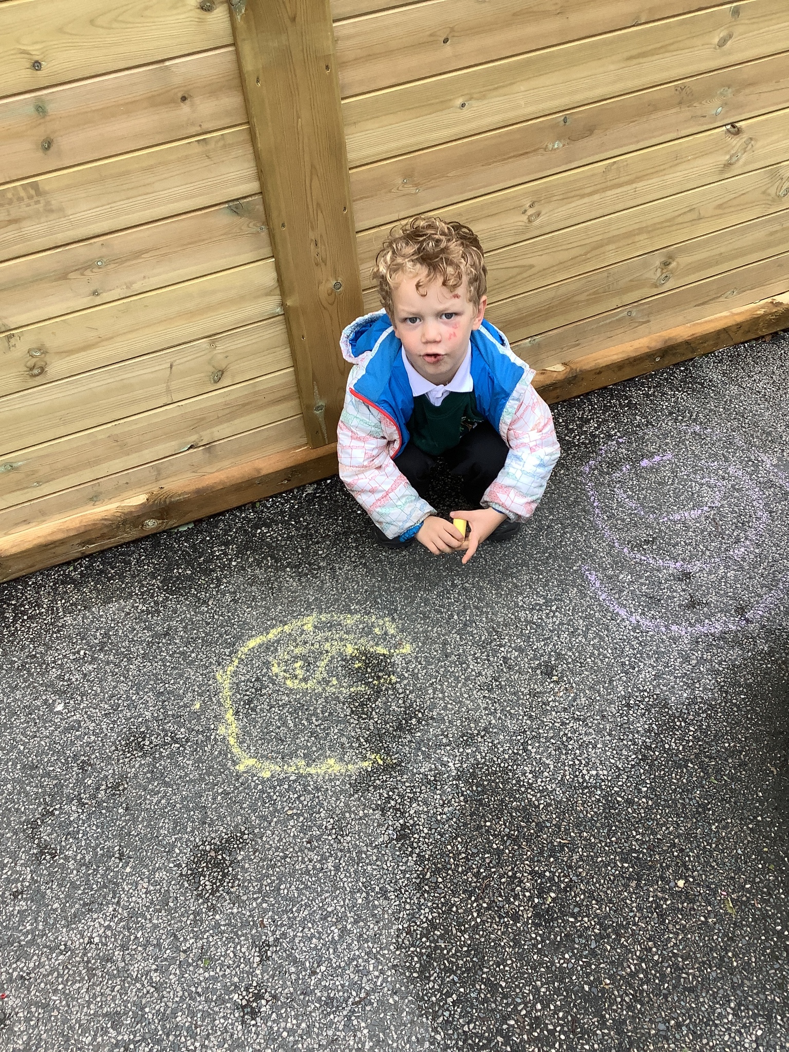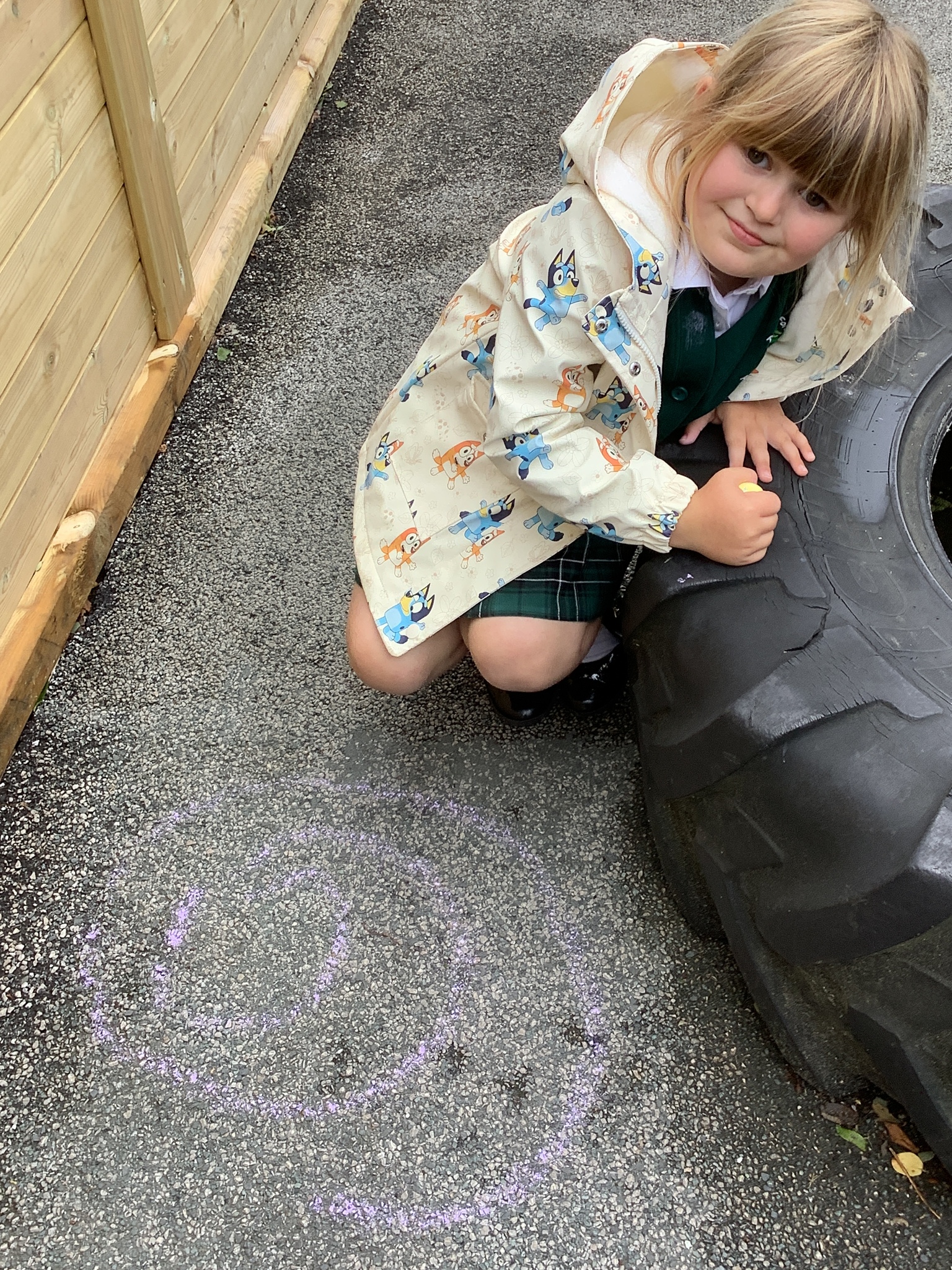 The children created small spirals on drawing paper at tables using a range of colours, large spirals using highlighters on large pieces of paper on the floor and enormous spirals with chalk on the playground.
