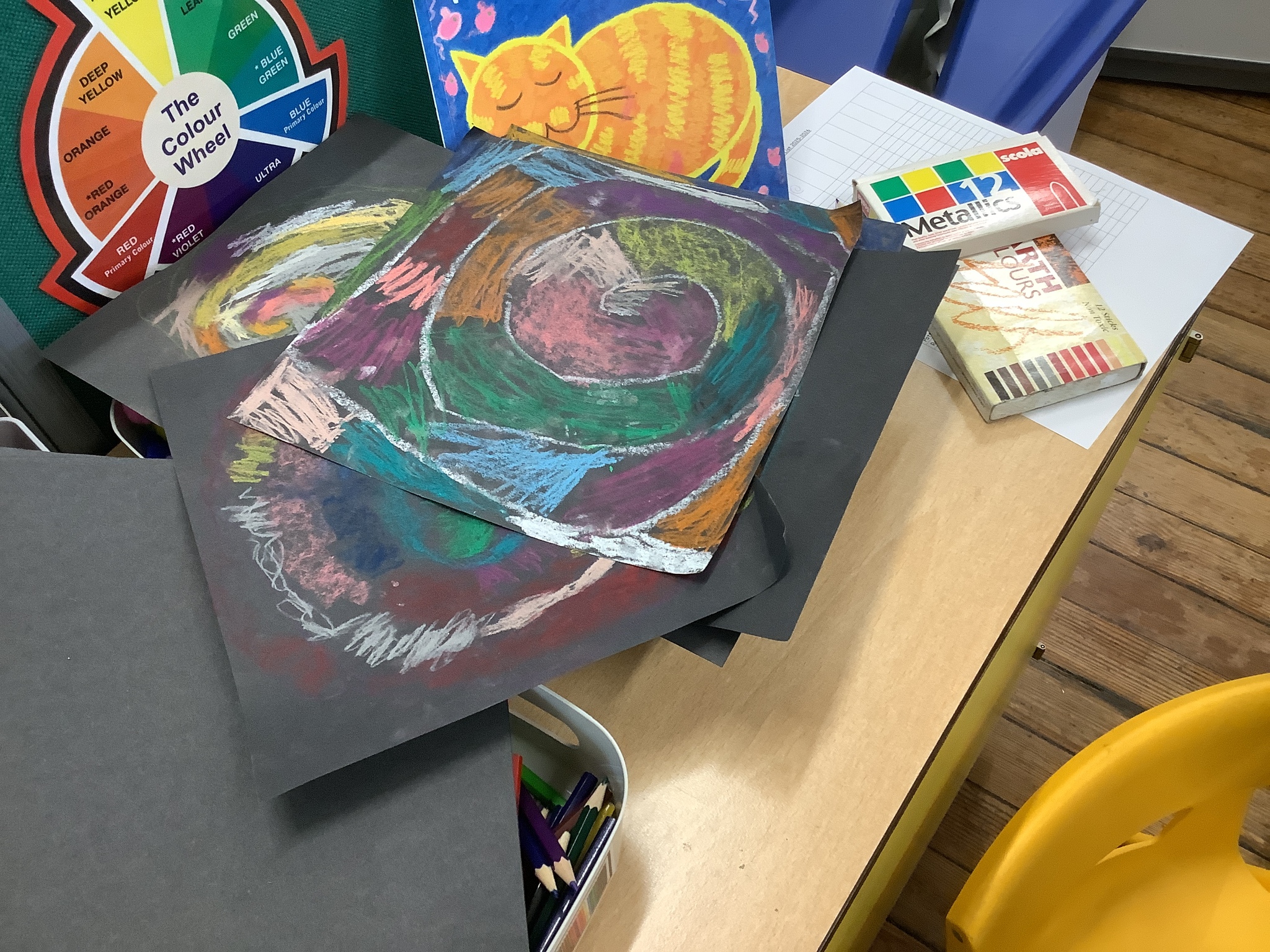 We then talked about how we can use colour to create snails. We looked at pictures of real snails and talked about the patterns we could see. Using pastels we drew spirals and made colourful snails by filling the enclosed spaces with patterns.