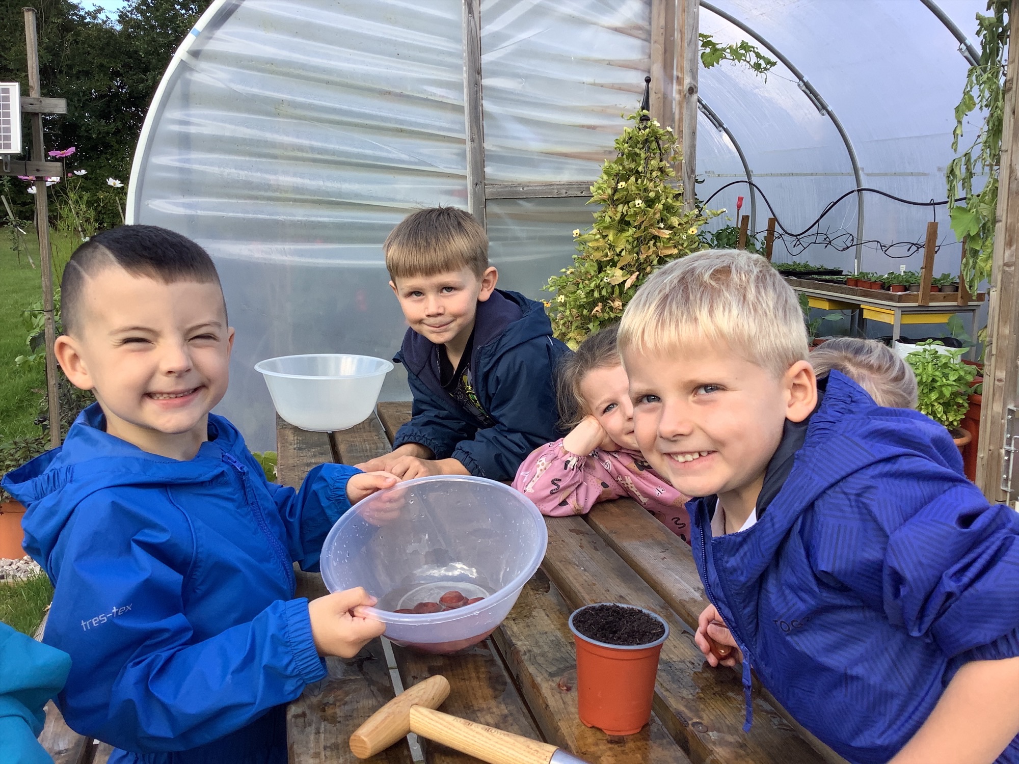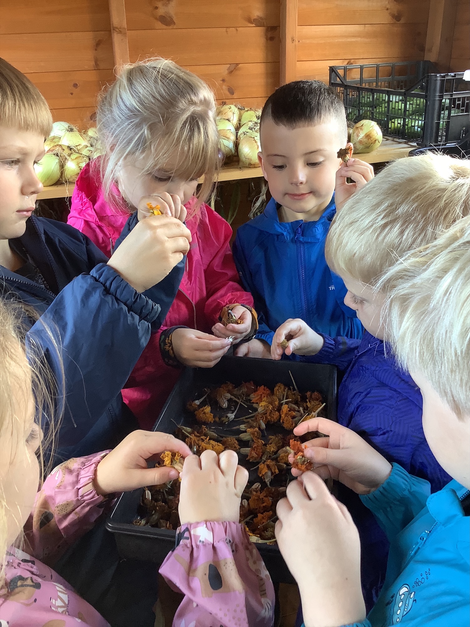 They also helped to separate some of the marigold seeds we are saving, ready for planting next year. Arthur kindly brought in some conkers he had collected and wanted to plant — the children learnt how to test them to see which ones were healthy and would have the best chance of germinating and growing into a horse chestnut tree.
