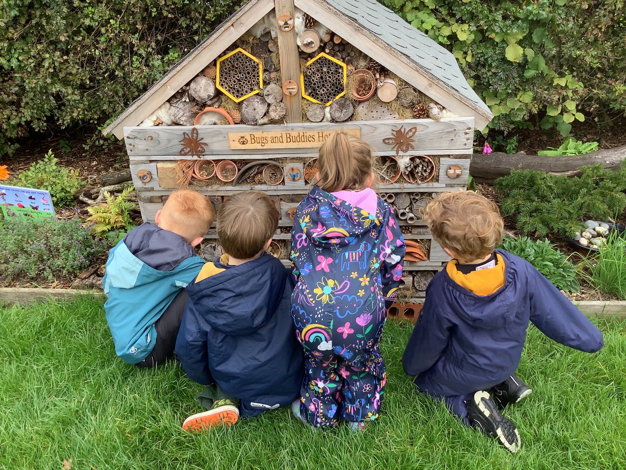 They spotted lots of ladybirds resting on the petunias, explored the bug hotel, and even watched a huge spider disappear inside it!