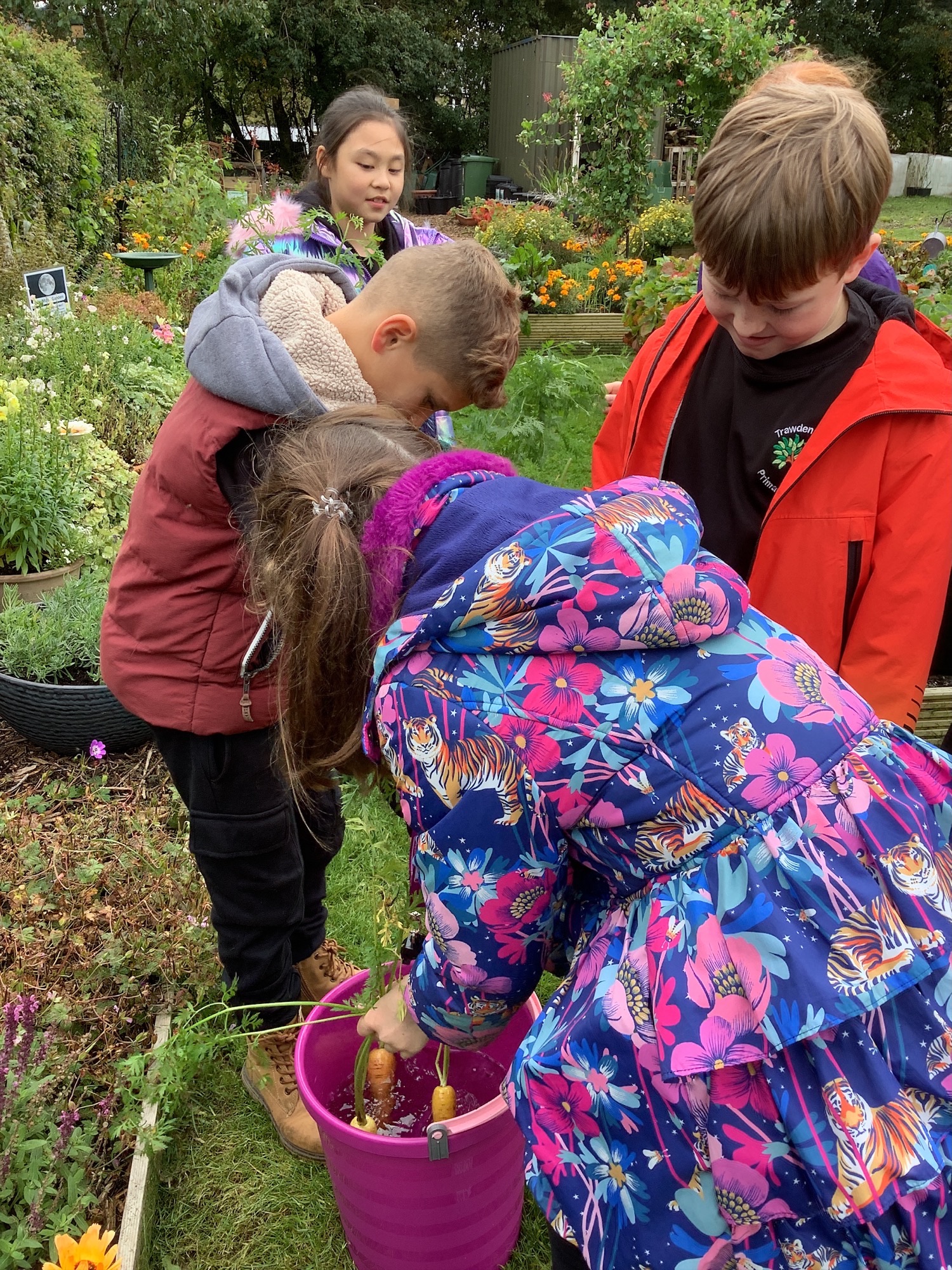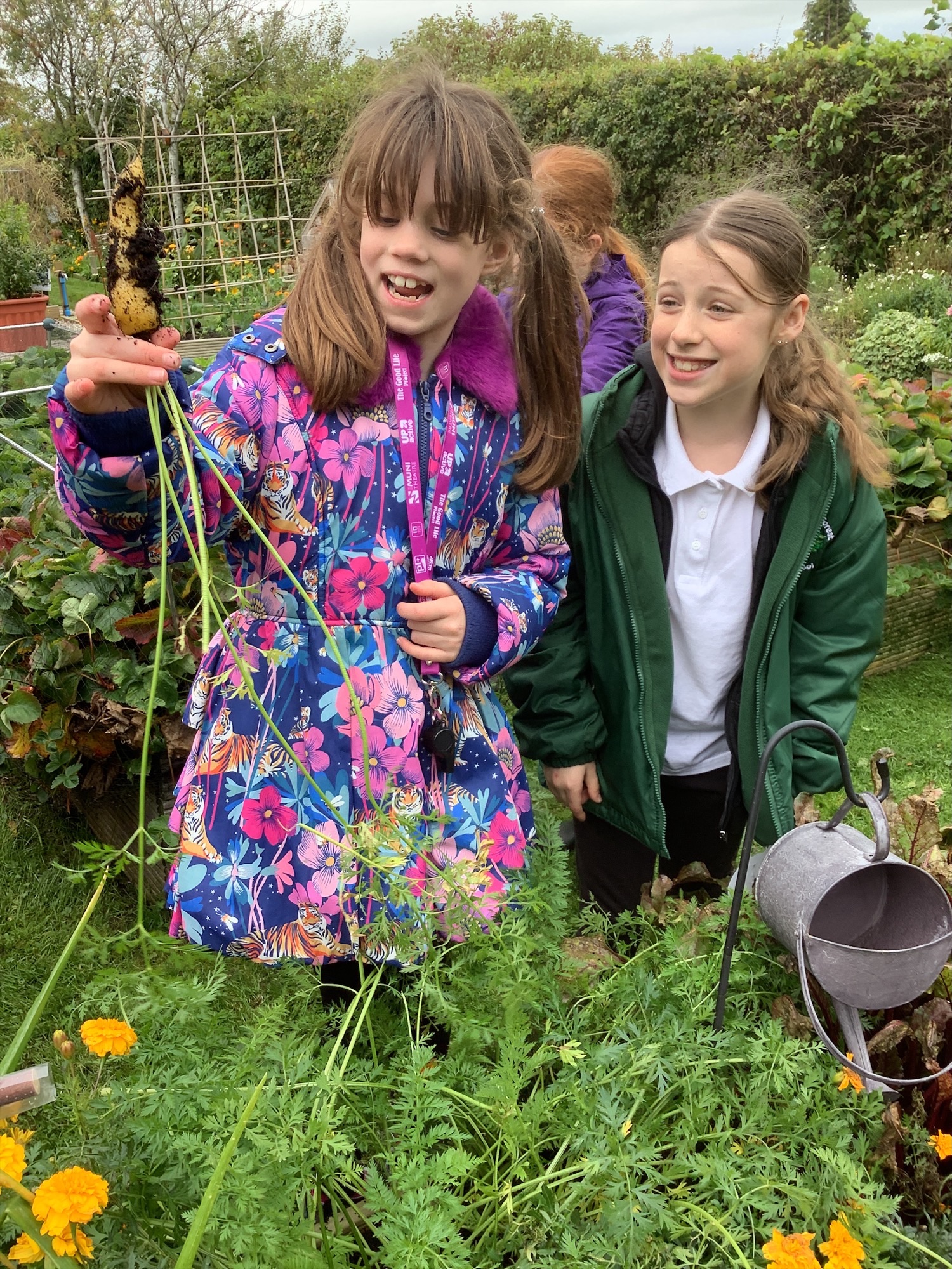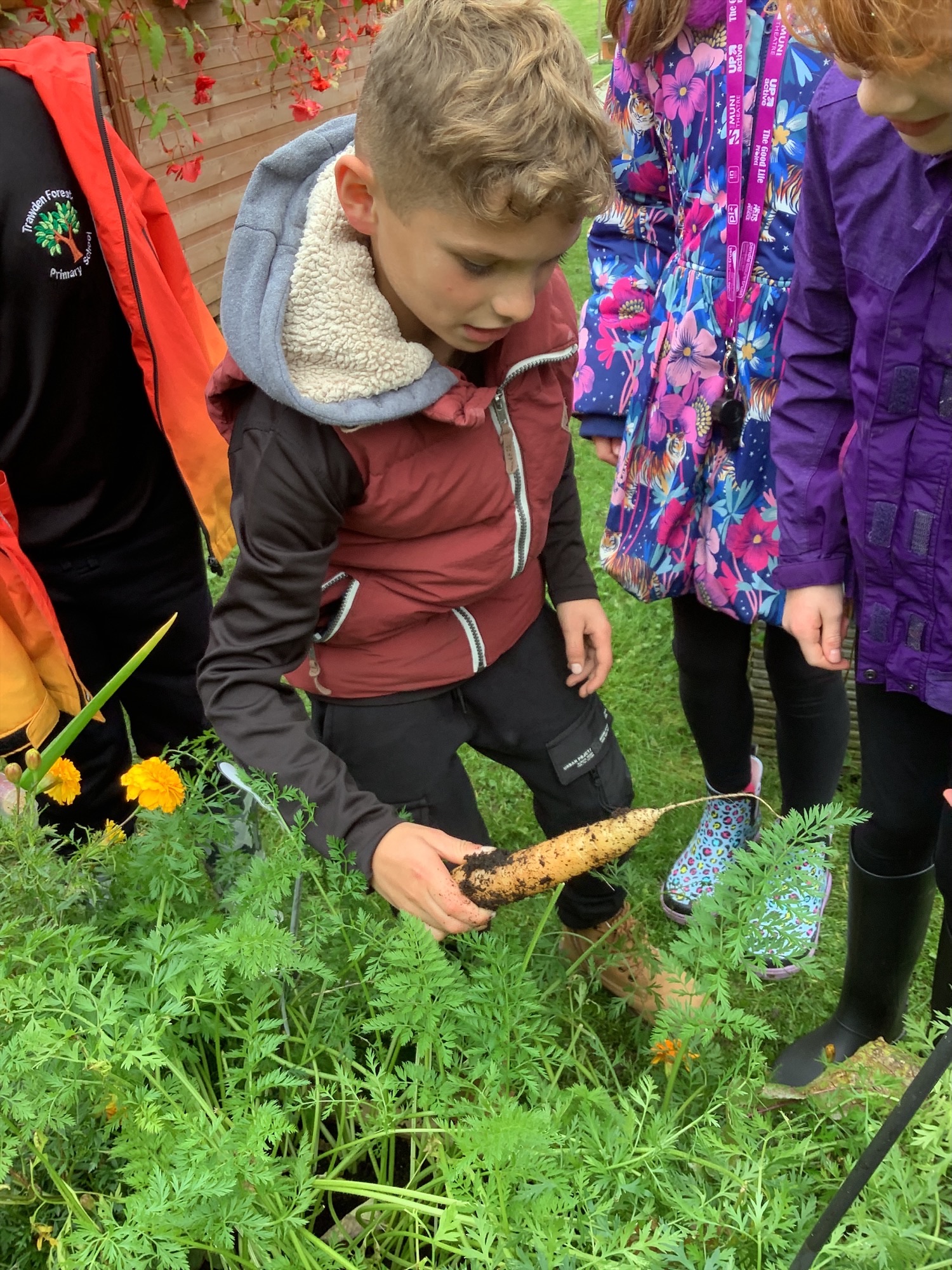 Another group of our enthusiastic Year 5 Gardening Gang rolled up their sleeves in the school garden this week. They began by harvesting carrots we had grown from seed — including a striking yellow variety that proved carrots come in more than just orange! The colourful crop caused plenty of excitement and curiosity as the children compared shapes and shades.