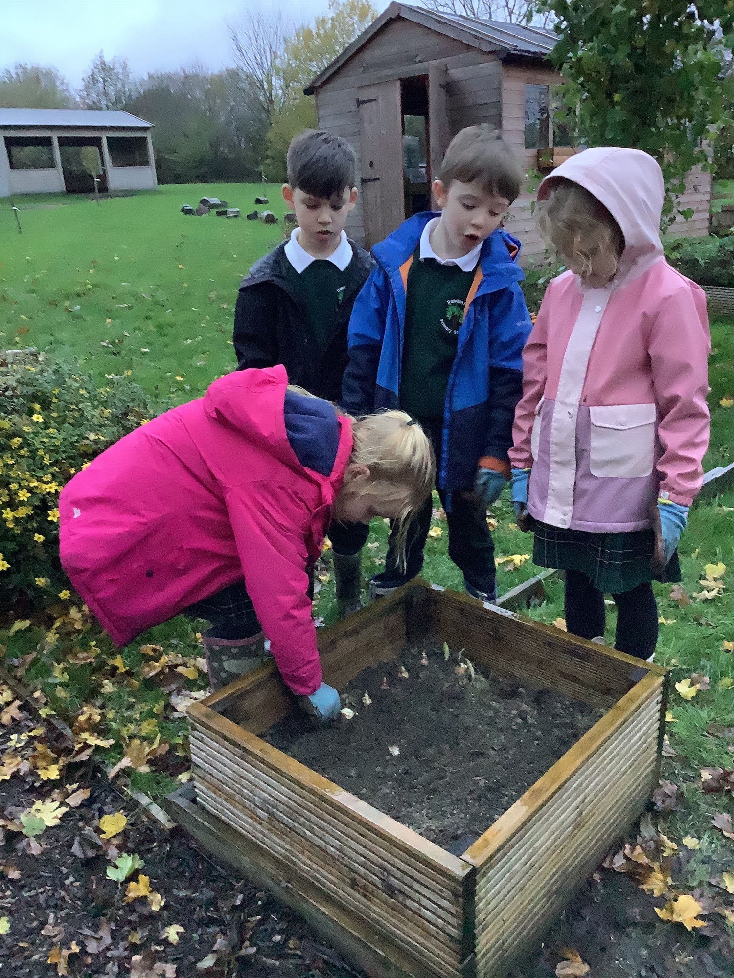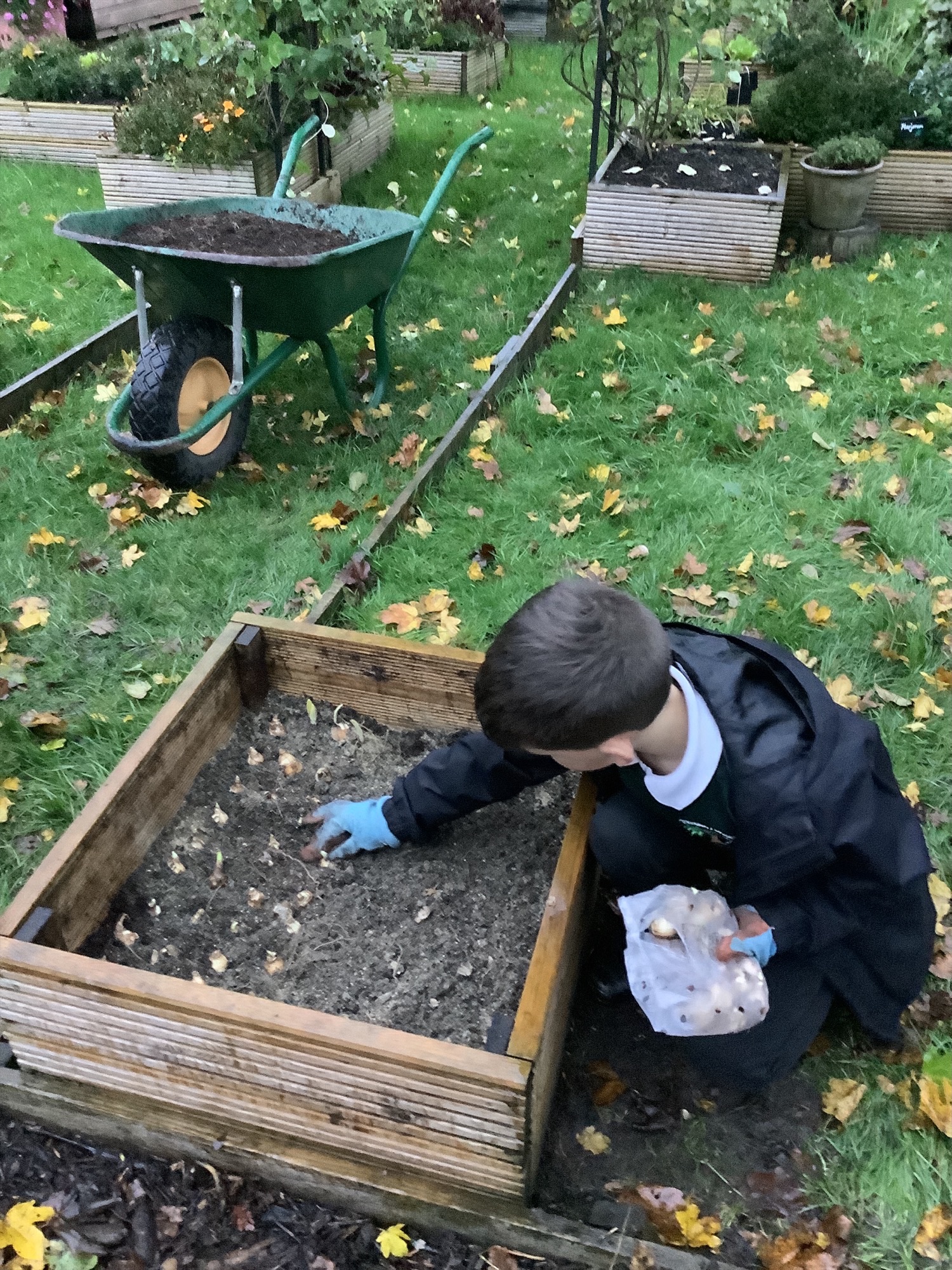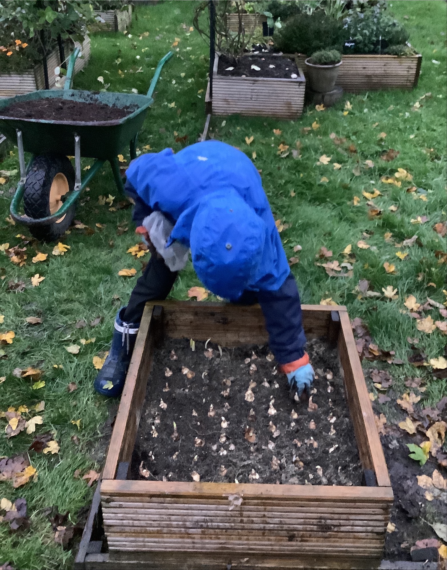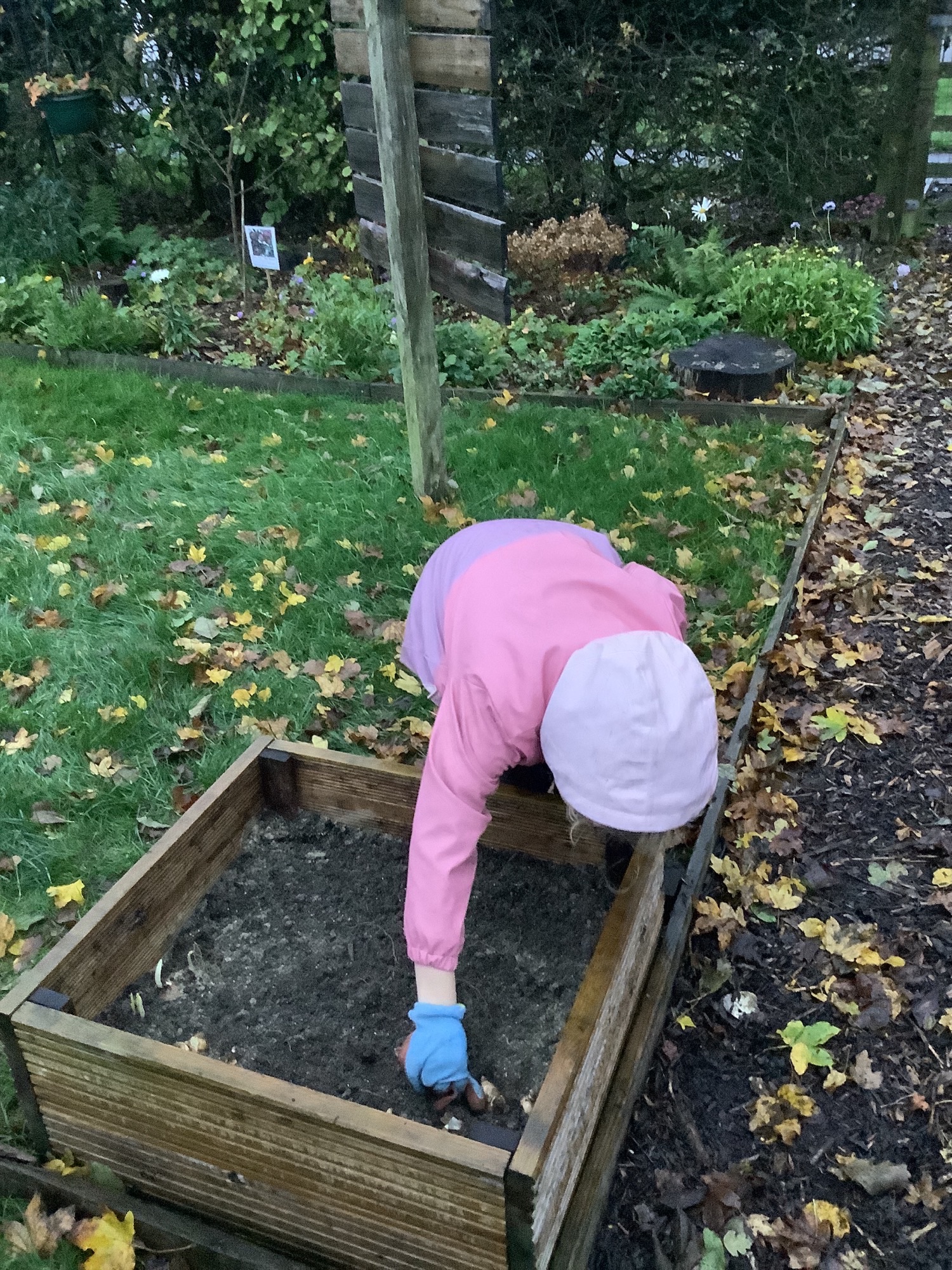 What a busy and productive session it was at Gardening Club this evening! We split into two groups — one headed to the compost area to empty the snack waste bins and plant 100 Narcissus tete-a-tete bulbs in our entrance planter, ready to bring a burst of cheerful colour this spring.