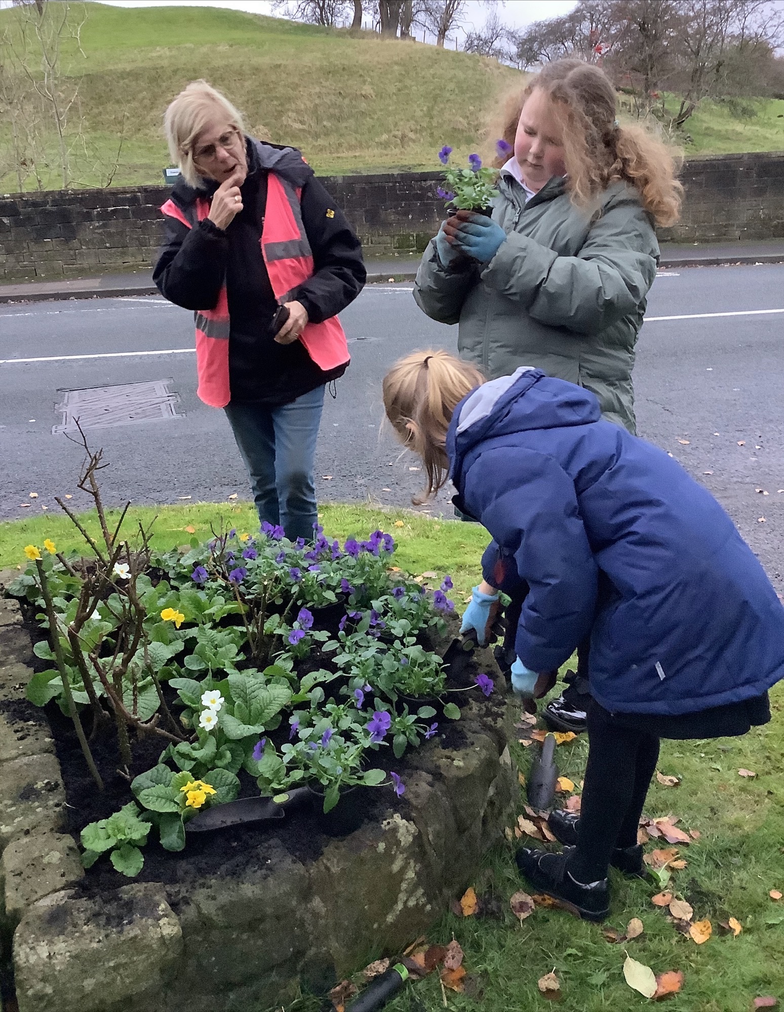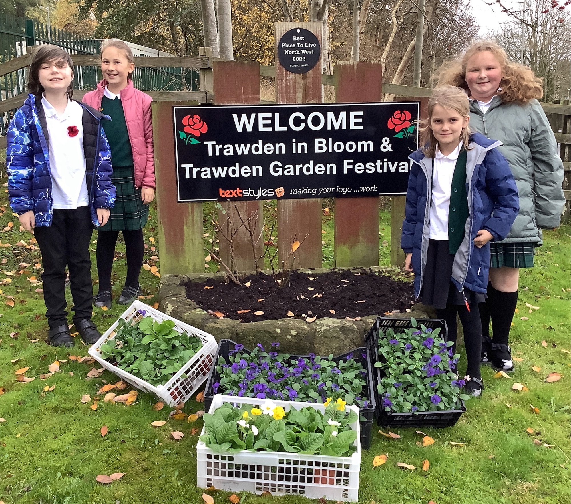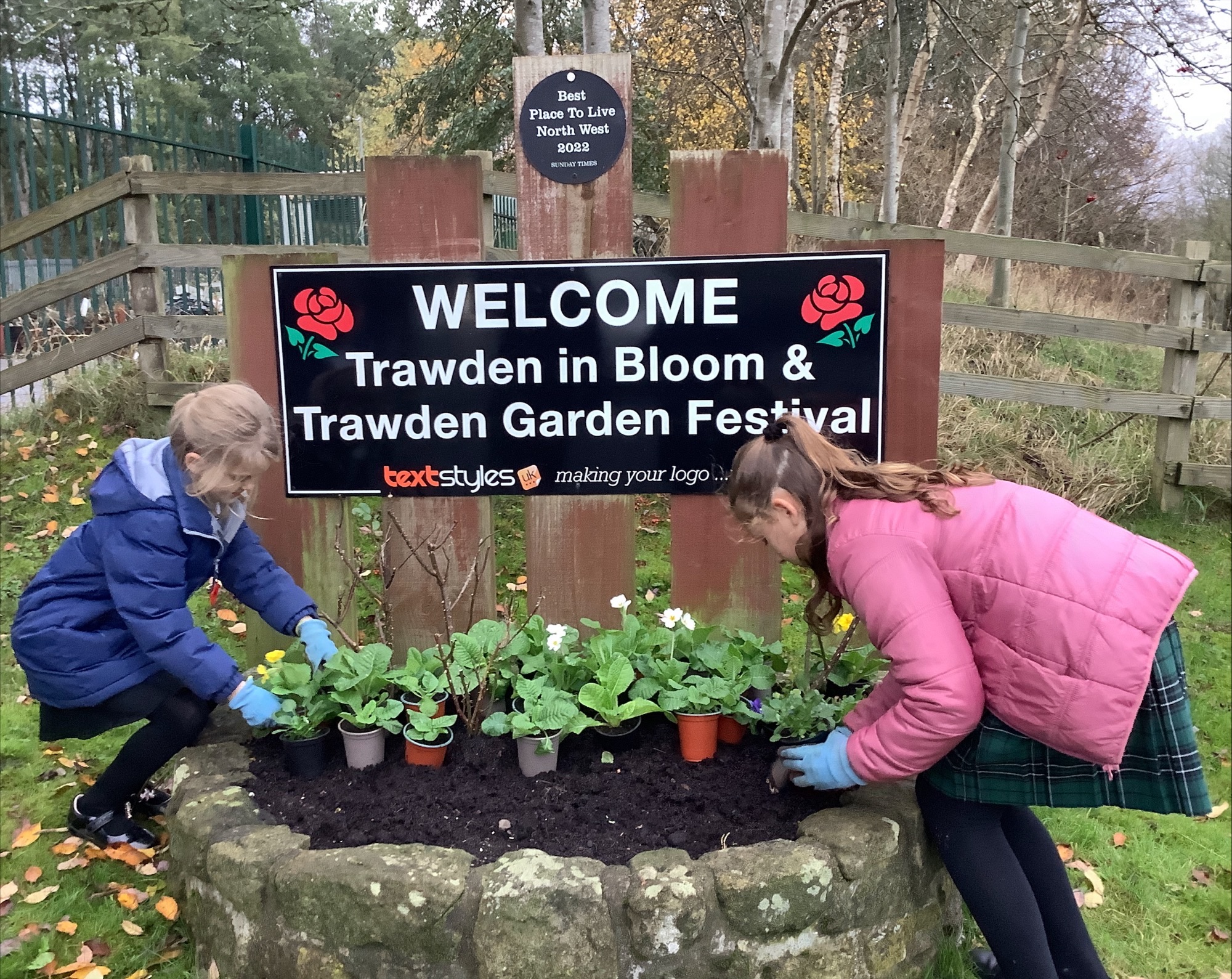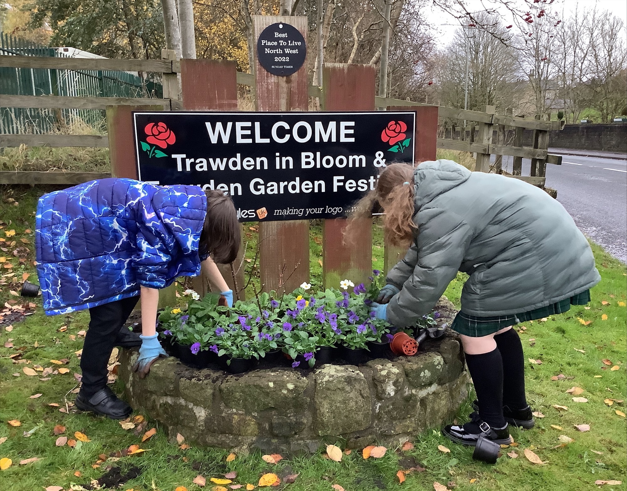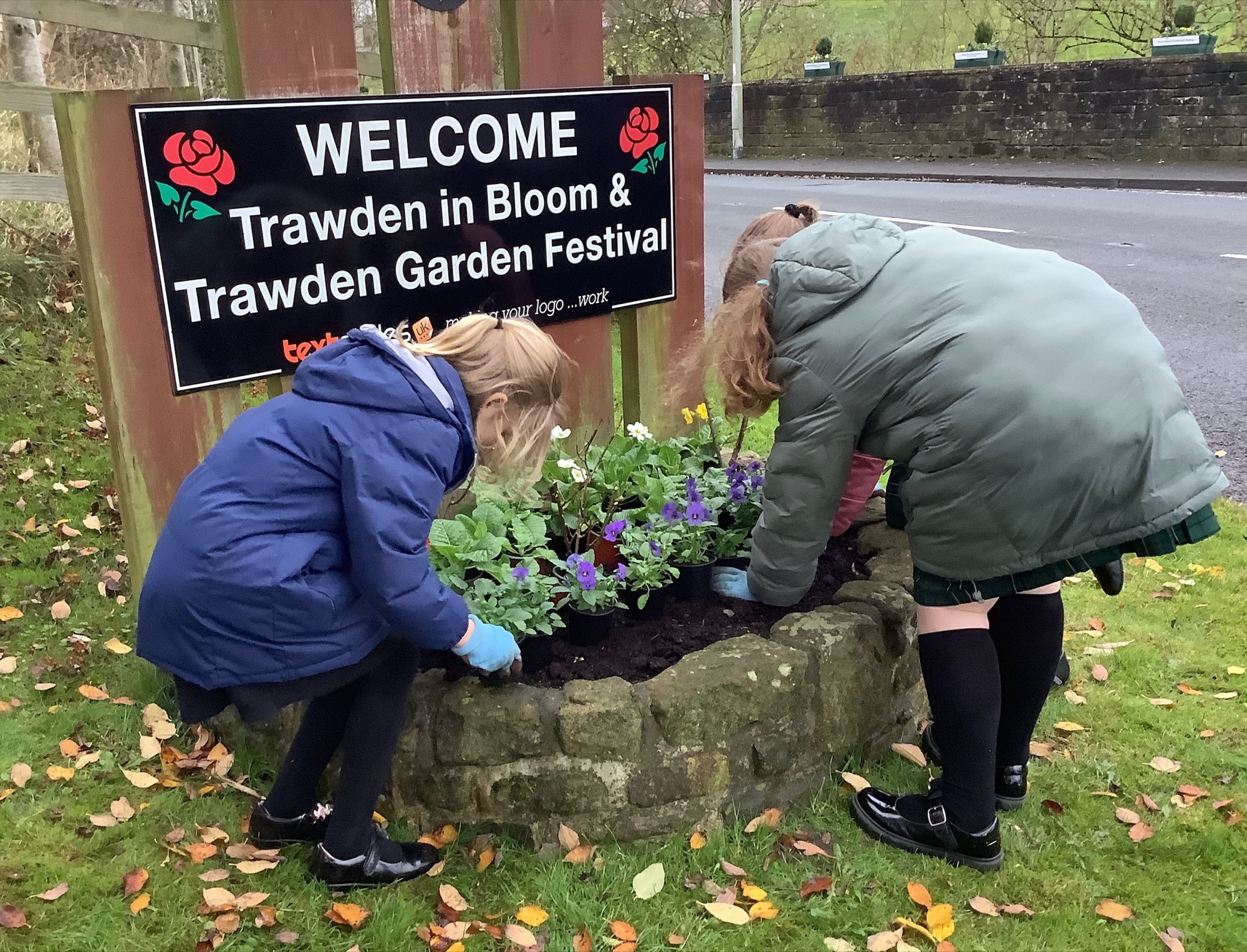 Some of our Gardening Club children joined the brilliant volunteers from Trawden in Bloom to plant up the Welcome to Trawden planter at the entrance to our village.