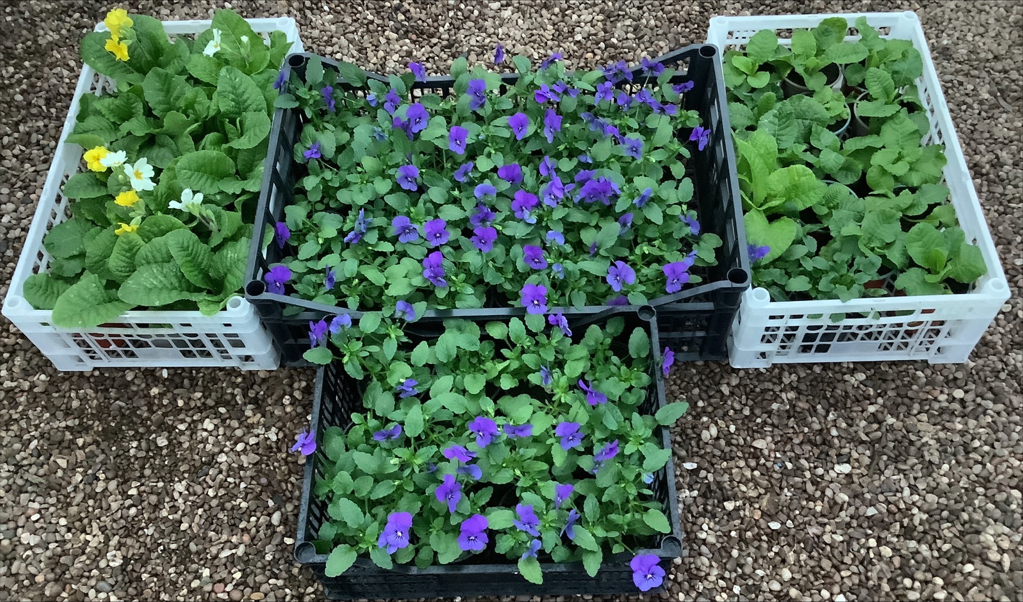 Our autumn-into-spring planting includes cheerful violas and polyanthus, all lovingly grown from seed by our Gardening Club.