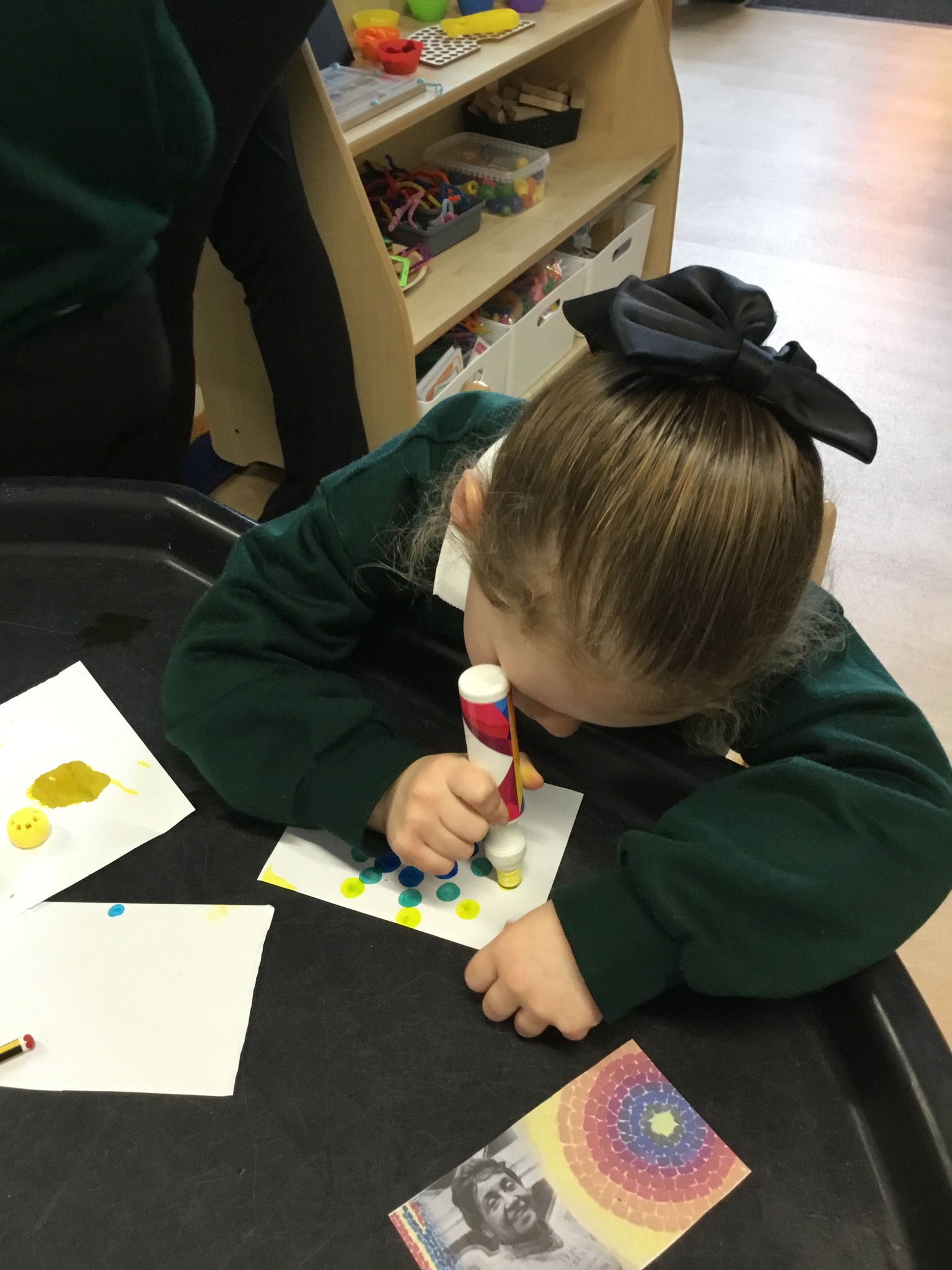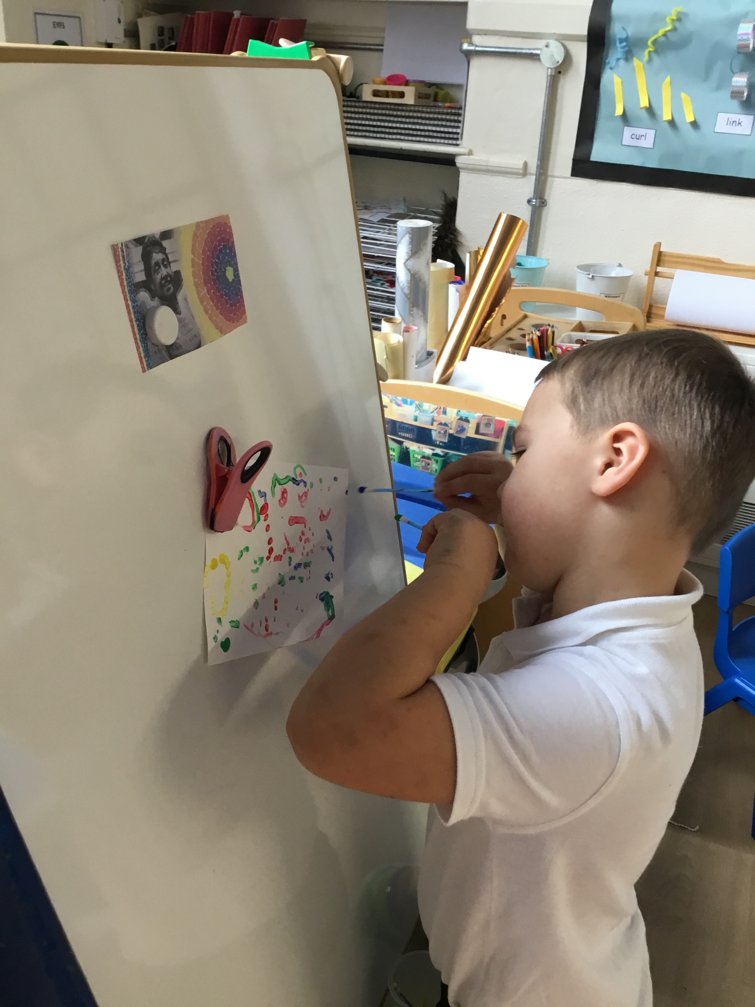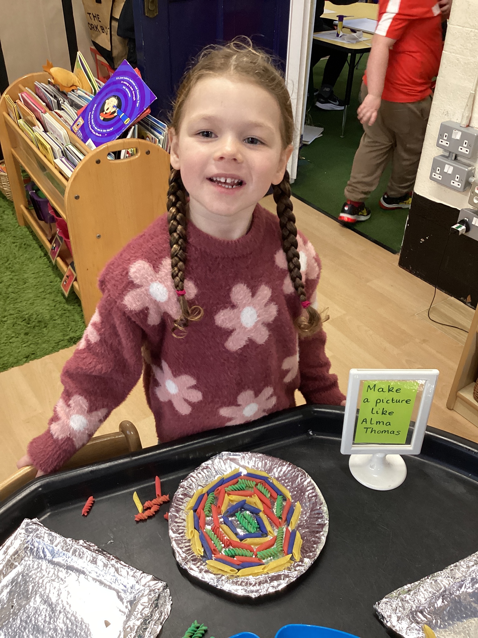 We continued our learning about the artist Alma Thomas and explored her vibrant, patterned artwork. The children enjoyed studying how she used colour, shape and repeated patterns, and this inspired them to create their own wonderful pieces. Both indoors and outdoors, children experimented with painting, collage and pattern-making, developing increasing confidence in choosing their own tools, combining materials and expressing their ideas creatively.
